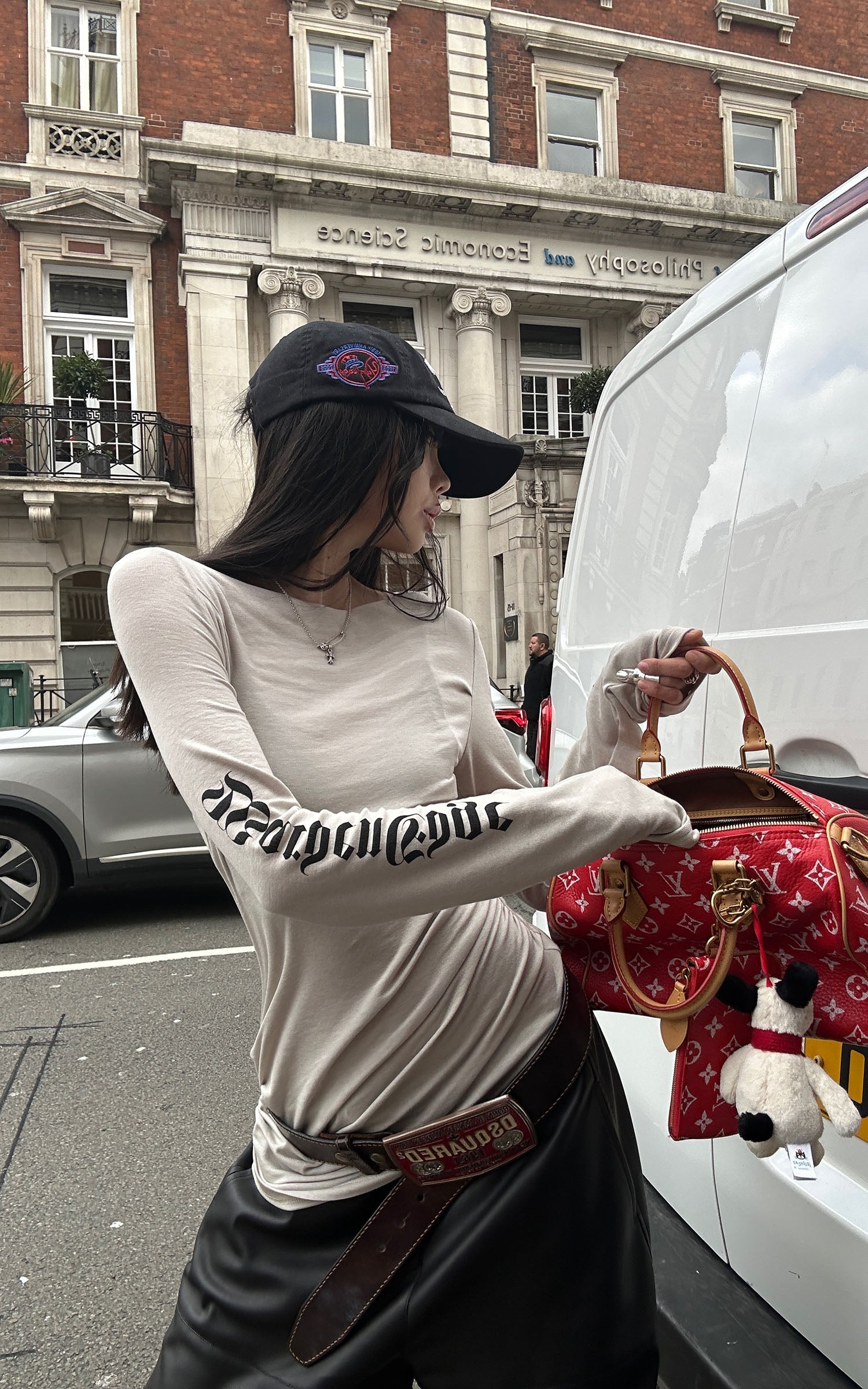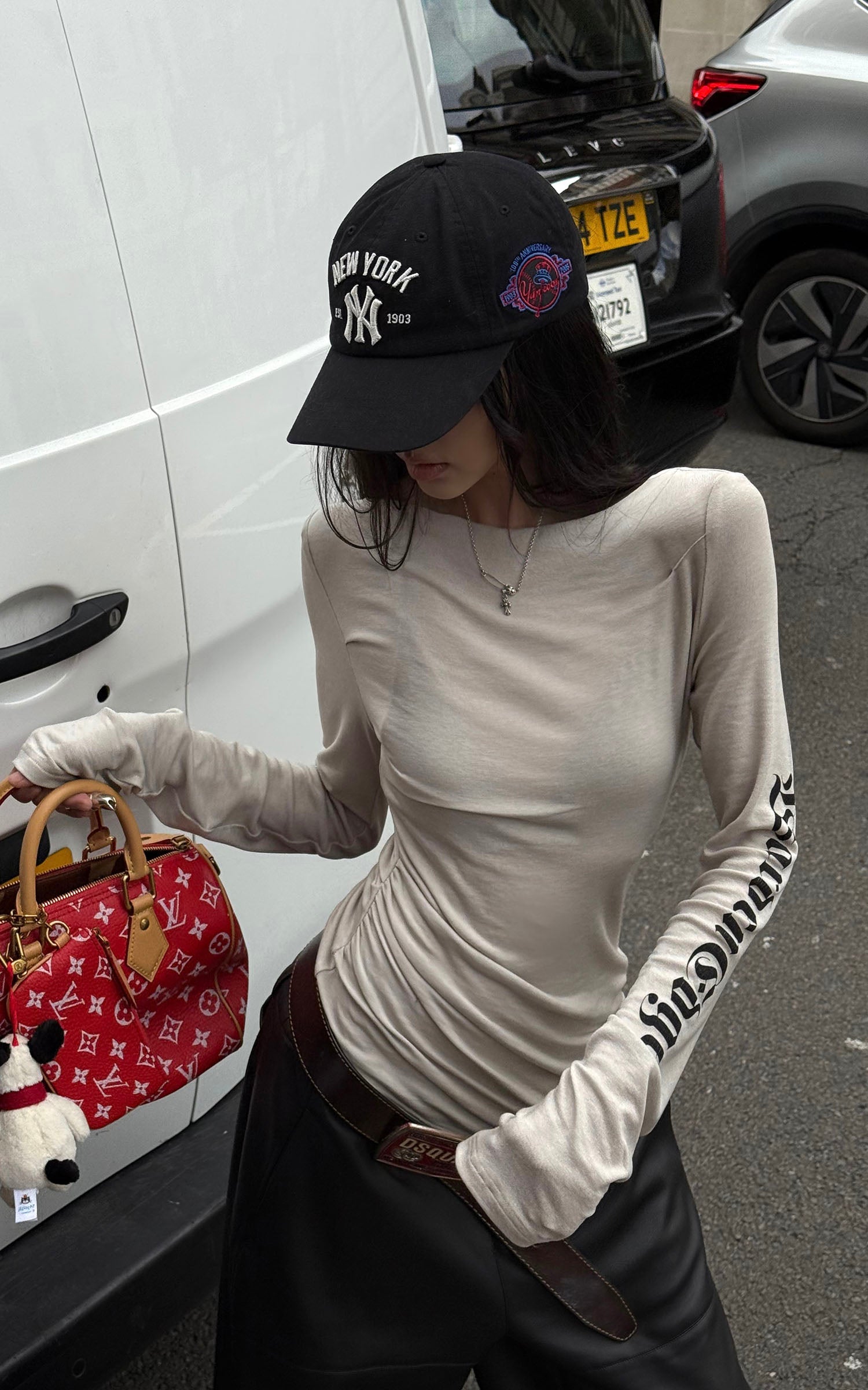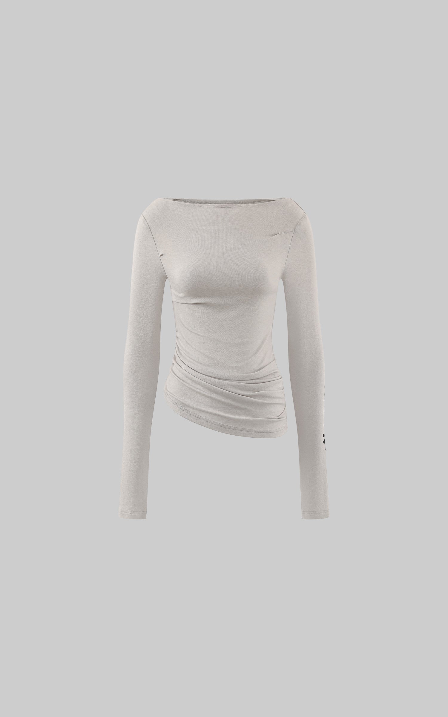 El minimalismo urbano con actitud: esta camiseta de manga larga redefine el vestir diario a través de una distorsión sutil y un contorno elegante. Diseñada con un escote barco y un drapeado asimétrico a lo largo de la cintura, favorece la silueta mientras mantiene la comodidad. El estampado del logo de estilo gótico en la manga añade un toque inesperado, dándole una energía callejera pero refinada. Hecha de algodón elástico suave que se adapta suavemente al cuerpo, esta pieza se mueve sin esfuerzo entre looks relajados y vanguardistas.