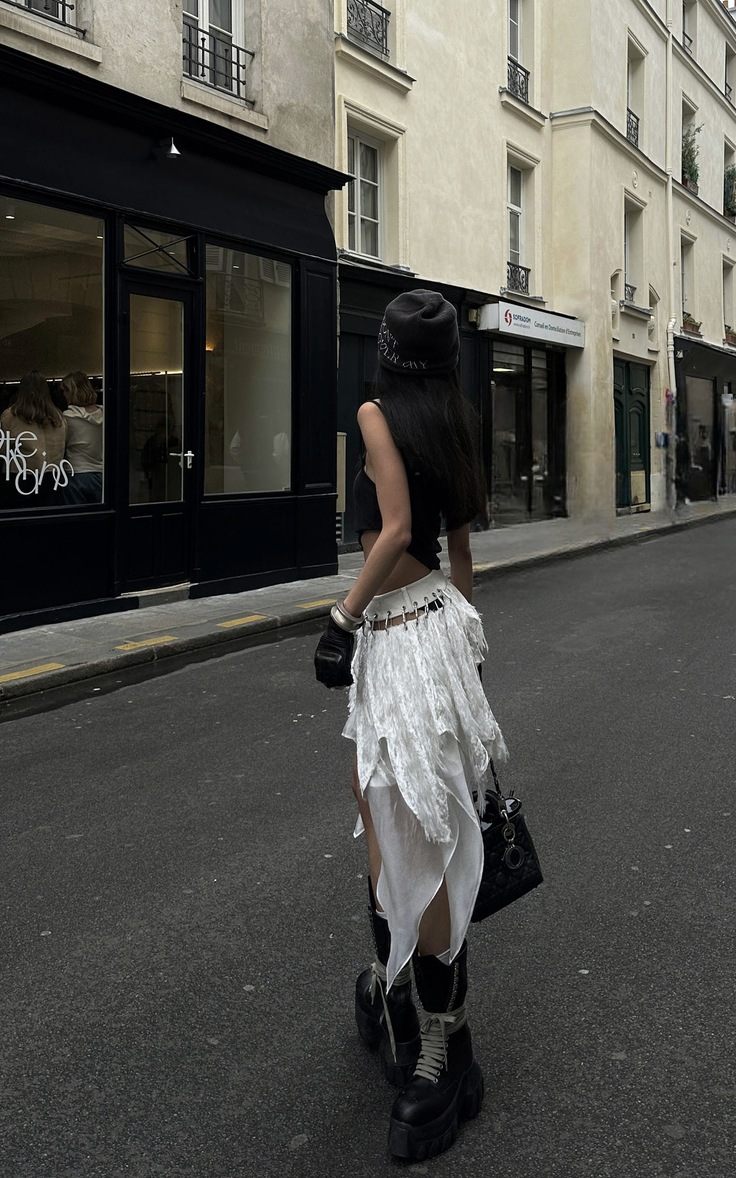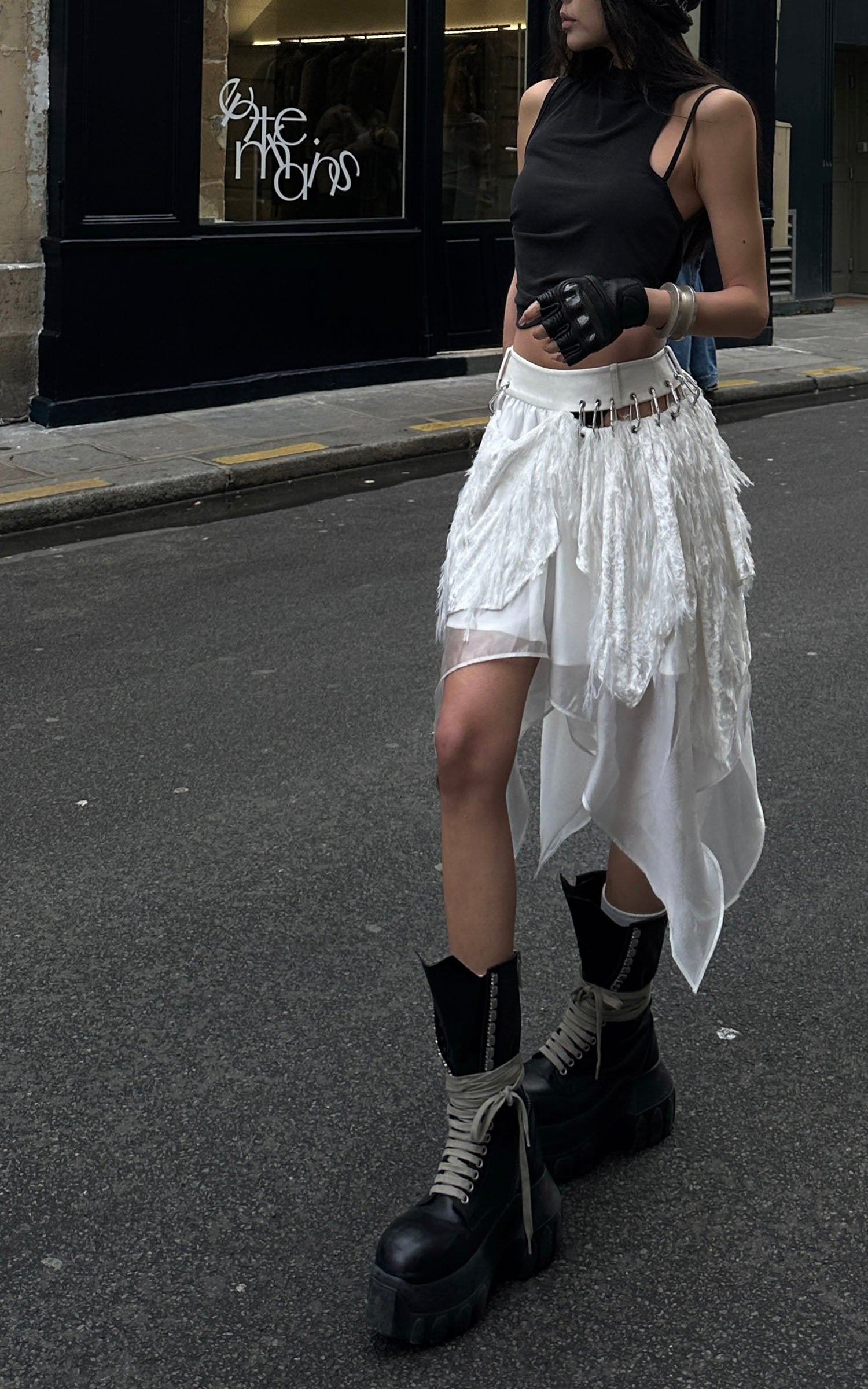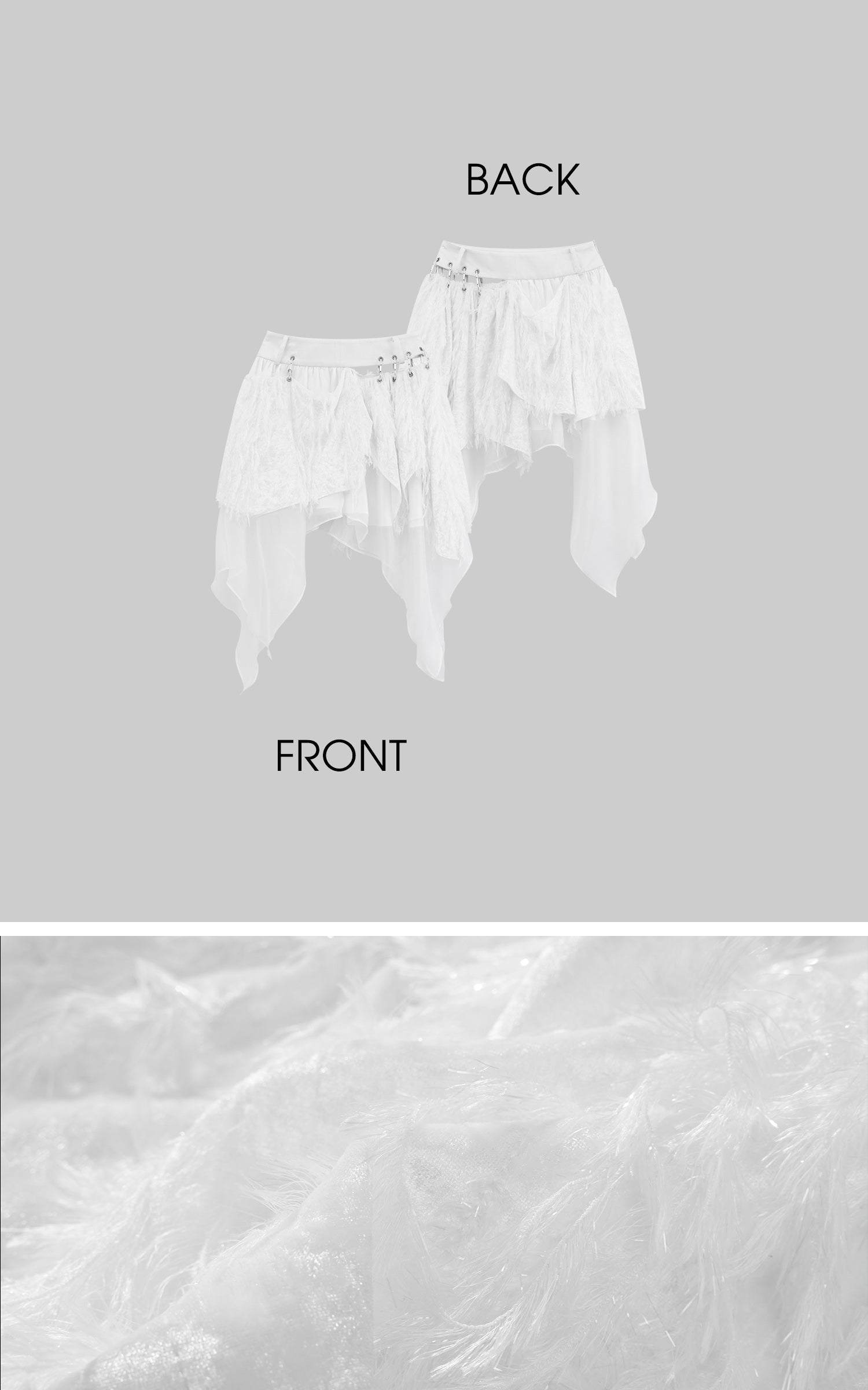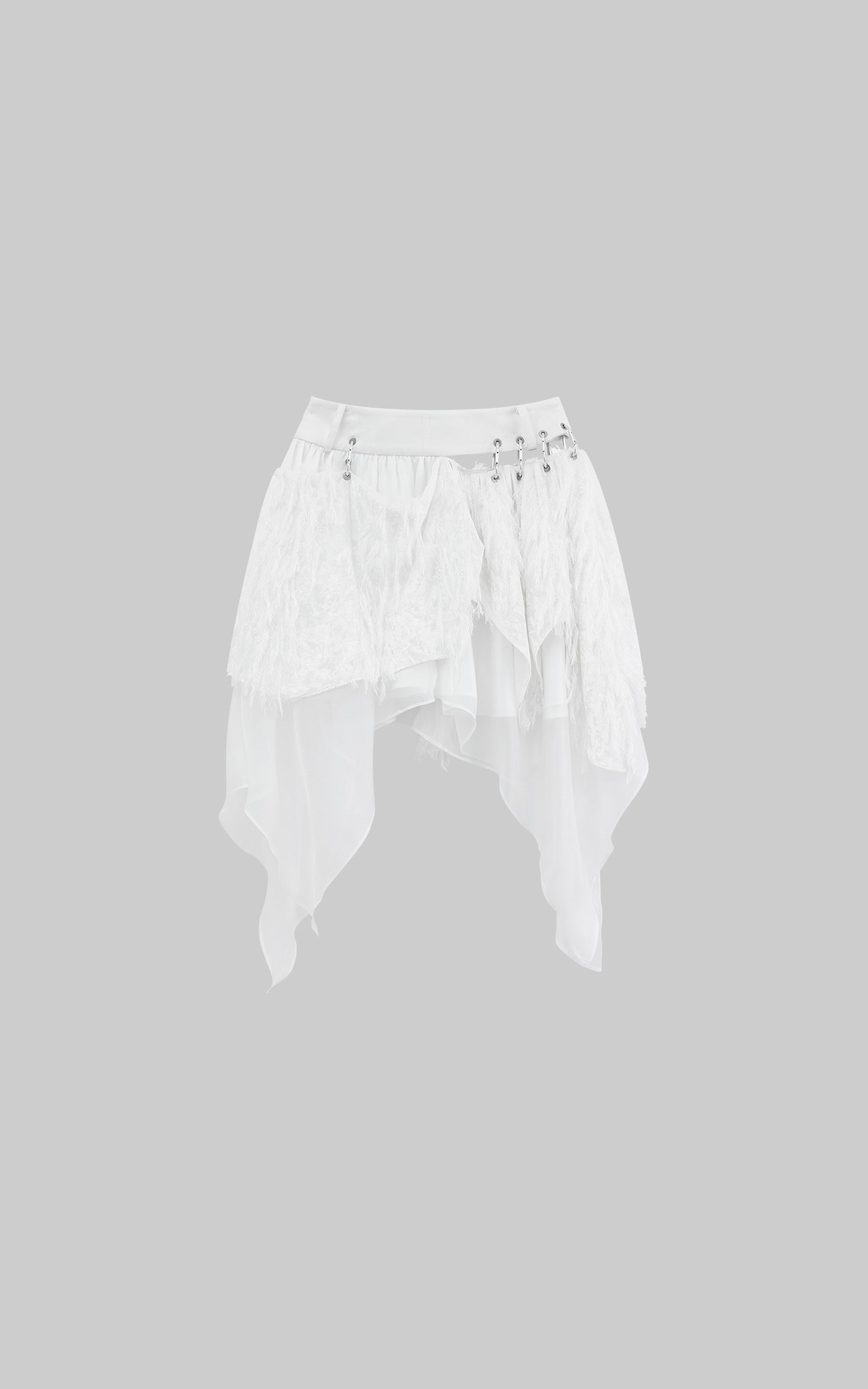 Una colisión de textura etérea y tensión industrial. Esta falda asimétrica presenta paneles con bordes sin rematar que asemejan plumas, chocando con drapeados transparentes, suspendidos de una cintura con ojales y herrajes de gran tamaño. La silueta fluye con el movimiento, pero interrumpe la simetría—diseñada para aquellos que resisten la estructura, pero dominan la calle. Combínala con botas o añade capas—no hay reglas.