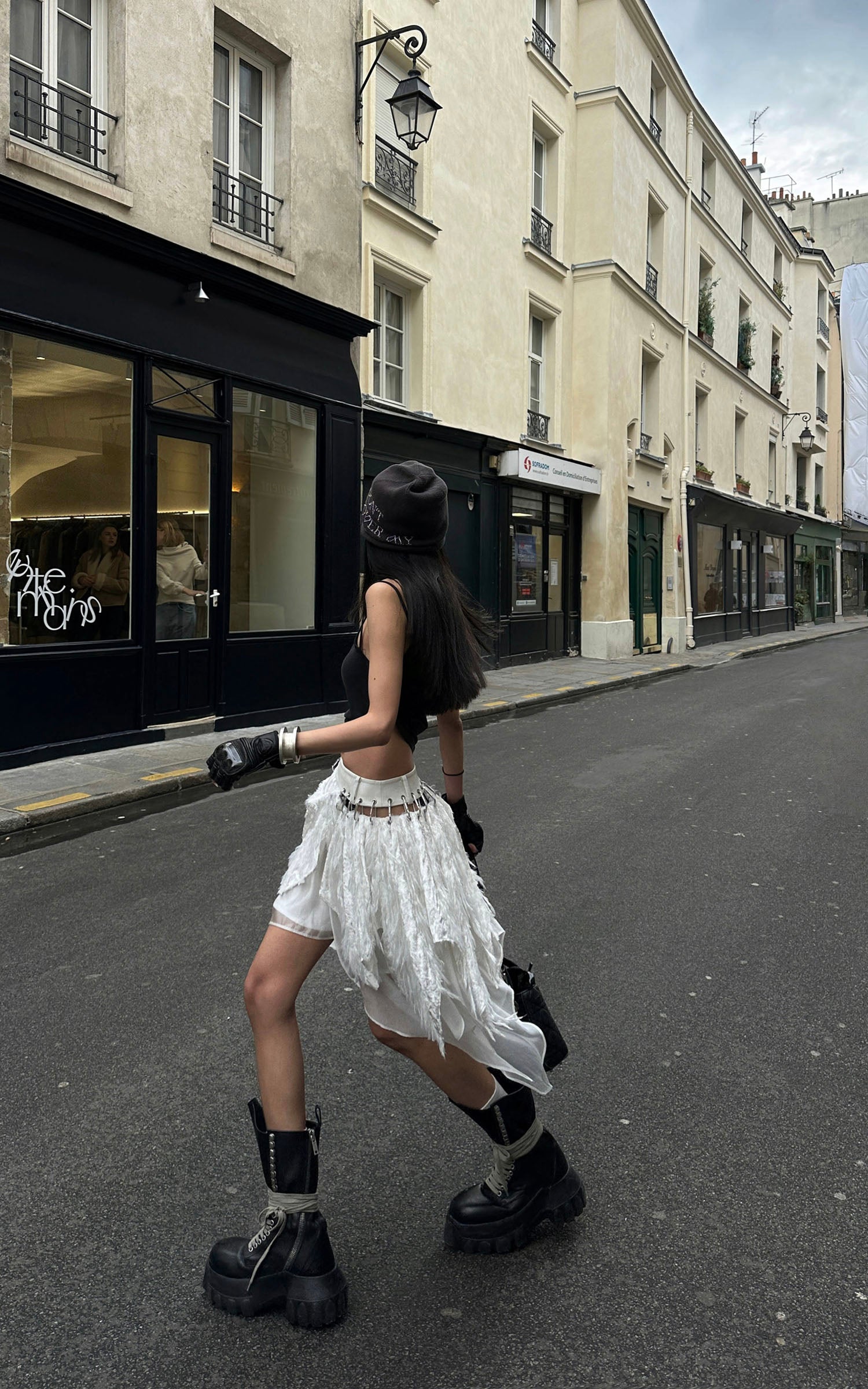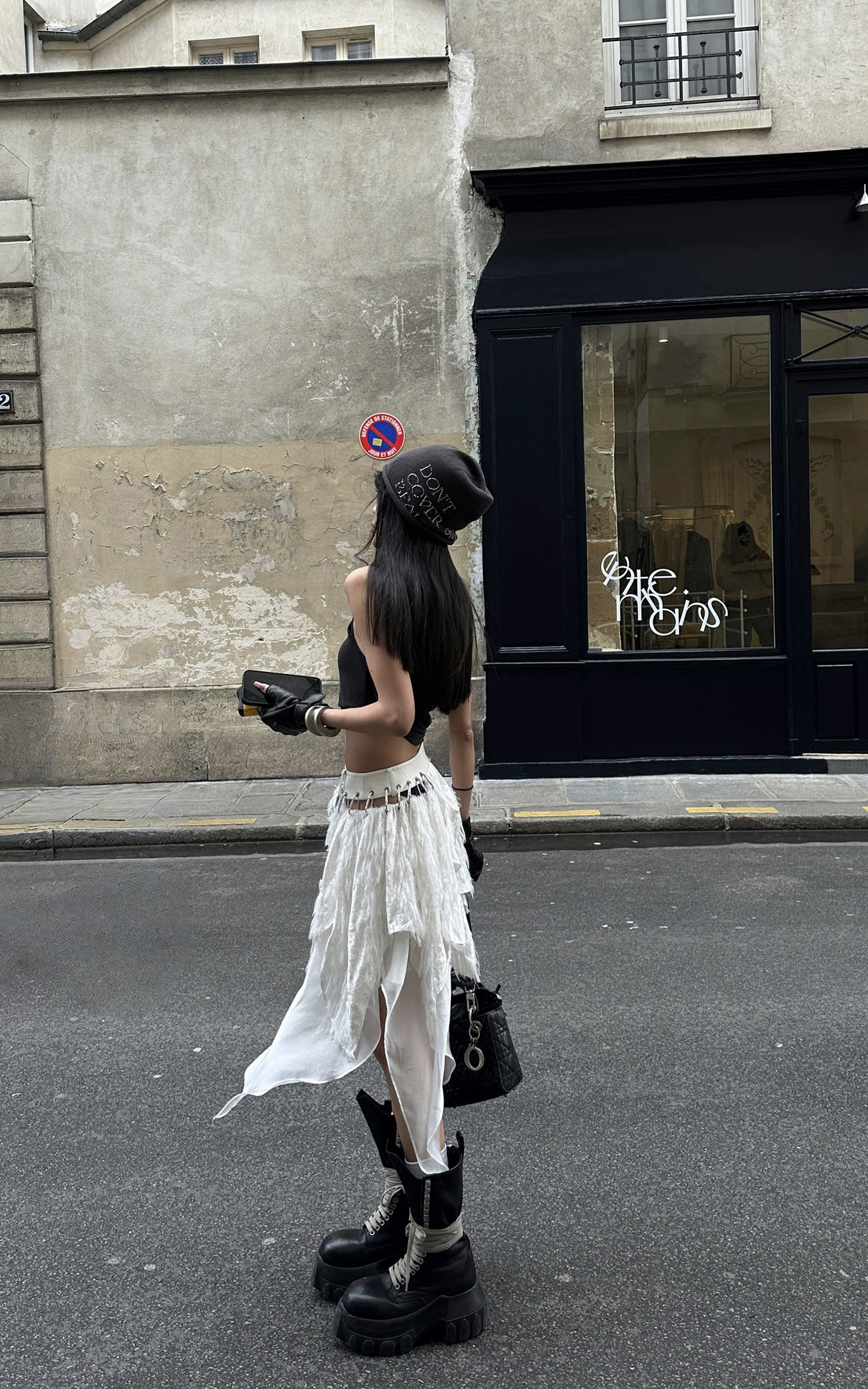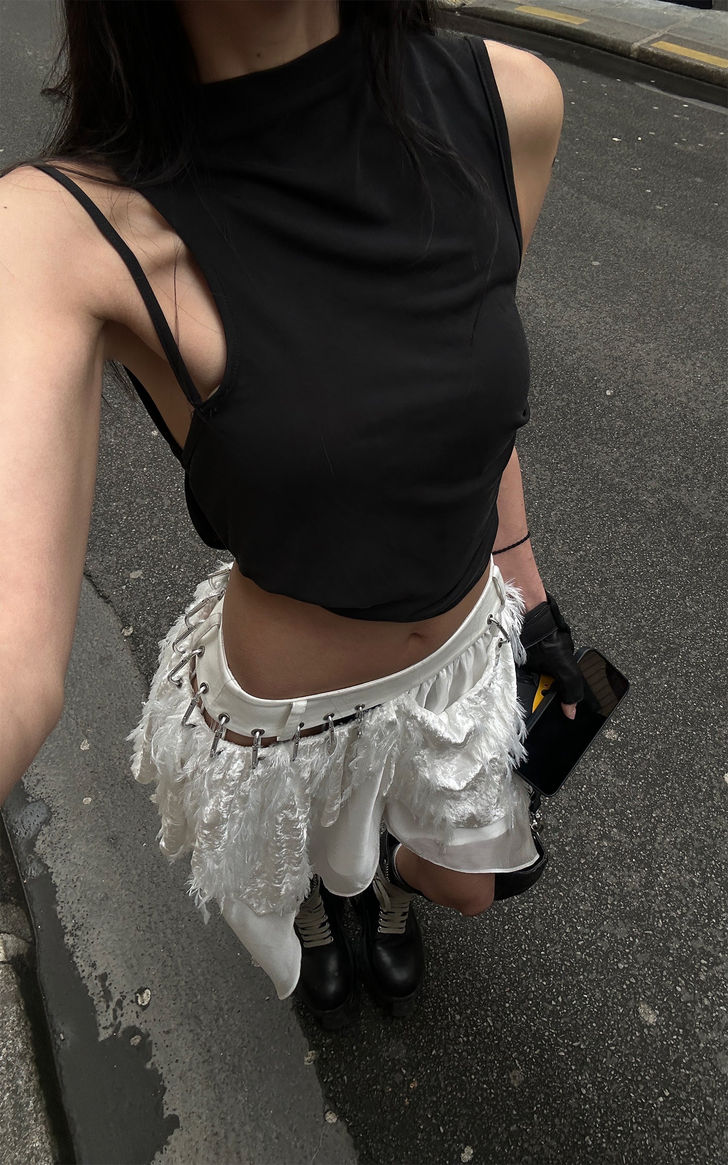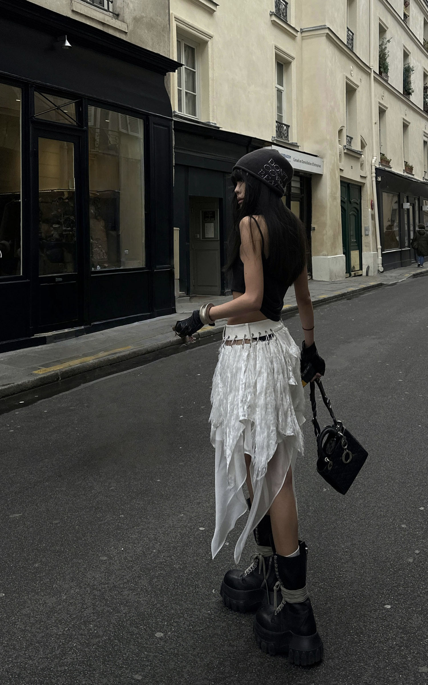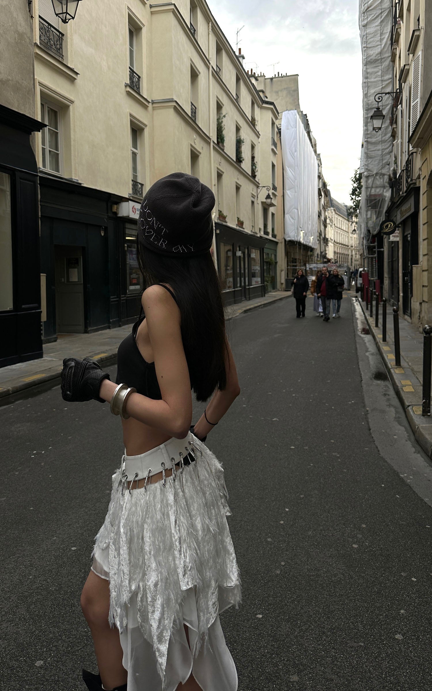 Una colisión de textura etérea y tensión industrial. Esta falda asimétrica presenta paneles con bordes sin rematar que asemejan plumas, chocando con drapeados transparentes, suspendidos de una cintura con ojales y herrajes de gran tamaño. La silueta fluye con el movimiento, pero interrumpe la simetría—diseñada para aquellos que resisten la estructura, pero dominan la calle. Combínala con botas o añade capas—no hay reglas.