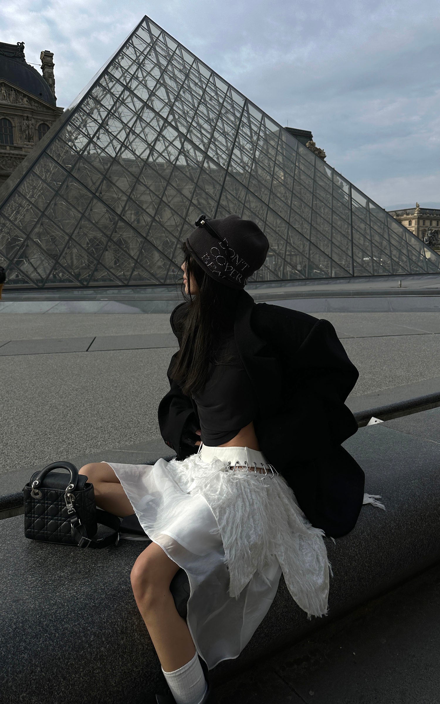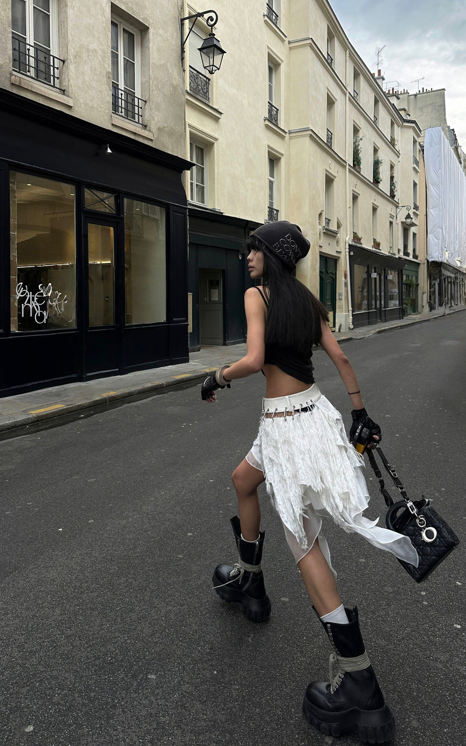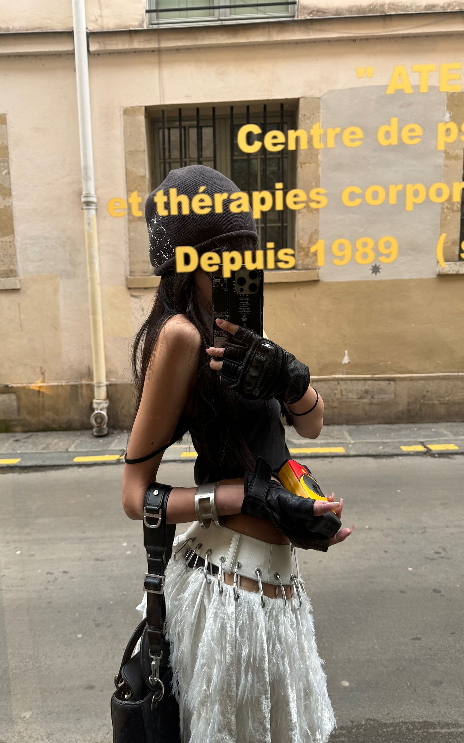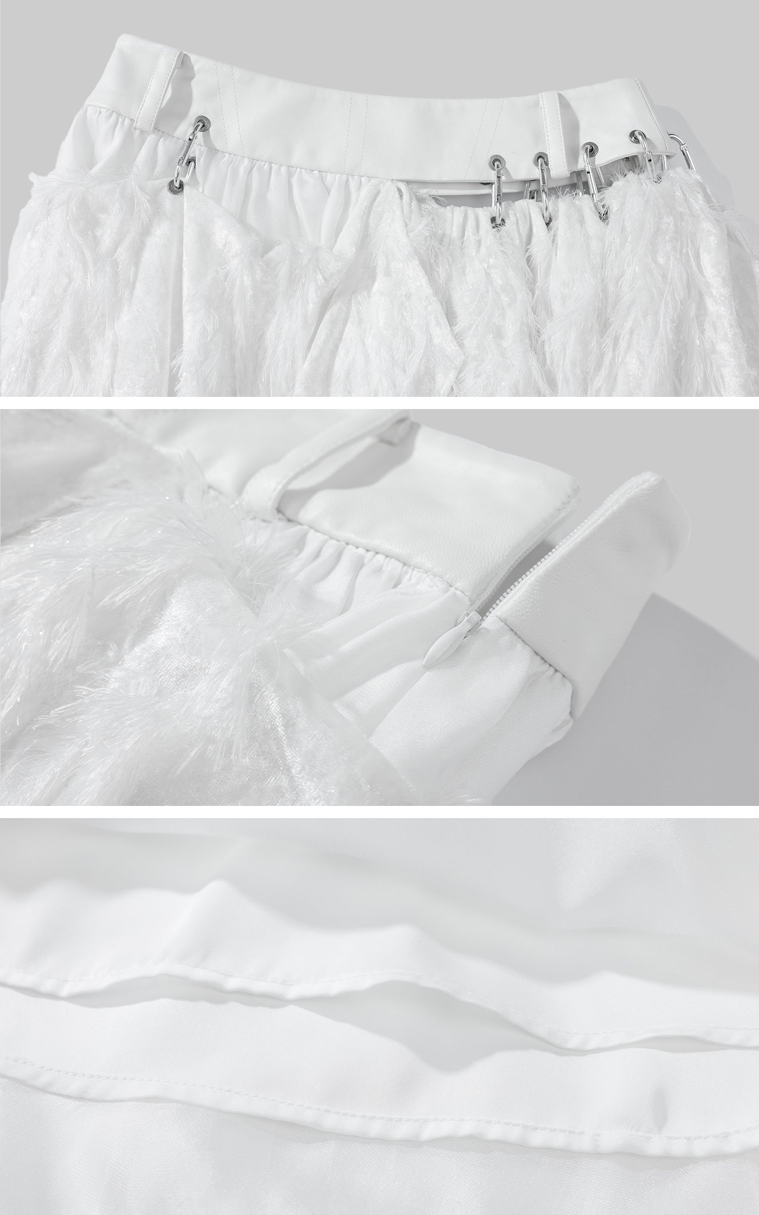 Una colisión de textura etérea y tensión industrial. Esta falda asimétrica presenta paneles con bordes sin rematar que asemejan plumas, chocando con drapeados transparentes, suspendidos de una cintura con ojales y herrajes de gran tamaño. La silueta fluye con el movimiento, pero interrumpe la simetría—diseñada para aquellos que resisten la estructura, pero dominan la calle. Combínala con botas o añade capas—no hay reglas.