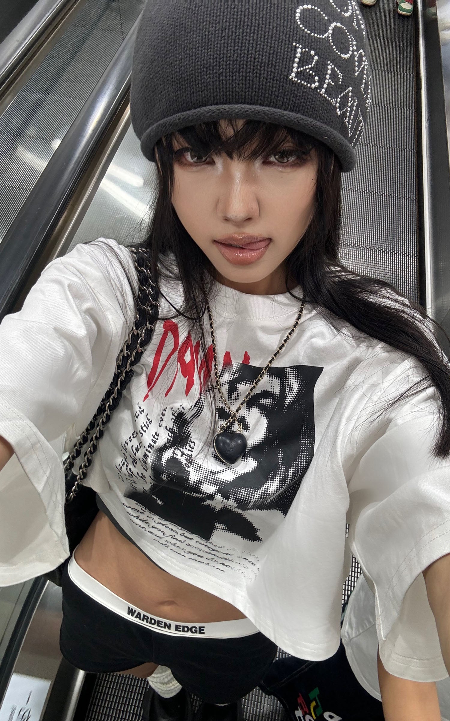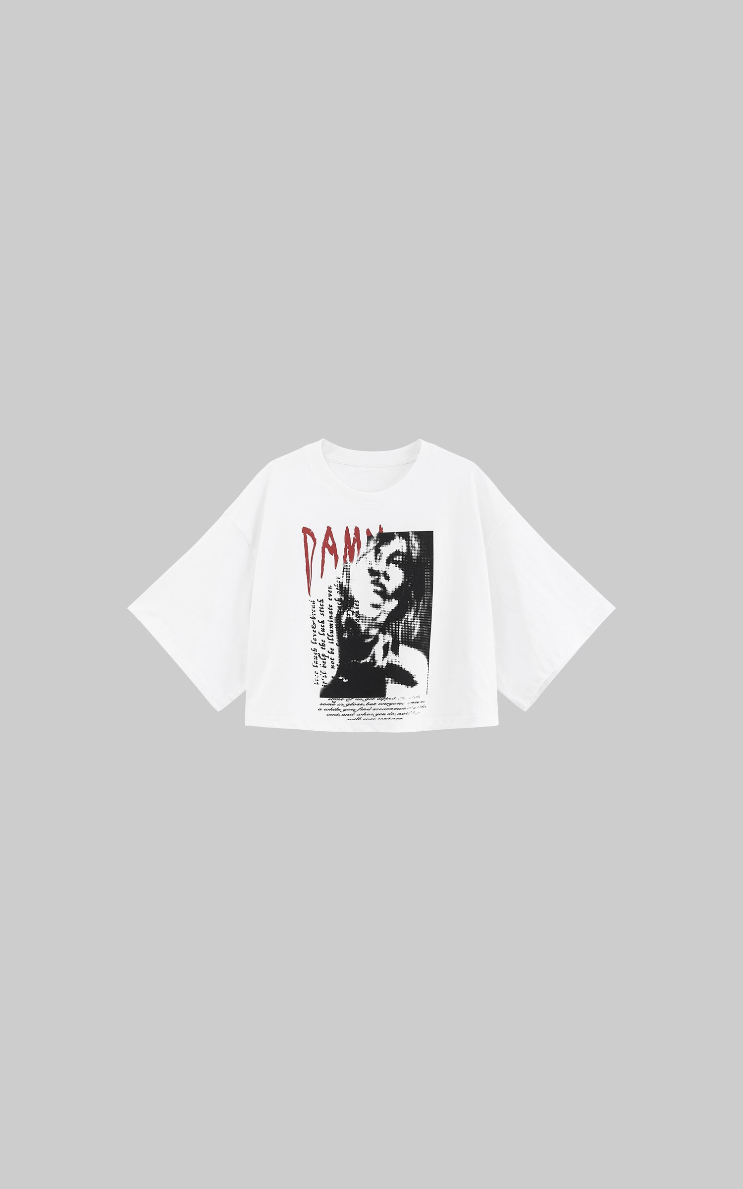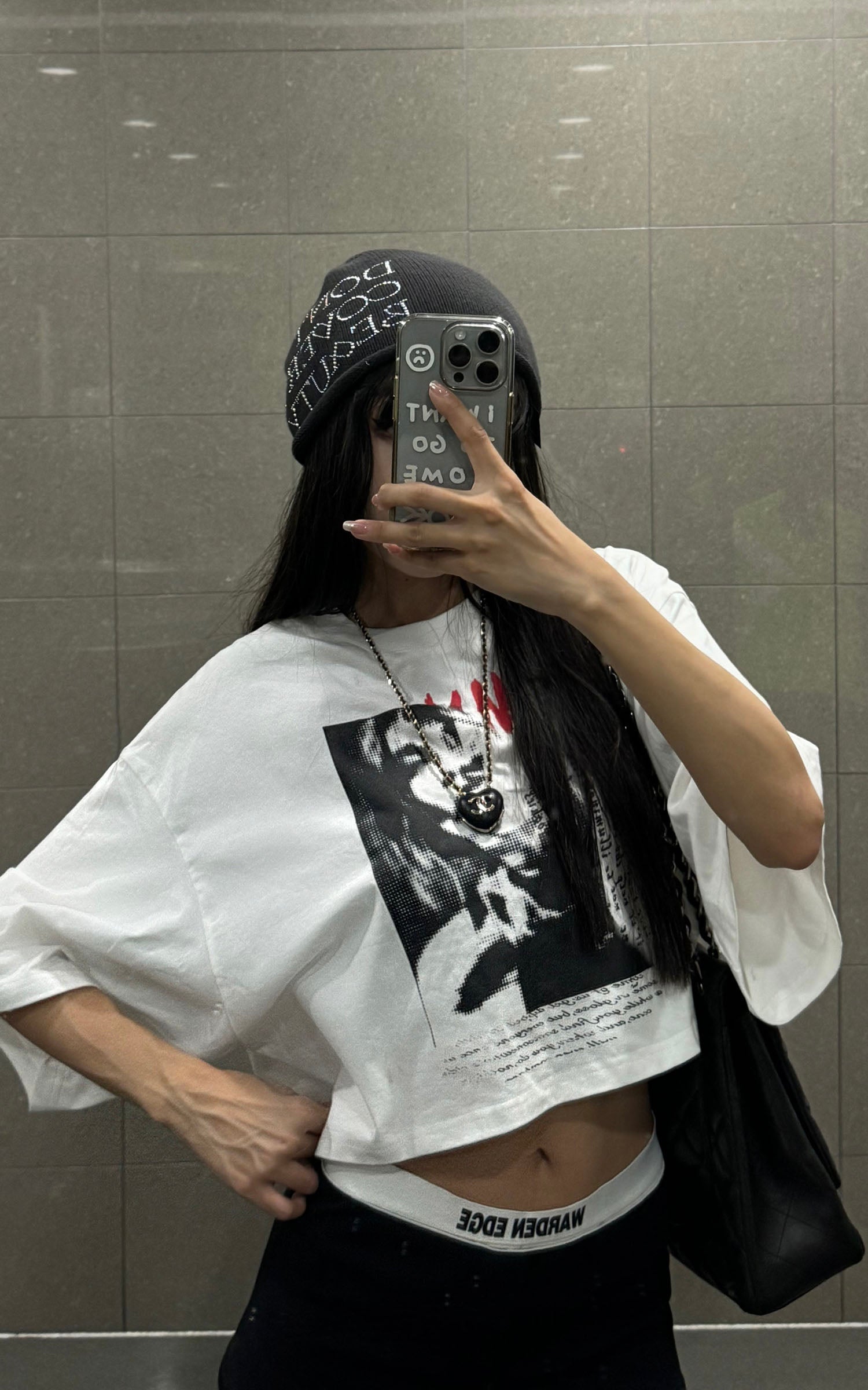 Una interpretación cruda del vestir casual. Esta camiseta corta y holgada presenta un retrato monocromático difuminado enmarcado con tipografía desgastada y acentos rojo sangre, canalizando el espíritu de la rebelión. Confeccionada en suave algodón de gran peso con una caída ligeramente estructurada, las mangas anchas y la silueta cuadrada empujan los límites entre lo urbano y lo llamativo. Úsala sola o en capas para amplificar el ruido.