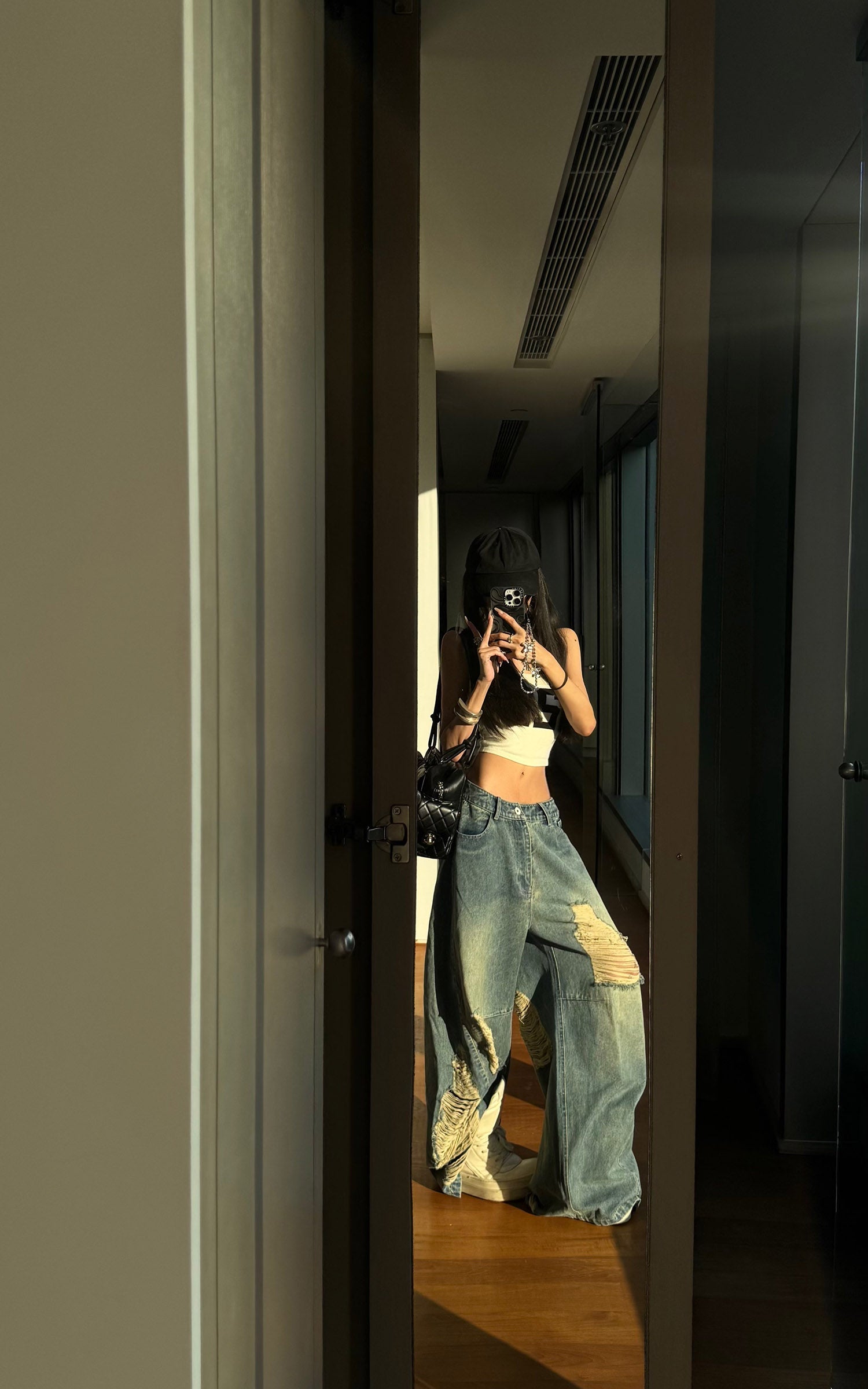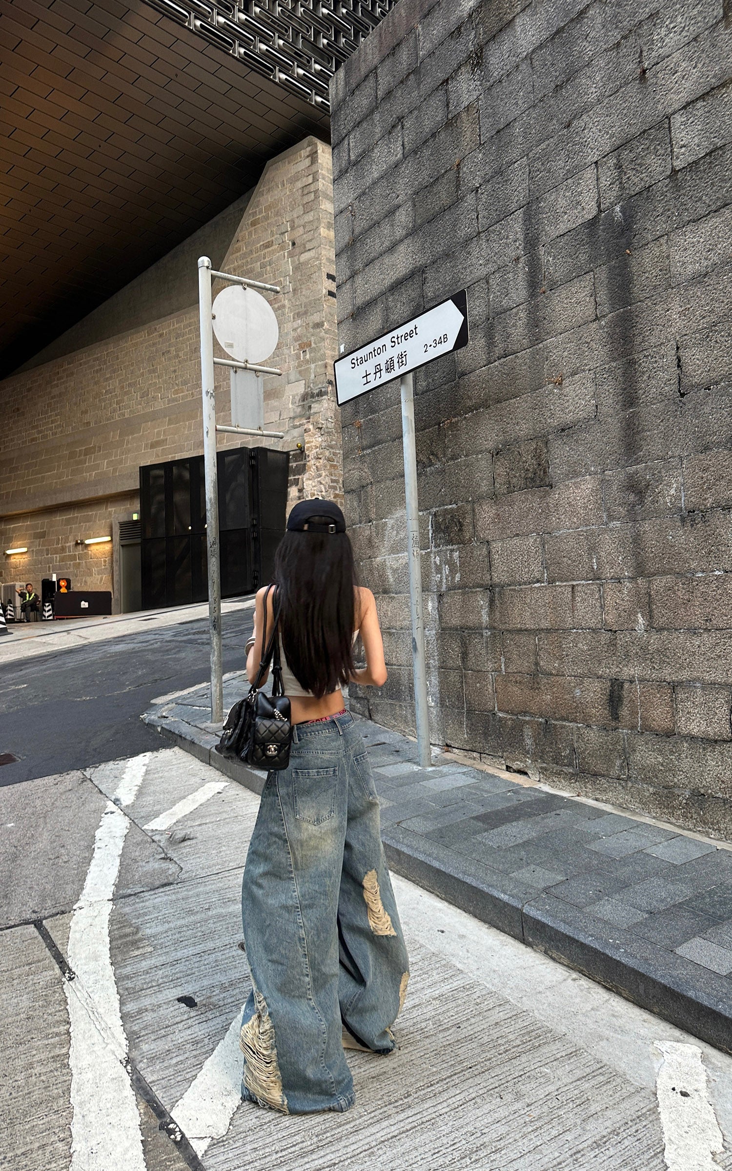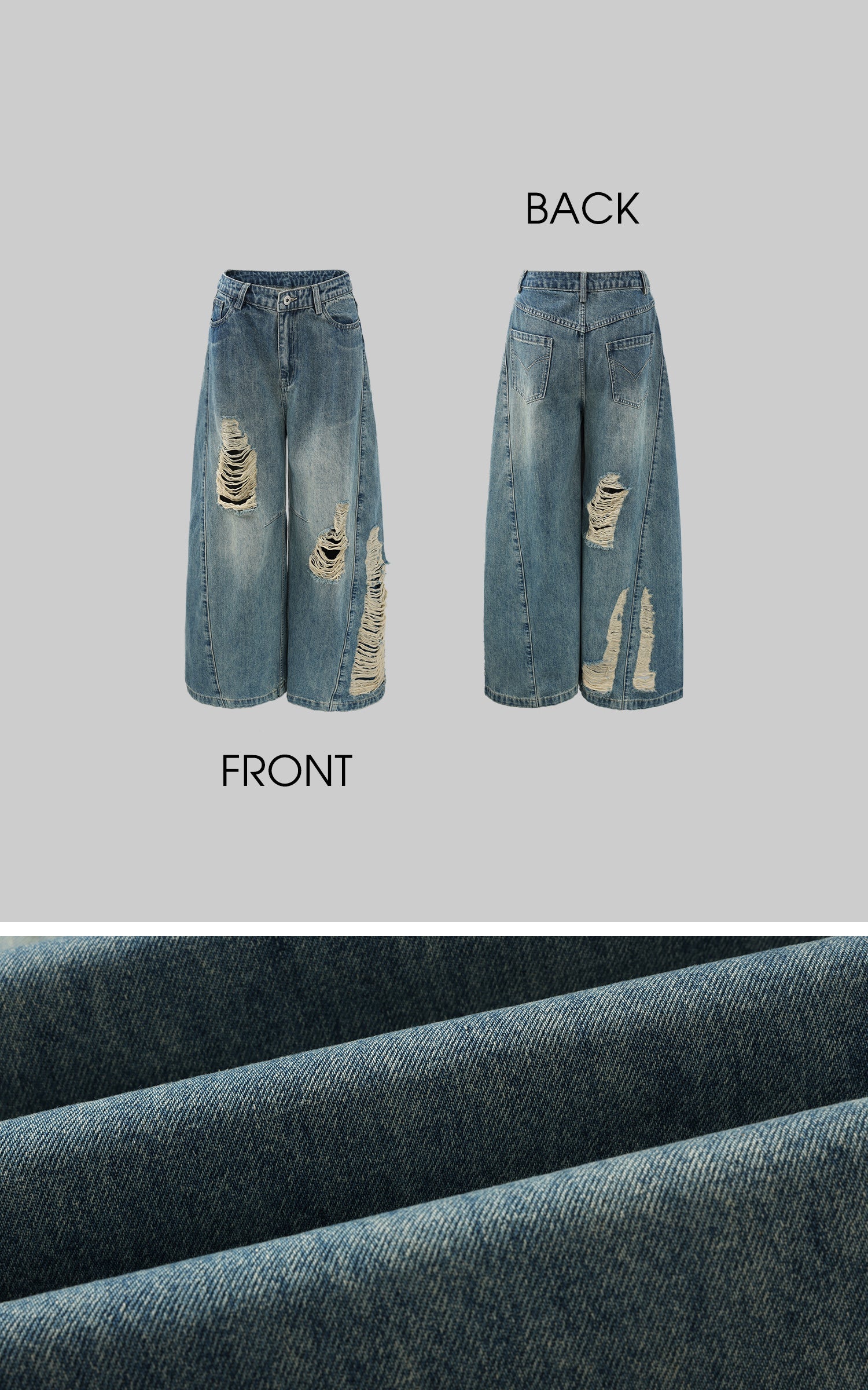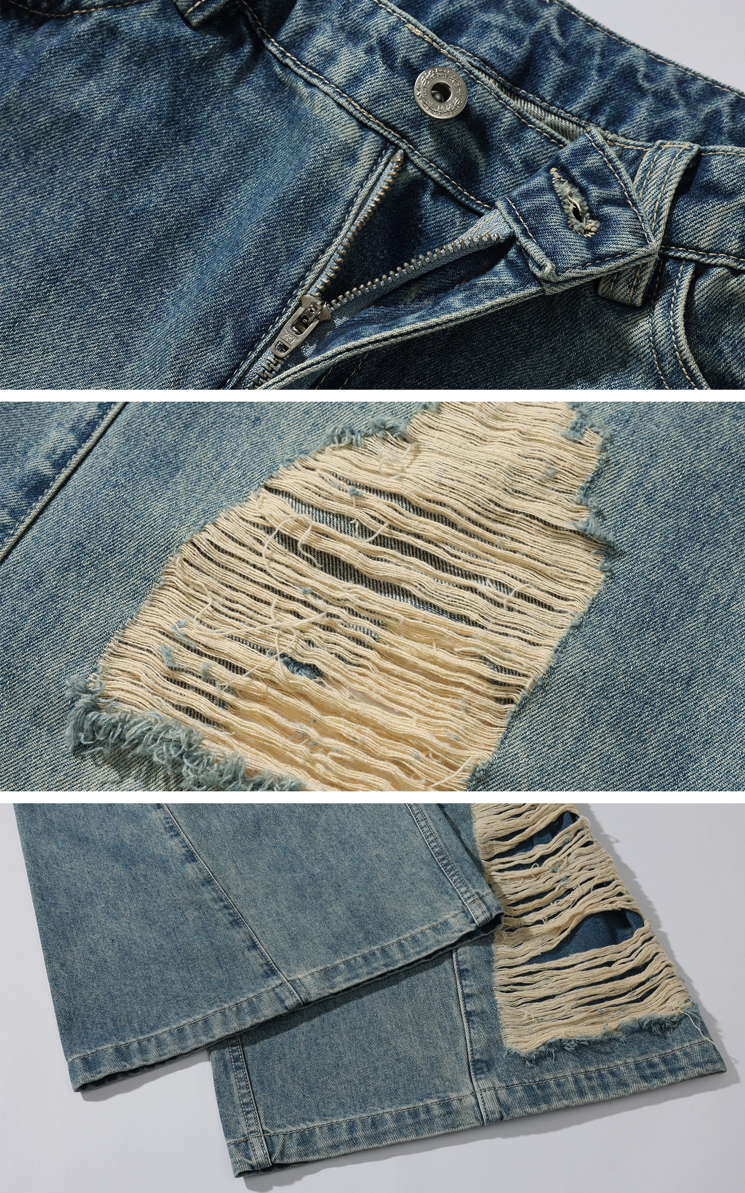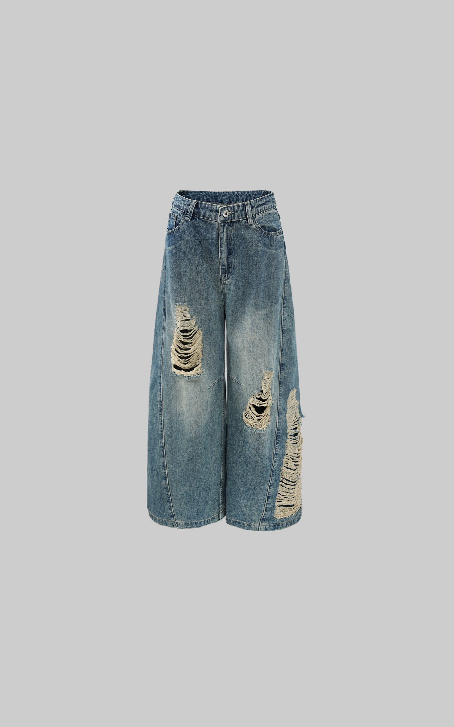 La expresión cruda se encuentra con una silueta diseñada. Estos jeans de pierna ancha están rasgados con cortes deshilachados, exponiendo una capa caótica debajo del denim desgastado. Diseñados con un volumen exagerado y una agresión discreta, cada rasgadura resiste la reparación. No están hechos para durar. Están hechos para resistir.