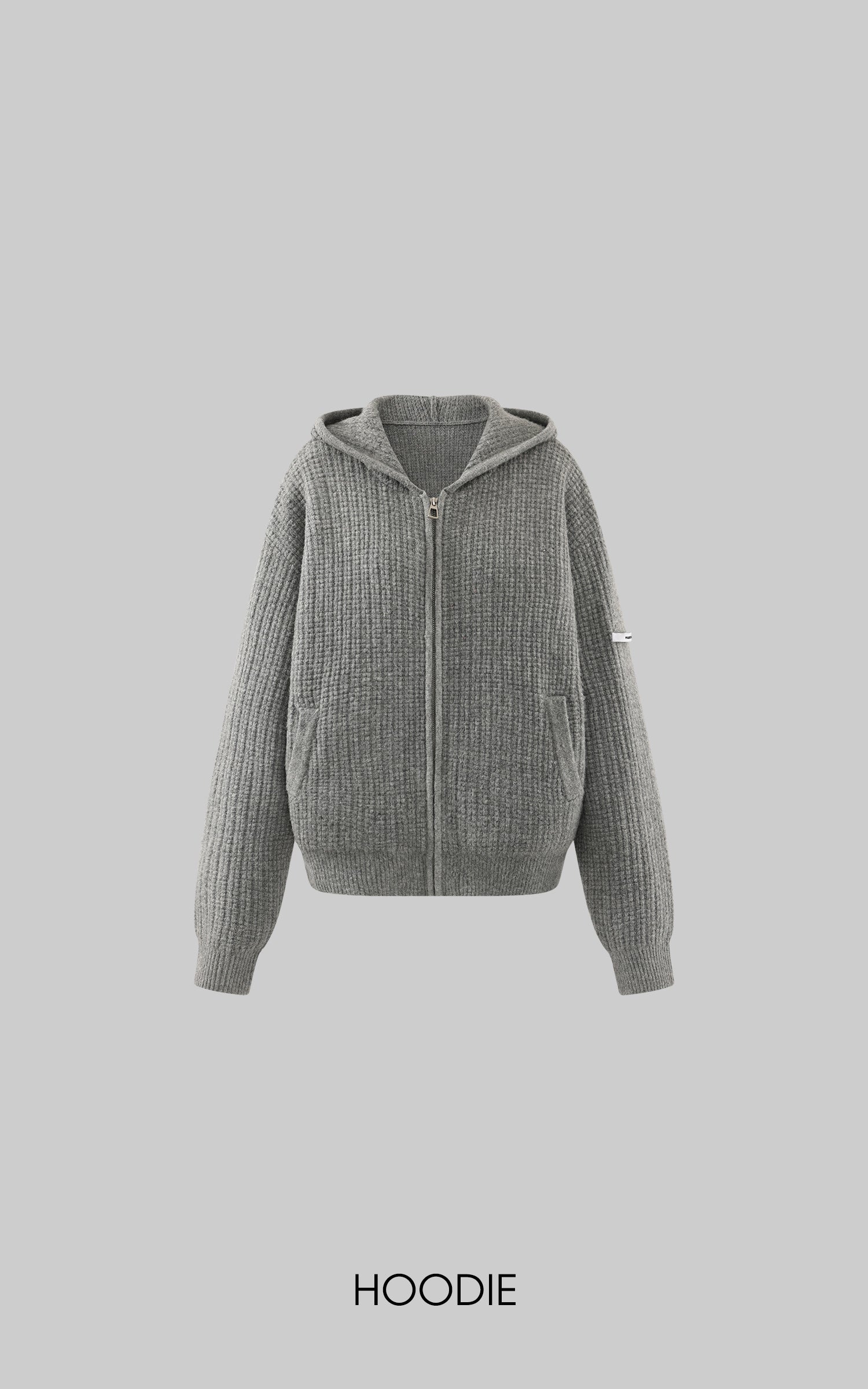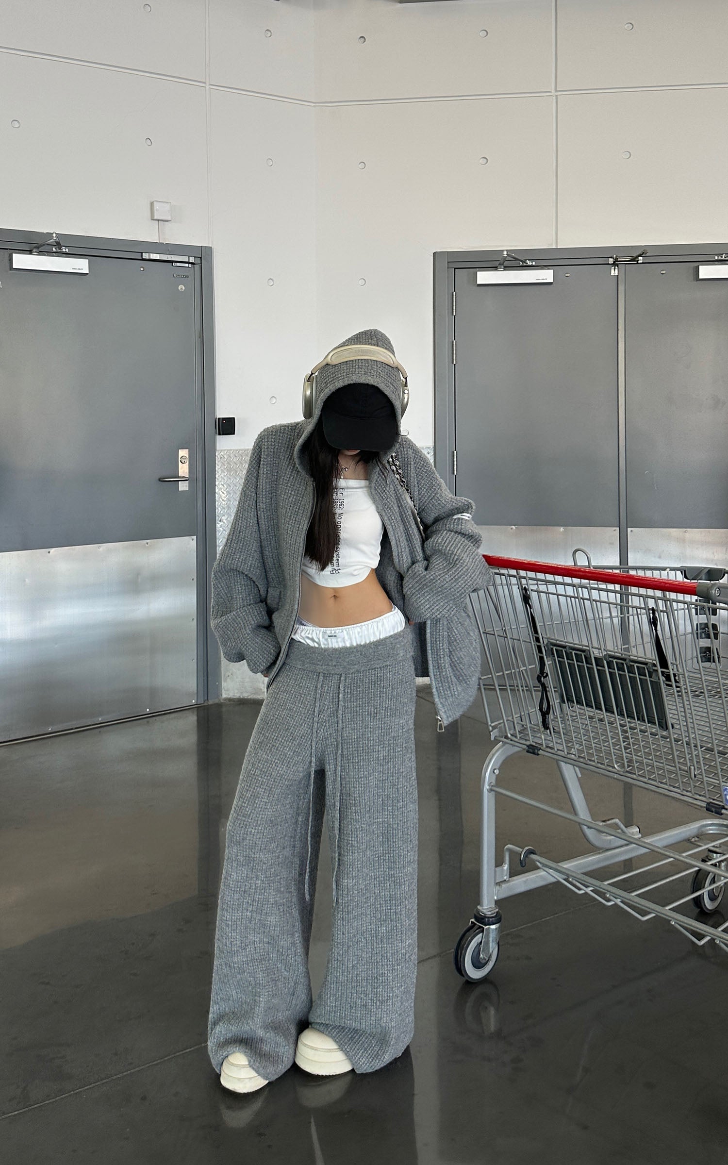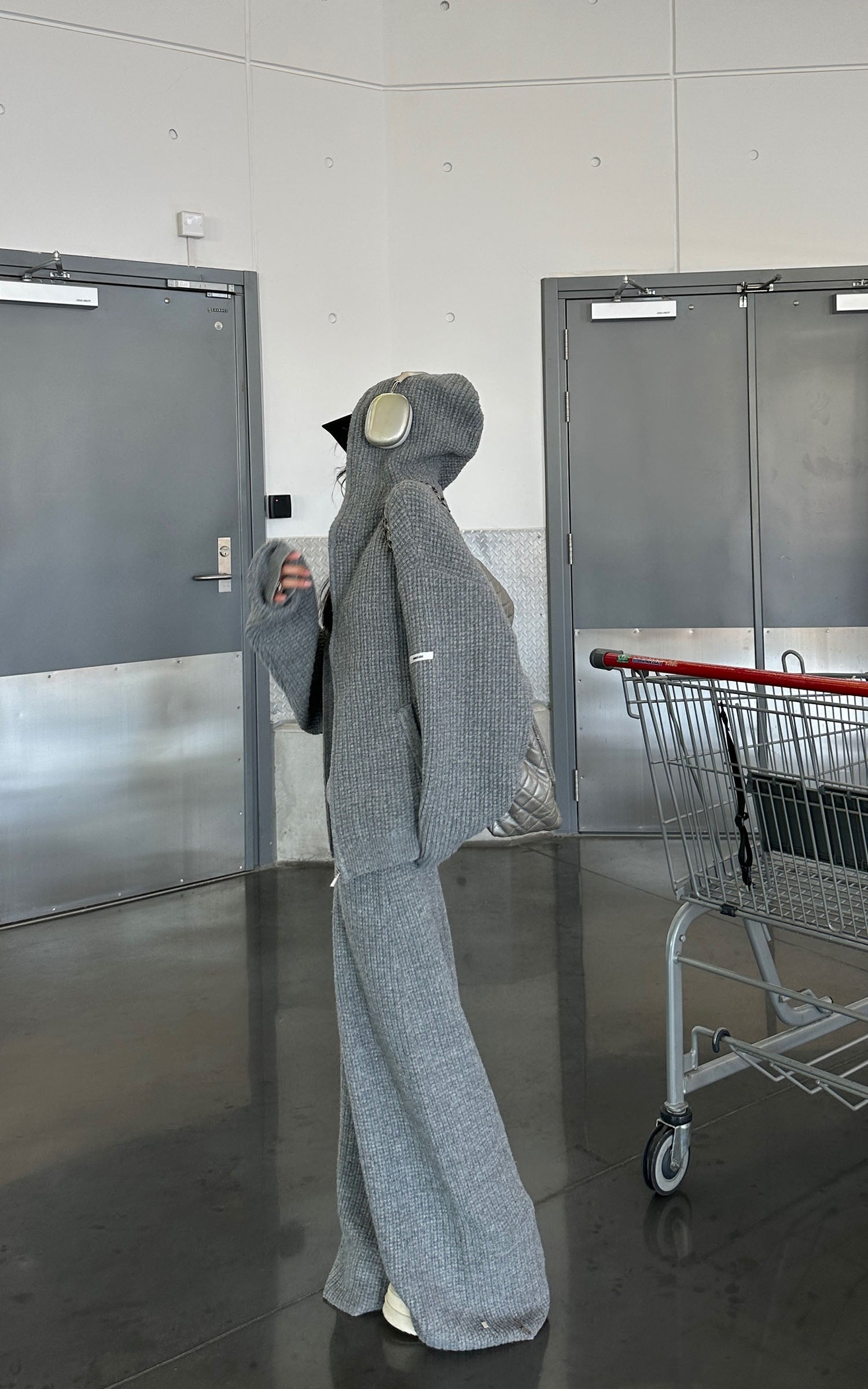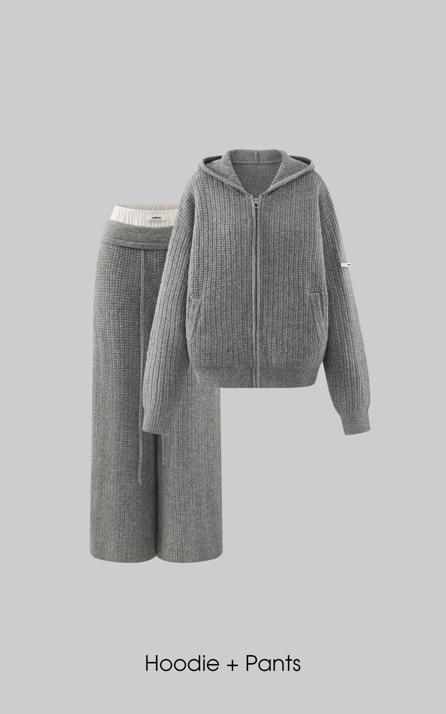 Un conjunto de punto texturizado que presenta una chaqueta con capucha de gran tamaño y pantalones de pierna ancha, diseñado para una silueta relajada pero estructurada. Confeccionado con hilo grueso y suave con una textura sutil acanalada, combina comodidad con un toque vanguardista. Los hombros caídos y las mangas voluminosas realzan la sensación desenfadada, mientras que la cintura ajustable con cordón añade facilidad de uso. Transición sin esfuerzo entre la comodidad interior y el minimalismo urbano.