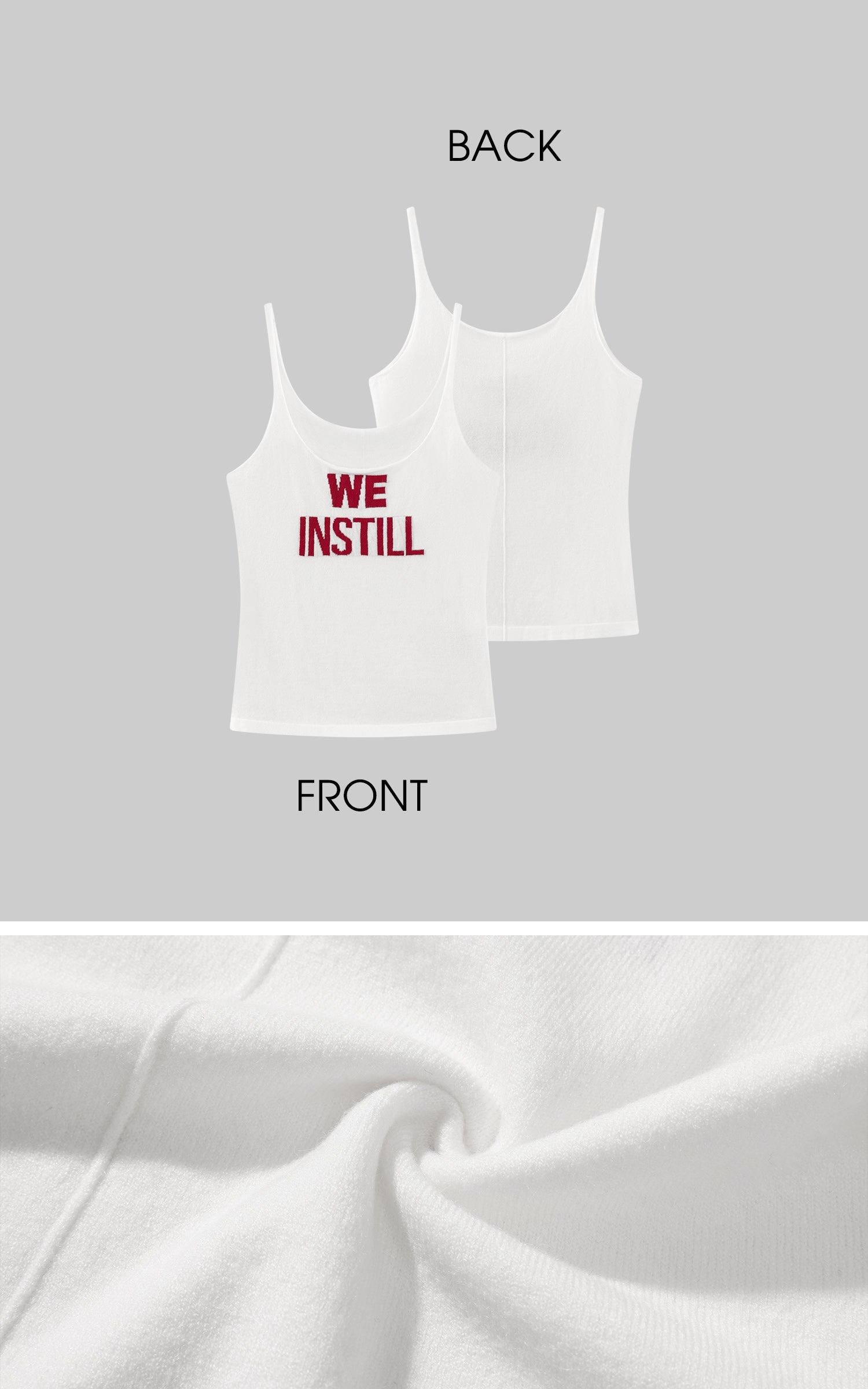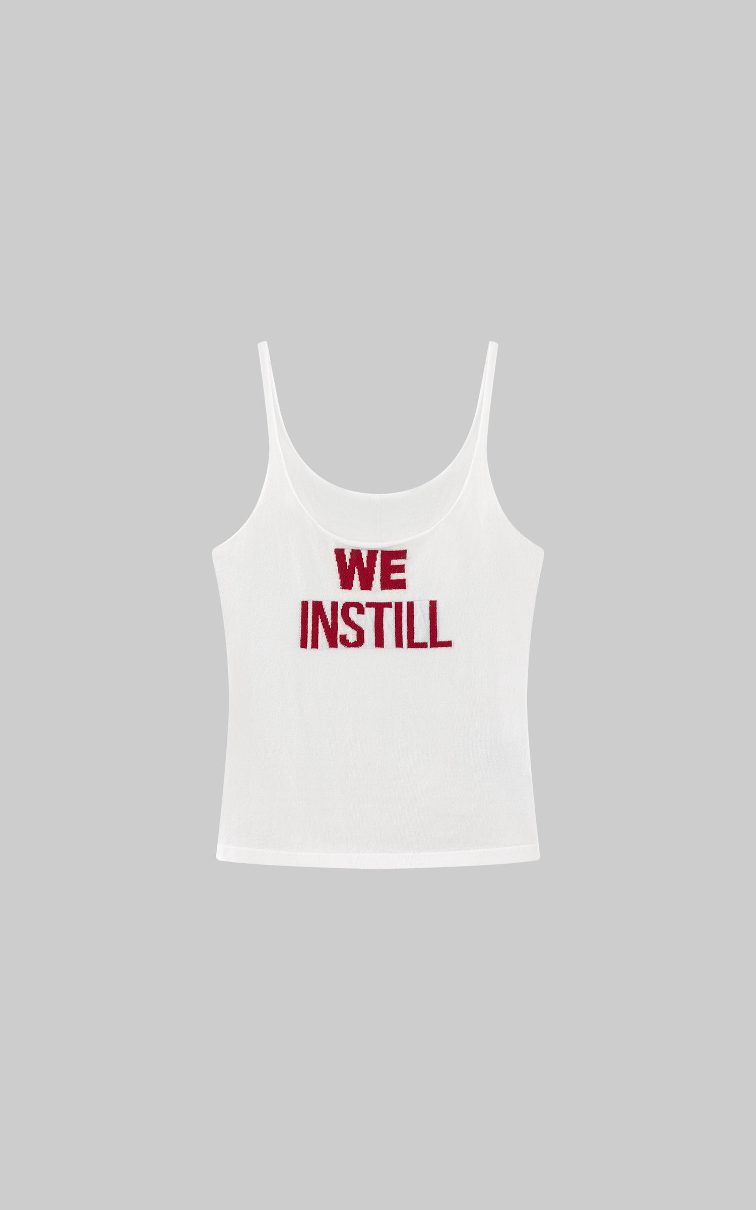 Un top de punto ajustado con un escote redondo limpio y tirantes delgados, confeccionado con hilo elástico suave para un ajuste ceñido y esculpido. Las audaces letras jacquard "WE INSTILL" añaden un toque gráfico a la silueta minimalista. Ligero y táctil, se superpone sin esfuerzo bajo camisas o se lleva solo para una declaración refinada pero con un toque urbano. Confianza silenciosa en una forma compacta.