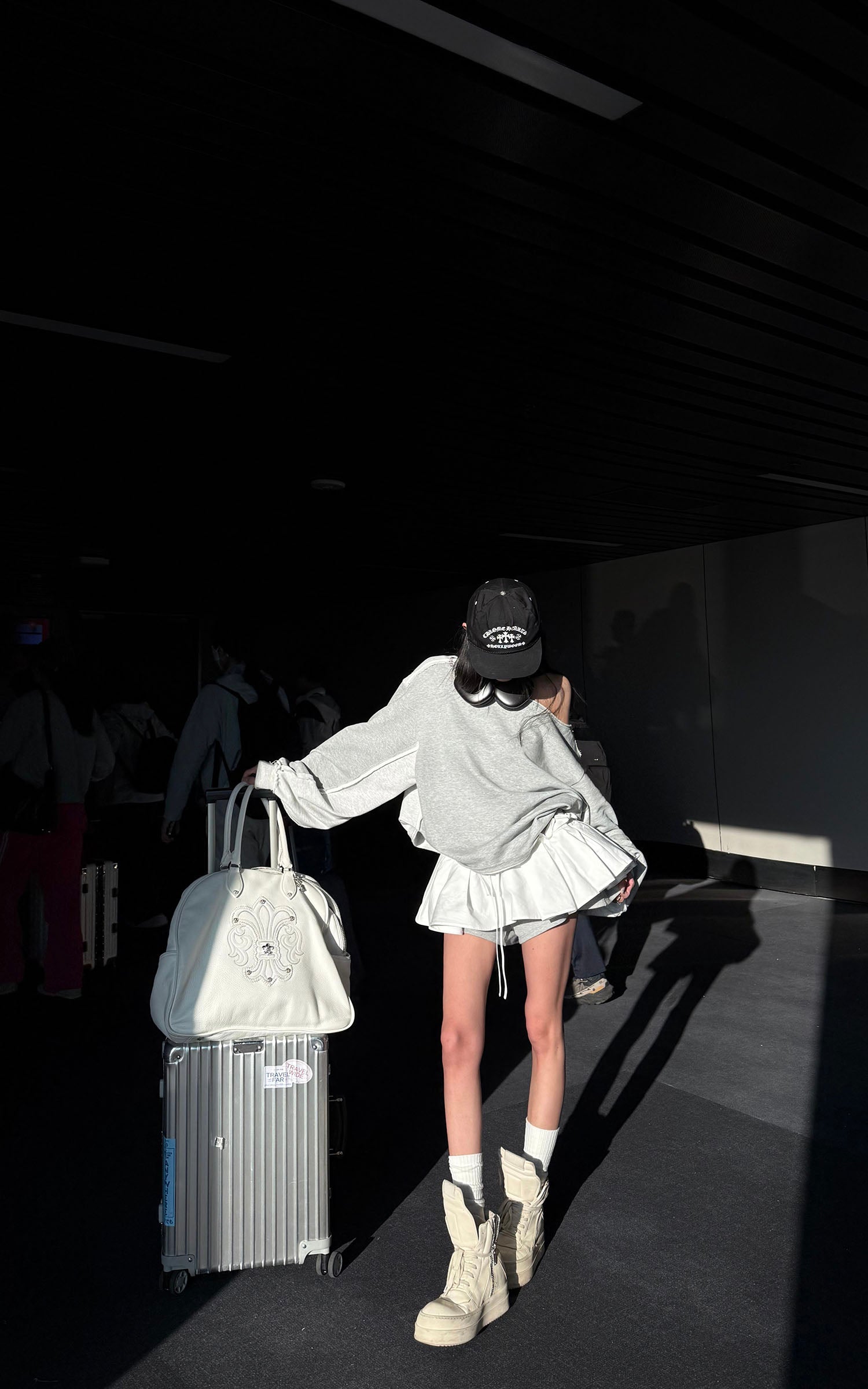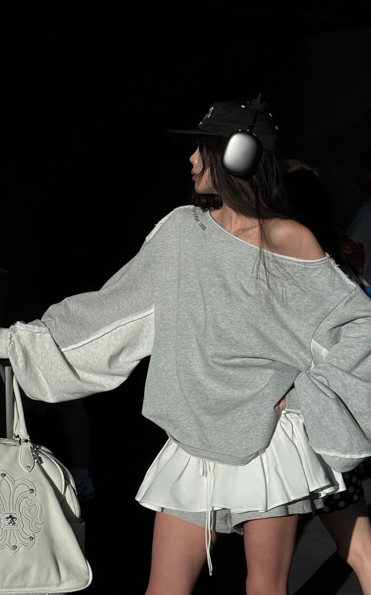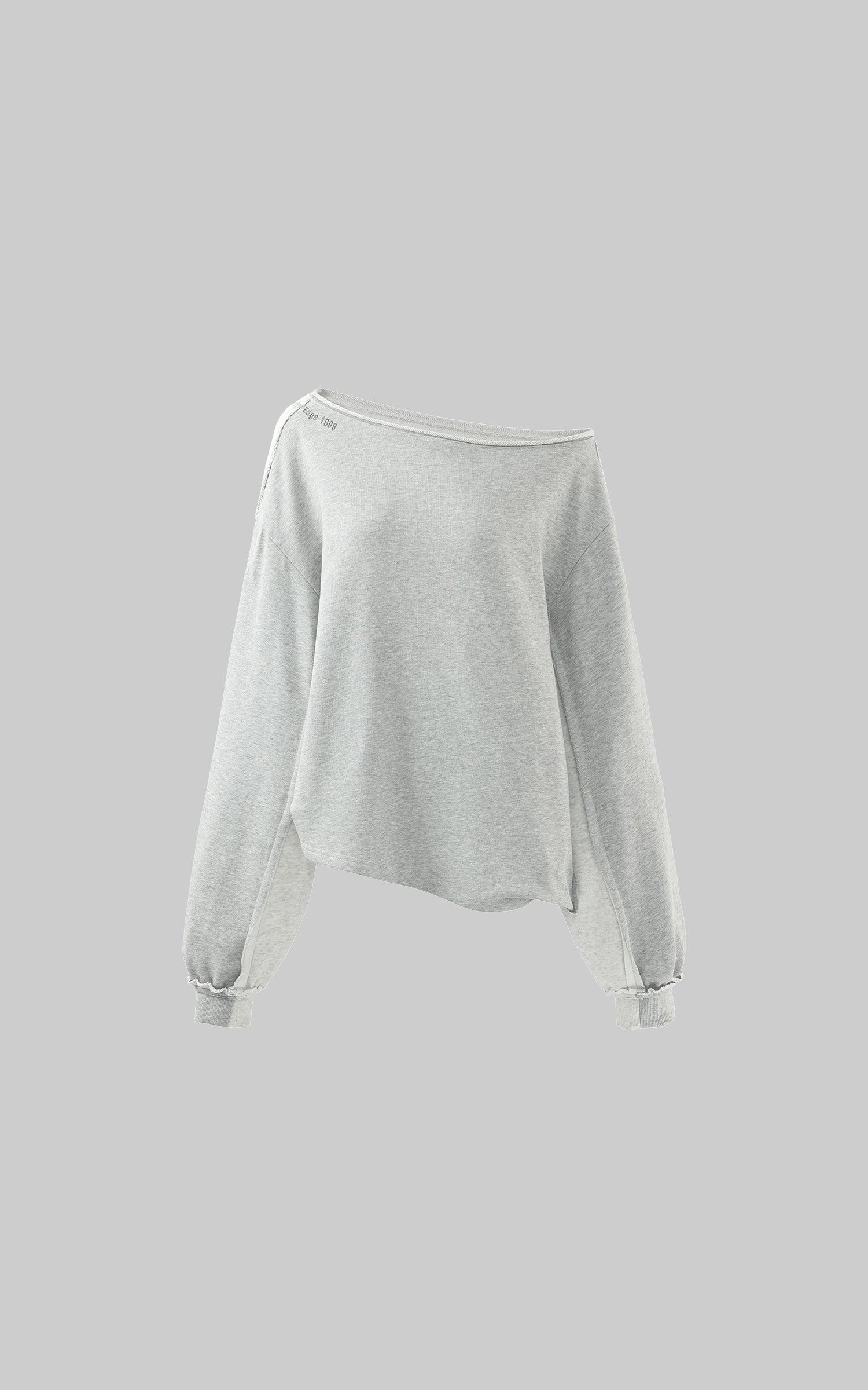 Un sweat-shirt déconstruit avec un col tombant et des épaules abaissées, fabriqué en molleton de coton doux. Les coutures à bords bruts tracent les manches et les poignets, exagérant le volume tout en brisant les conventions. Conçu pour une silhouette décontractée mais élégante—surdimensionné, inachevé et subversif dans sa simplicité.