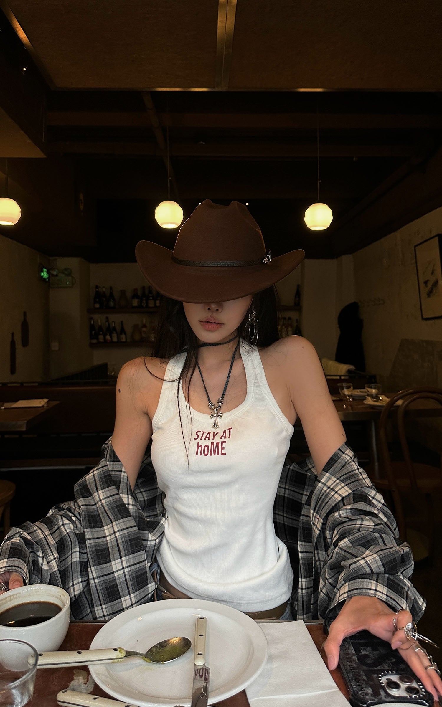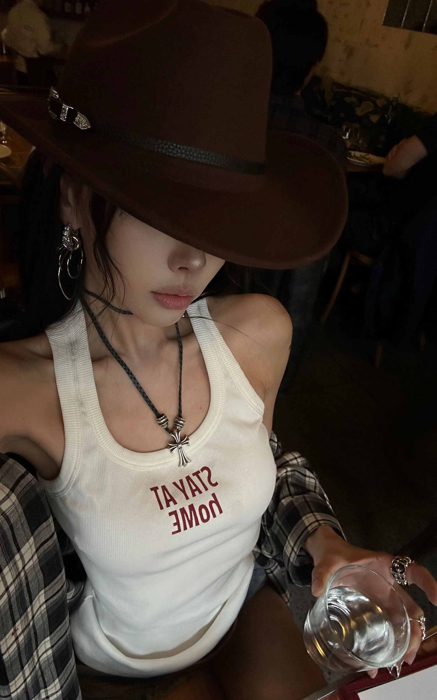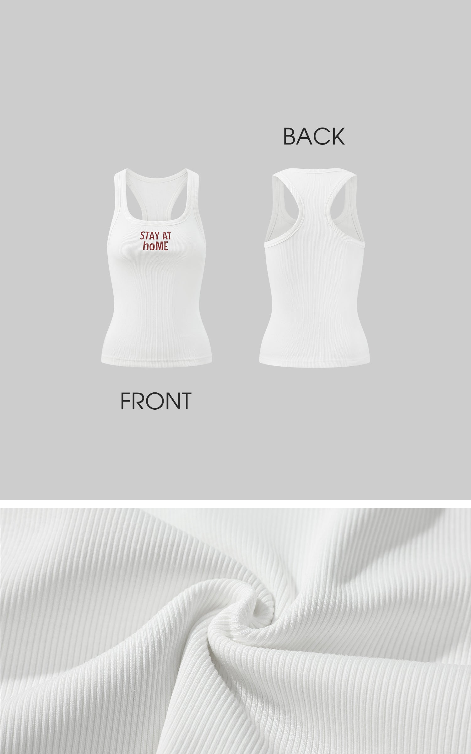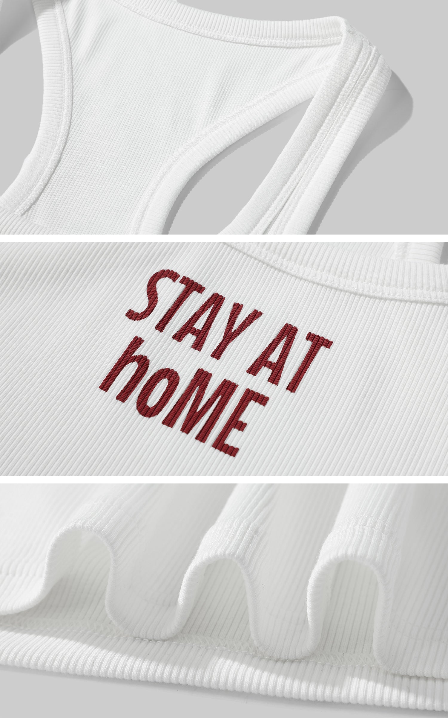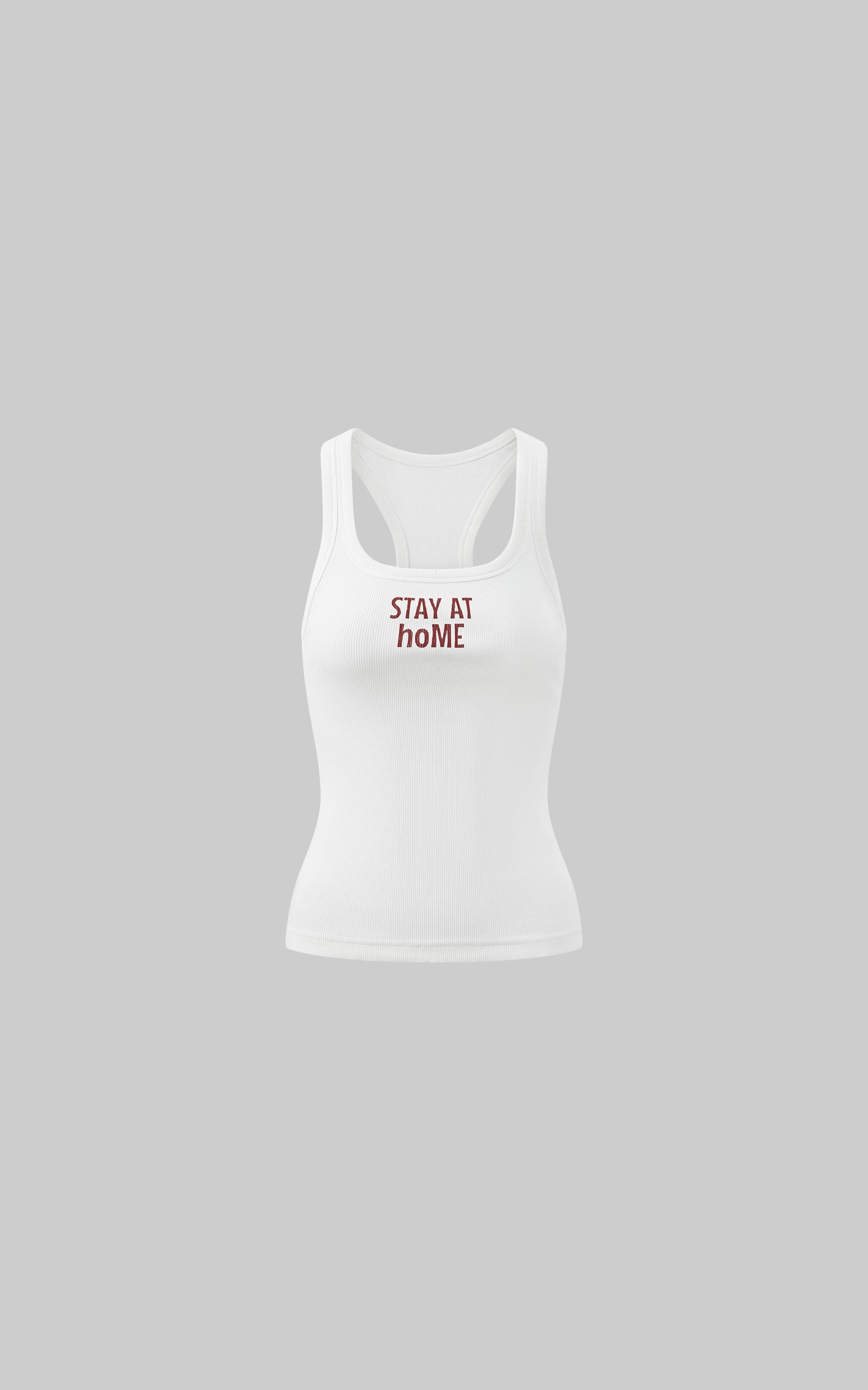 A laid-back essential with a rebellious twist. This cropped tank top features a sleek ribbed texture and a bold "STAY AT HOME" print across the chest. Designed with a U-neckline and racerback cut, it offers a flattering, fitted silhouette that hugs the body in all the right places. Perfect for layering under oversized shirts or pairing with high-waisted denim for an effortless street-style look.