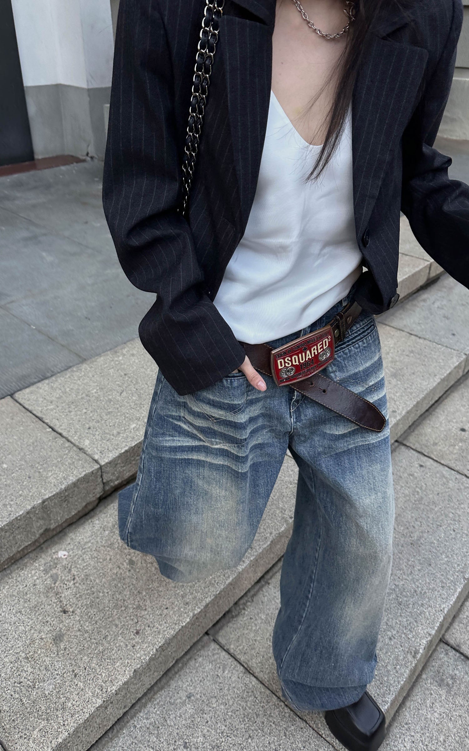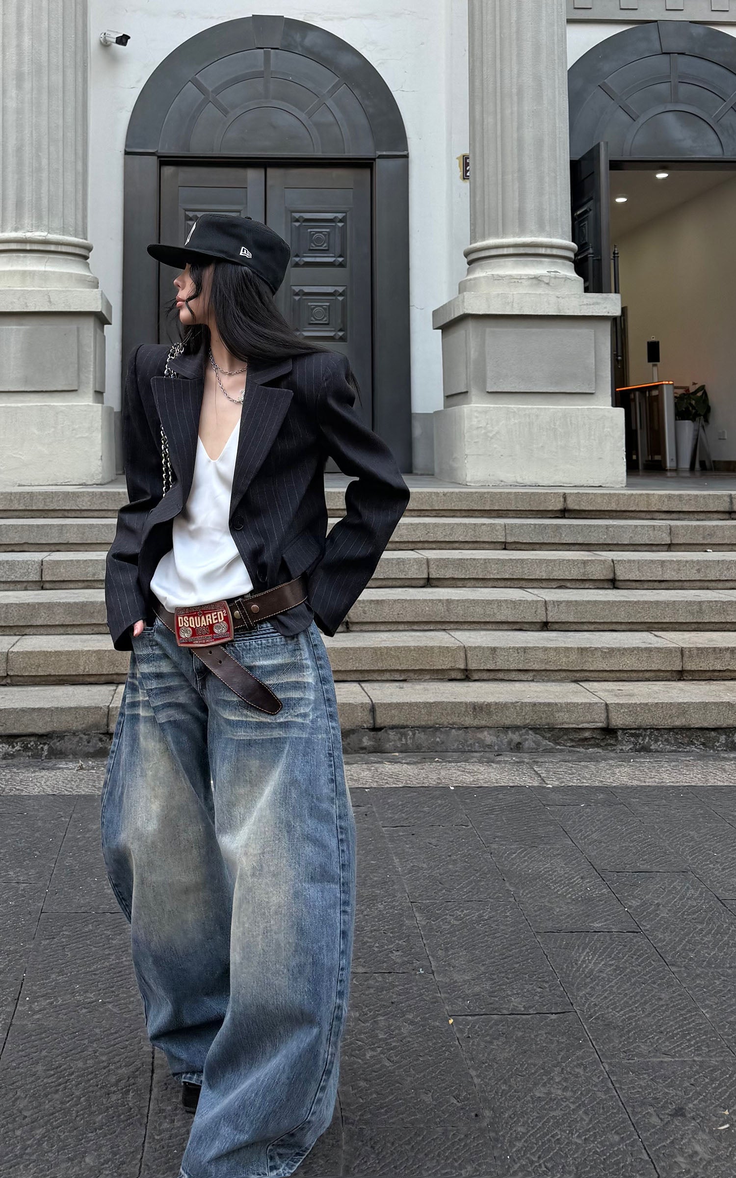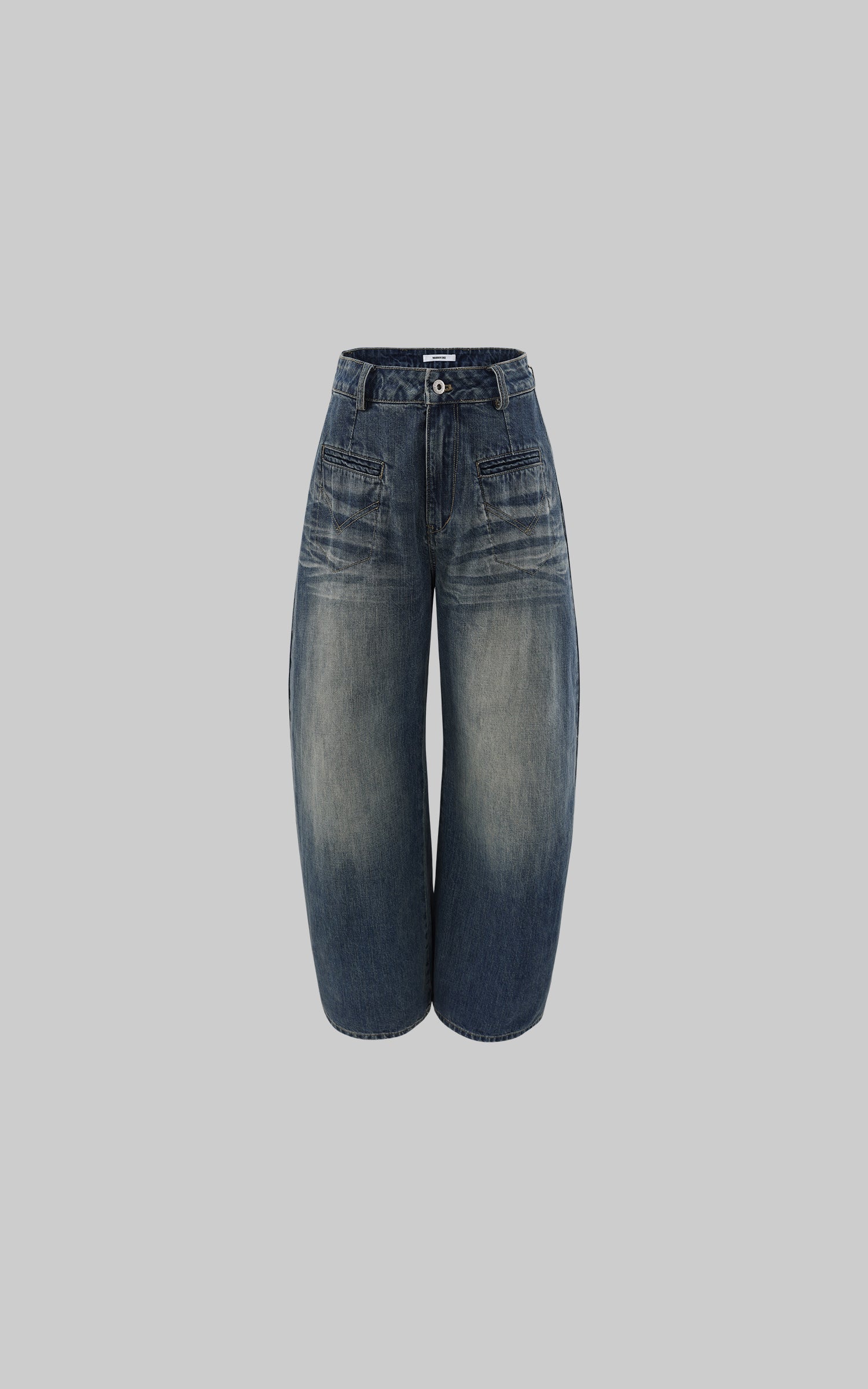 Ces pantalons en denim réinterprètent la silhouette à jambes larges à travers une construction sculpturale et consciente du corps. Une taille haute ancre la forme, tandis qu'une asymétrie subtile dans les panneaux avant et un délavage créent de la profondeur, comme si elle était façonnée par le temps plutôt que par le design. Le volume tombe progressivement des hanches, permettant au tissu de bouger avec un rythme lent et mesuré. Plutôt que la précision ou la symétrie, la pièce embrasse le déséquilibre et l'ombre, suivant le corps sans le contrôler. Conçu pour s'associer avec des couches ajustées ou des hauts fluides, il porte une intensité silencieuse enracinée dans la retenue et la présence.