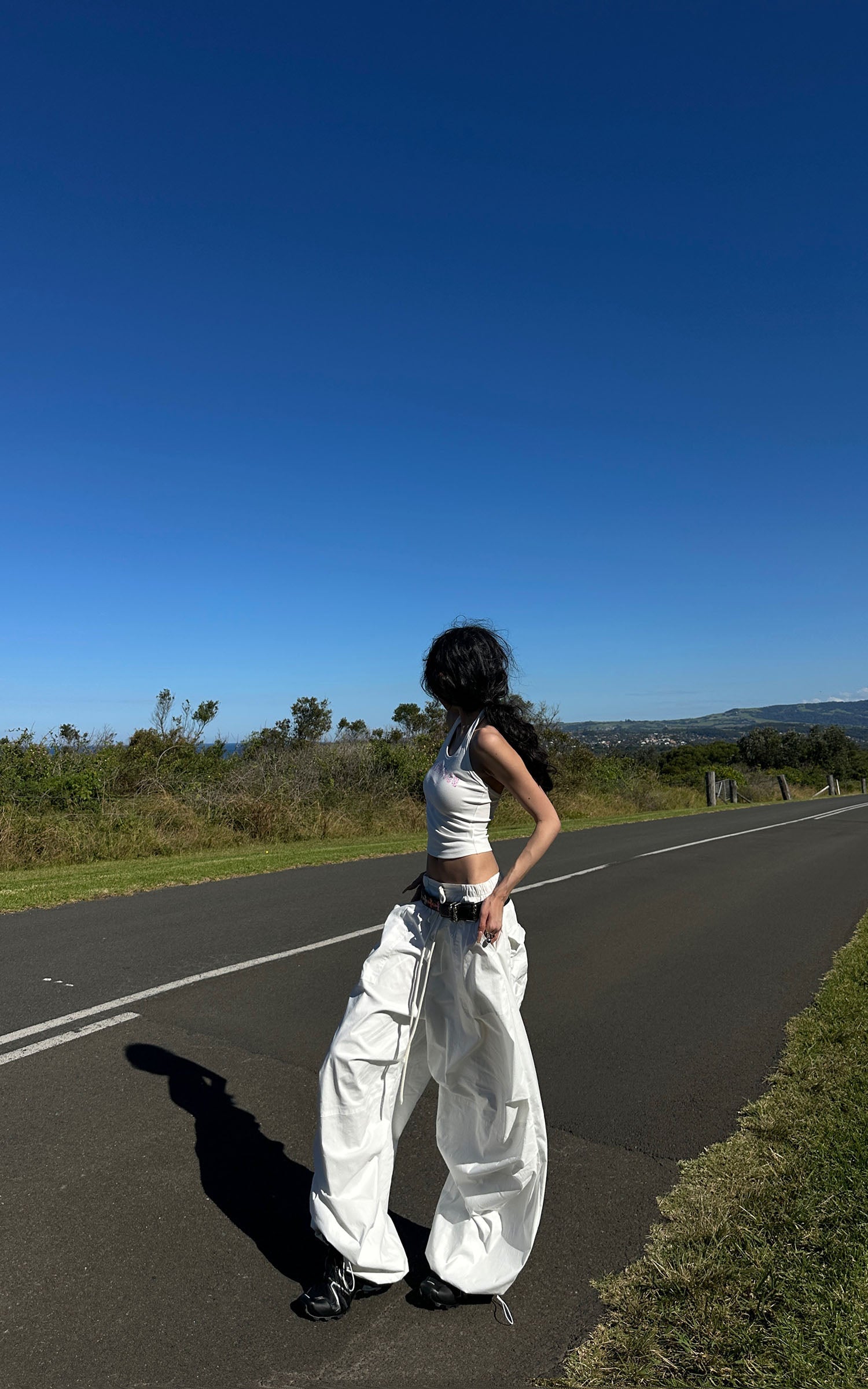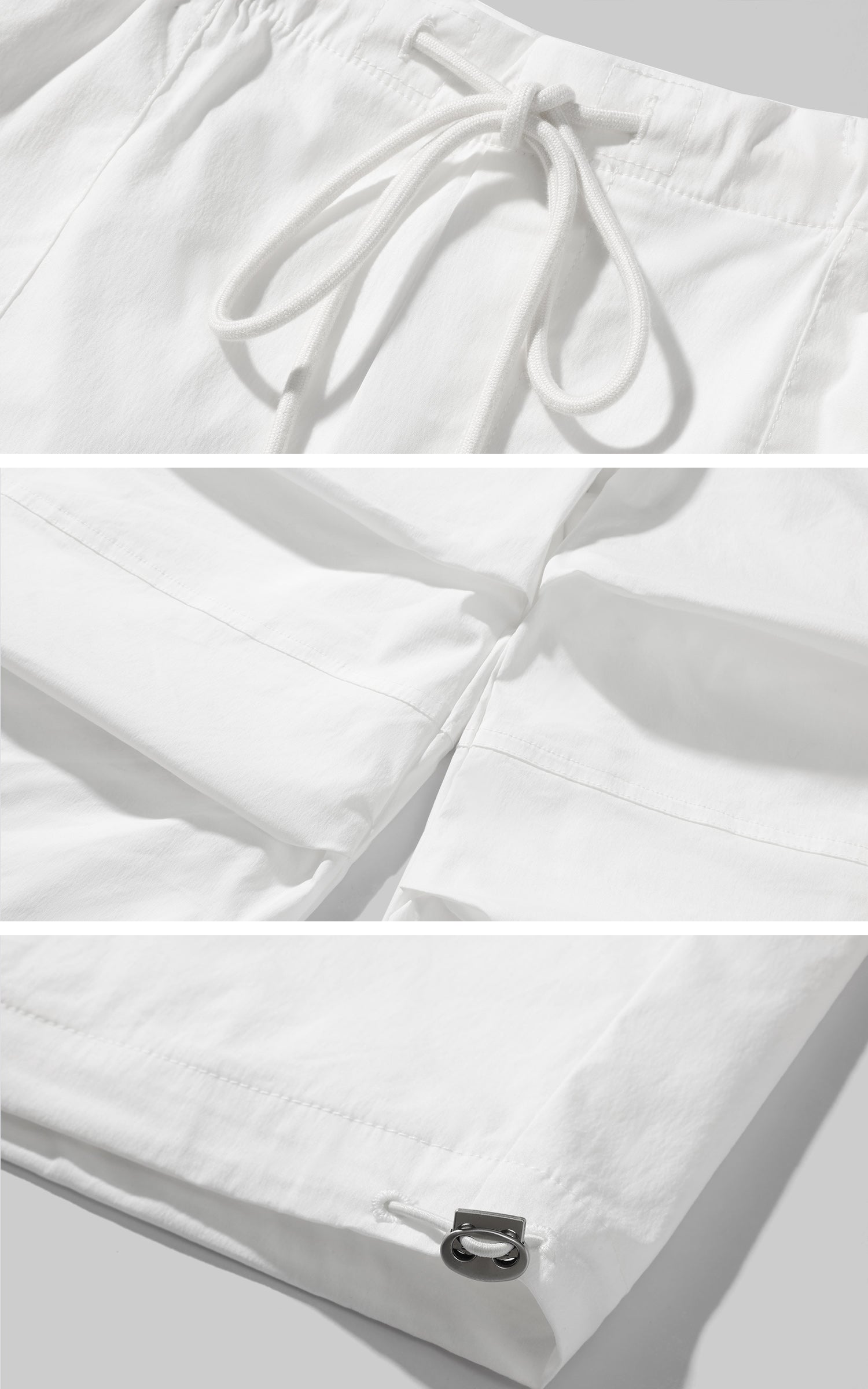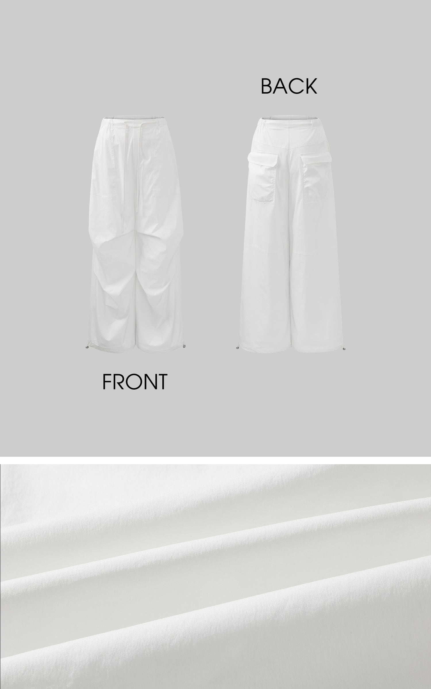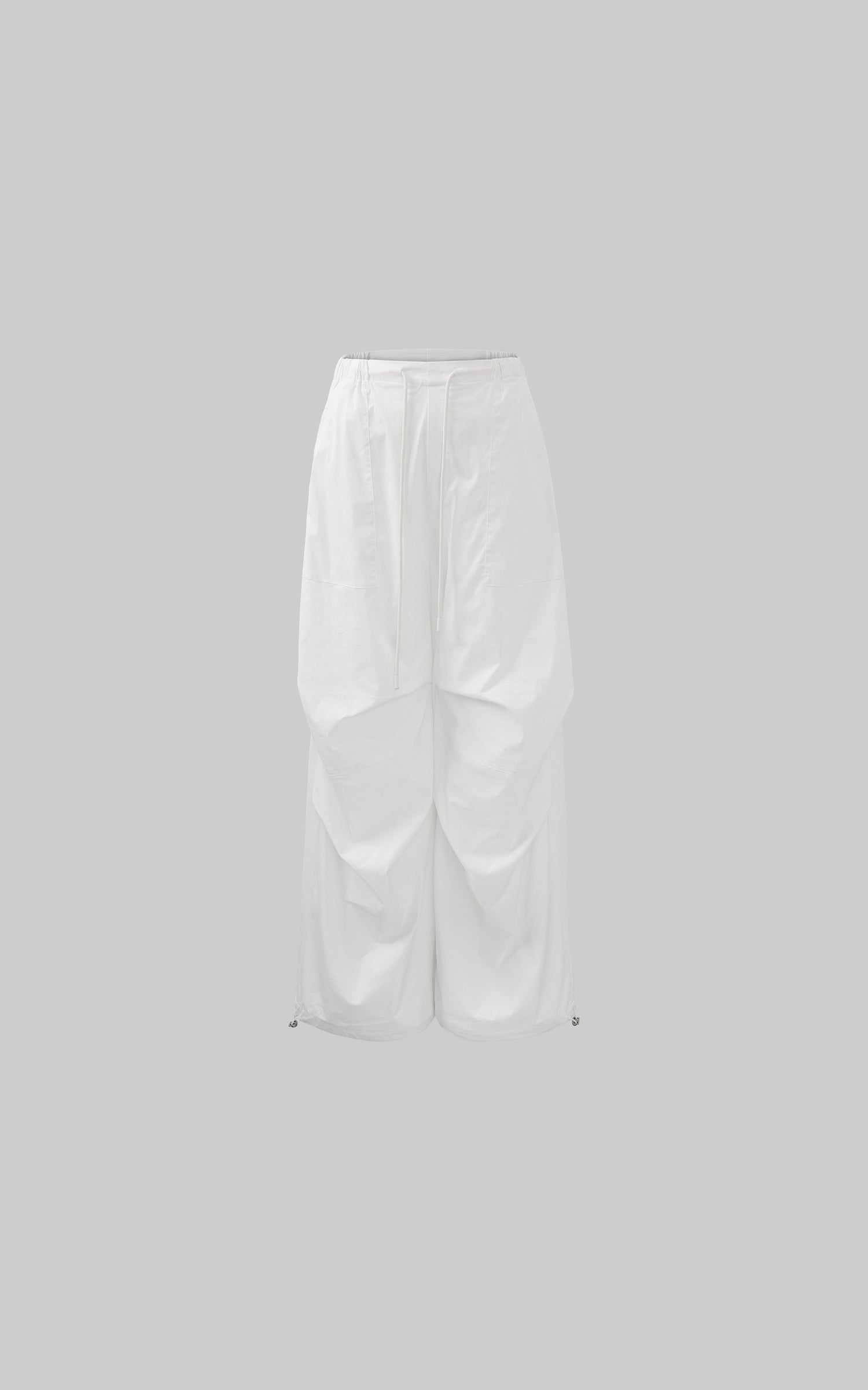 Sculpted for impact, these voluminous trousers redefine structure with exaggerated drape and adjustable drawstrings. Crafted from crisp, lightweight fabric, the design features utility patch pockets, a soft elastic waistband, and toggled hems to personalize the silhouette. Streetwear precision meets engineered ease—built to stand alone or layer loud.