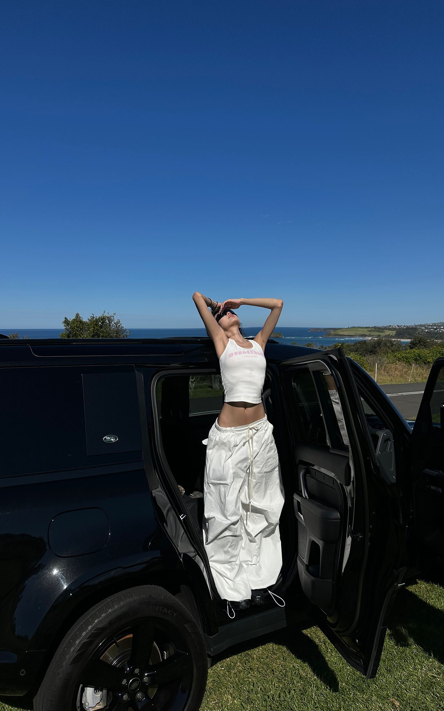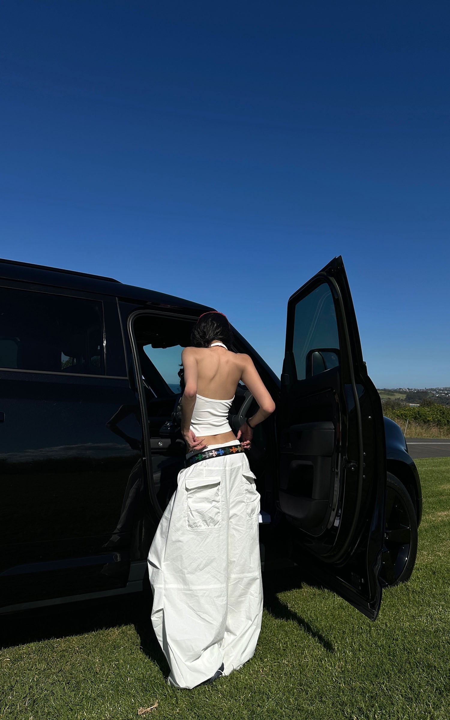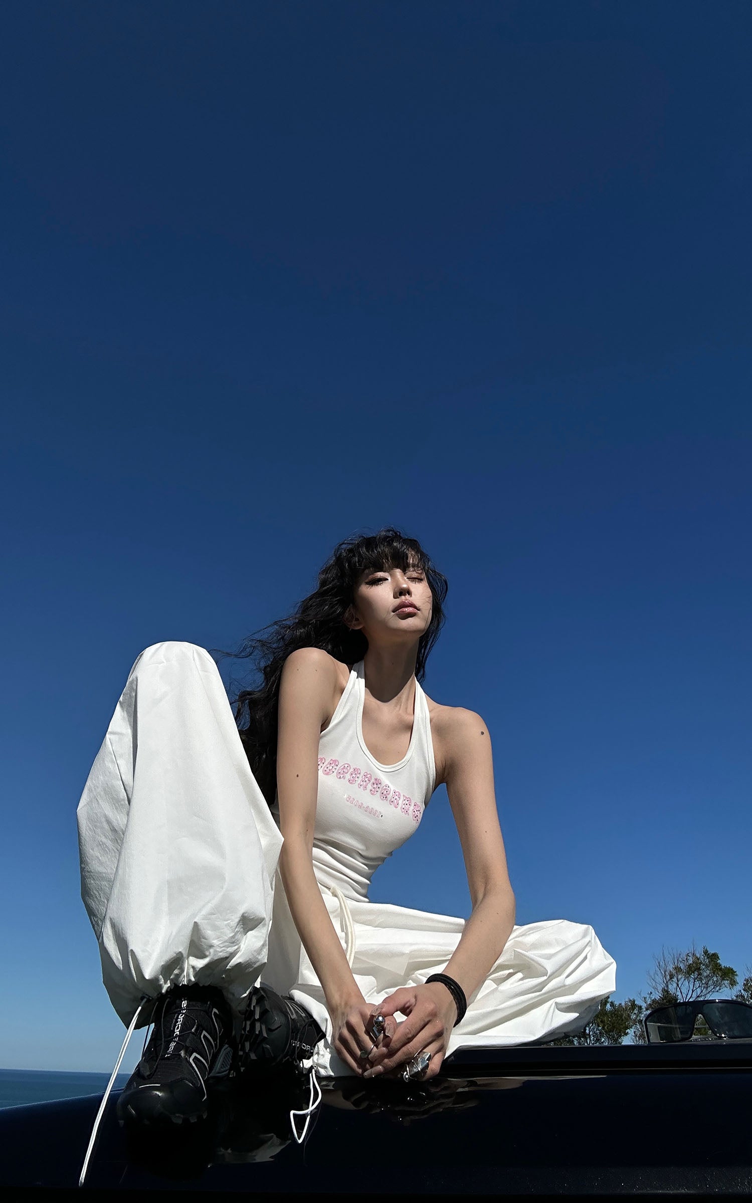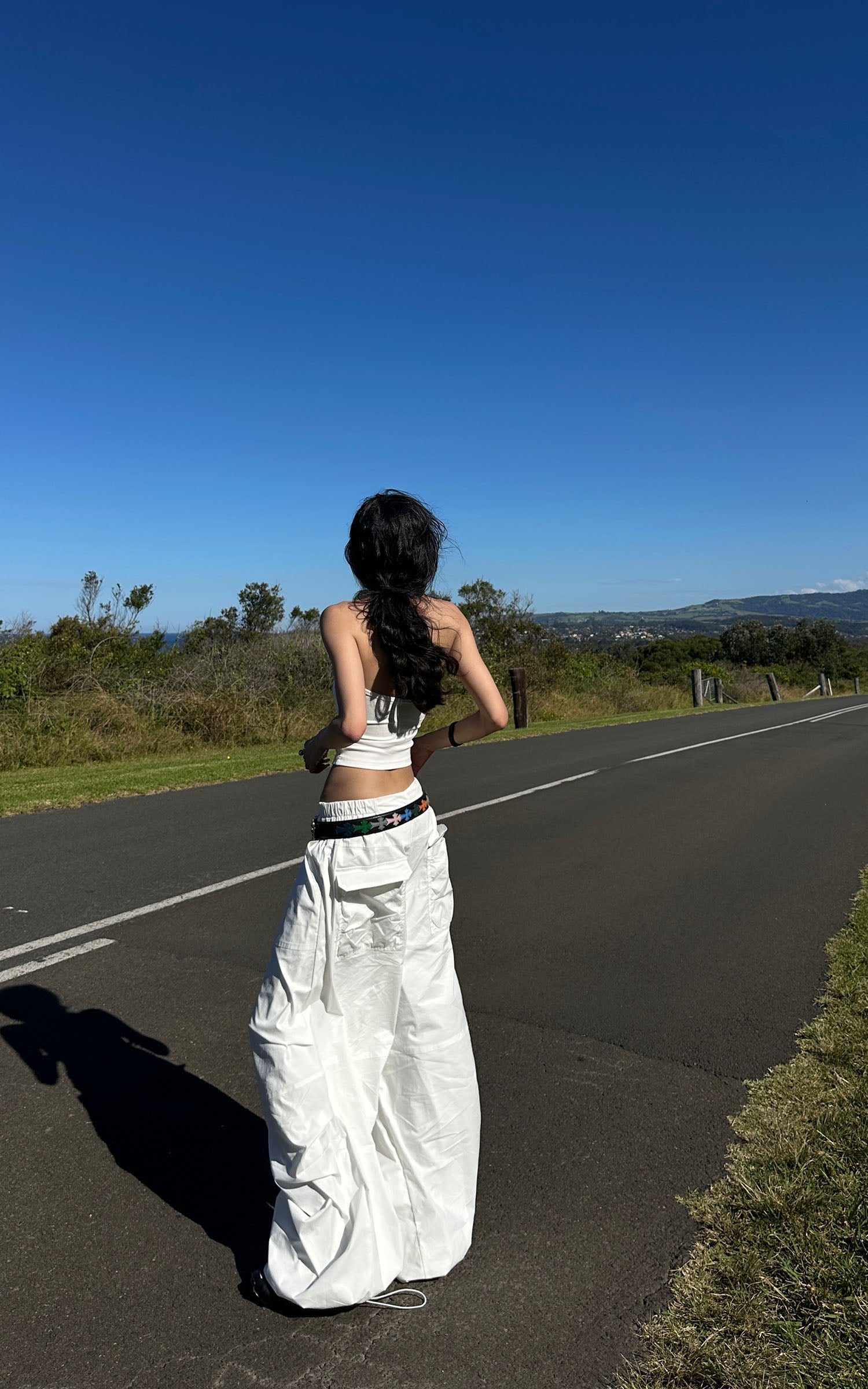Sculpted for impact, these voluminous trousers redefine structure with exaggerated drape and adjustable drawstrings. Crafted from crisp, lightweight fabric, the design features utility patch pockets, a soft elastic waistband, and toggled hems to personalize the silhouette. Streetwear precision meets engineered ease—built to stand alone or layer loud.