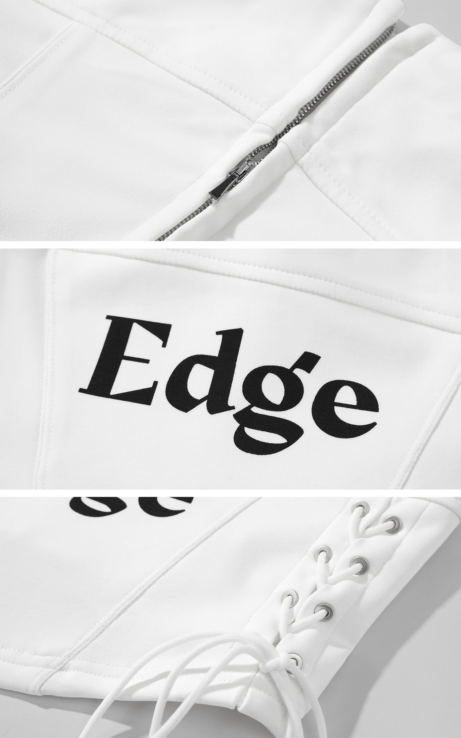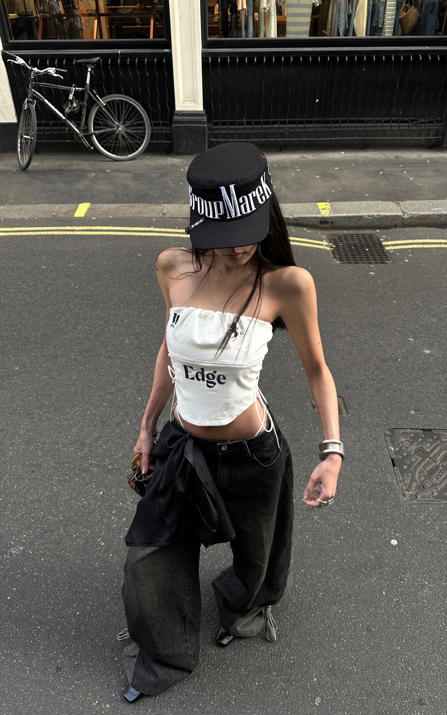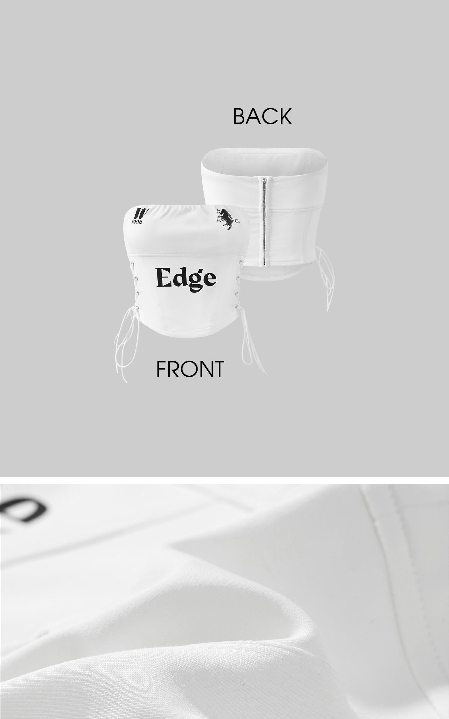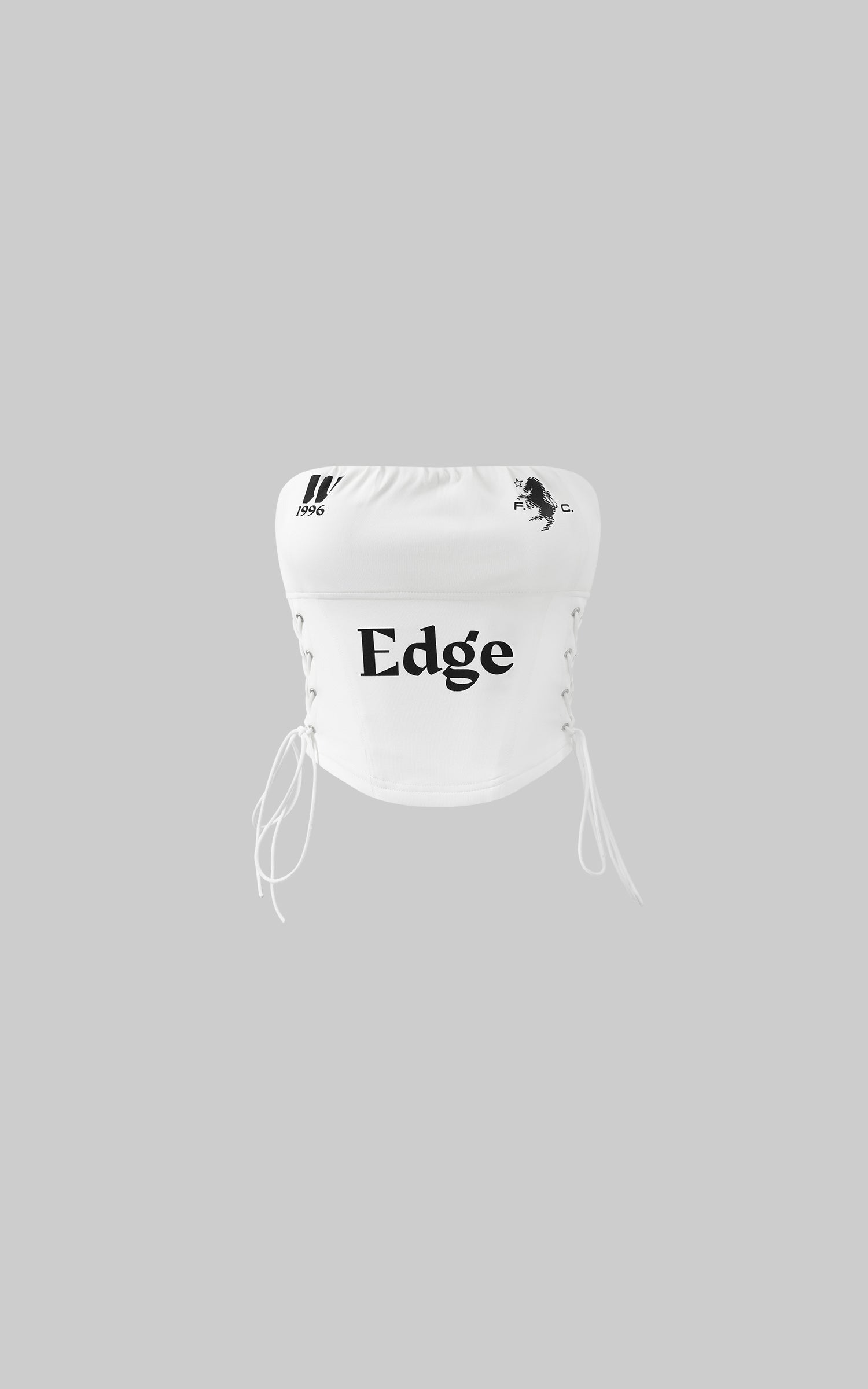 Boldly graphic and streetwise, this bandeau top channels a future-classic attitude. Crafted from a structured cotton-blend with a subtle sheen, it features a ruched elastic neckline and graphic symbols across the chest, including a 1996-inspired motif and a rearing horse emblem. The bold "Edge" typeface at center front delivers unapologetic impact. Adjustable lace-up sides provide both a custom fit and a visual twist, while the concealed back zipper ensures ease of wear. Pair it with oversized denim or layered streetwear to underscore its attitude.