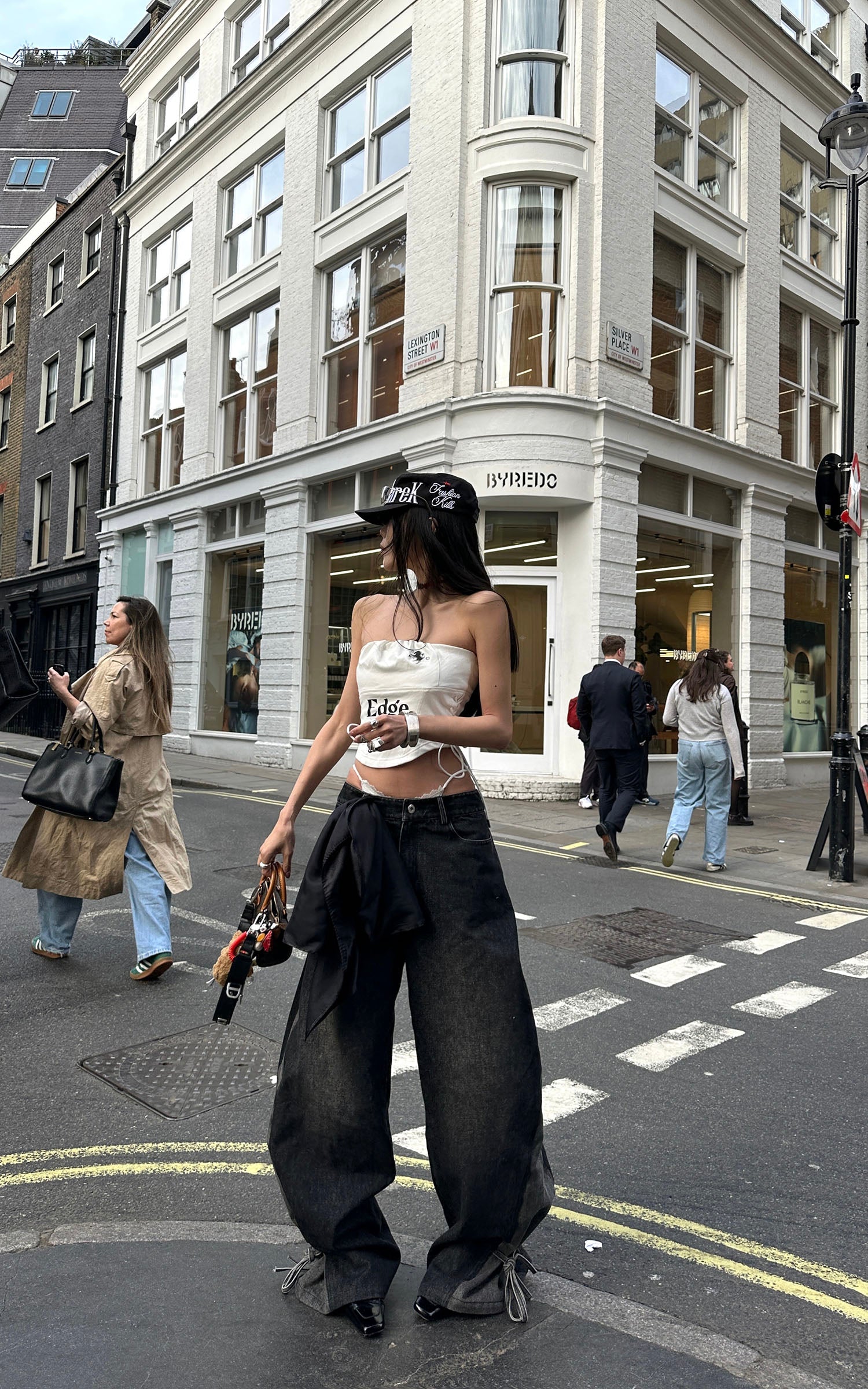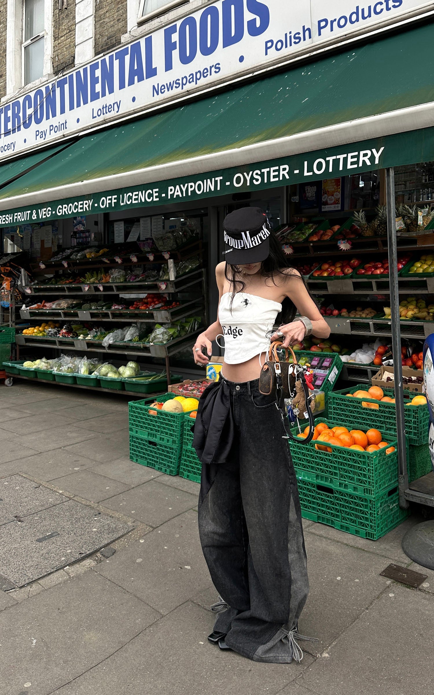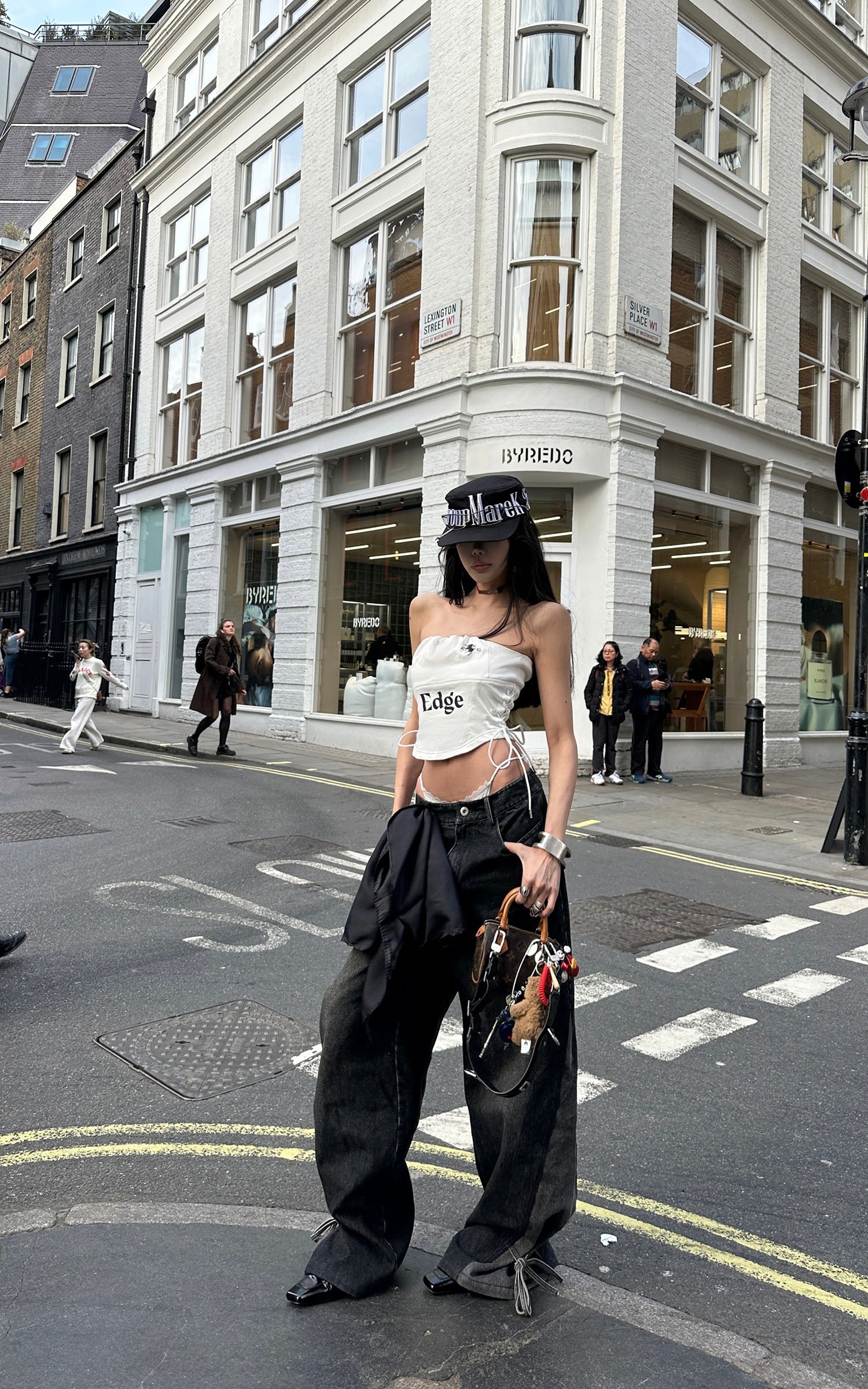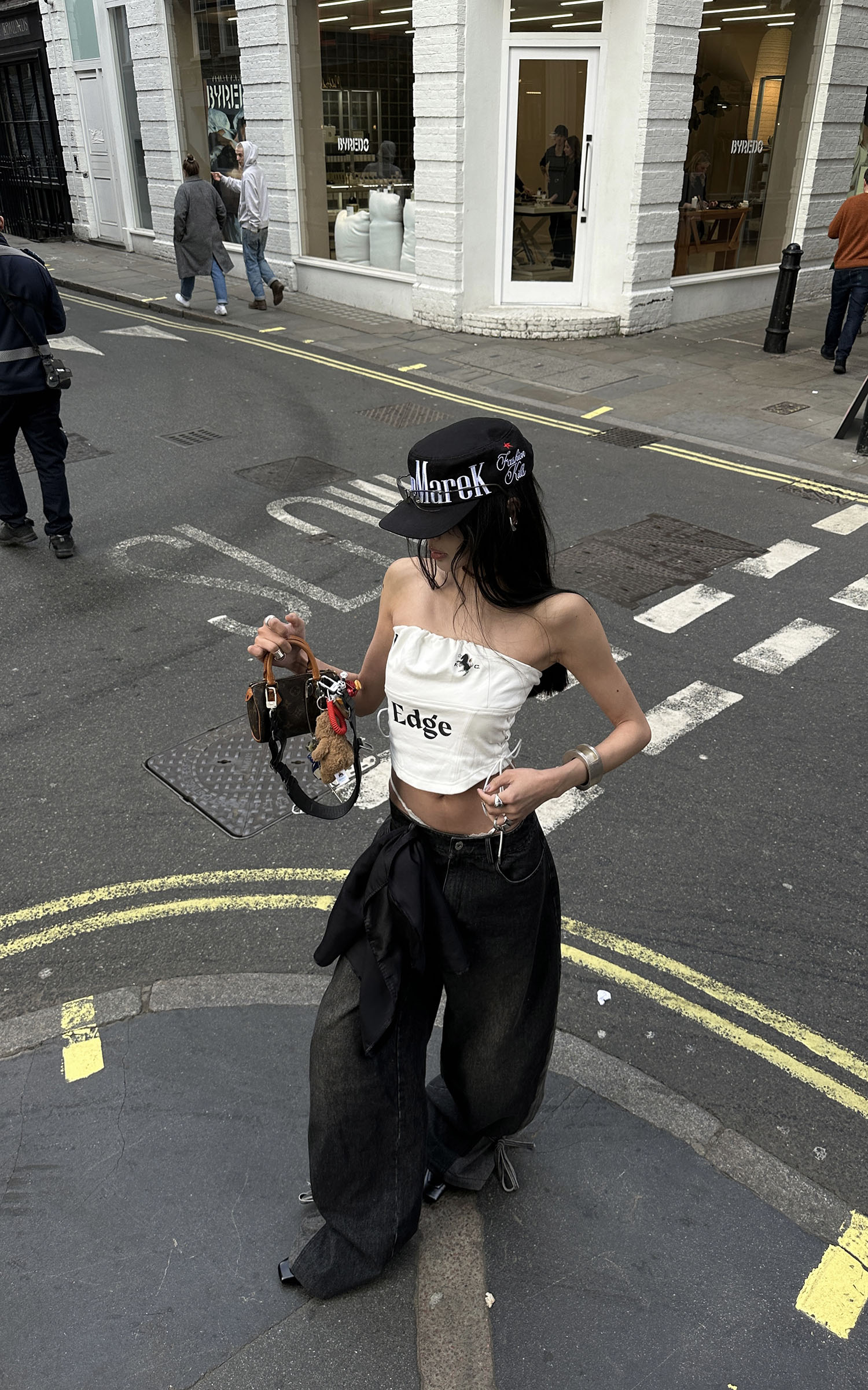 Boldly graphic and streetwise, this bandeau top channels a future-classic attitude. Crafted from a structured cotton-blend with a subtle sheen, it features a ruched elastic neckline and graphic symbols across the chest, including a 1996-inspired motif and a rearing horse emblem. The bold "Edge" typeface at center front delivers unapologetic impact. Adjustable lace-up sides provide both a custom fit and a visual twist, while the concealed back zipper ensures ease of wear. Pair it with oversized denim or layered streetwear to underscore its attitude.