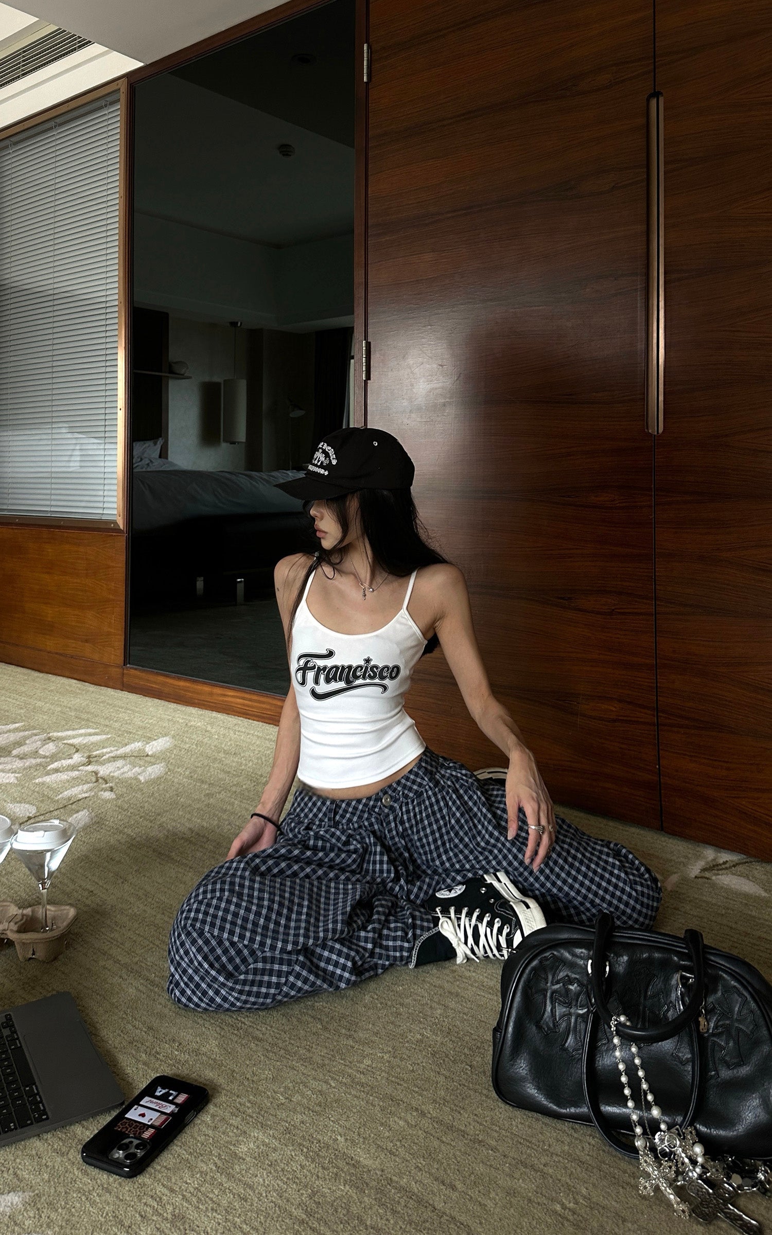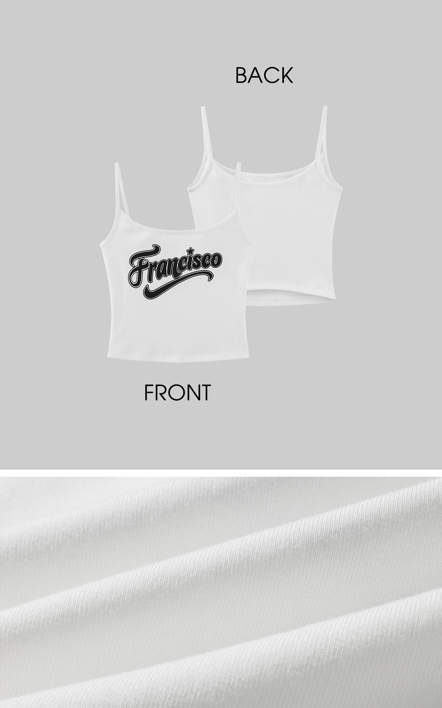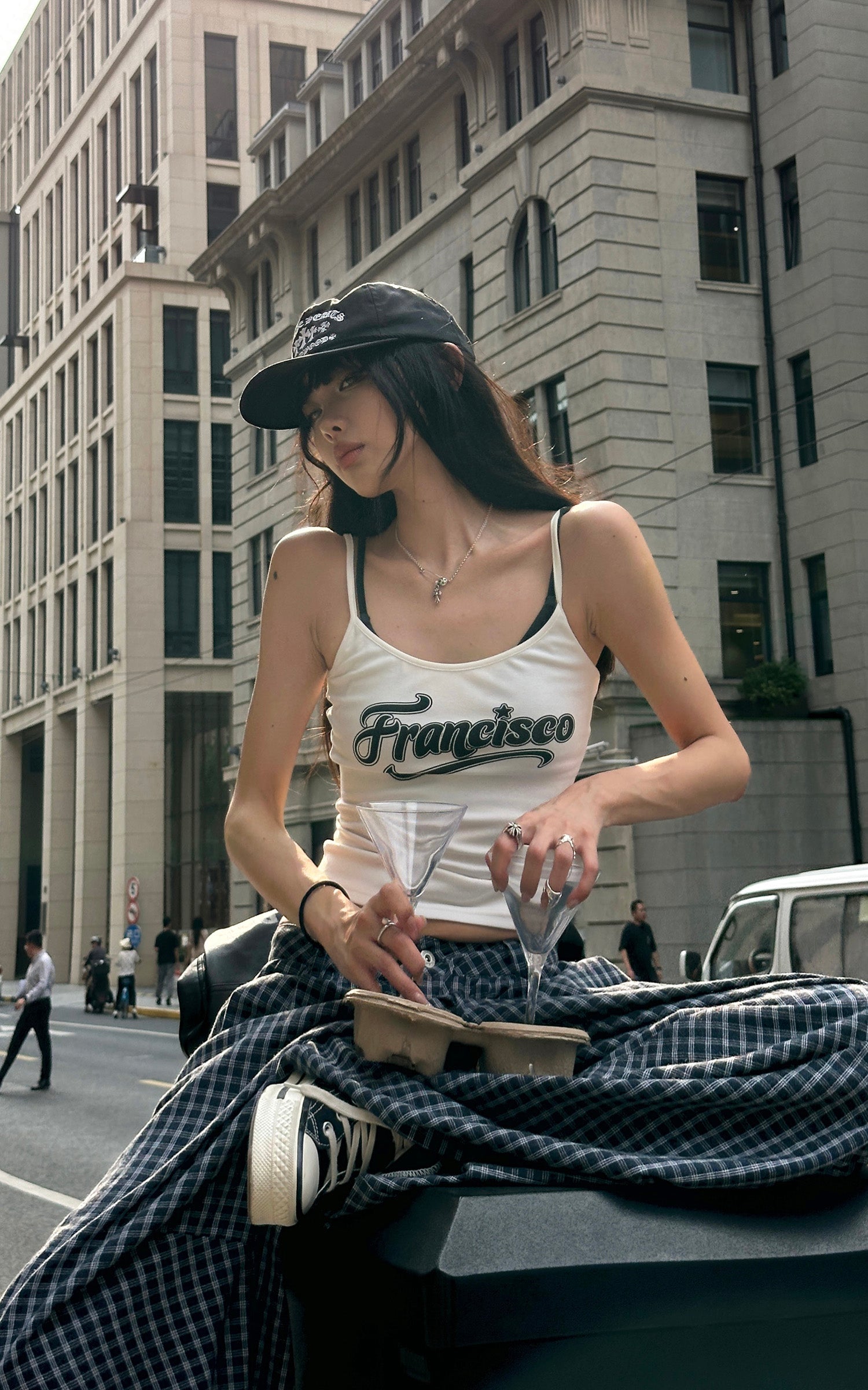 A slim-fit strap tank top with a bold “Francisco” graphic across the chest. The cropped cut and stretch cotton fabric create a sharp yet casual silhouette, ideal for layering under jackets or pairing with oversized pants. Designed with street-ready edge, it balances minimal form with striking typography.