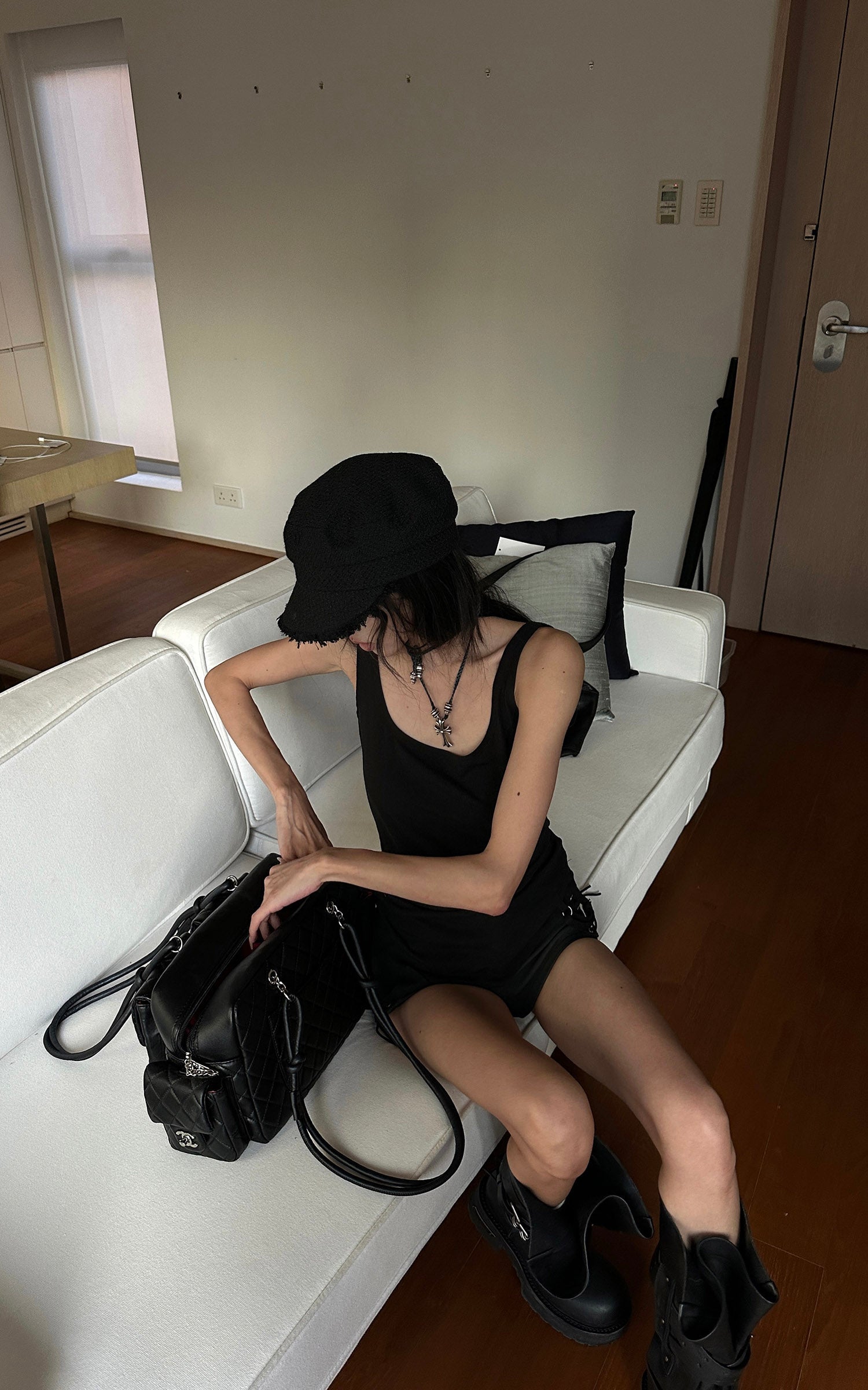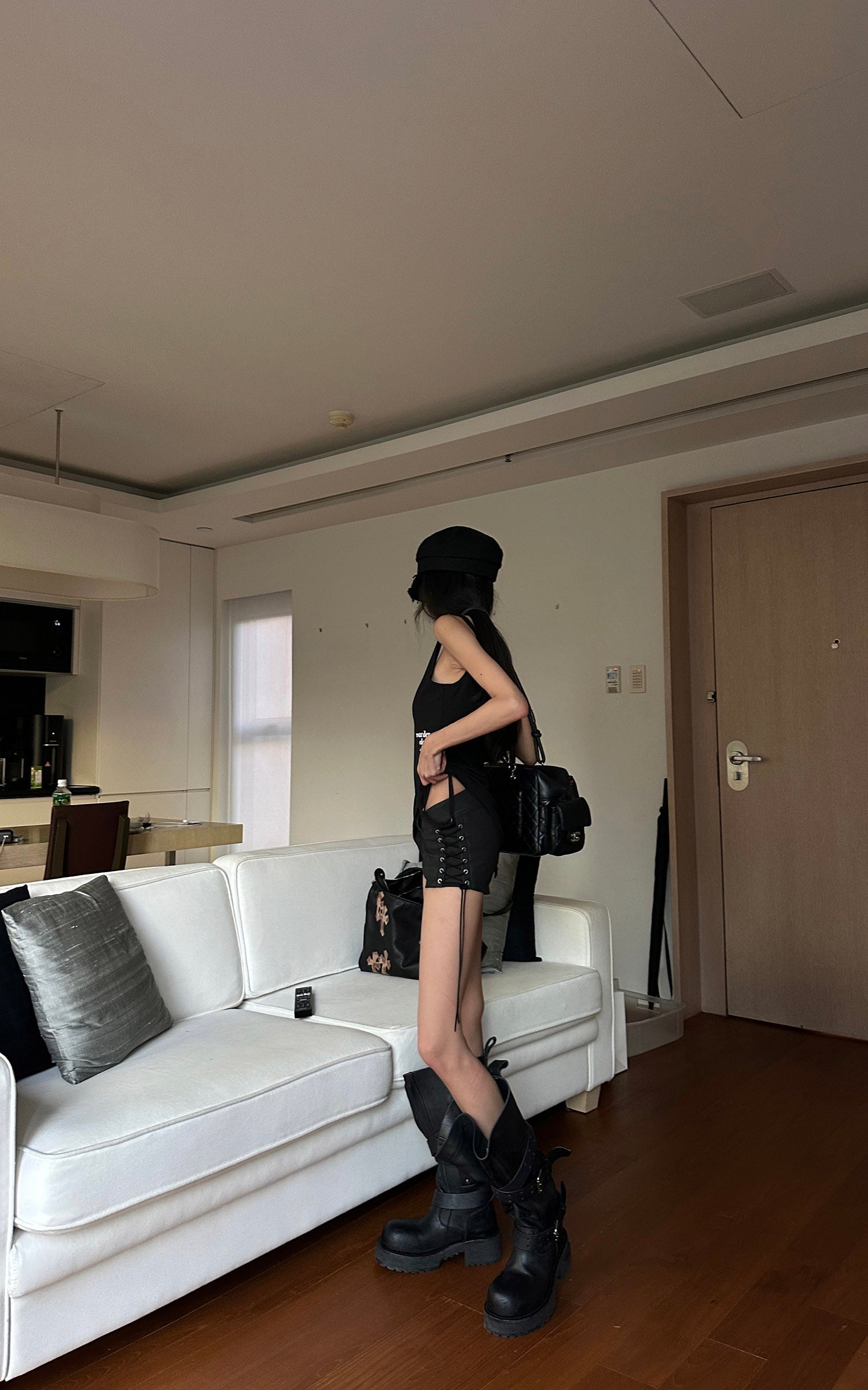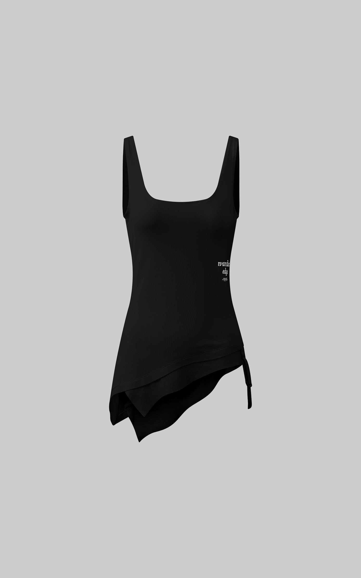 Built with attitude and subversion, this asymmetrical tank features a draped back and double-layer hem that breaks from symmetry. The ribbed stretch cotton hugs close, while a functional side strap adds edge and utility. Meant to pair with nothing but confidence—or low-rise leather and lace-up boots.