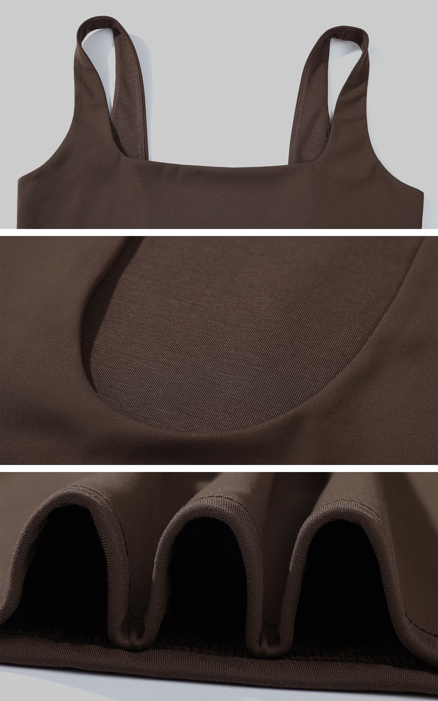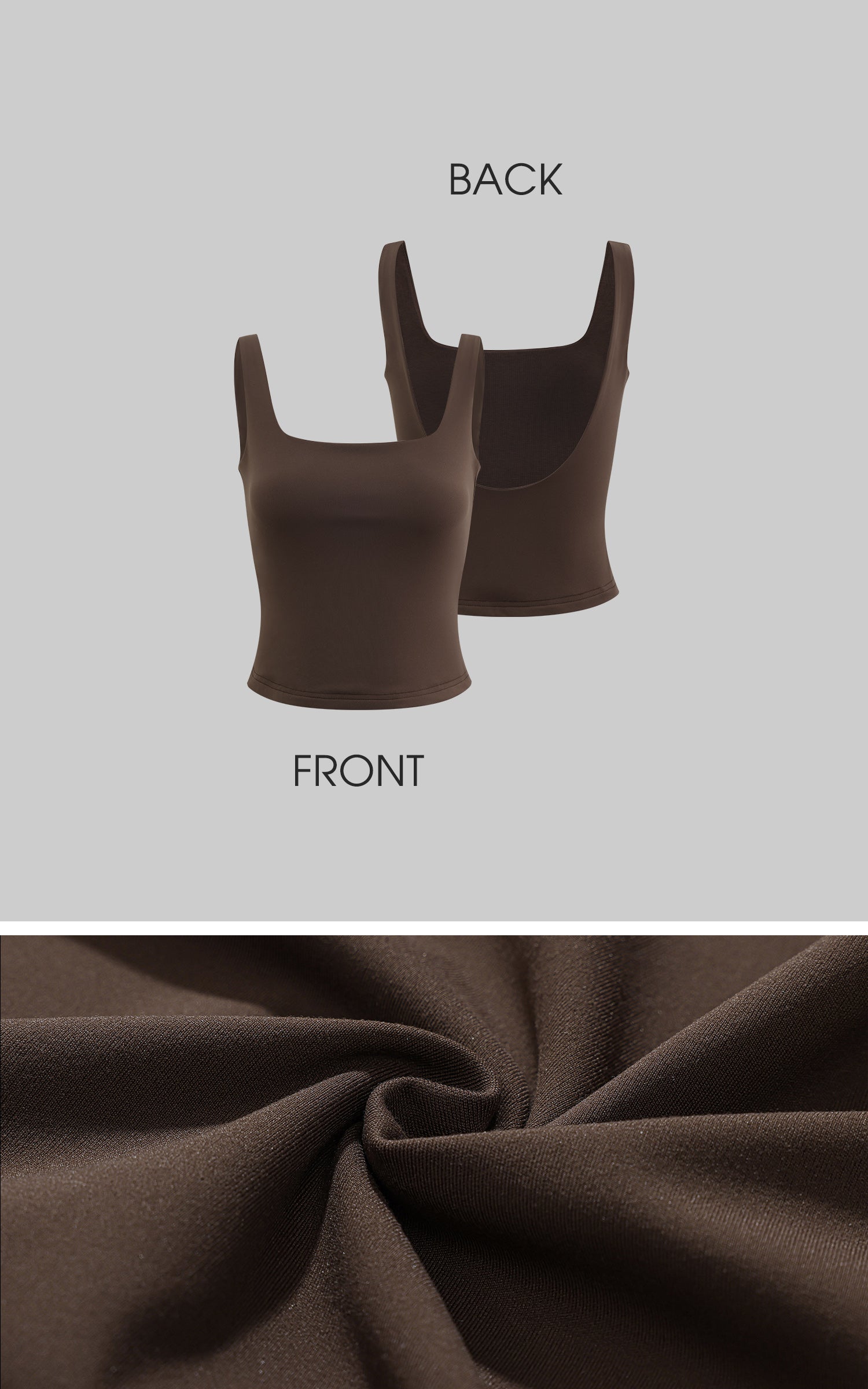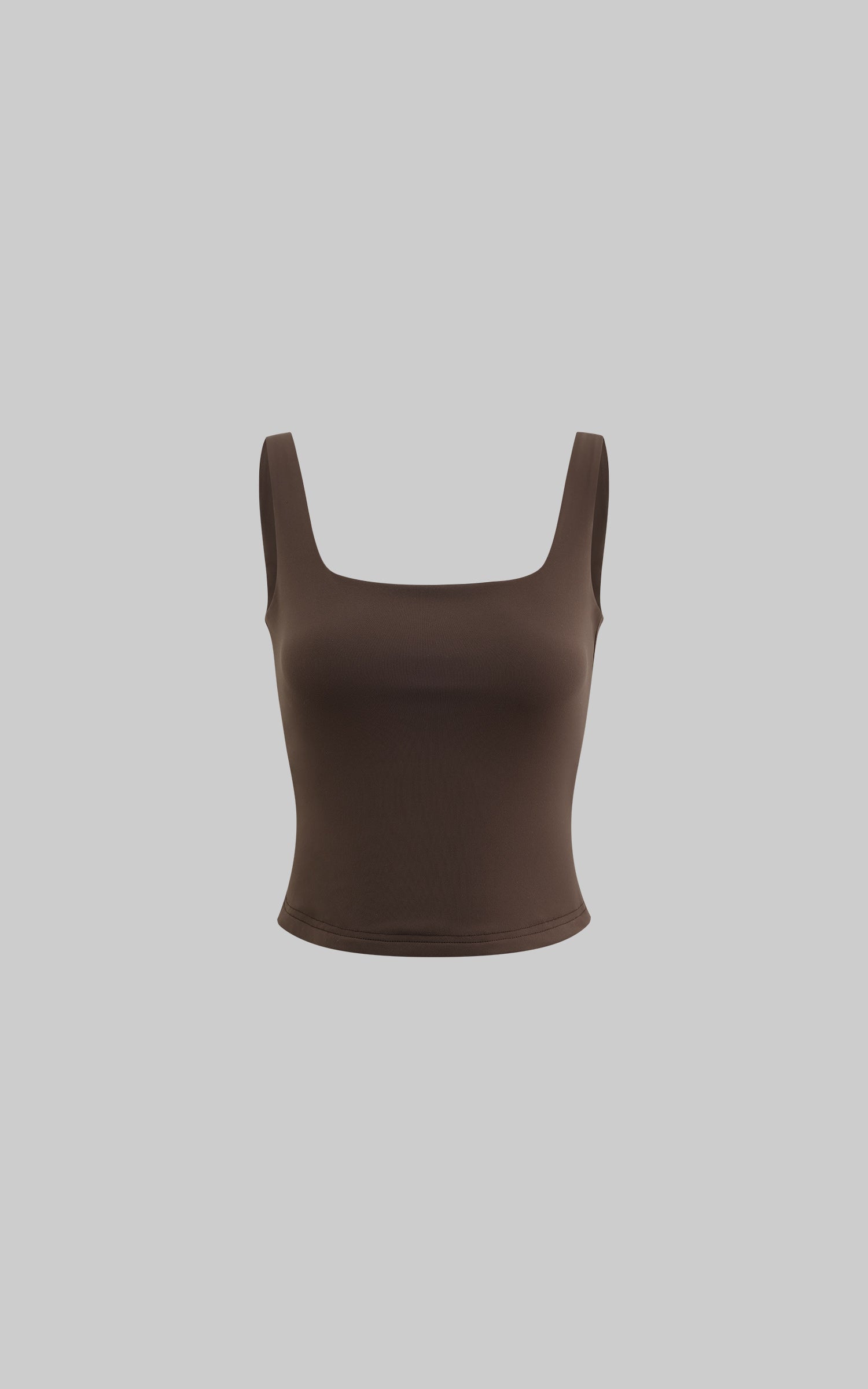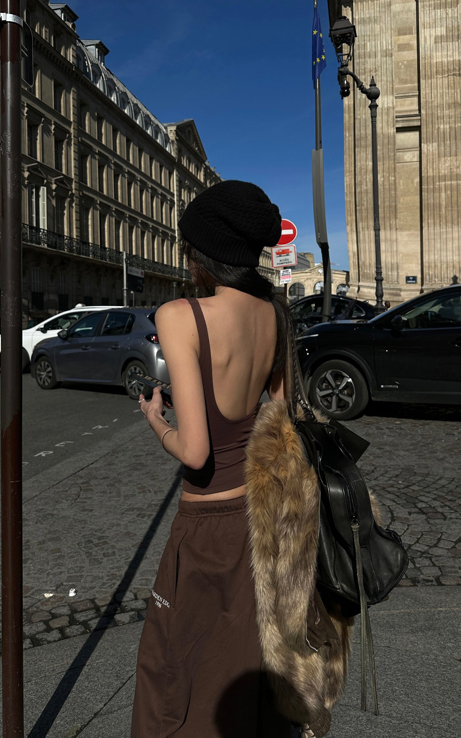 Minimal yet bold, simple yet rich in detail. This square-neck sleeveless tank is crafted from high-stretch ribbed knit fabric, offering a body-hugging fit with exceptional comfort. The deep U-shaped back design elongates the neckline and shoulders, enhancing the natural curves with effortless elegance. The muted coffee brown hue adds depth and sophistication, making it a versatile staple for any style—whether paired with oversized cargo pants for a streetwear edge or styled with a sleek skirt for a refined minimalist look. More than just a basic, this is a statement piece.