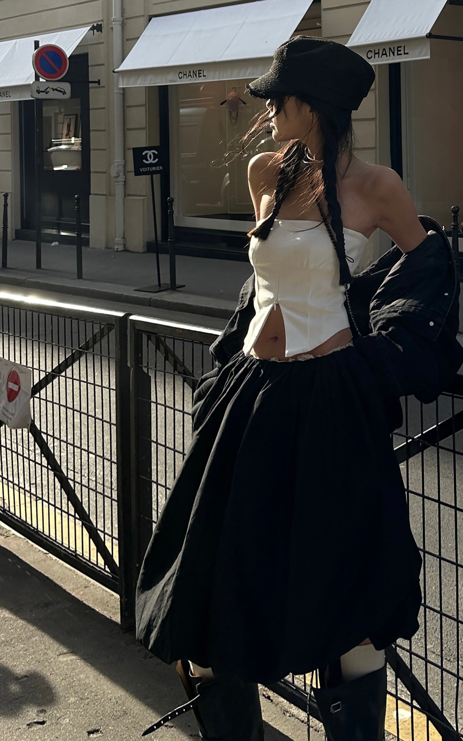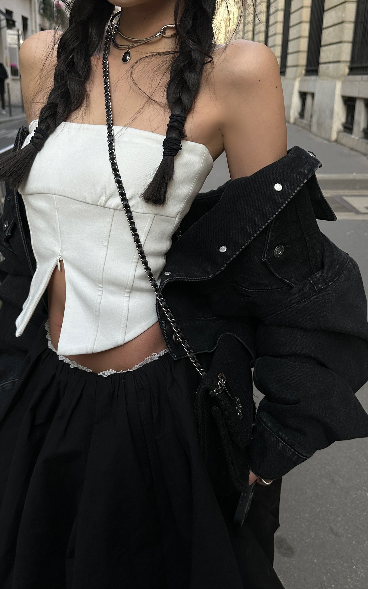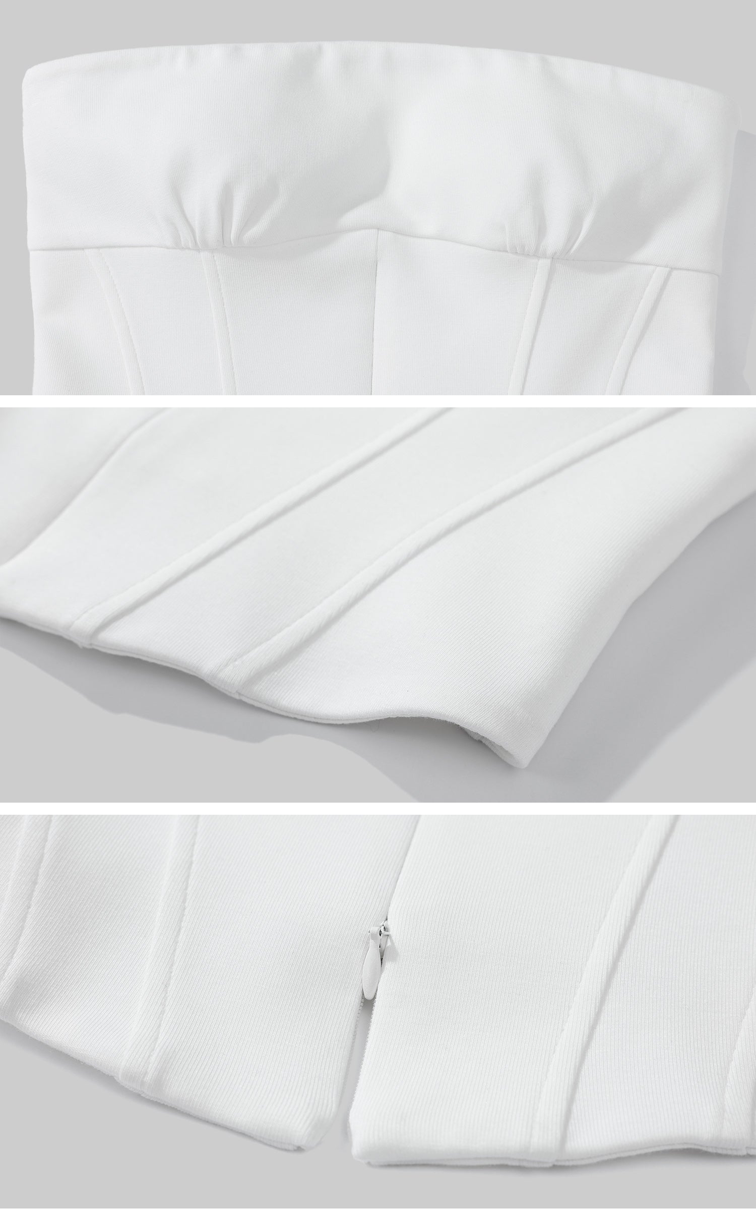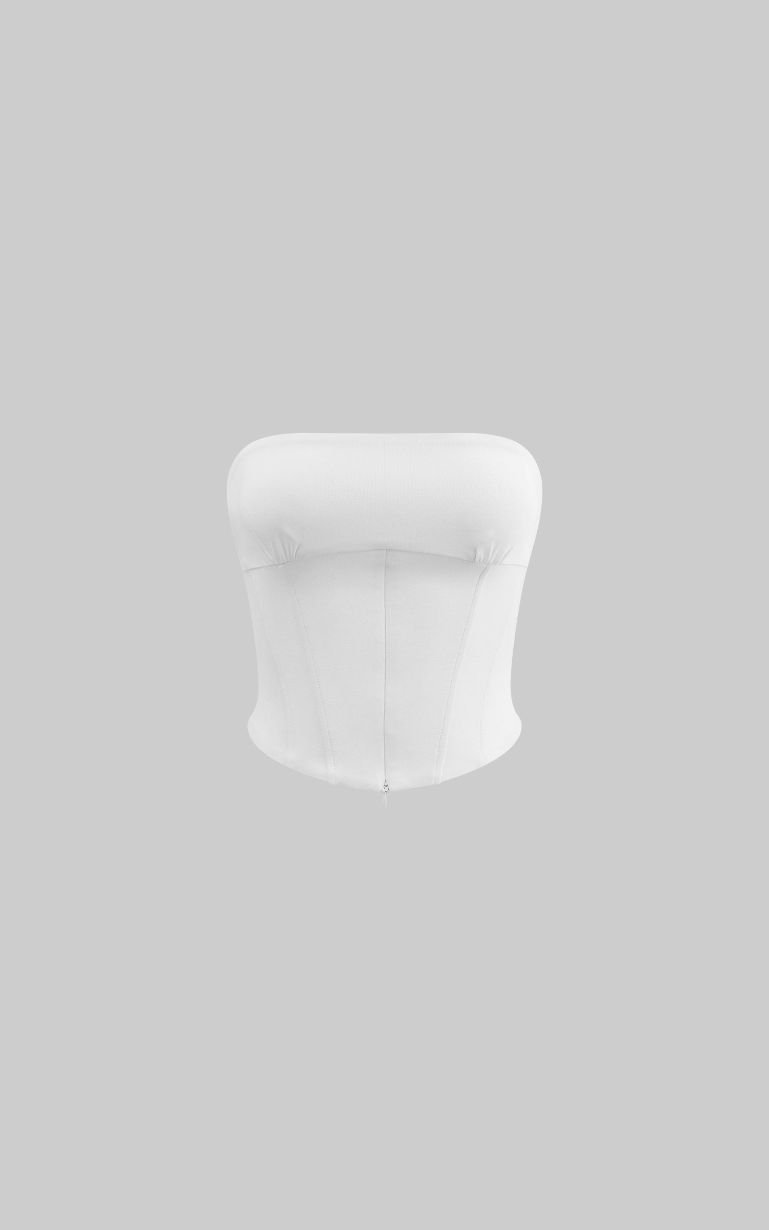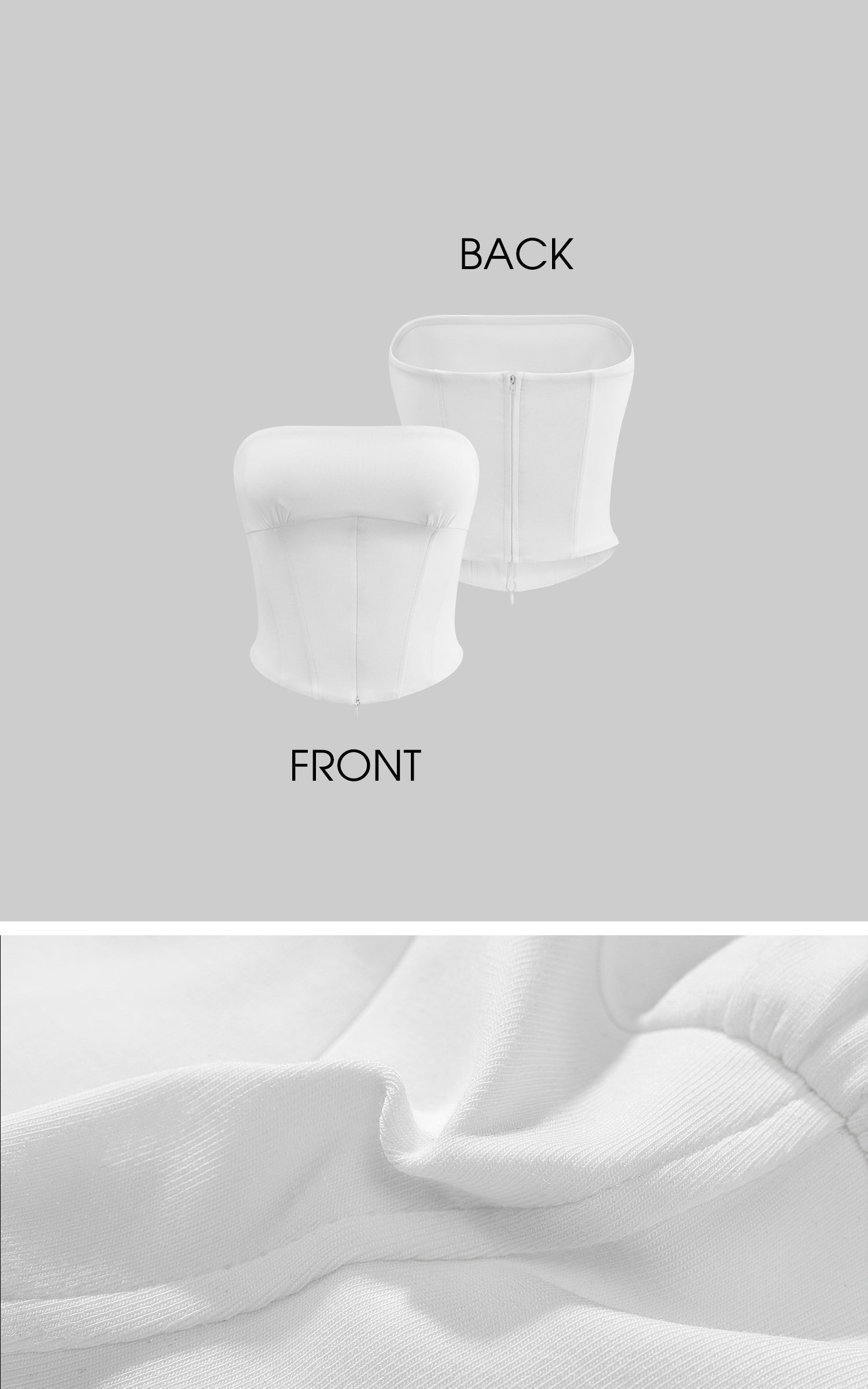 Where form meets force. This structured strapless top is cut from dense knit fabric for a sculpted silhouette with confident lines. The sharp inverted V-slit at the front hem defines the waist, amplifying architectural tension. Finished with a back zip for a clean closure and tailored fit. Designed for layering or wearing solo—unapologetically bold, unapologetically you.