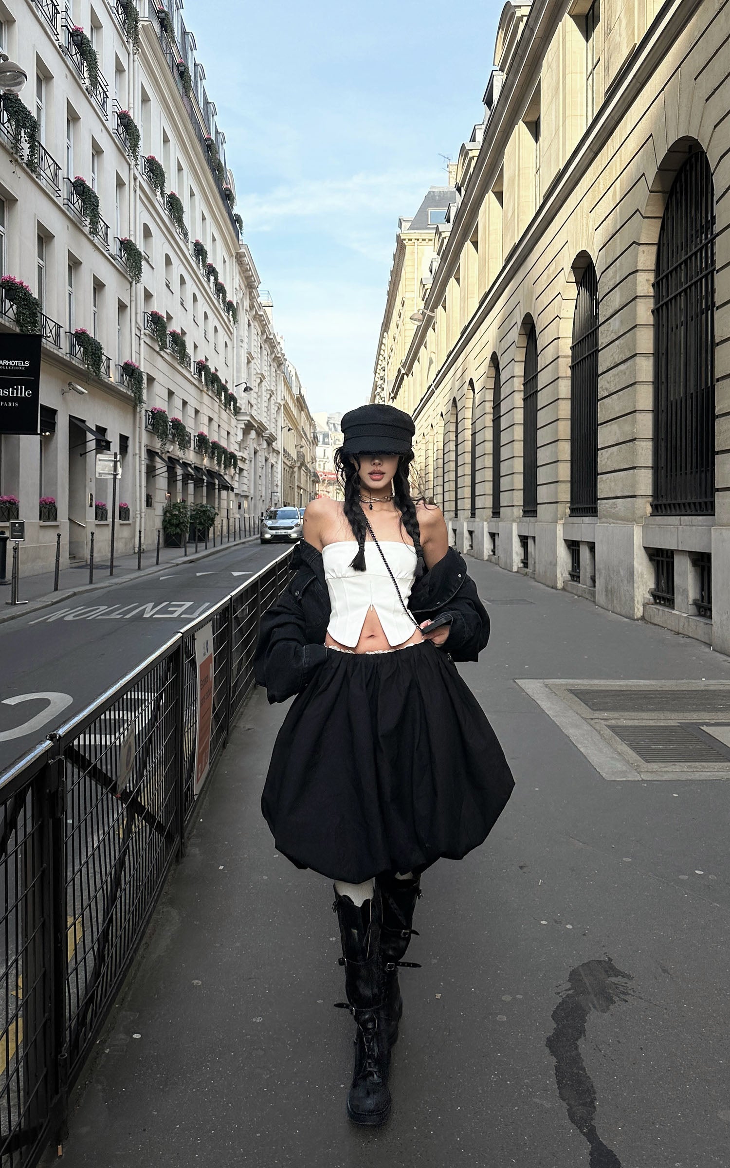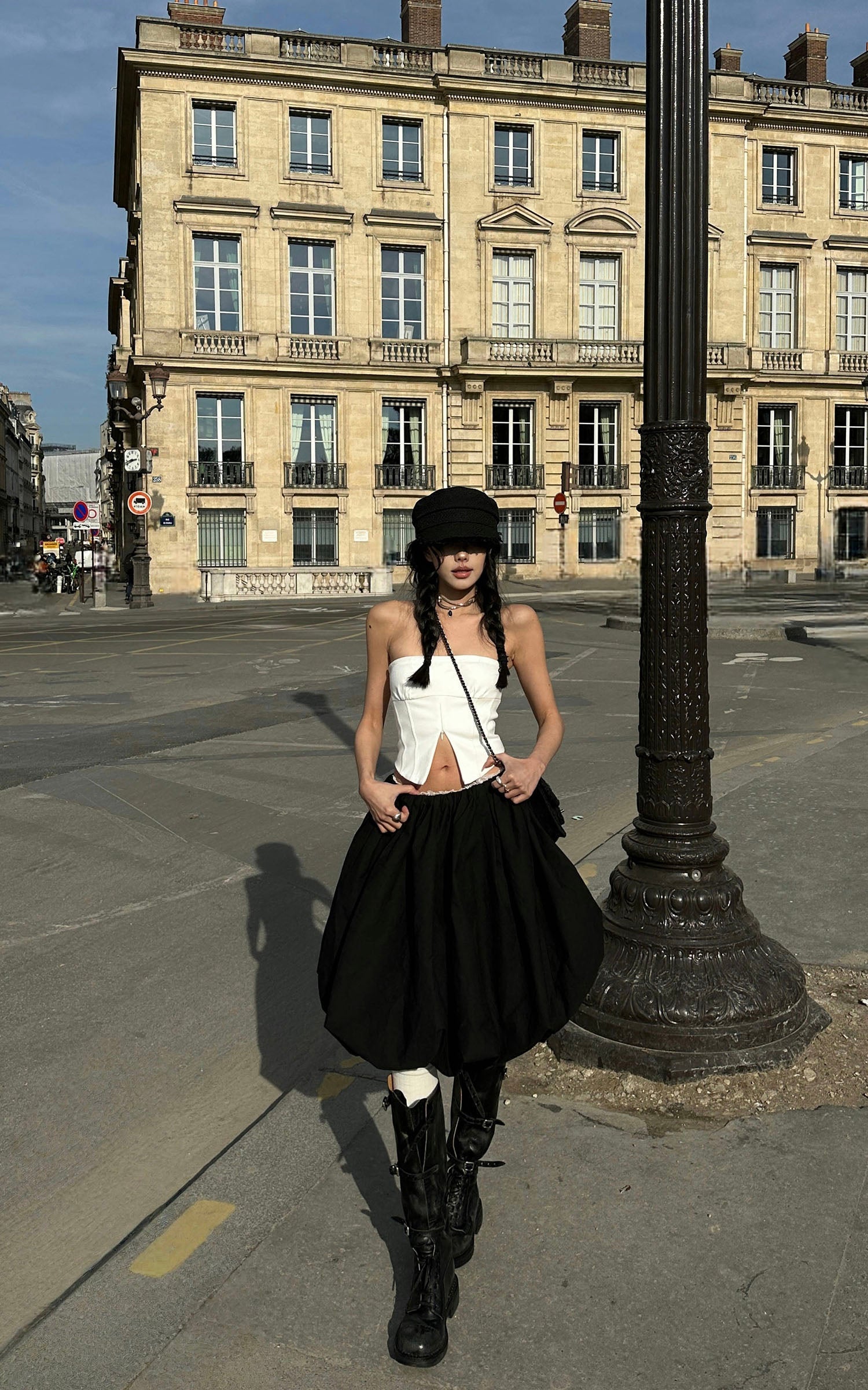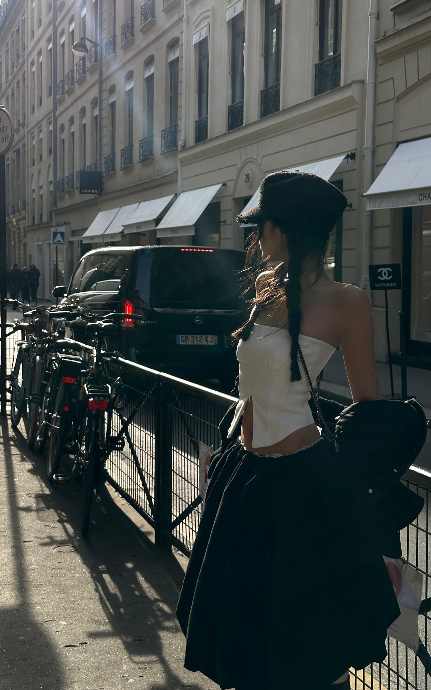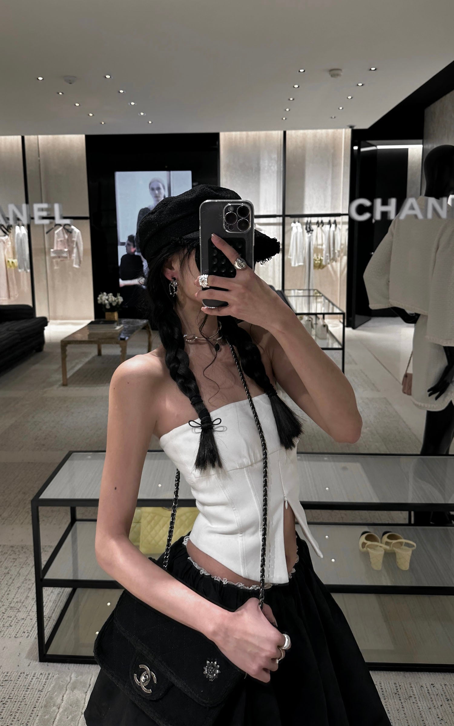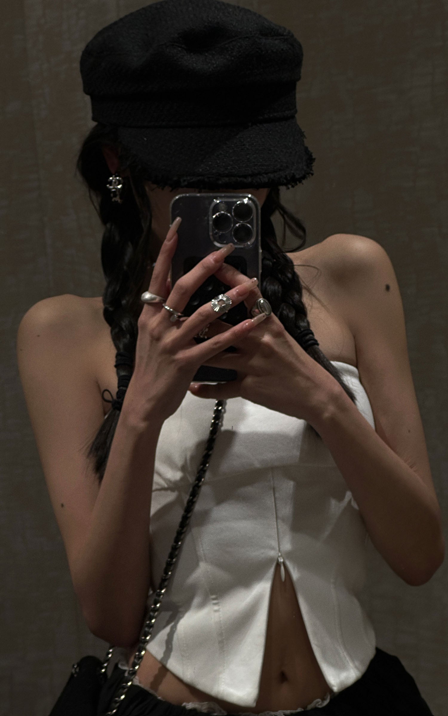 Where form meets force. This structured strapless top is cut from dense knit fabric for a sculpted silhouette with confident lines. The sharp inverted V-slit at the front hem defines the waist, amplifying architectural tension. Finished with a back zip for a clean closure and tailored fit. Designed for layering or wearing solo—unapologetically bold, unapologetically you.