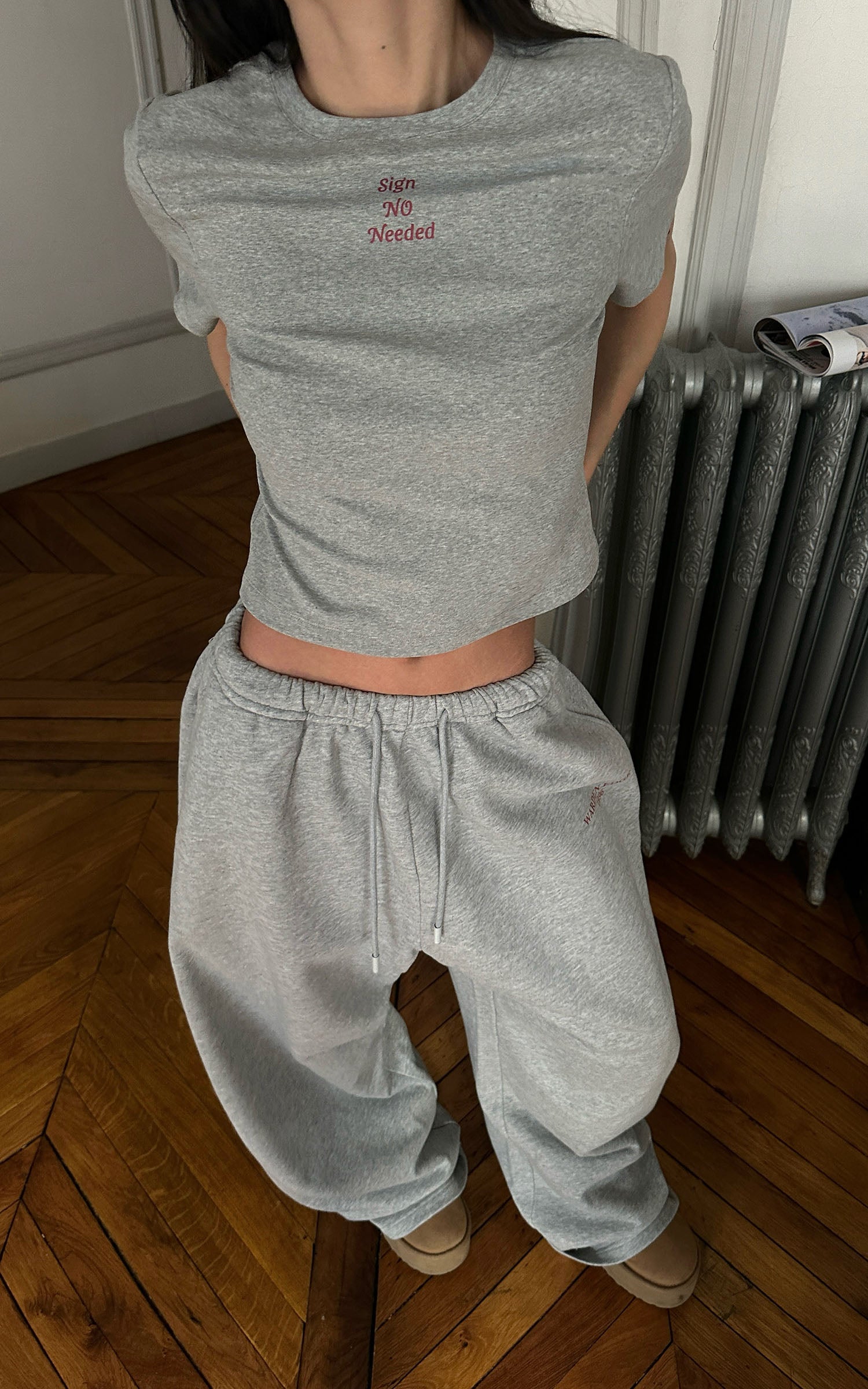 Minimal form, maximum ease. These heather grey sweatpants embrace the off-duty uniform with unapologetic volume. The exaggerated wide-leg silhouette collapses effortlessly over sneakers or slides, while the soft brushed cotton offers all-day ease. Embroidered with a nostalgic collegiate-inspired type at the hip, they channel quiet defiance with every step. Complete with an elastic waistband and internal drawcord for a slouchy, custom fit. Pair them with cropped tops or oversized layers for a nonchalant edge.