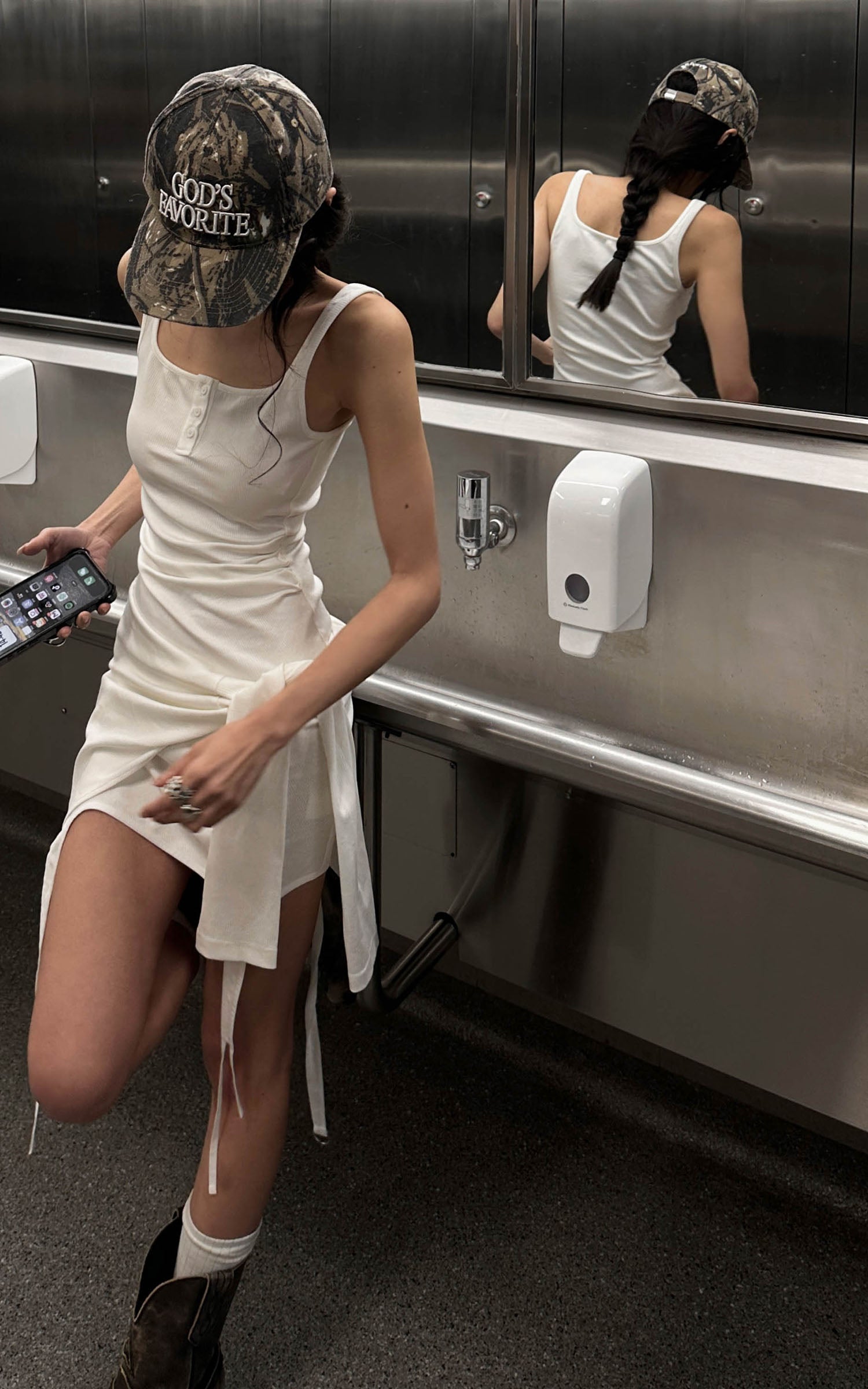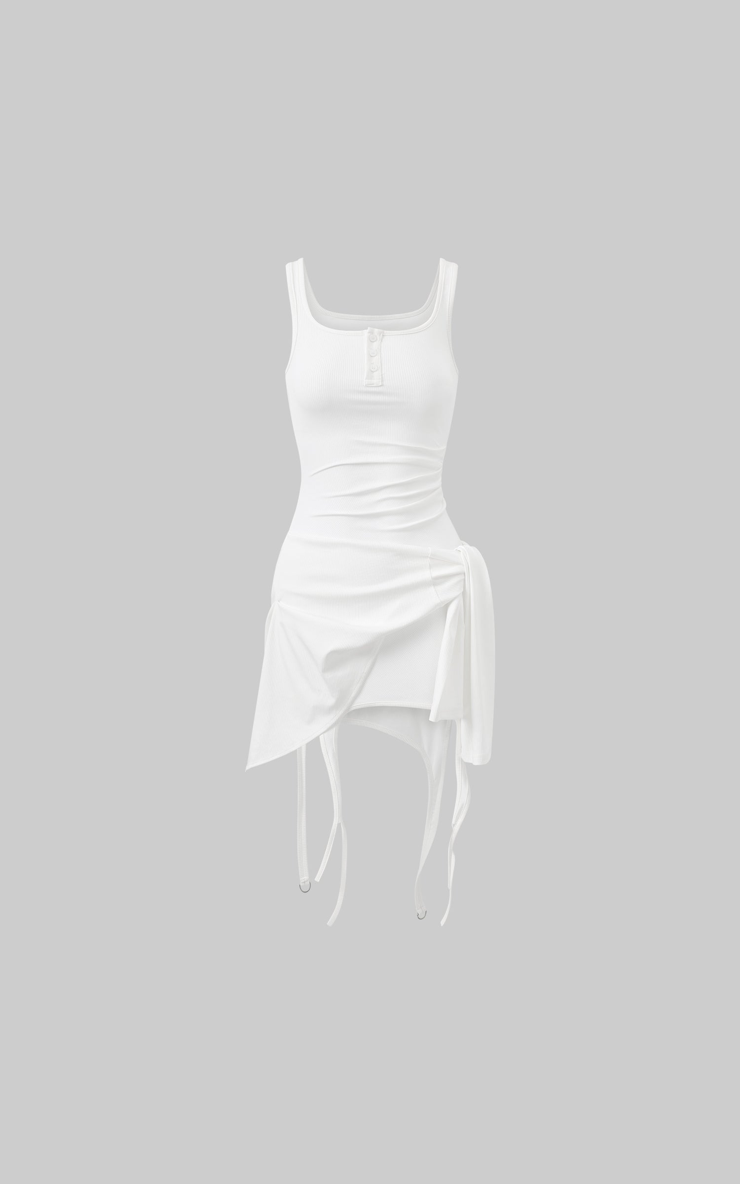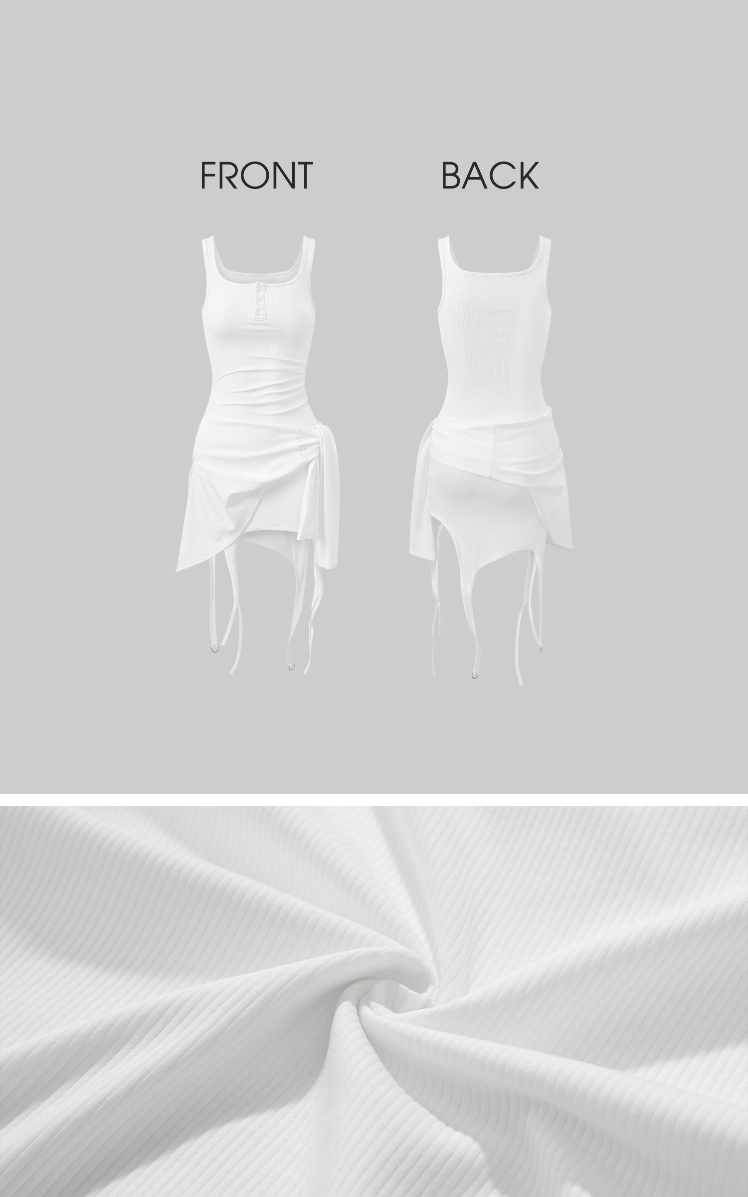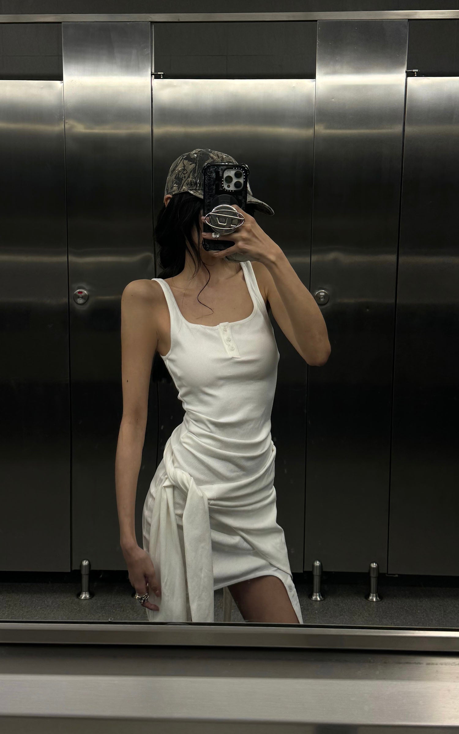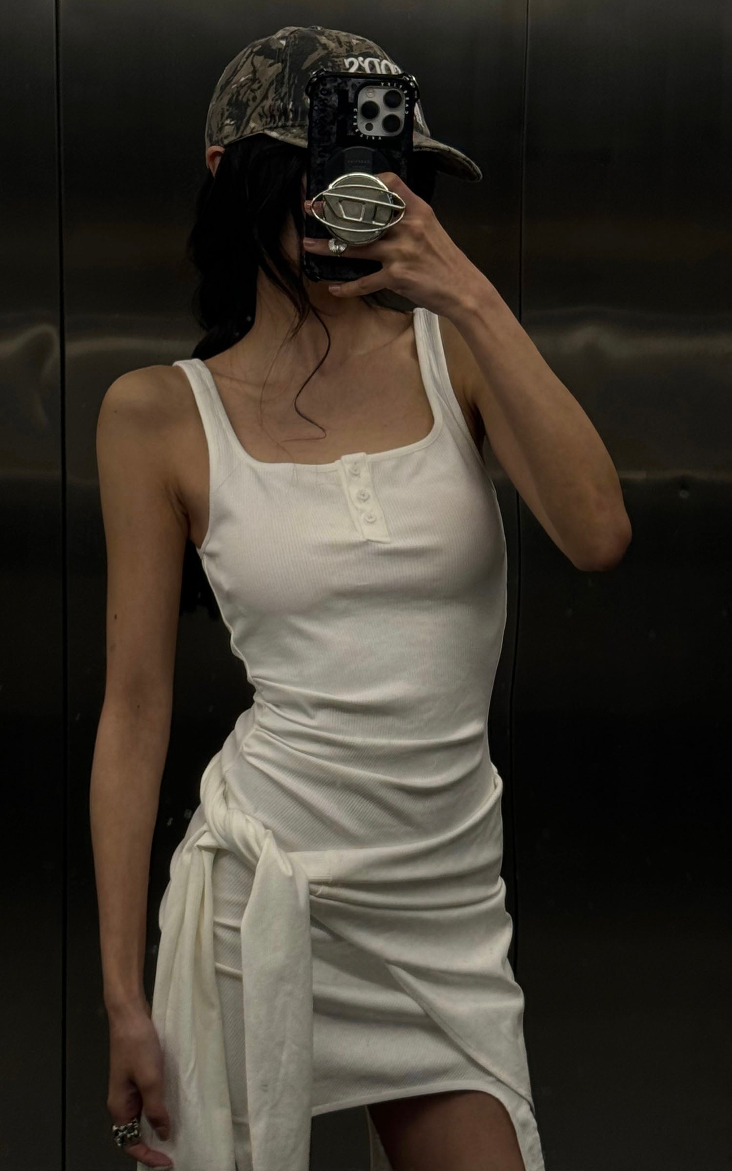 Not your basic tank dress.This asymmetric body-hugging piece is constructed in soft ribbed cotton with a built-in twist: an extended hemline and draped panels create the illusion of a second layer — like a long-sleeve shirt tied around the hips, deconstructed and redefined. Functional front placket adds tactile dimension. Wear it alone or over layers, day or night. No context needed.