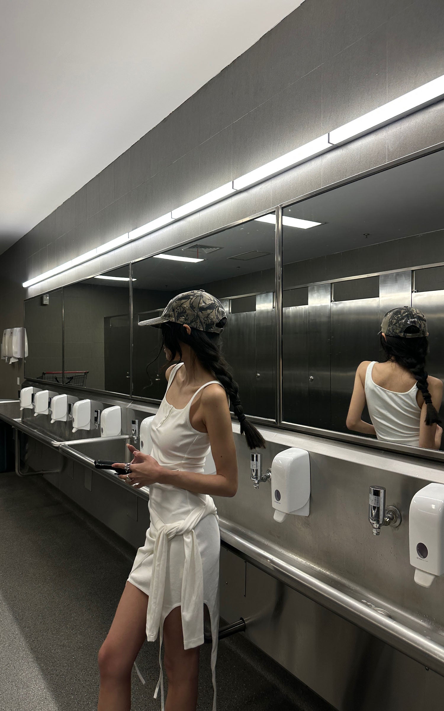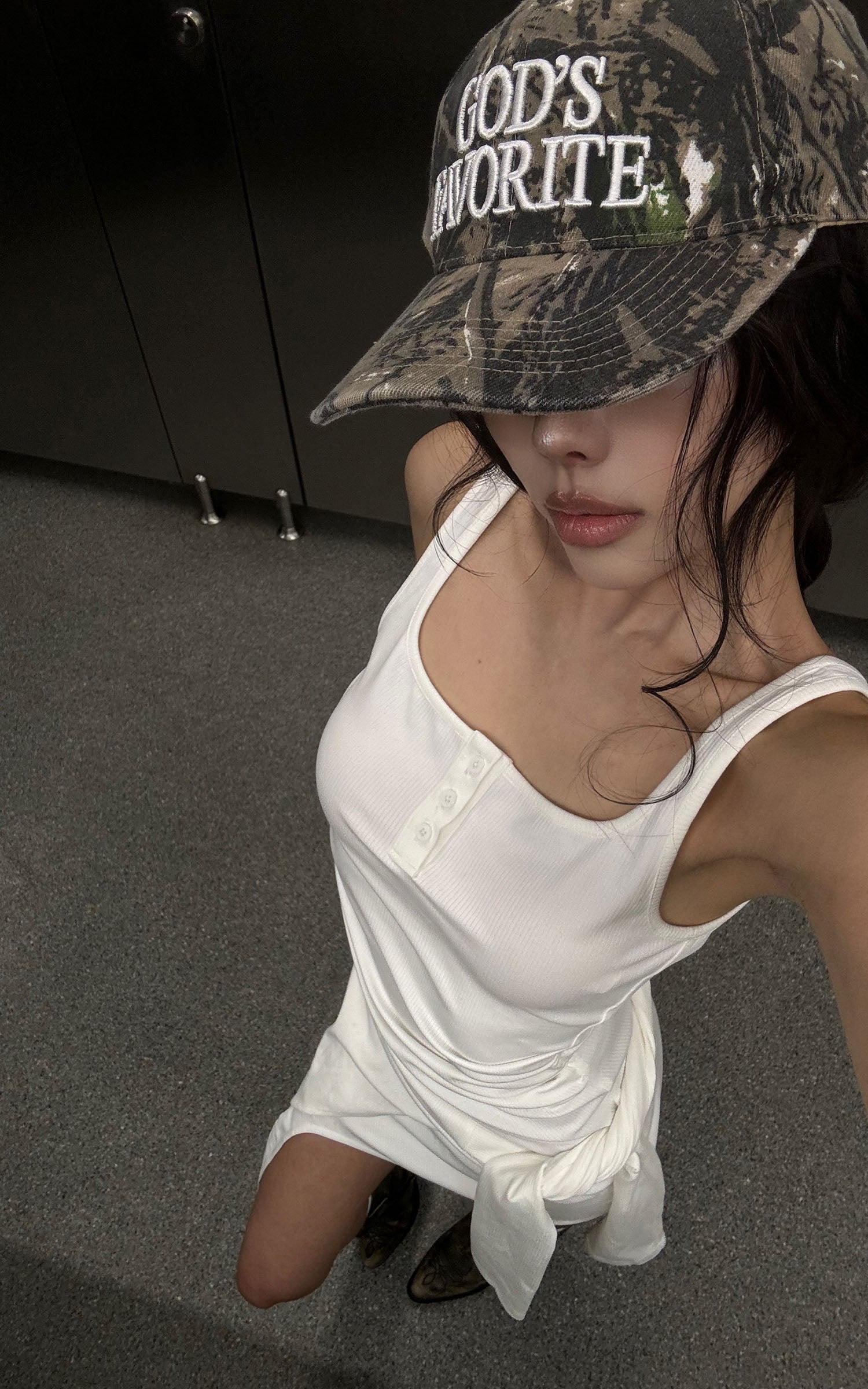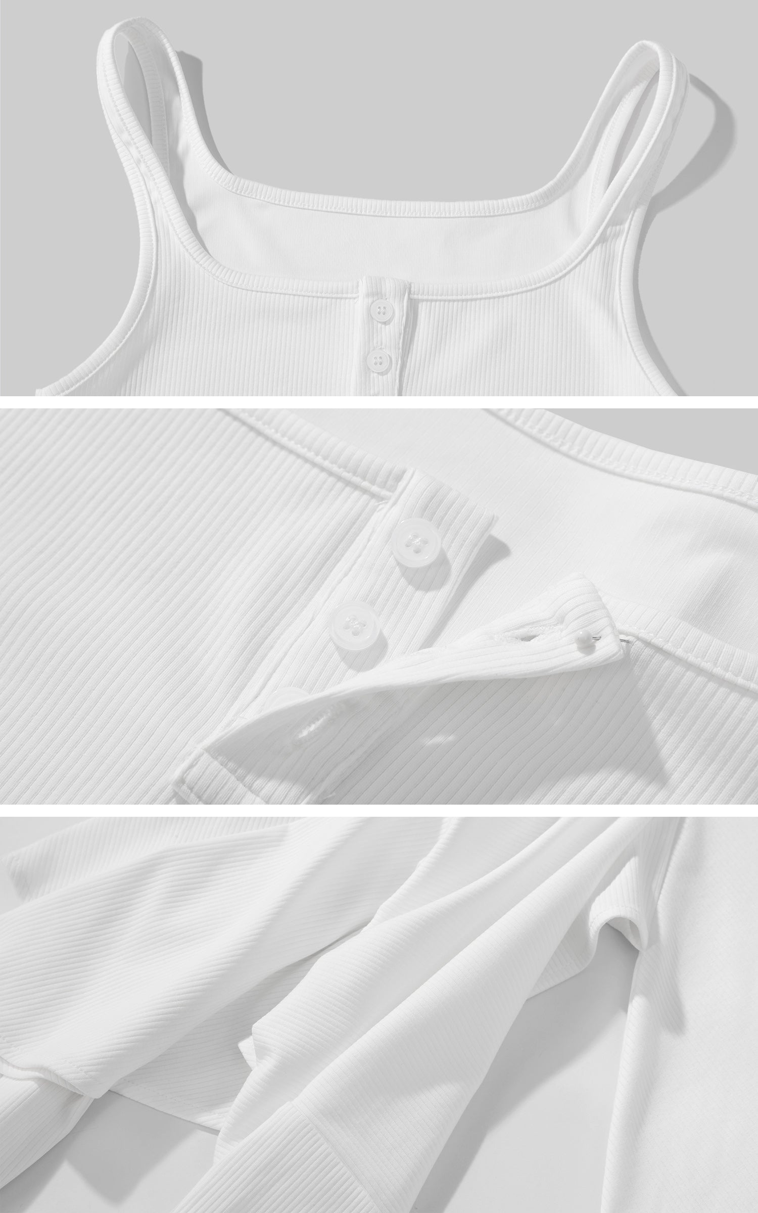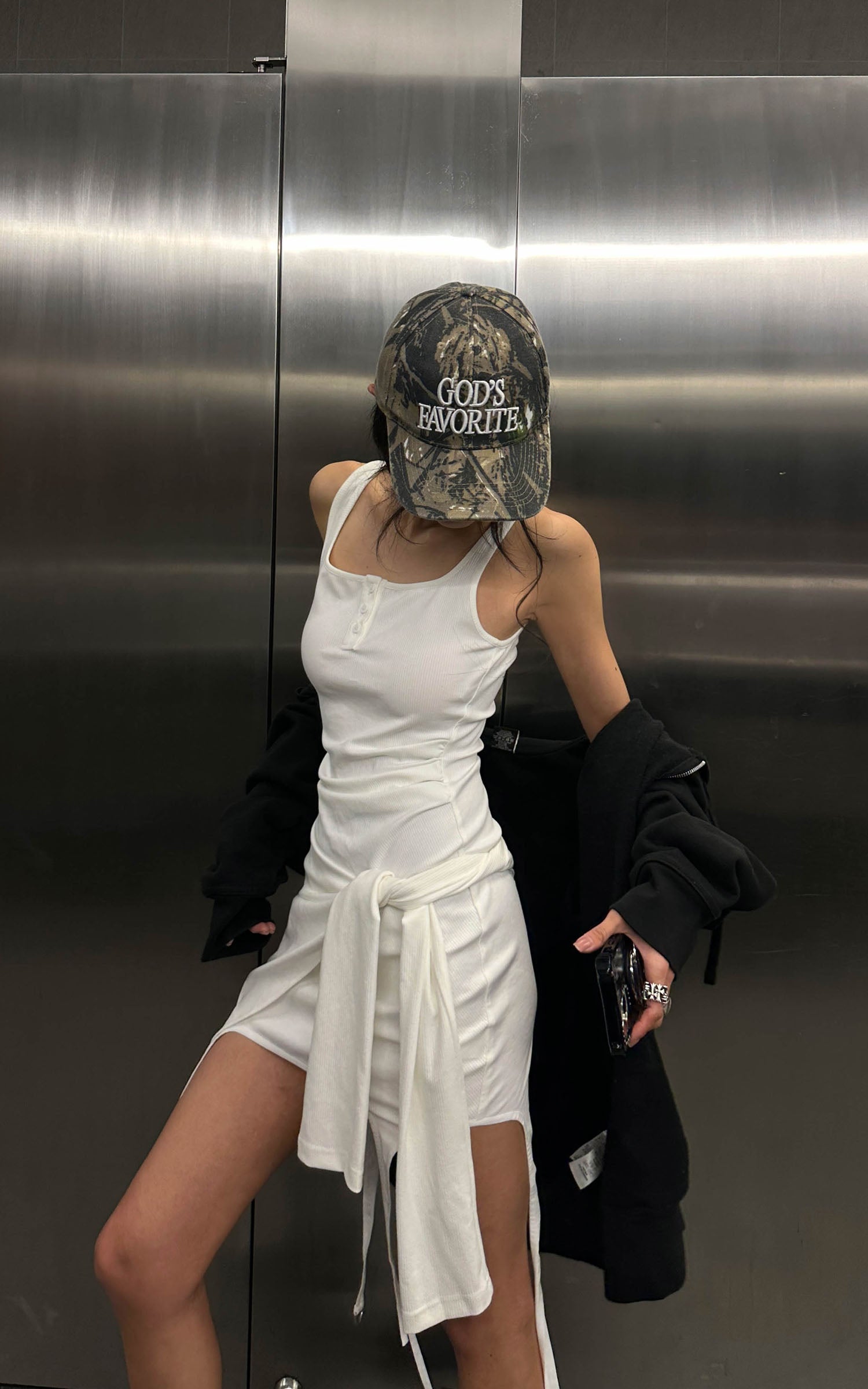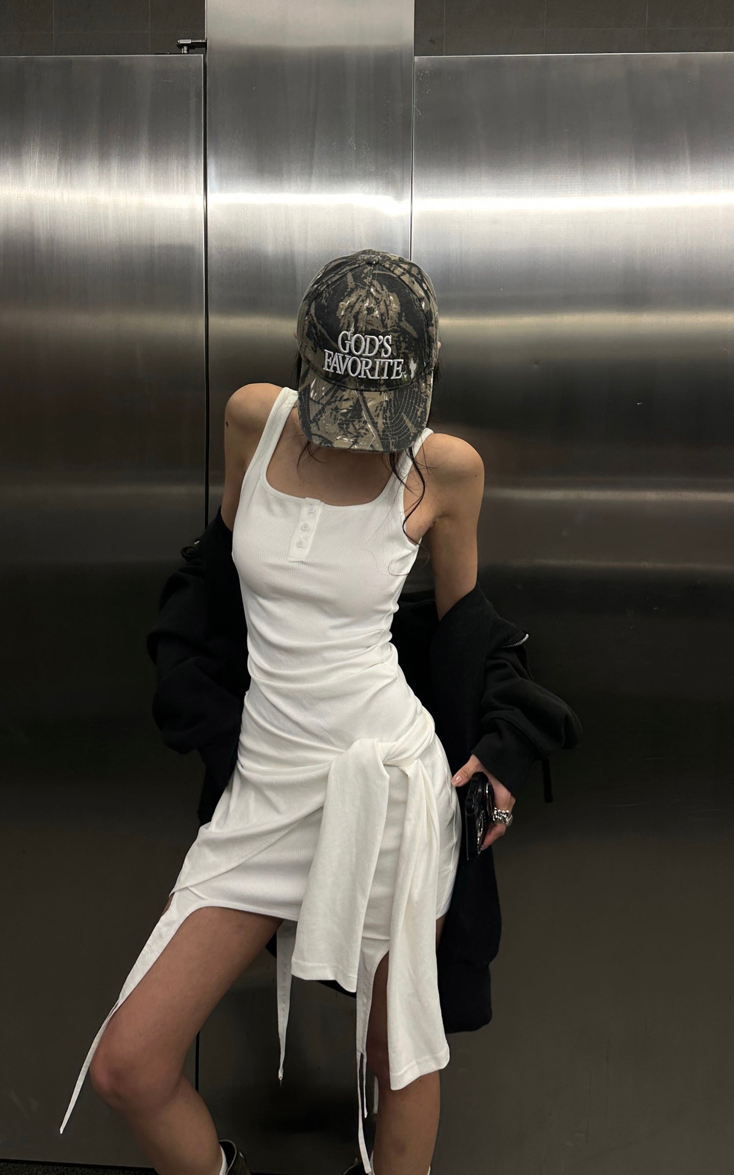 Not your basic tank dress.This asymmetric body-hugging piece is constructed in soft ribbed cotton with a built-in twist: an extended hemline and draped panels create the illusion of a second layer — like a long-sleeve shirt tied around the hips, deconstructed and redefined. Functional front placket adds tactile dimension. Wear it alone or over layers, day or night. No context needed.