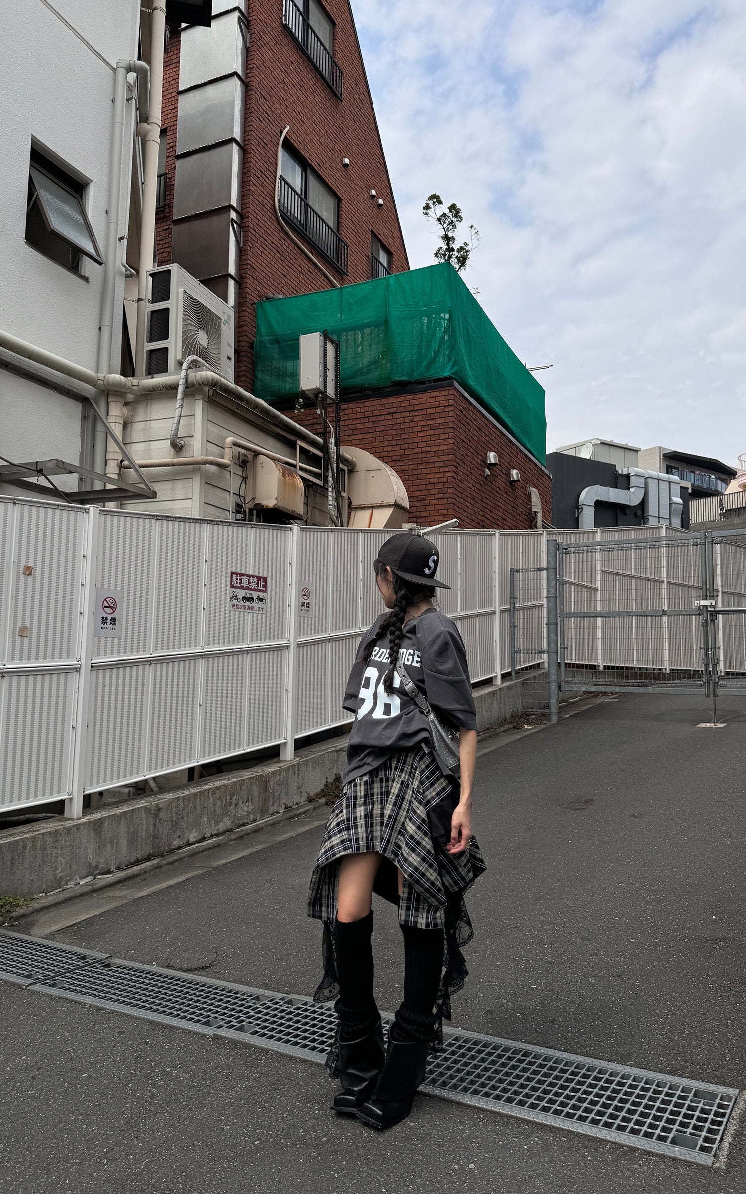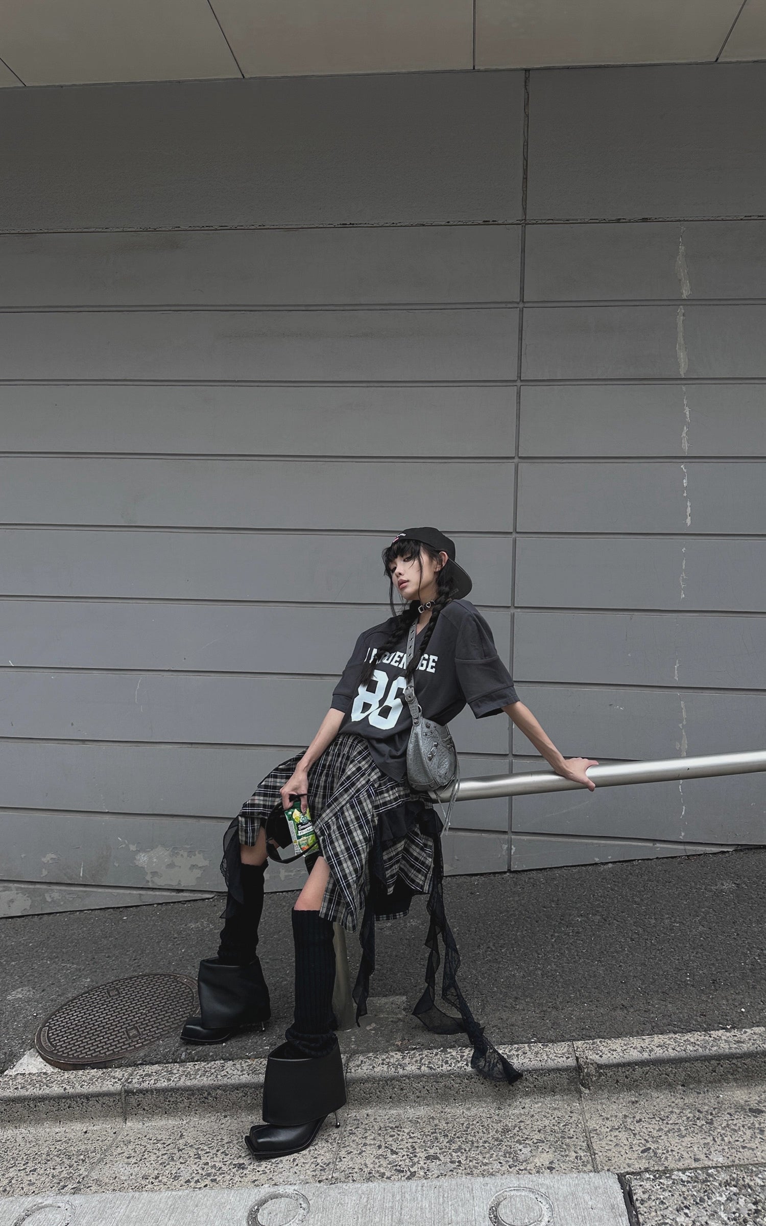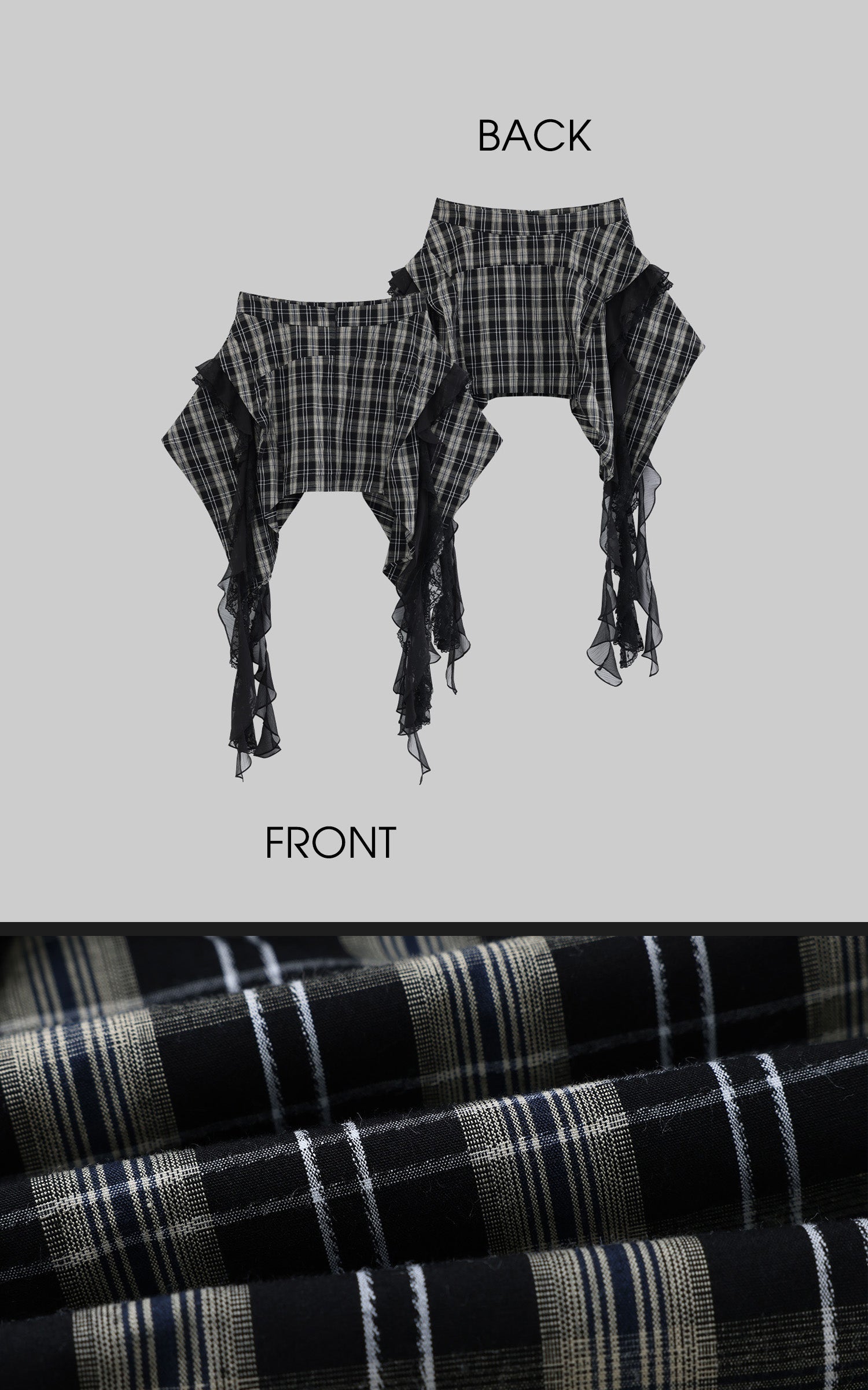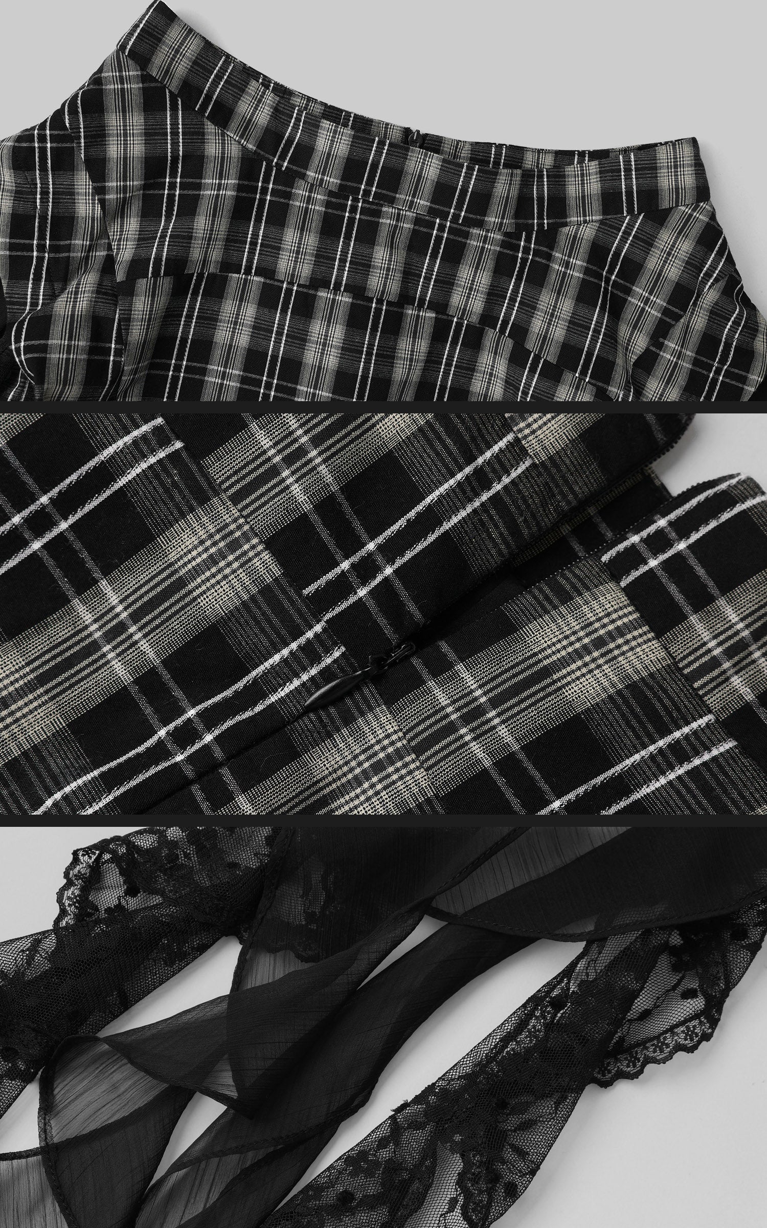 Questa gonna a quadri è l'epitome dello stile audace e decostruito. Caratterizzata da un orlo irregolare e stratificata con delicati dettagli in pizzo, aggiunge un tocco ribelle al tuo look. Il mix di elementi a quadri e trasparenti porta texture e movimento, perfetto per distinguersi nella moda street-style. Il drappeggio fluido della gonna abbinato alla sua struttura audace la rende un must-have per chi vuole sfumare i confini tra classico e avanguardia.
