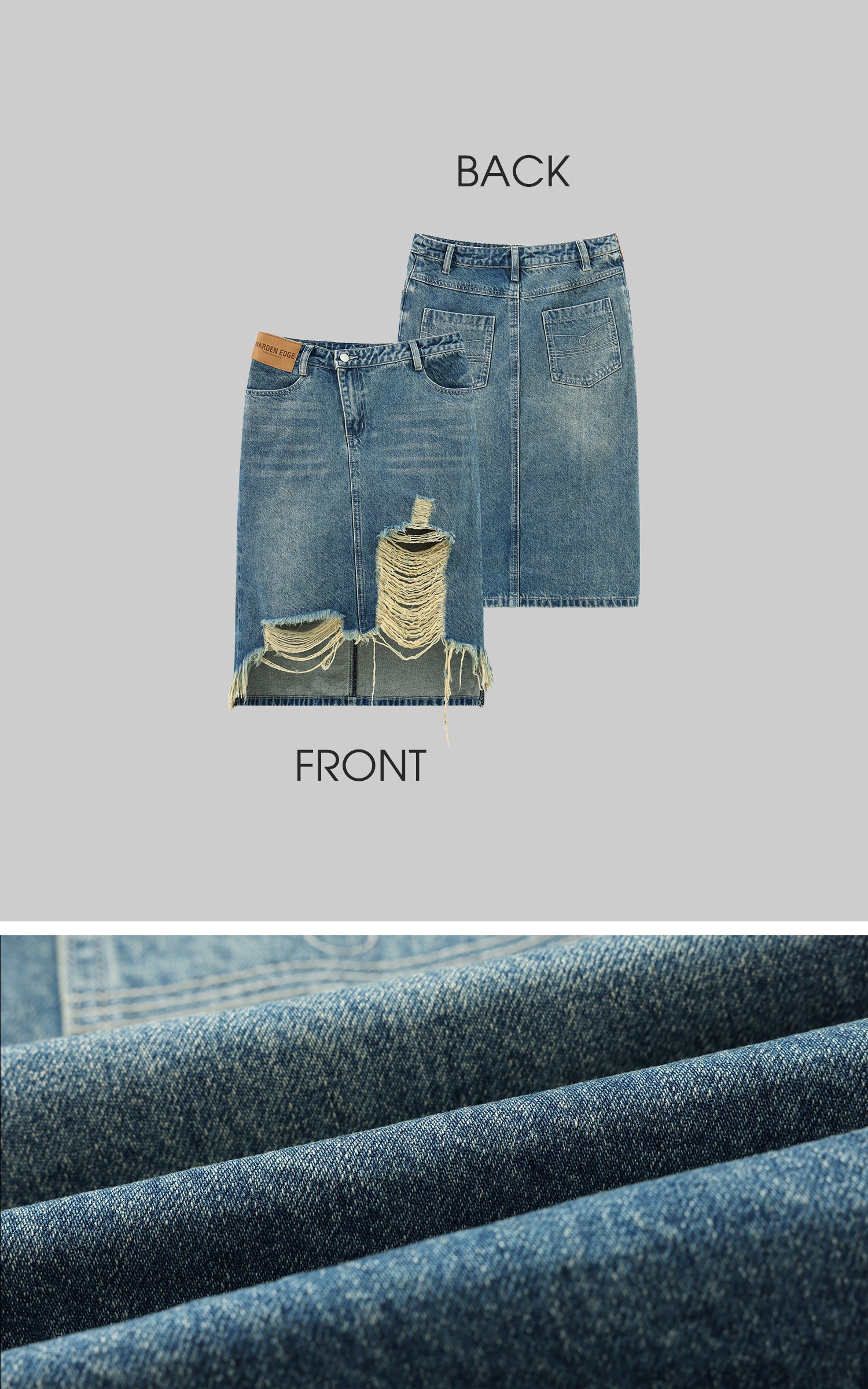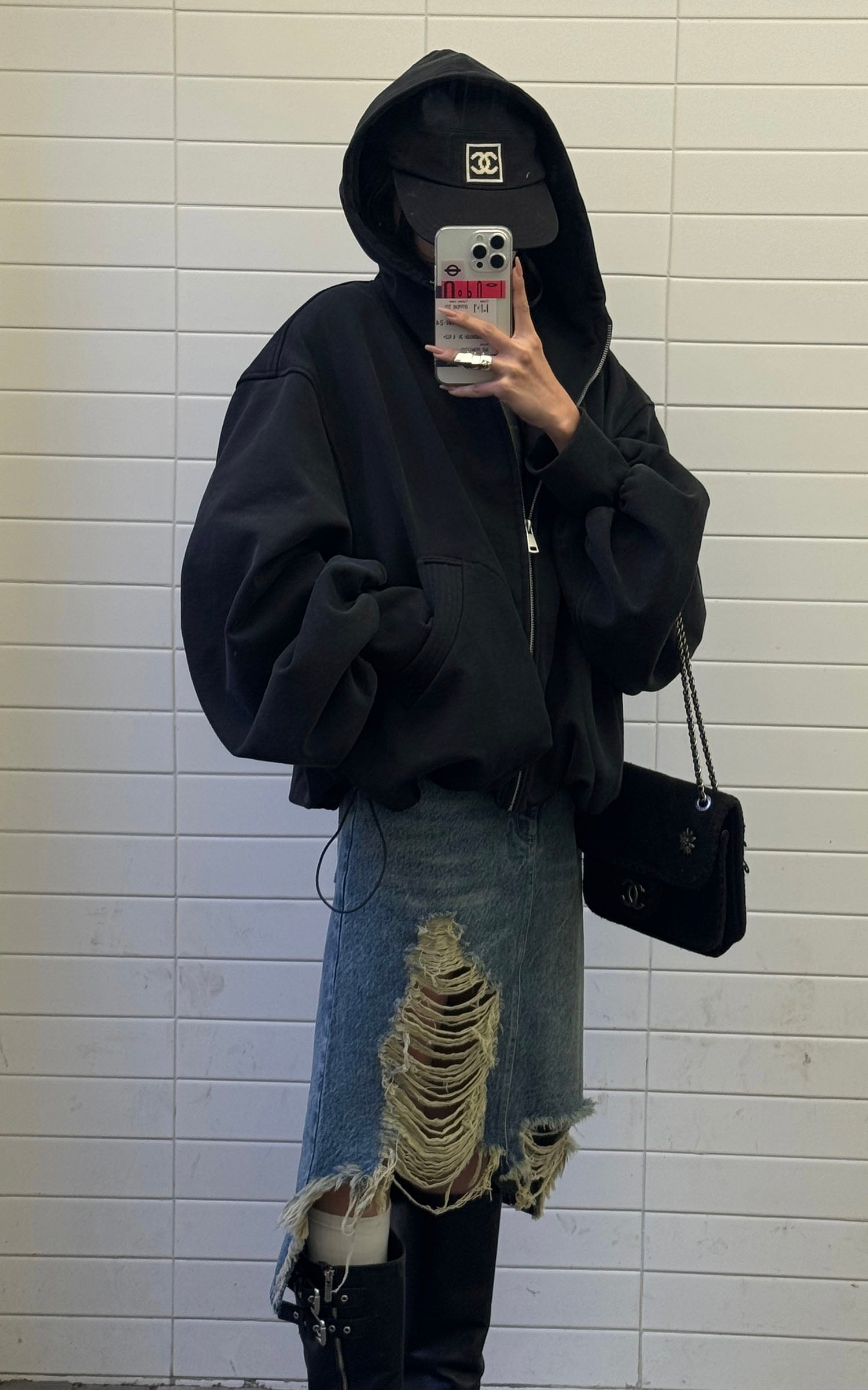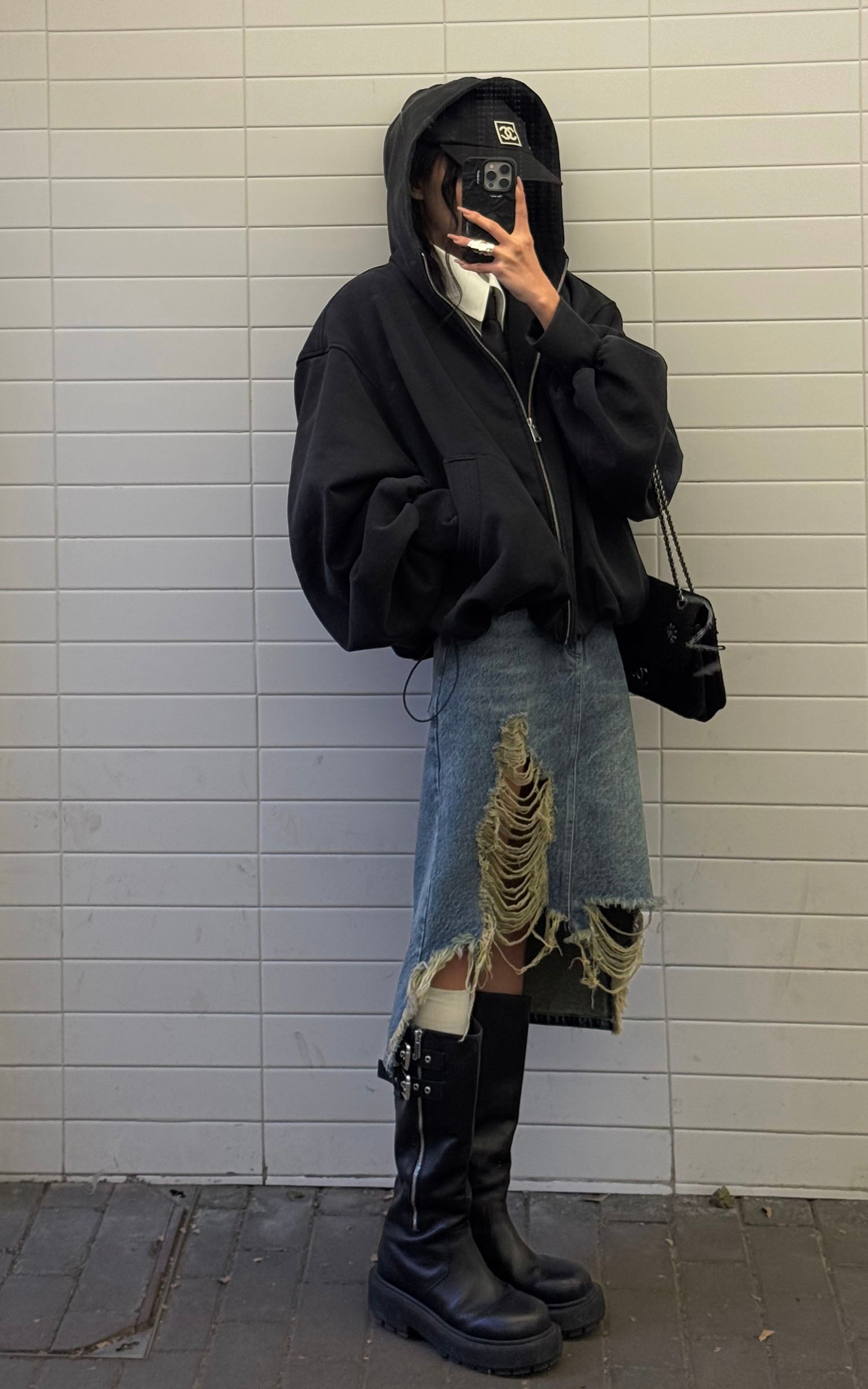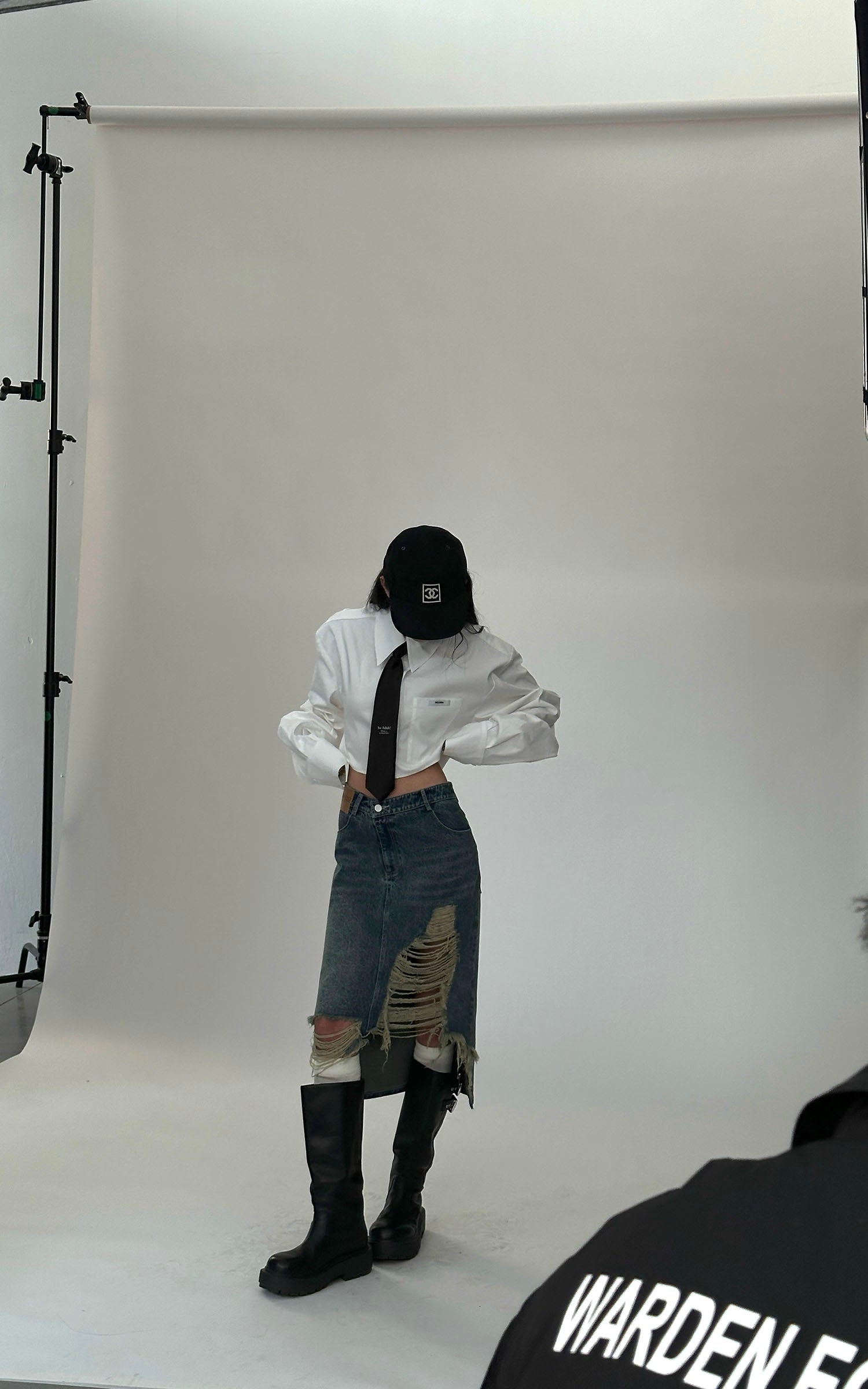 Una reinterpretazione audace del classico denim, questa gonna midi strappata rompe le convenzioni con una decostruzione a bordo grezzo e un orlo asimmetrico. I dettagli sfrangiati e strappati aggiungono un'atmosfera streetwear ribelle senza sforzo, mentre il tessuto in denim lavato strutturato garantisce durata e stile. La sua silhouette di media lunghezza offre versatilità: abbinala a stivali robusti per un'affermazione audace o a sneakers per un look urbano rilassato.