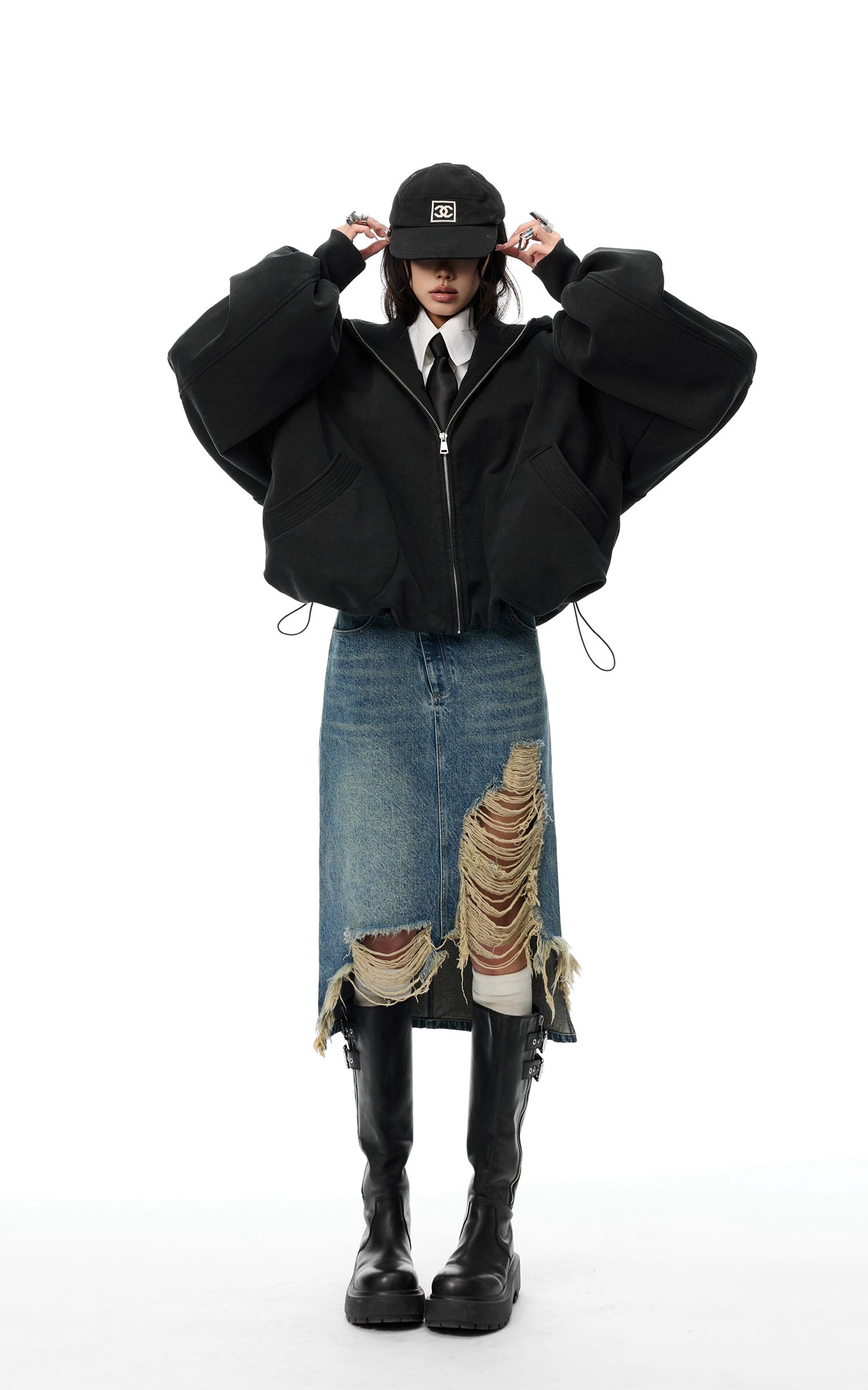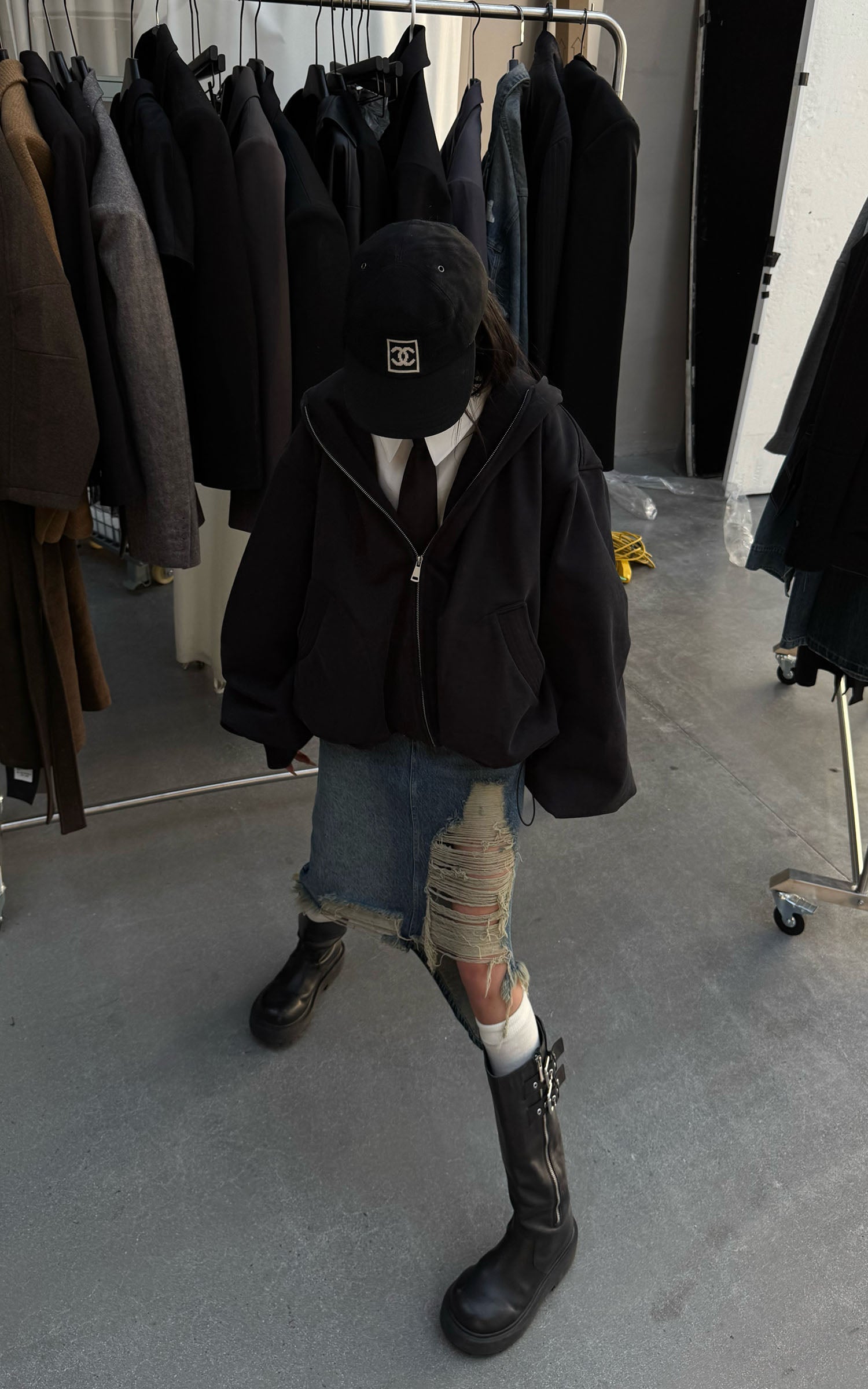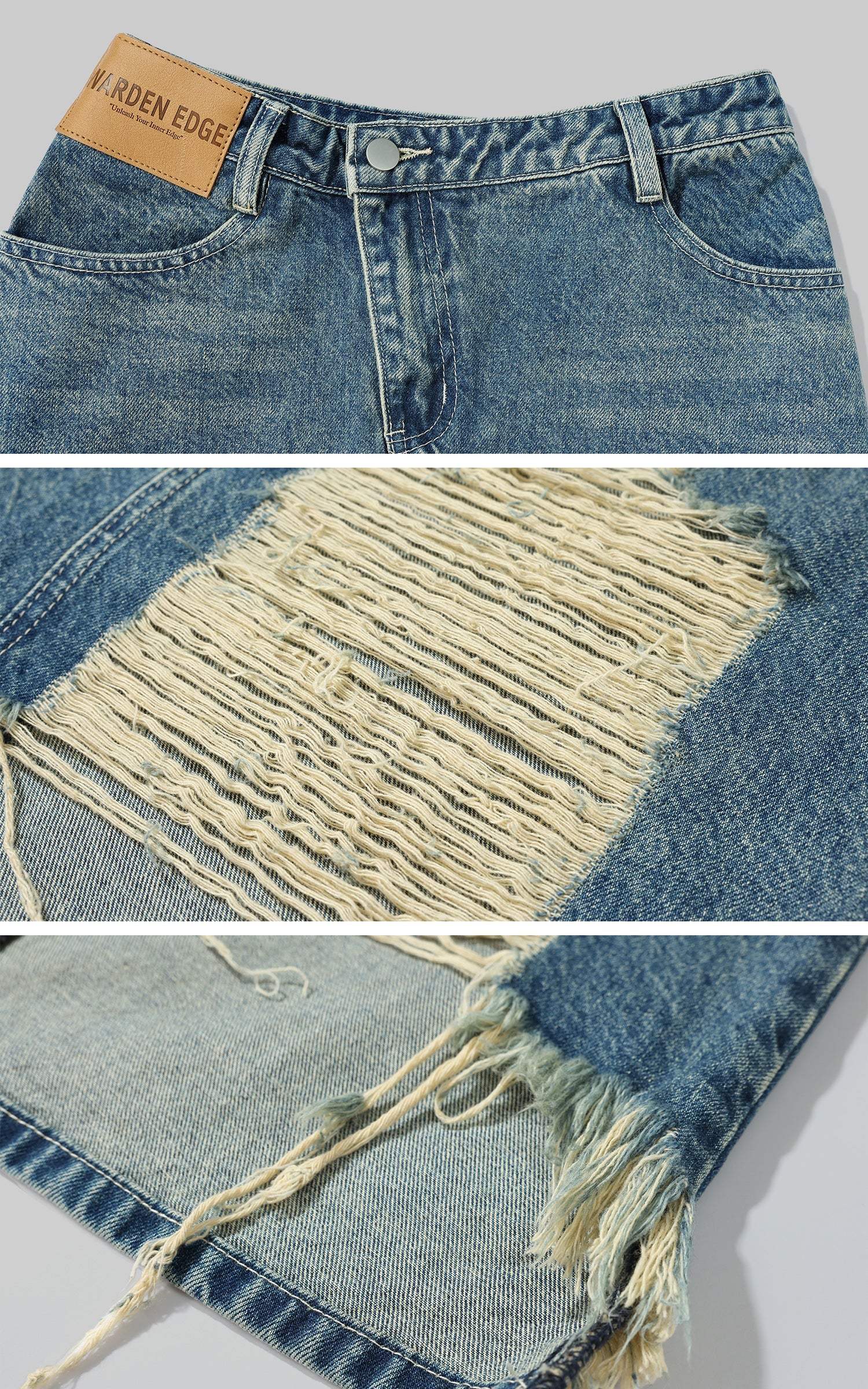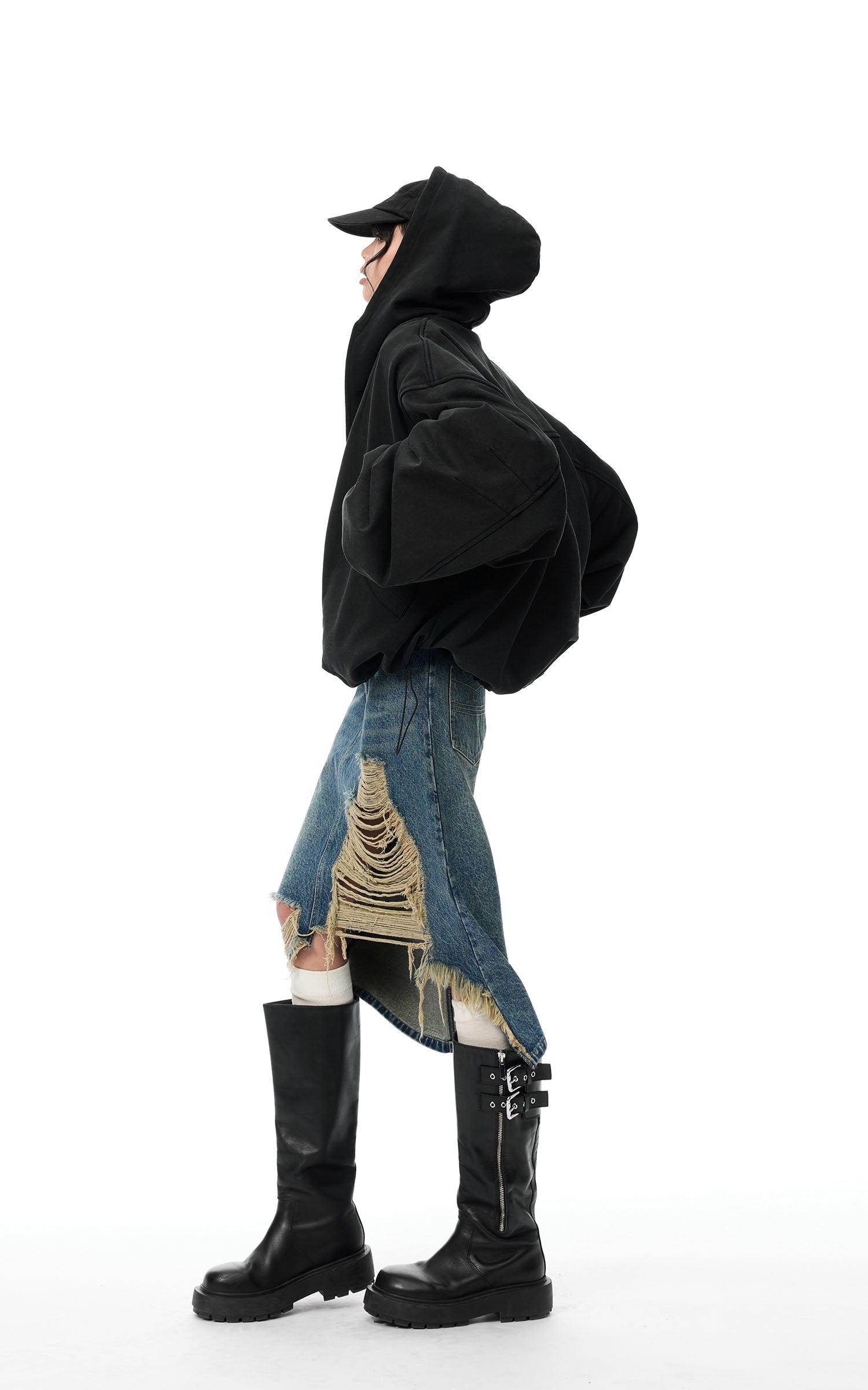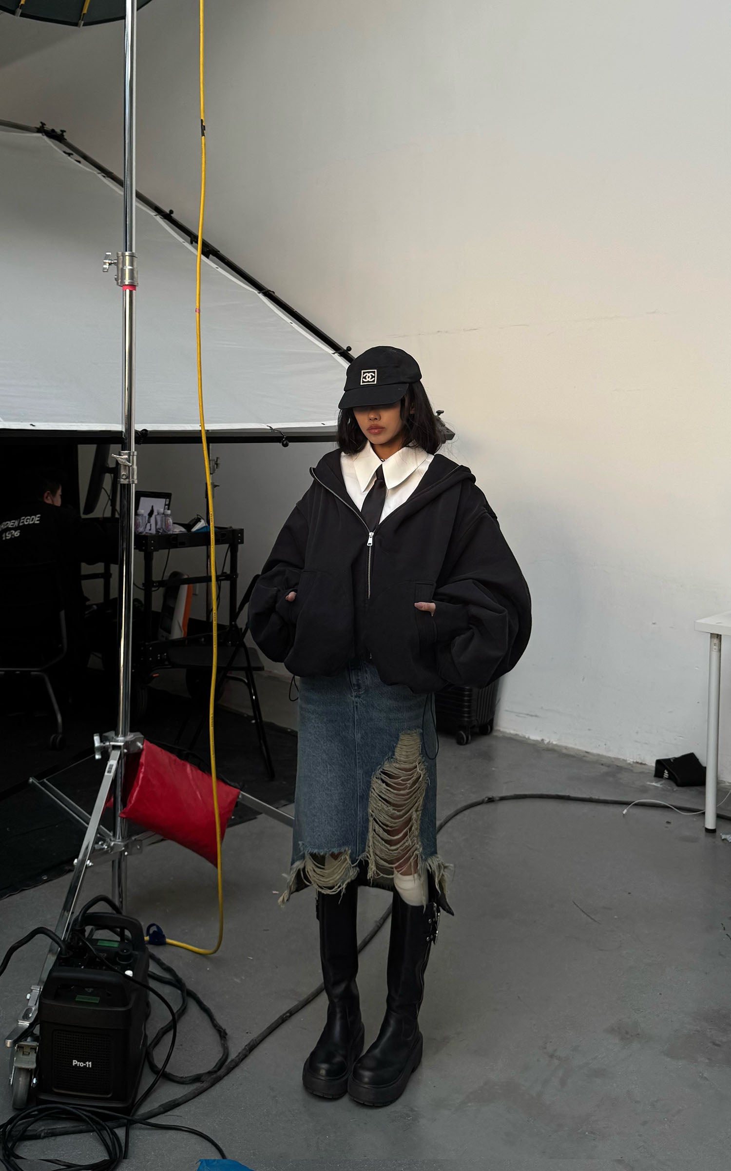 Una reinterpretazione audace del classico denim, questa gonna midi strappata rompe le convenzioni con una decostruzione a bordo grezzo e un orlo asimmetrico. I dettagli sfrangiati e strappati aggiungono un'atmosfera streetwear ribelle senza sforzo, mentre il tessuto in denim lavato strutturato garantisce durata e stile. La sua silhouette di media lunghezza offre versatilità: abbinala a stivali robusti per un'affermazione audace o a sneakers per un look urbano rilassato.