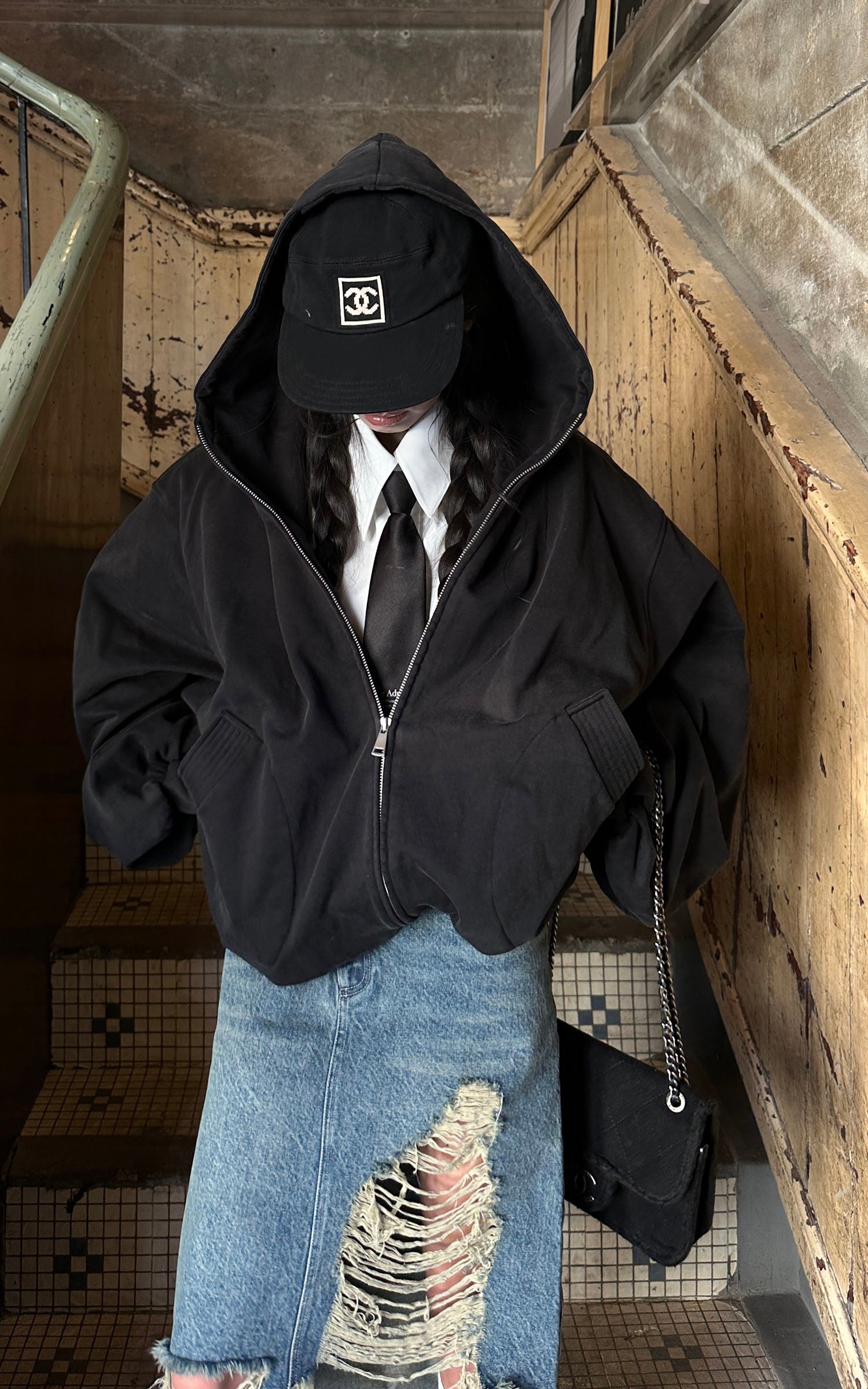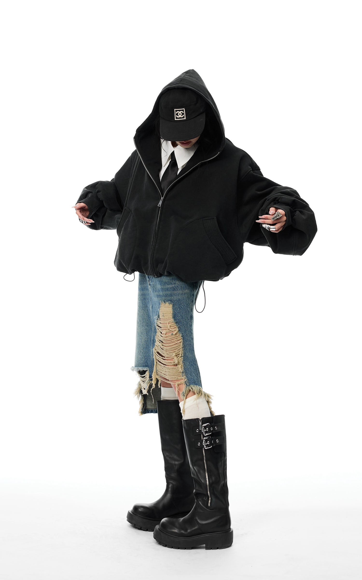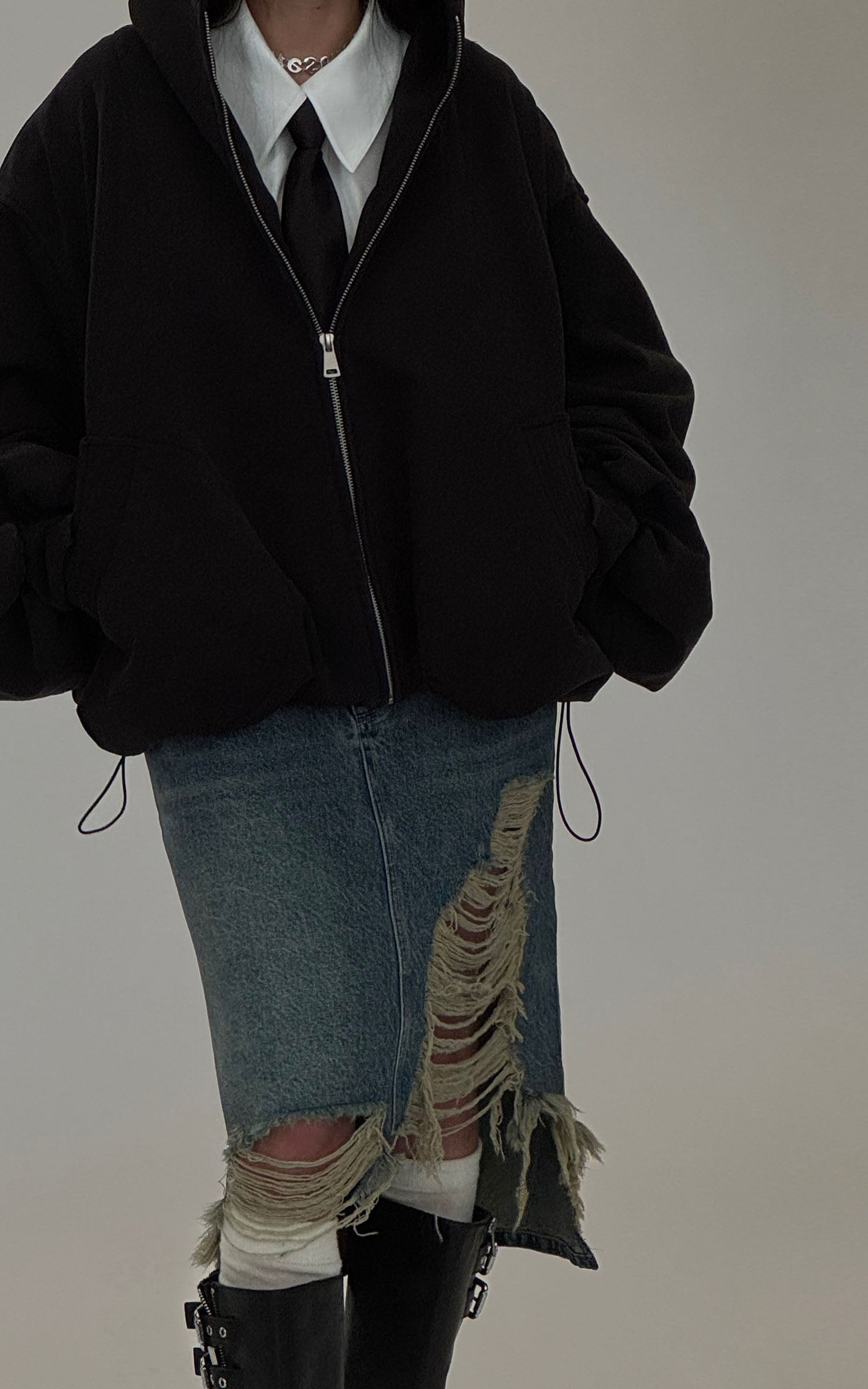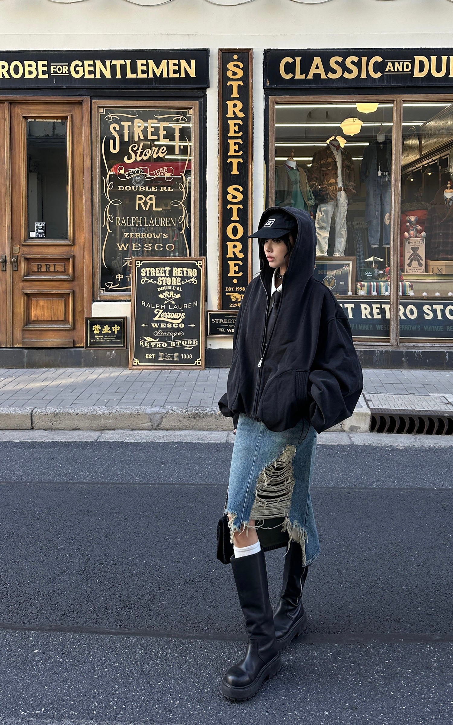 Una reinterpretazione audace del classico denim, questa gonna midi strappata rompe le convenzioni con una decostruzione a bordo grezzo e un orlo asimmetrico. I dettagli sfrangiati e strappati aggiungono un'atmosfera streetwear ribelle senza sforzo, mentre il tessuto in denim lavato strutturato garantisce durata e stile. La sua silhouette di media lunghezza offre versatilità: abbinala a stivali robusti per un'affermazione audace o a sneakers per un look urbano rilassato.
