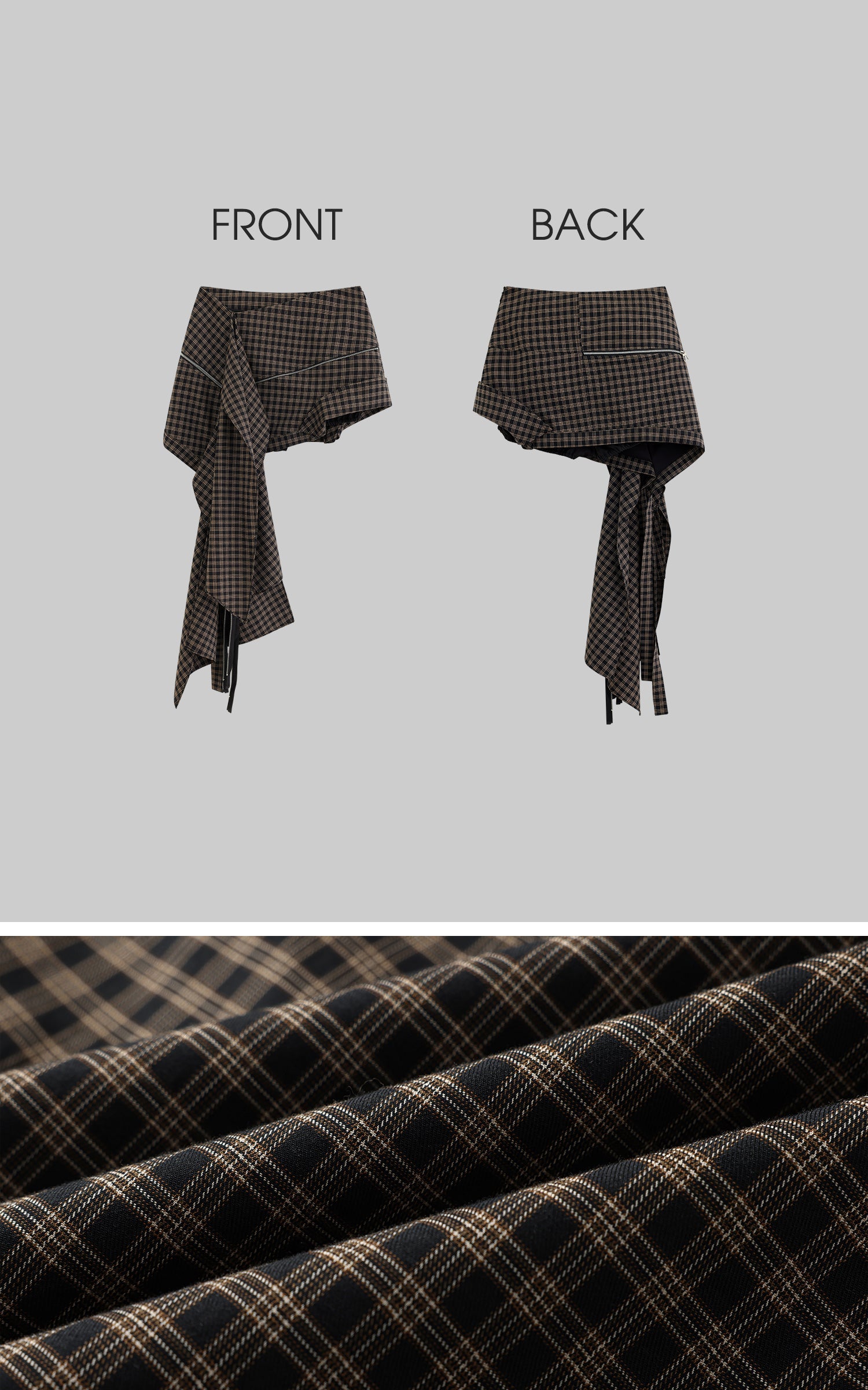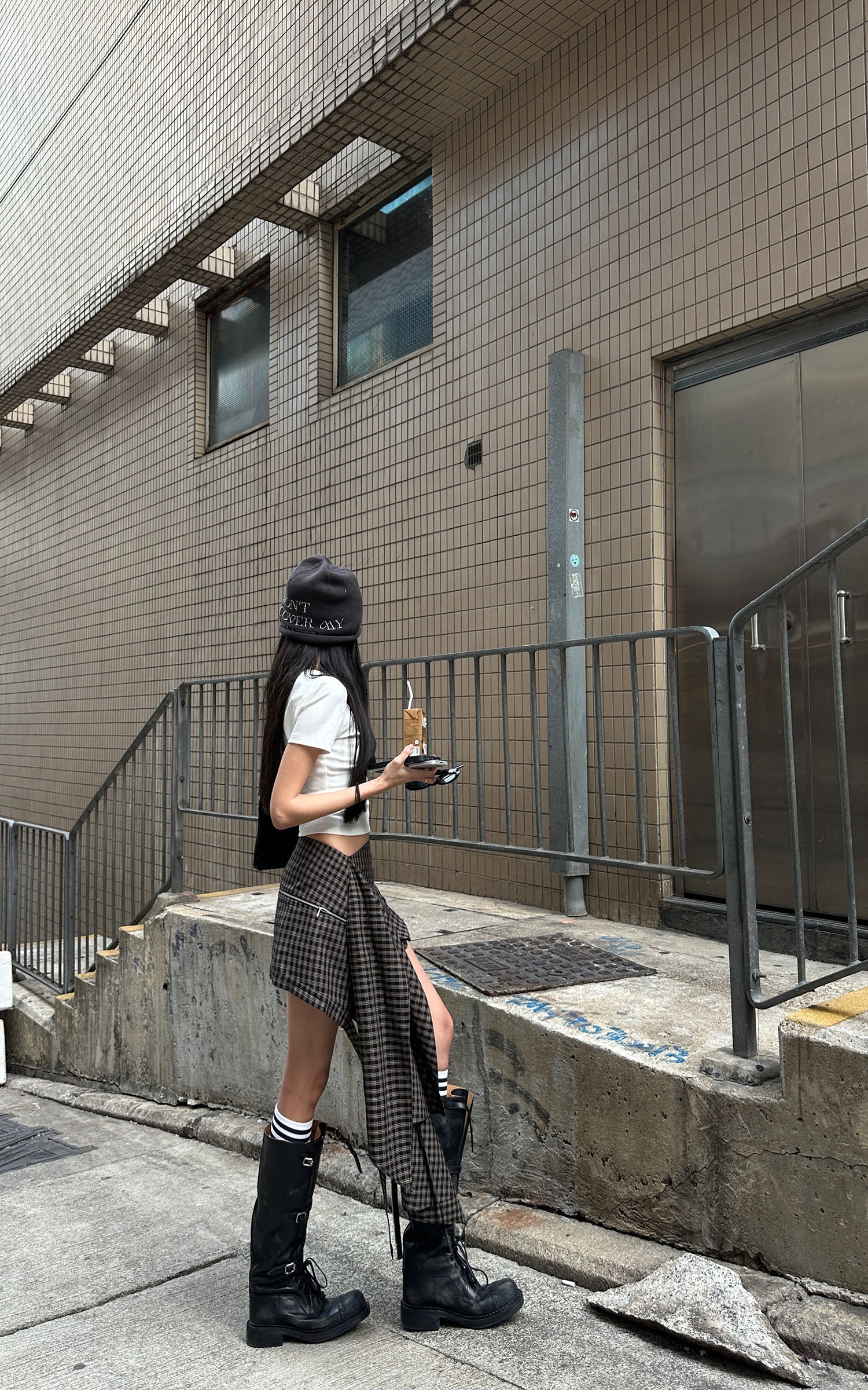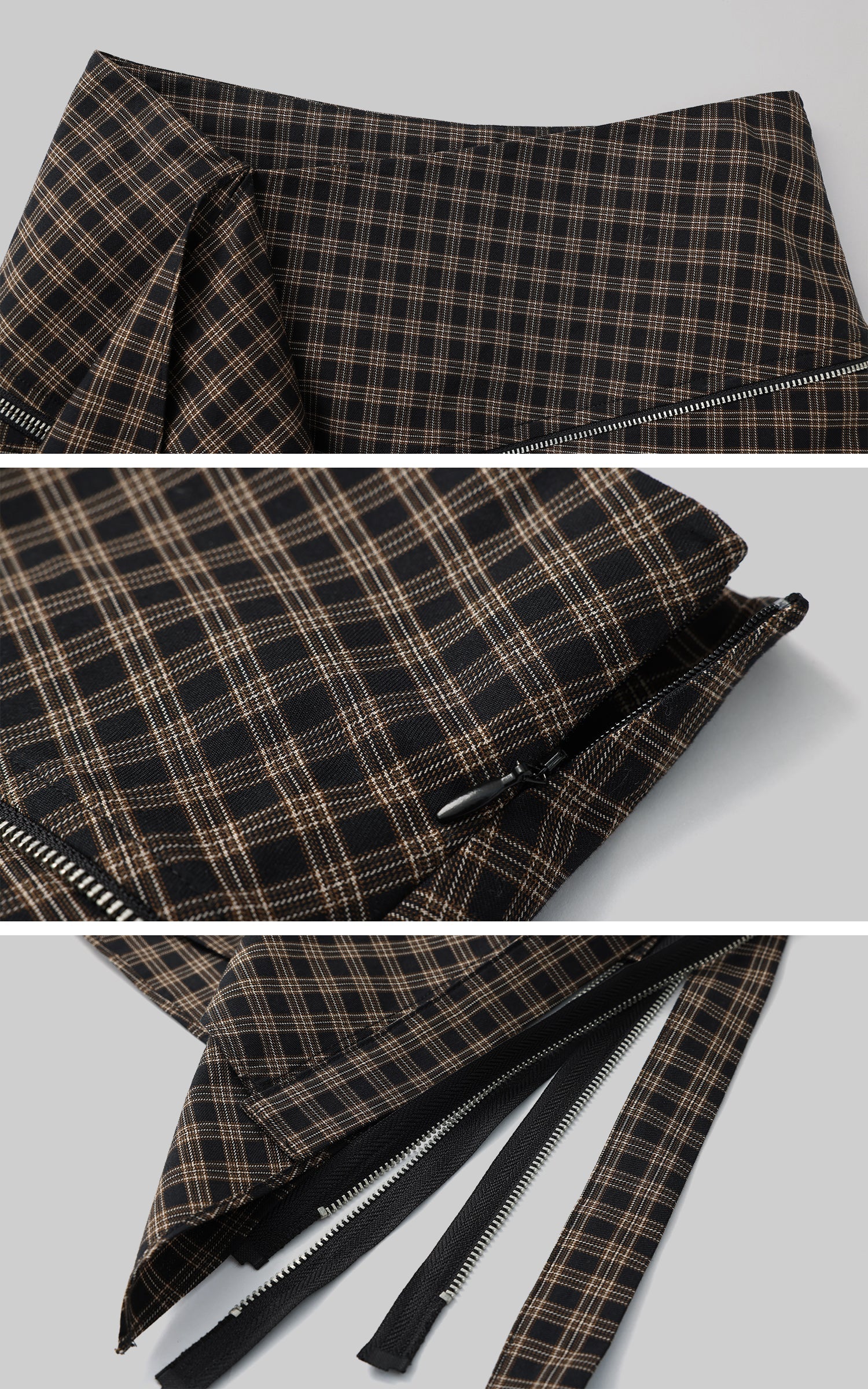 This irregular plaid A-line skirt leads the street style trend with its unique design. The asymmetrical hem combined with refined zipper details exudes a distinct fashion sense. The high-waisted cut accentuates the legs, embodying both elegance and strength. Whether paired with a simple T-shirt or an exaggerated jacket, it effortlessly creates a bold street style look.