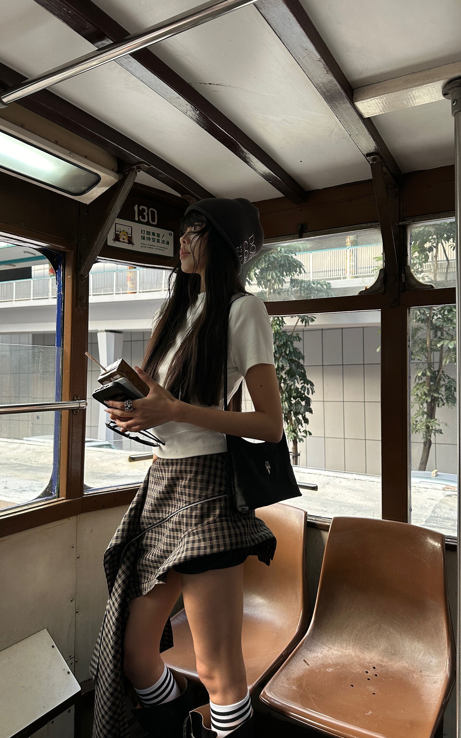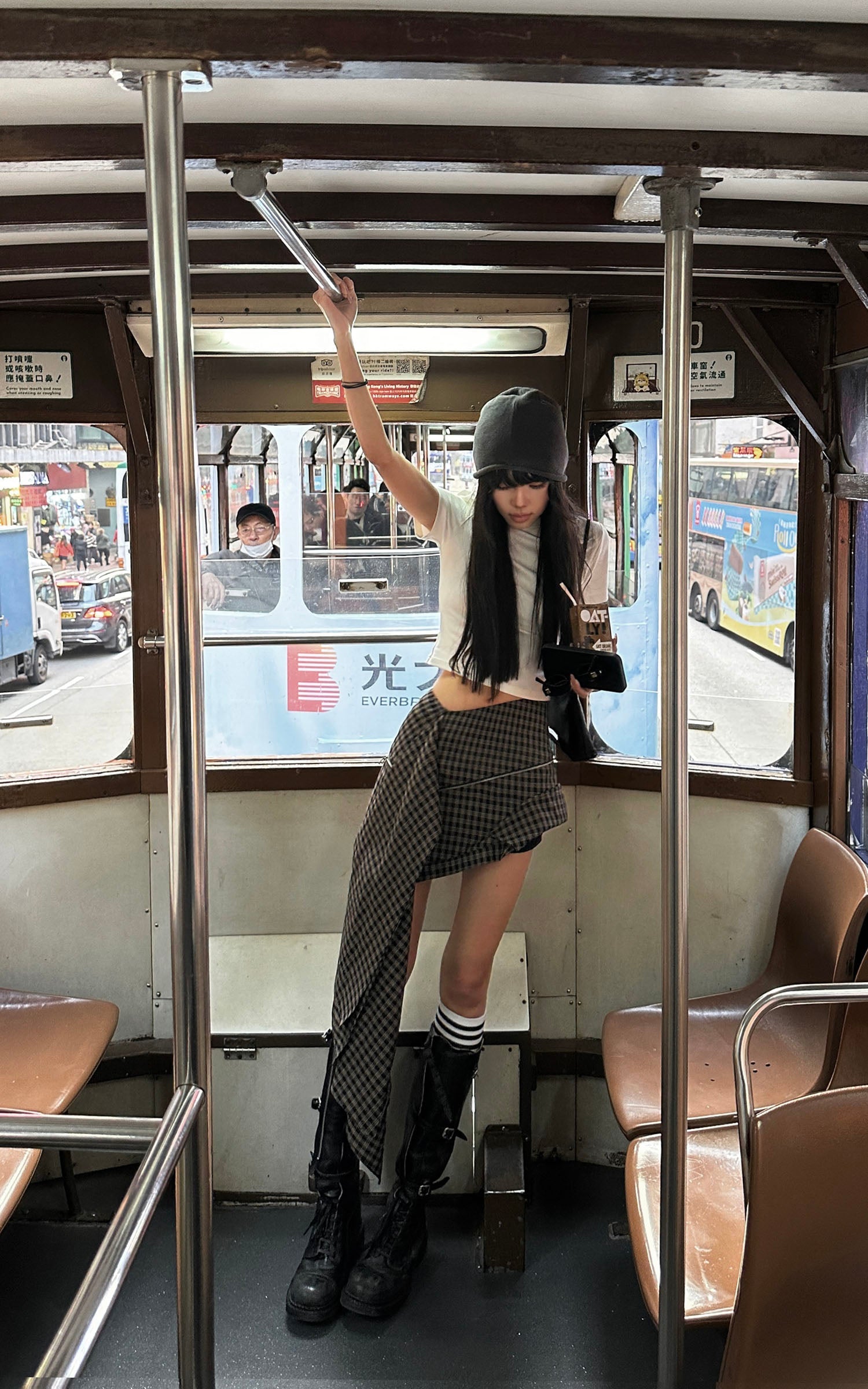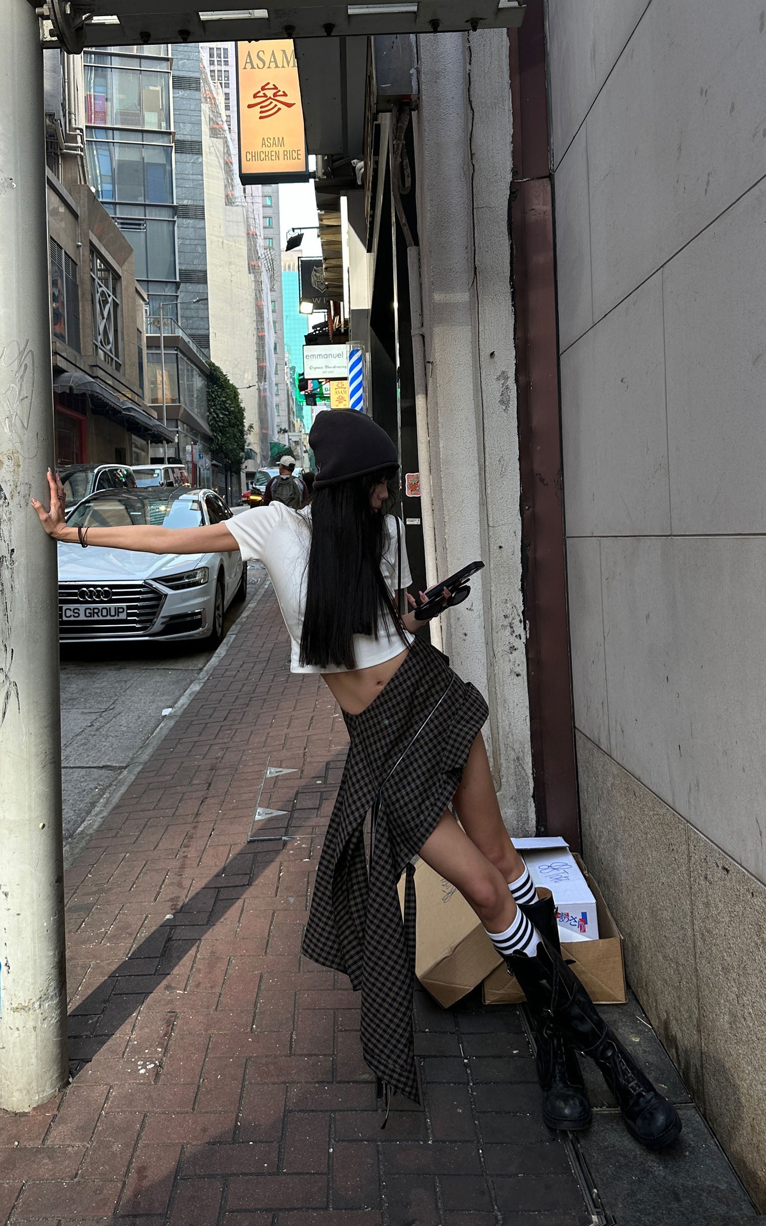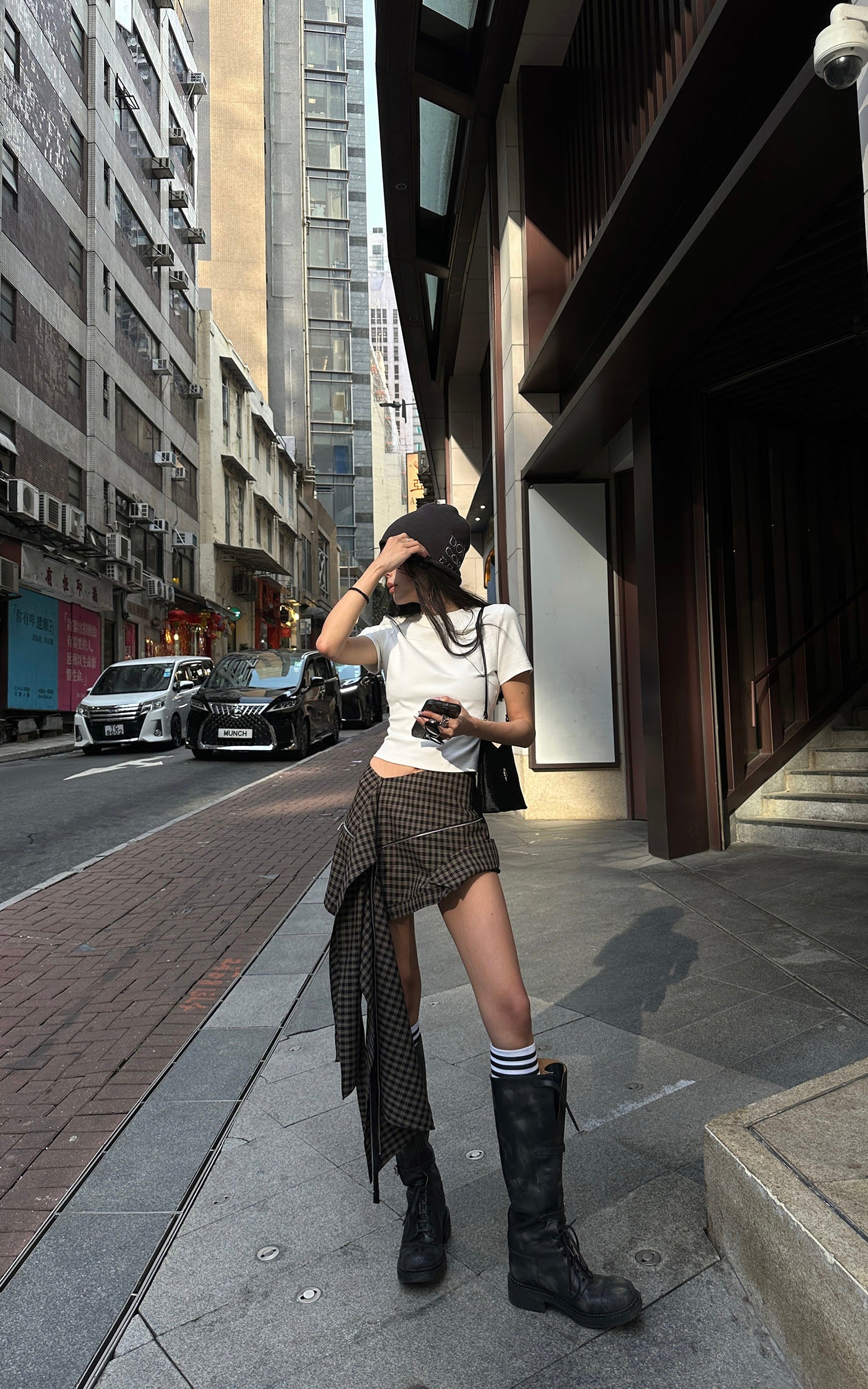 This irregular plaid A-line skirt leads the street style trend with its unique design. The asymmetrical hem combined with refined zipper details exudes a distinct fashion sense. The high-waisted cut accentuates the legs, embodying both elegance and strength. Whether paired with a simple T-shirt or an exaggerated jacket, it effortlessly creates a bold street style look.