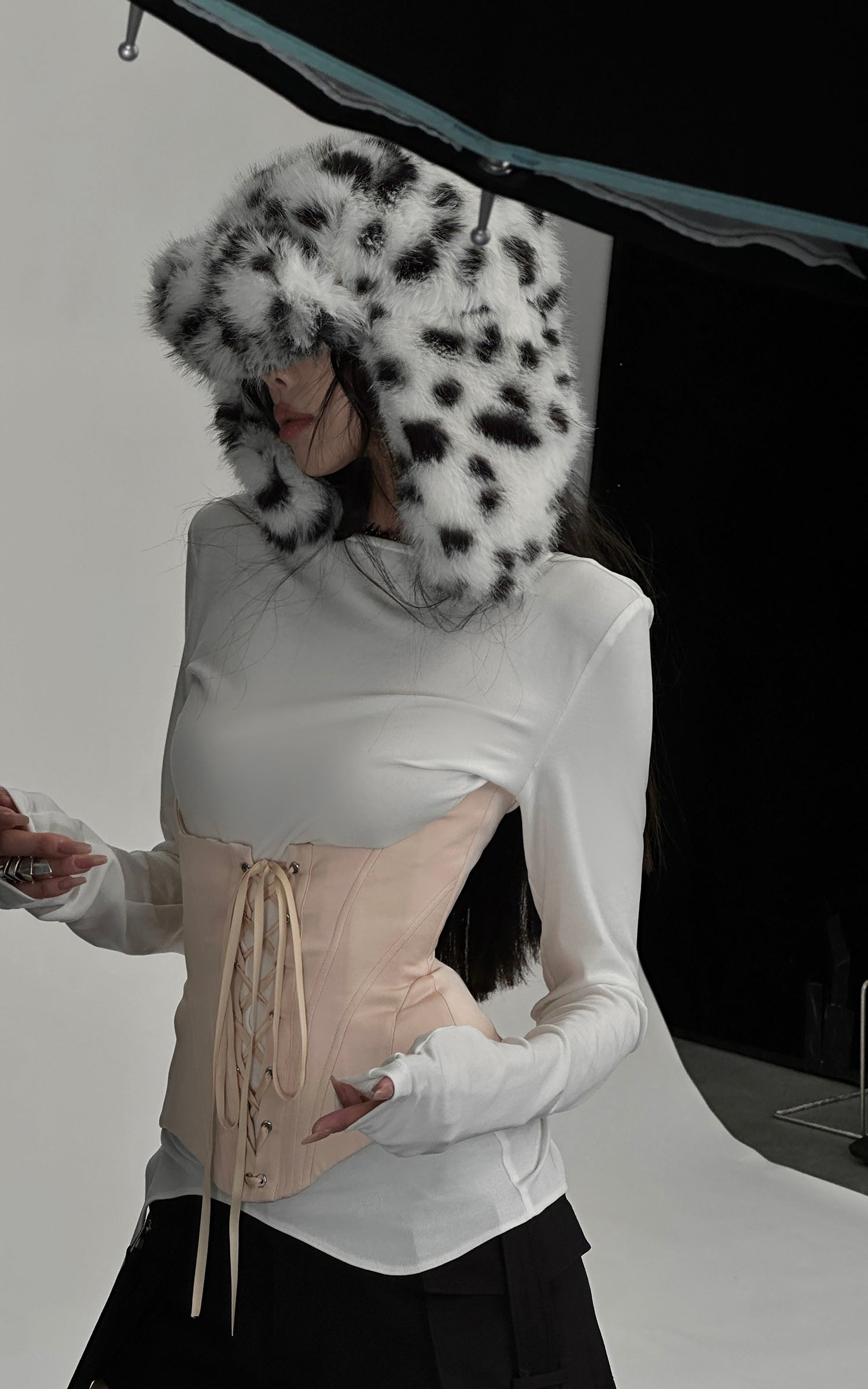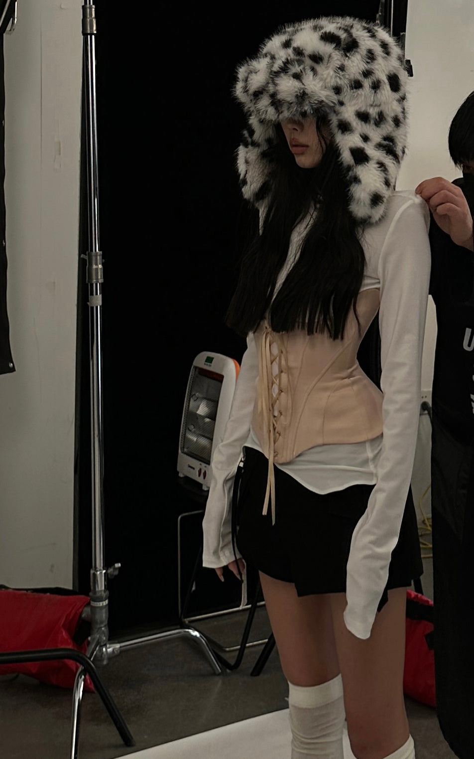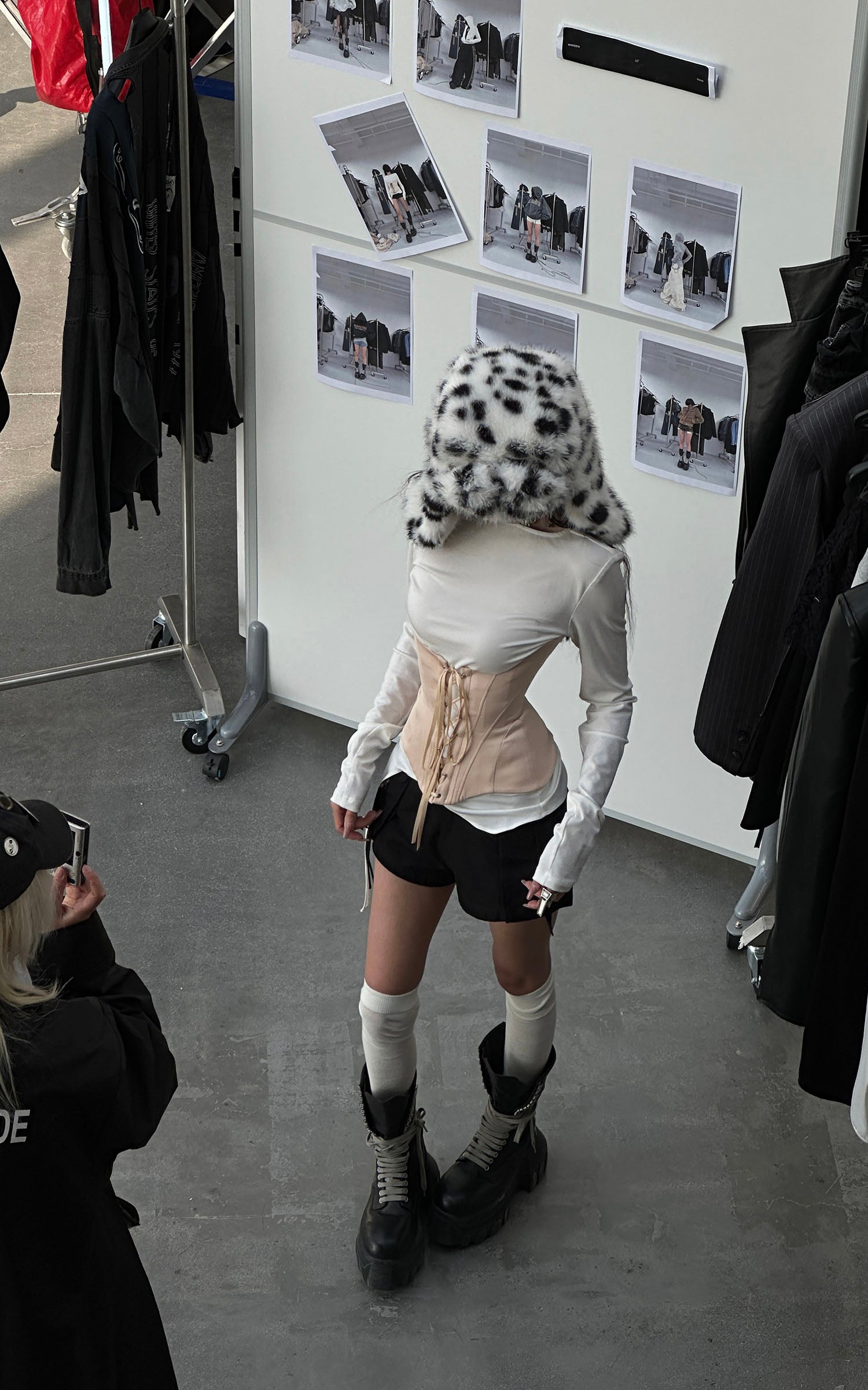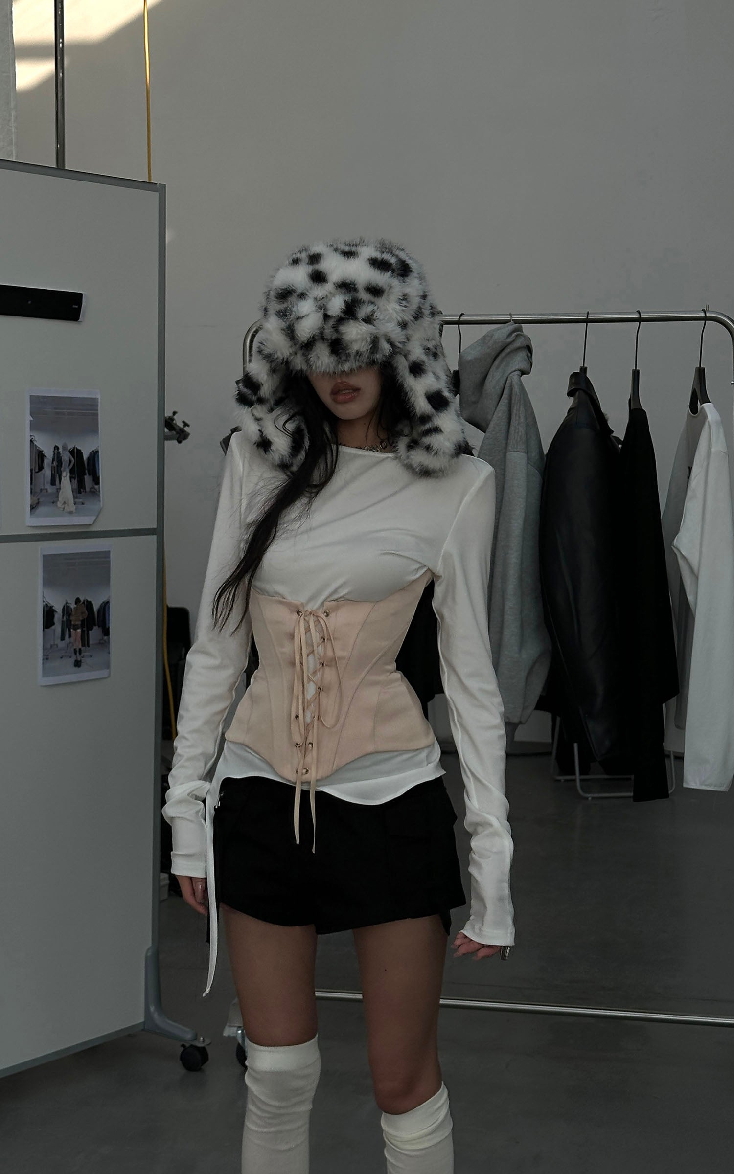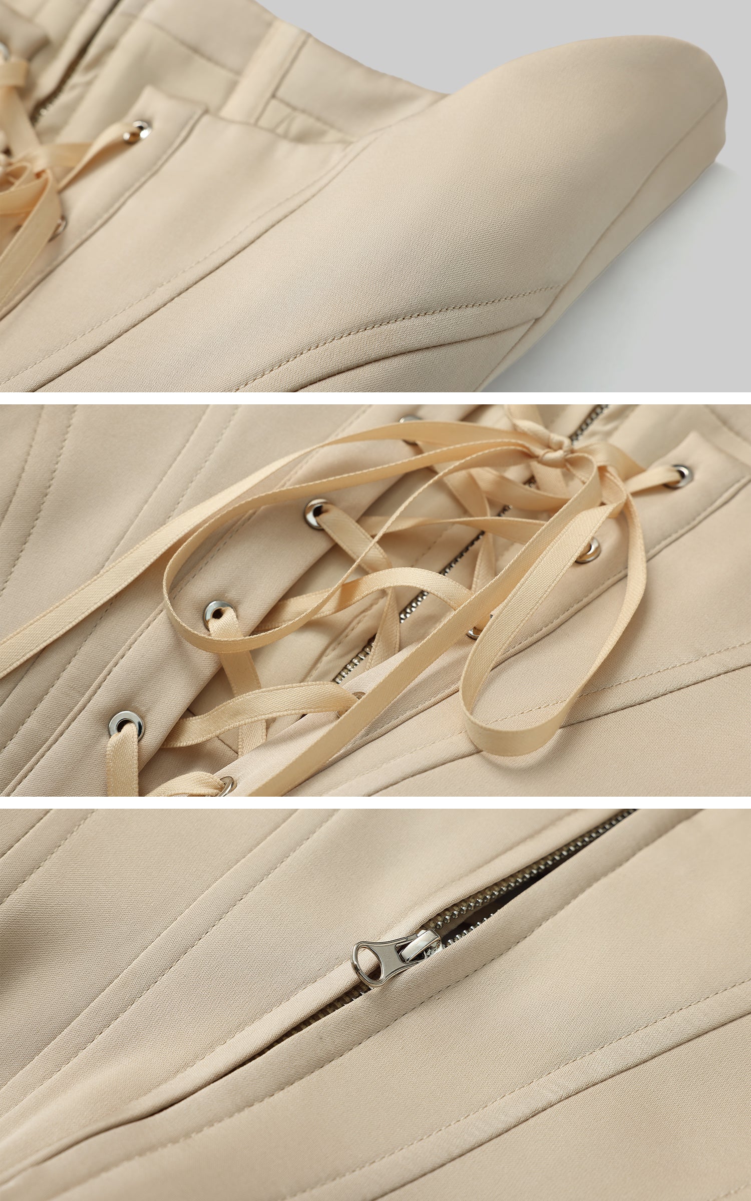 Un gioco di struttura e morbidezza si svela in questo sorprendente set a due pezzi. La maglia a maniche lunghe rompe la simmetria con un orlo asimmetrico, mentre il corsetto con lacci scolpisce la vita con precisione architettonica. Liscio ma elastico, il tessuto avvolge il corpo, creando una tensione netta ma fluida. Progettato per la versatilità, ogni pezzo può essere indossato separatamente o stratificato insieme, ridefinendo le norme dell'abbigliamento quotidiano.