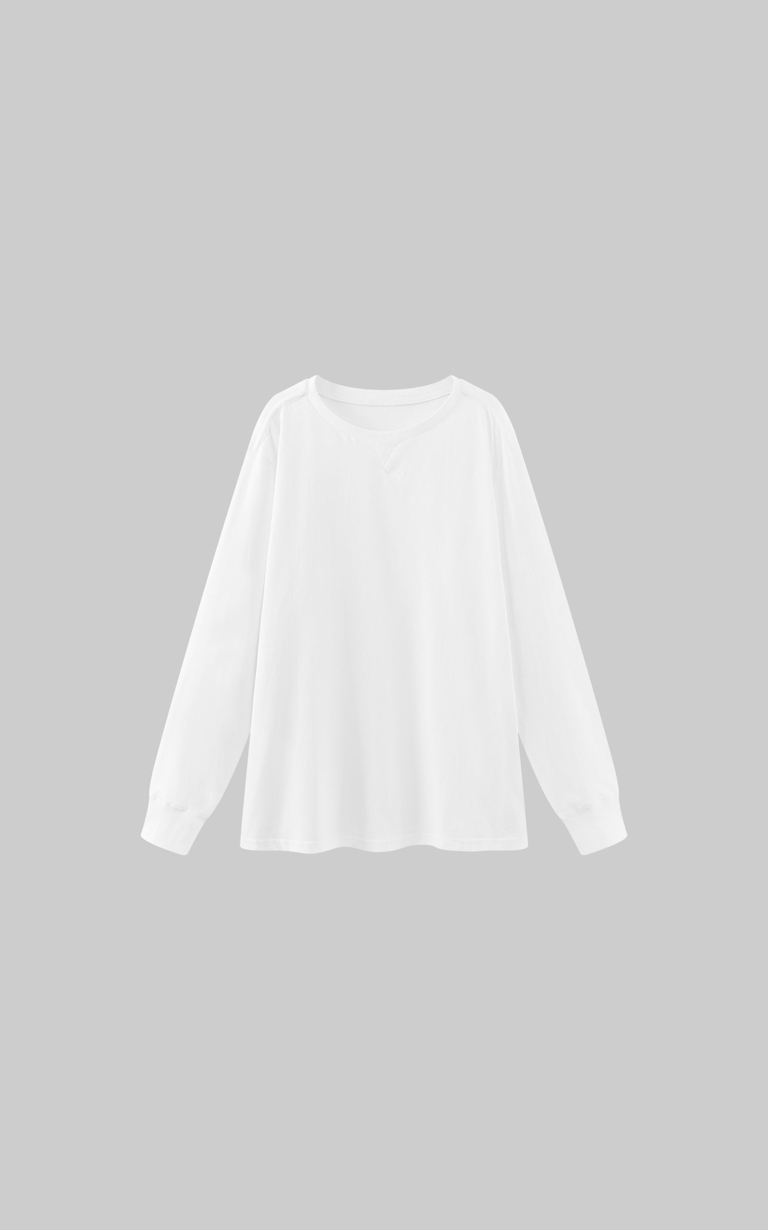 Uno studio in forma minimale e struttura rilassata. Realizzata in morbido cotone ad alta densità, questa maglietta a maniche lunghe cade con eleganza mantenendo una silhouette nitida. Il sottile inserto a V nel collo aggiunge una distinzione silenziosa al classico taglio girocollo, completato da spalle cadenti e polsini a coste per un effetto vissuto. Perfetta per essere stratificata o indossata da sola, trasmette una fiducia discreta con una sensibilità moderna da streetwear.
