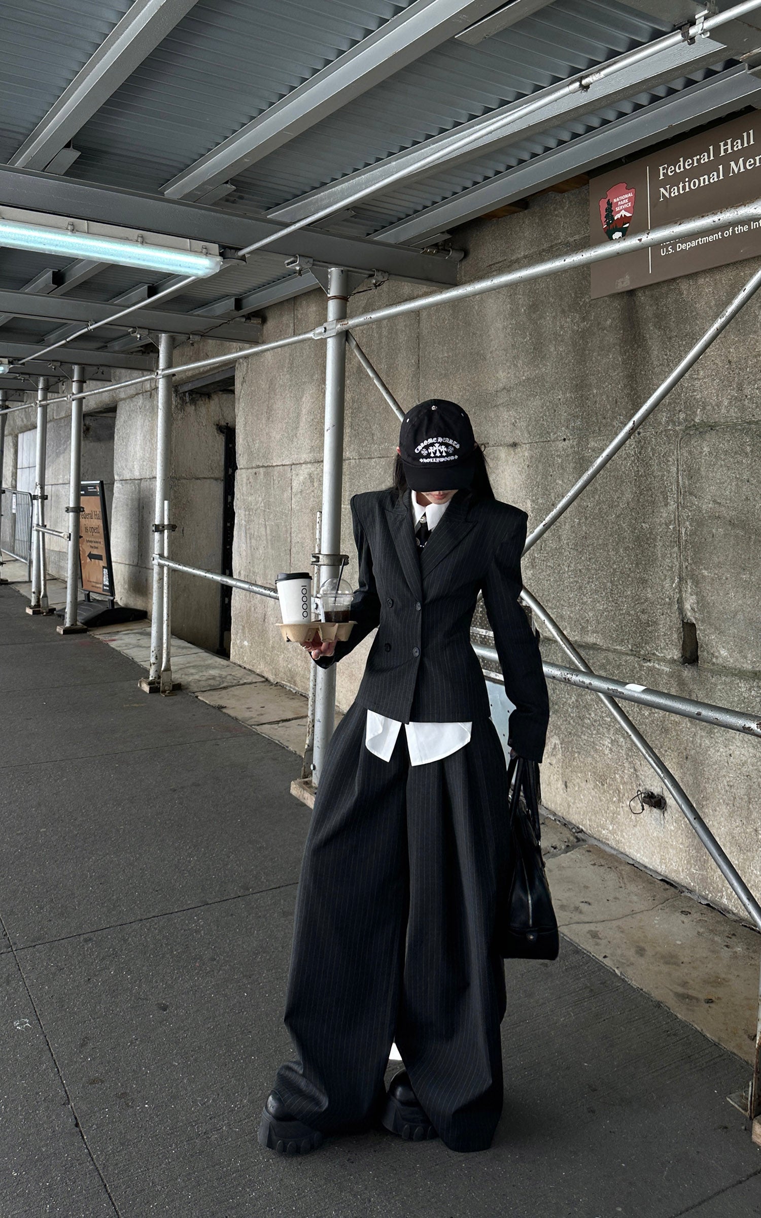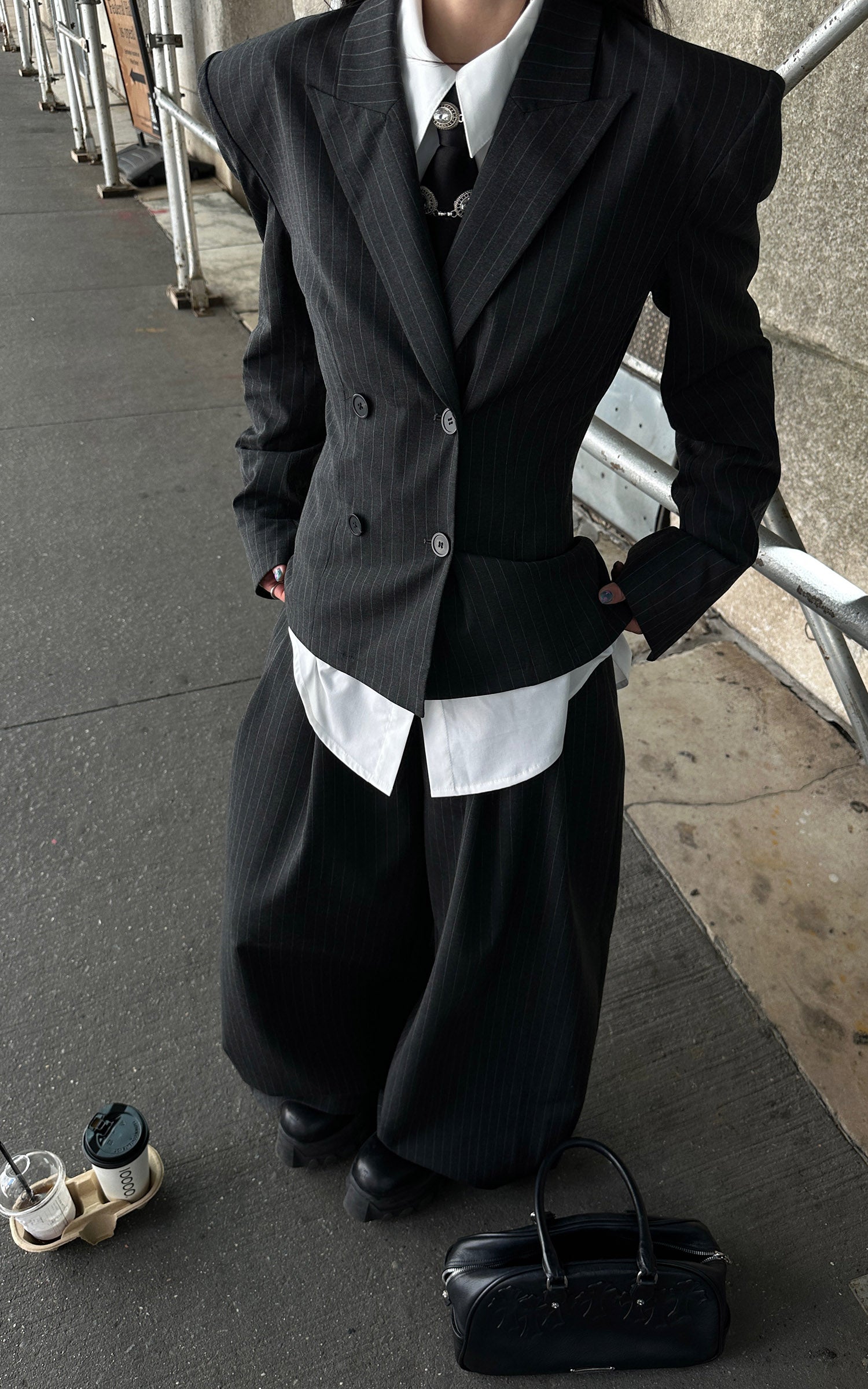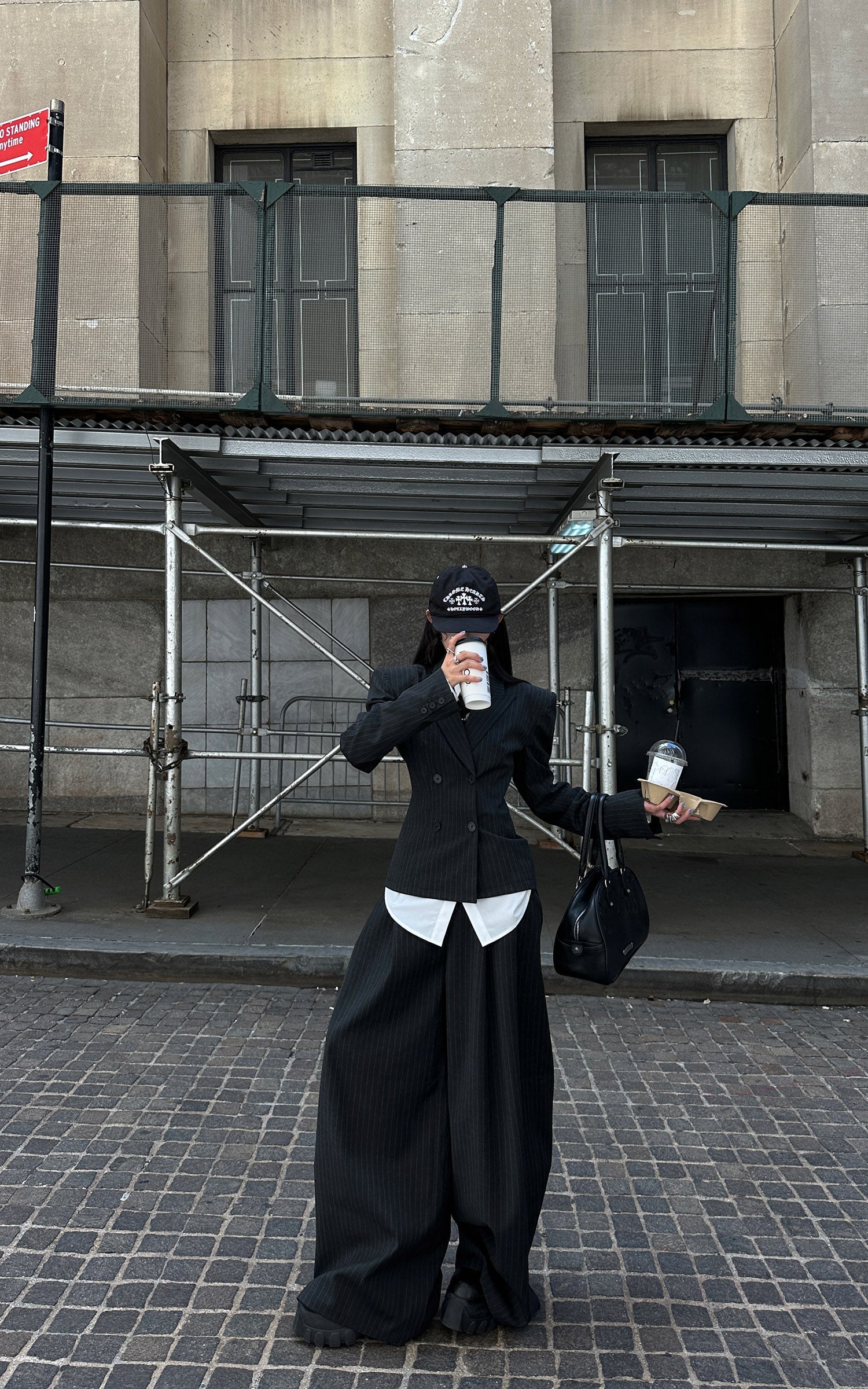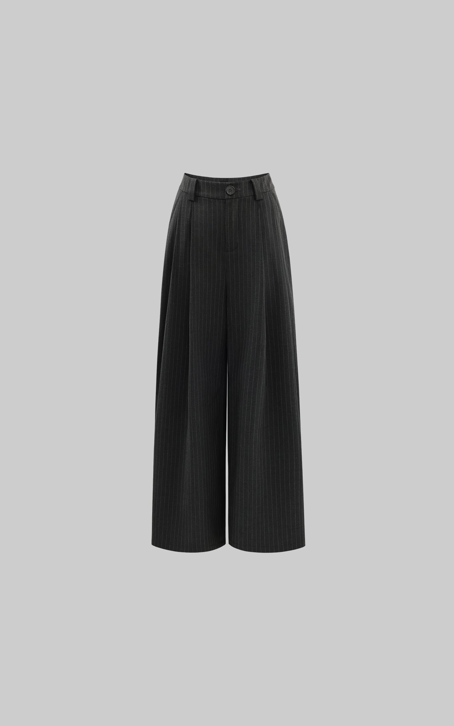 Il taglio rilassato incontra un atteggiamento deciso in questi pantaloni a gamba larga. Realizzati con una vita alta e un volume esagerato, il tessuto a righe sottili trasmette sia autorità che disinvoltura. La silhouette strutturata offre movimento con un tocco di audacia, mentre i dettagli sottili aggiungono un senso di decostruzione. Indossali come un completo con una giacca o da soli: in entrambi i casi, parlano con proporzioni audaci.