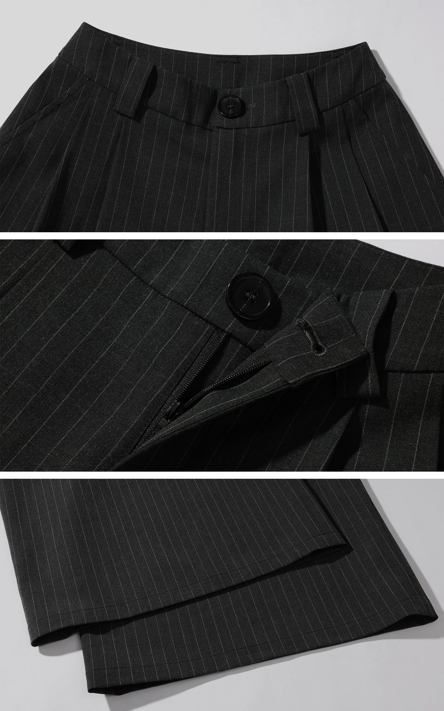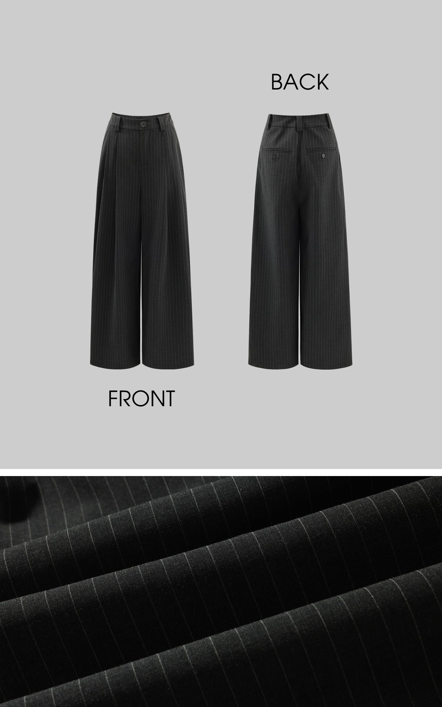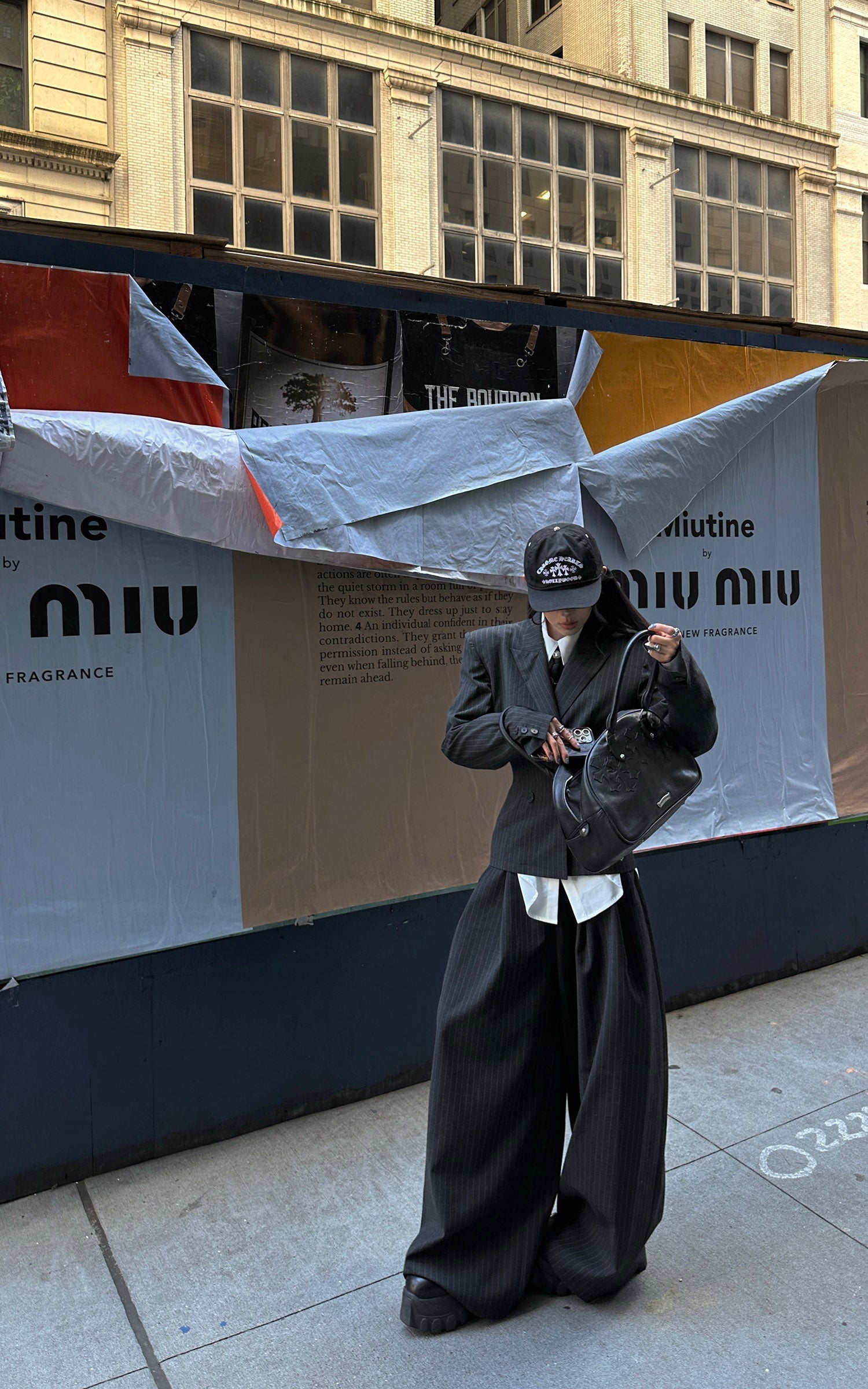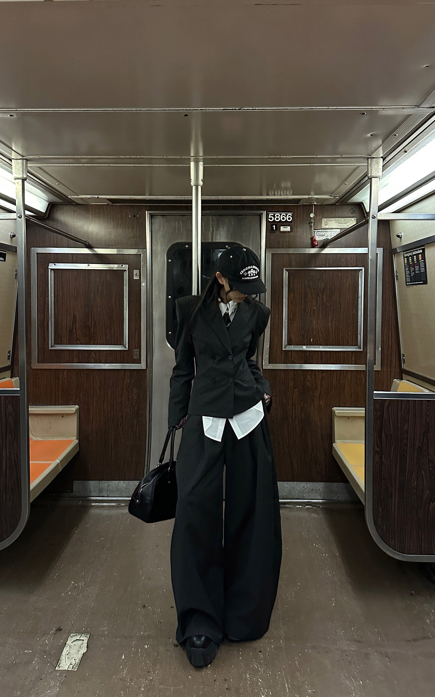 Il taglio rilassato incontra un atteggiamento deciso in questi pantaloni a gamba larga. Realizzati con una vita alta e un volume esagerato, il tessuto a righe sottili trasmette sia autorità che disinvoltura. La silhouette strutturata offre movimento con un tocco di audacia, mentre i dettagli sottili aggiungono un senso di decostruzione. Indossali come un completo con una giacca o da soli: in entrambi i casi, parlano con proporzioni audaci.