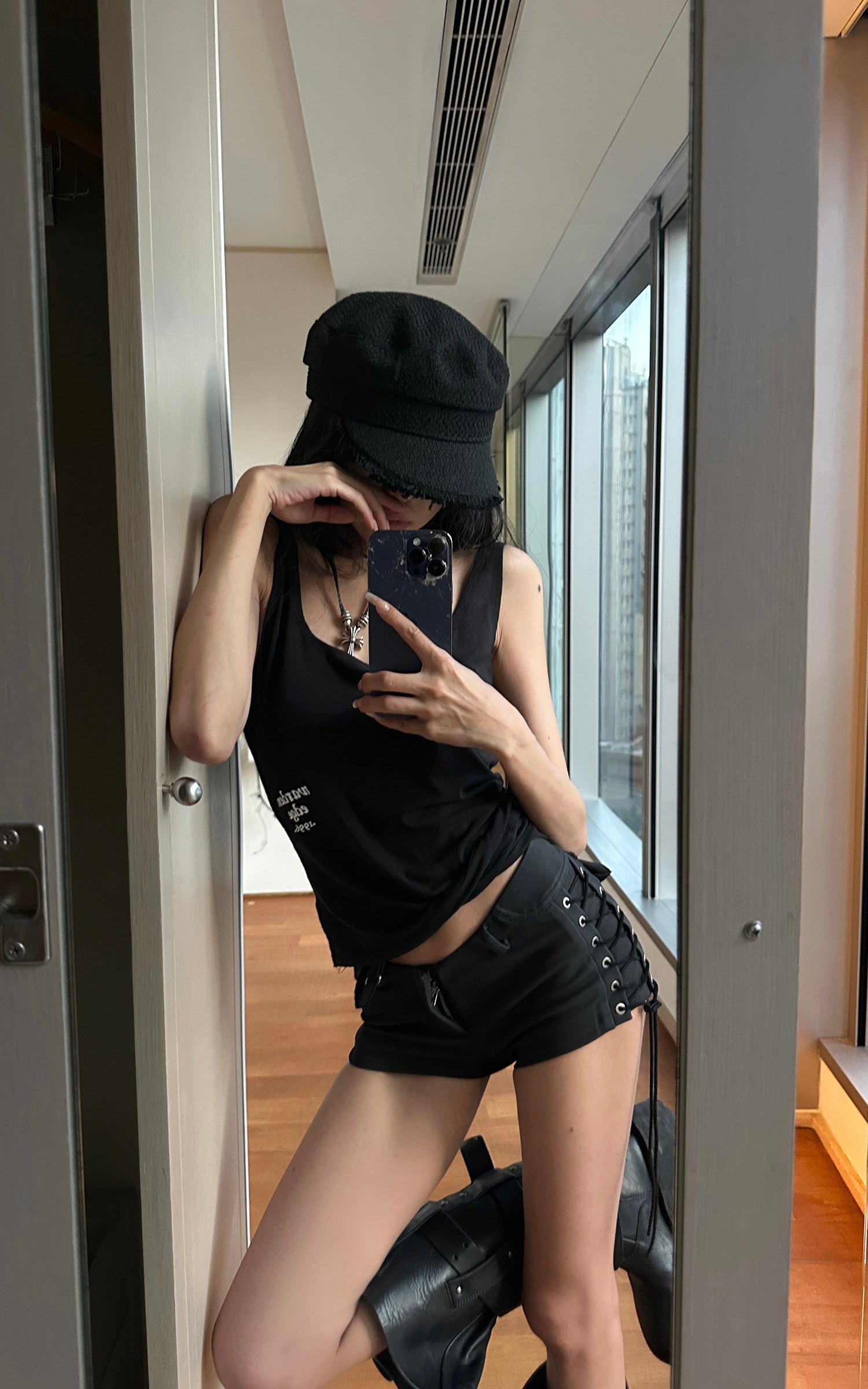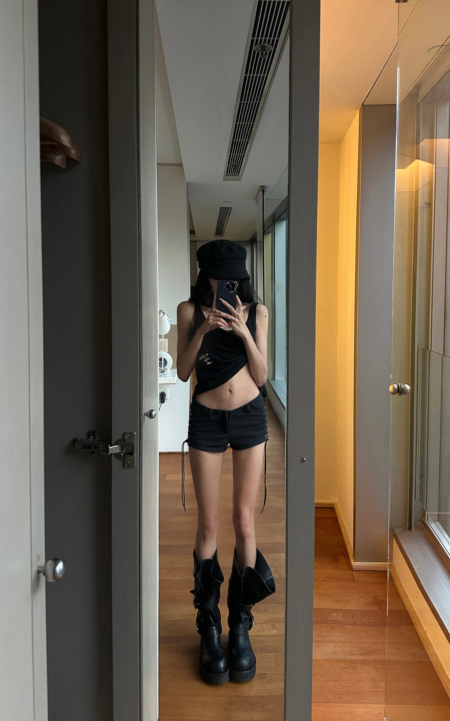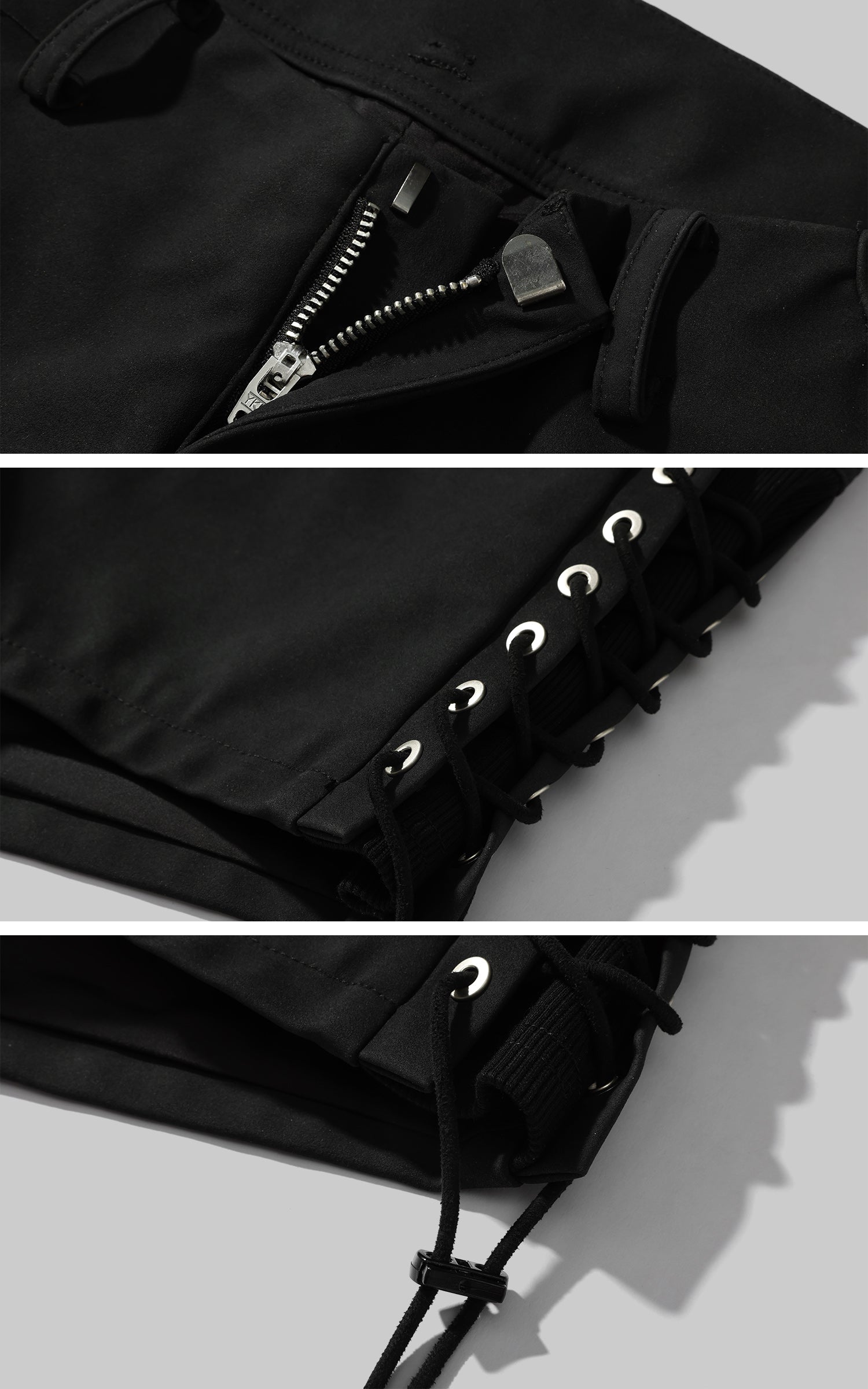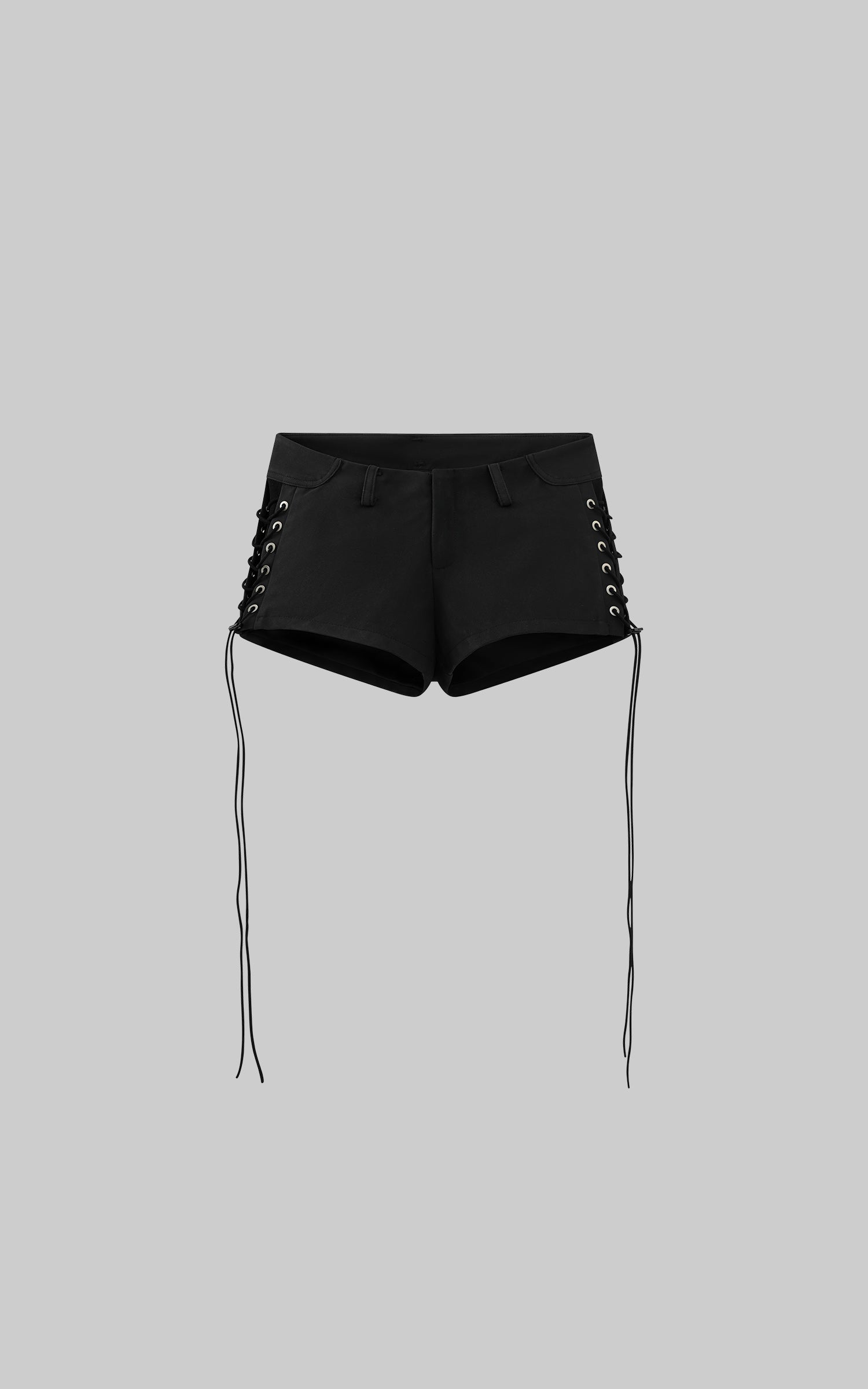 Un'audace interpretazione di funzione e forma. Questi pantaloncini a vita bassa presentano dettagli con lacci su entrambi i lati, coulisse esagerate che superano l'orlo e una cintura strutturata con passanti. La chiusura a zip nascosta e le cuciture rinforzate lo mantengono stabile. Un capo base utilitaristico progettato per creare silhouette dirompenti, da abbinare con energia senza compromessi.