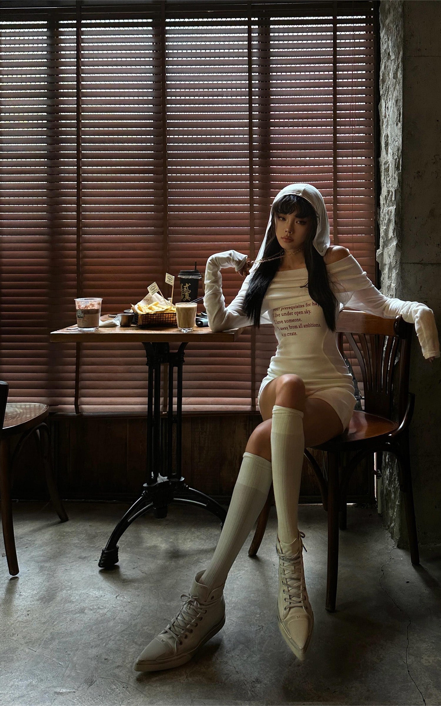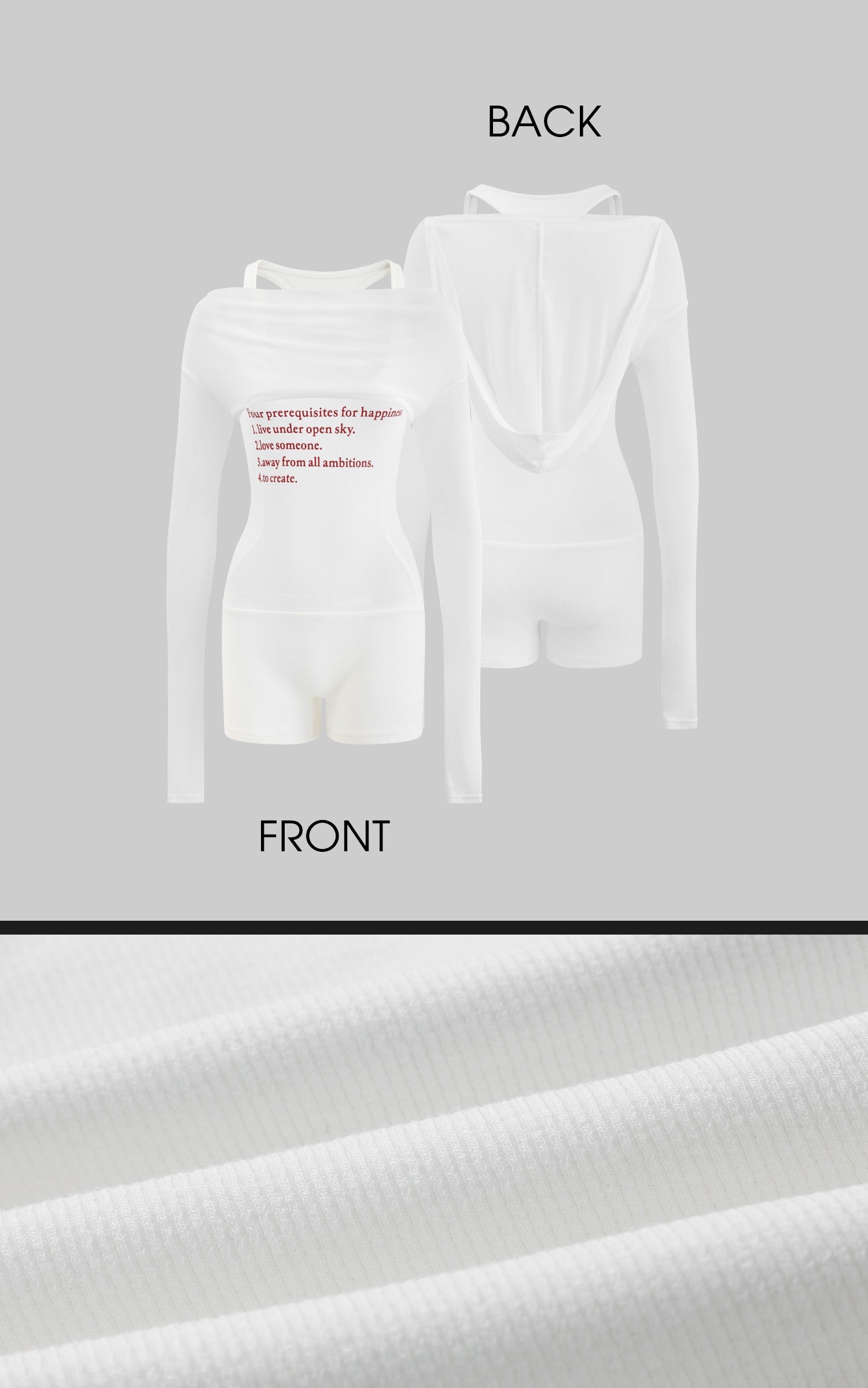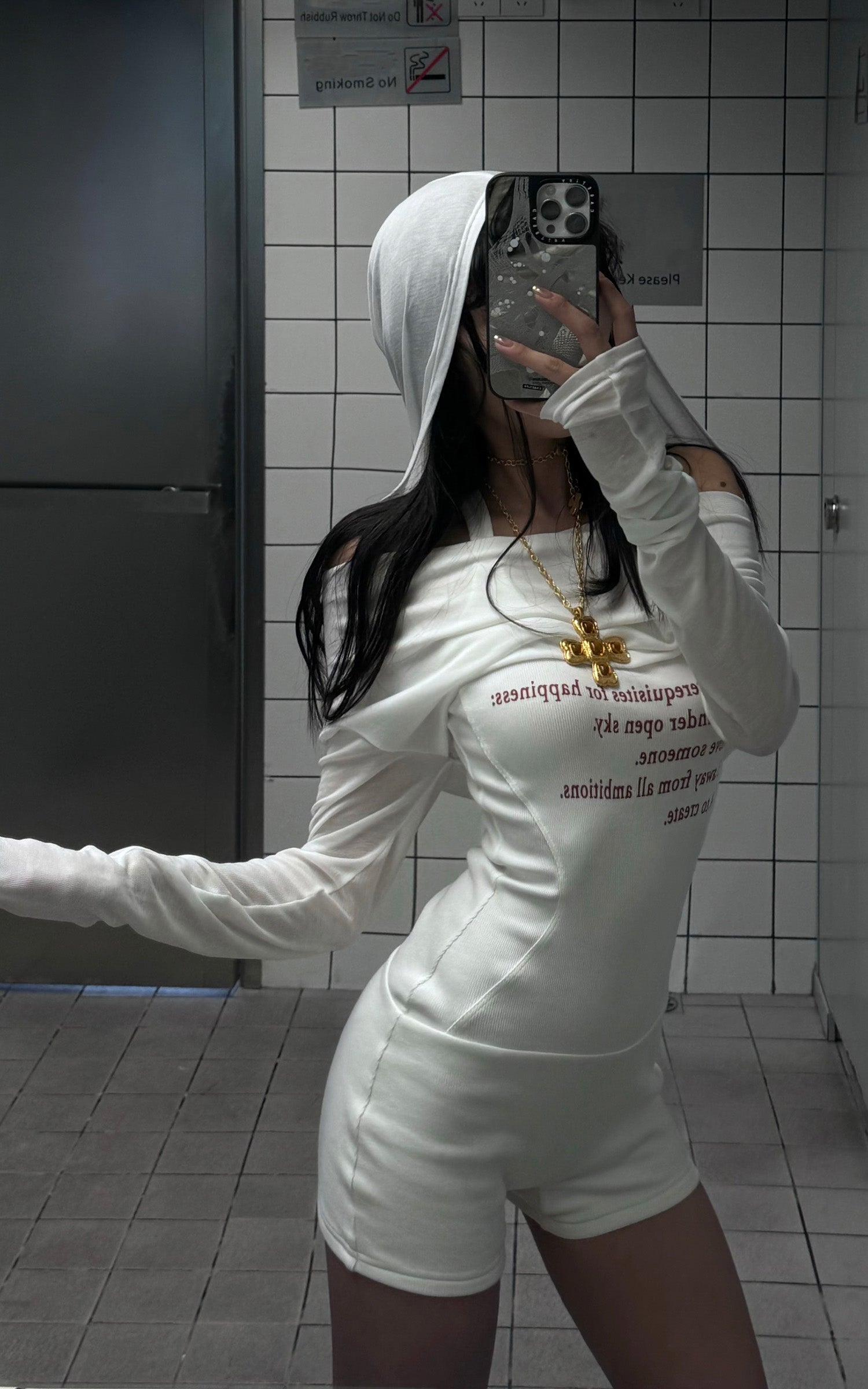 A dynamic two-piece set featuring a form-fitting bodysuit and an off-shoulder knit hoodie. The set offers a layered look with slim-fitting comfort, perfect for a minimalist, yet fashion-forward approach to streetwear. Mix and match for endless styling options.