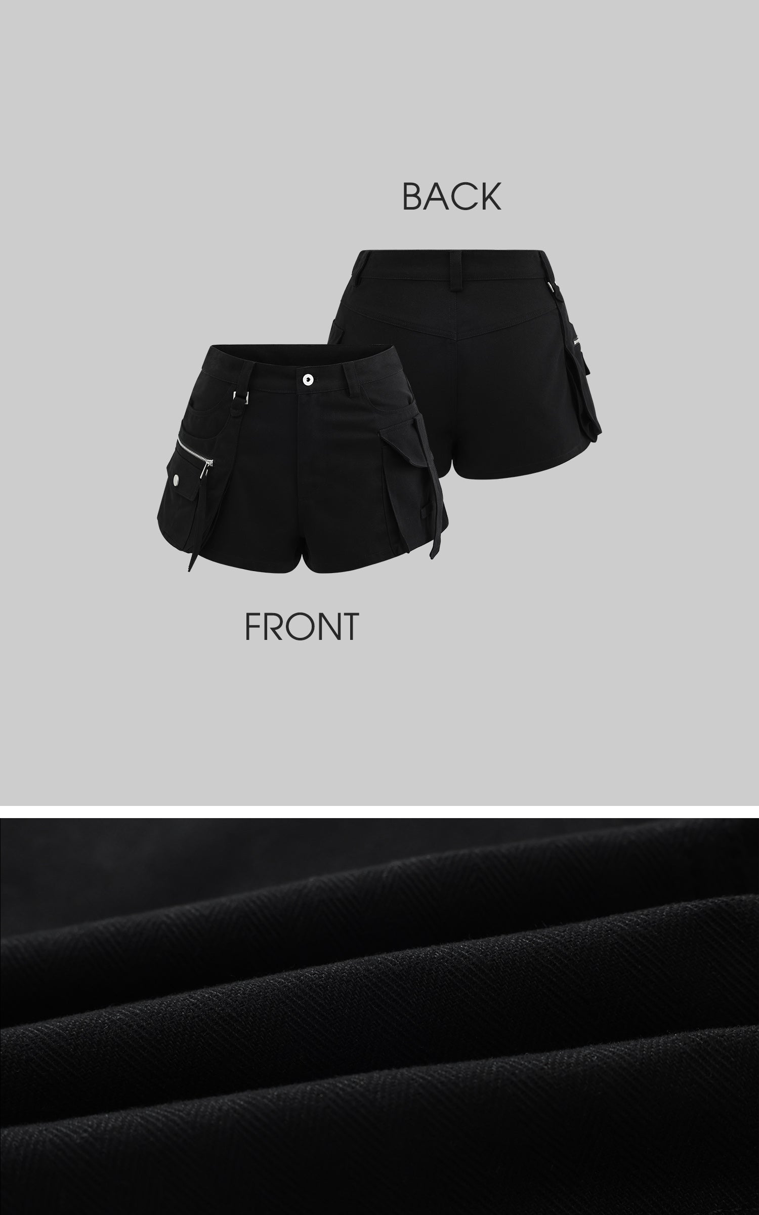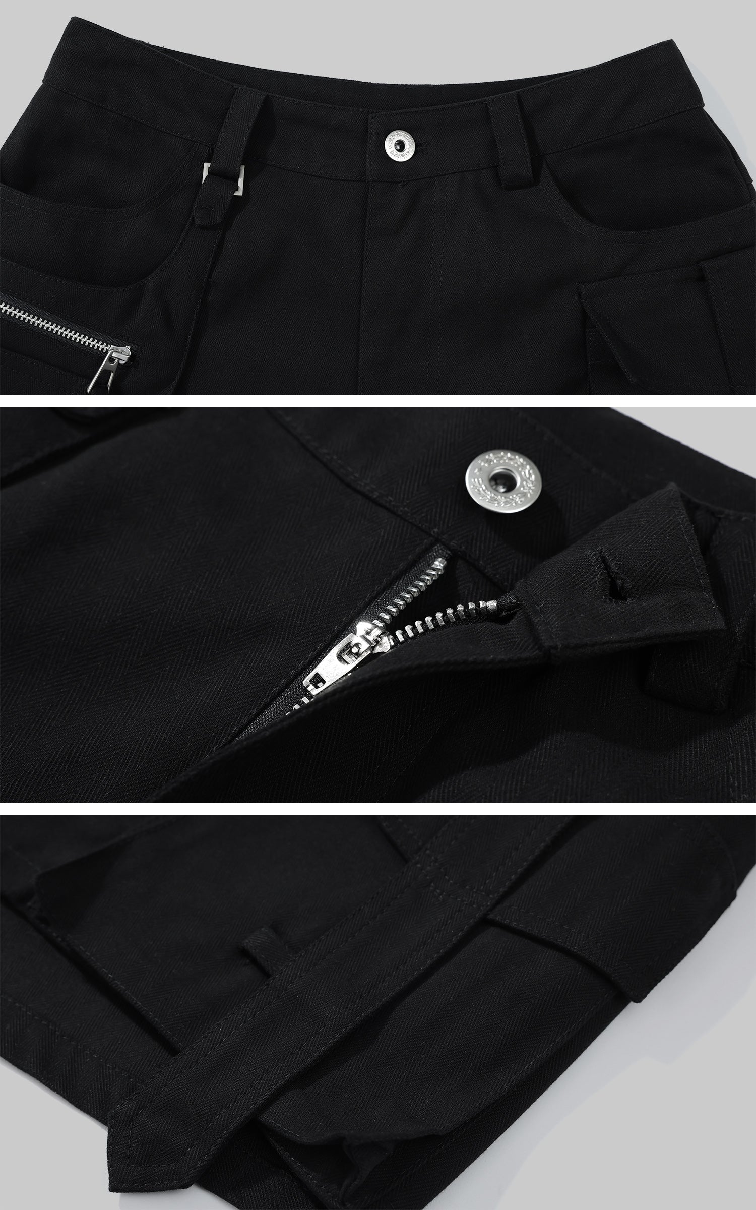 Una fusione di estetica ispirata al mondo militare e praticità pronta per la strada, questi pantaloncini cargo utility ridefiniscono gli essenziali quotidiani. Caratterizzati da una silhouette strutturata con posizionamenti asimmetrici delle tasche, offrono sia funzionalità che un tocco di audacia. Il tessuto intrecciato resistente assicura una vestibilità impeccabile, mentre l'hardware in tonalità argento e le cinghie esagerate aggiungono un tocco di robustezza industriale. Progettati per chi si muove con intenzione—indossali a vita alta con un corsetto elegante o oversize con una felpa ampia.