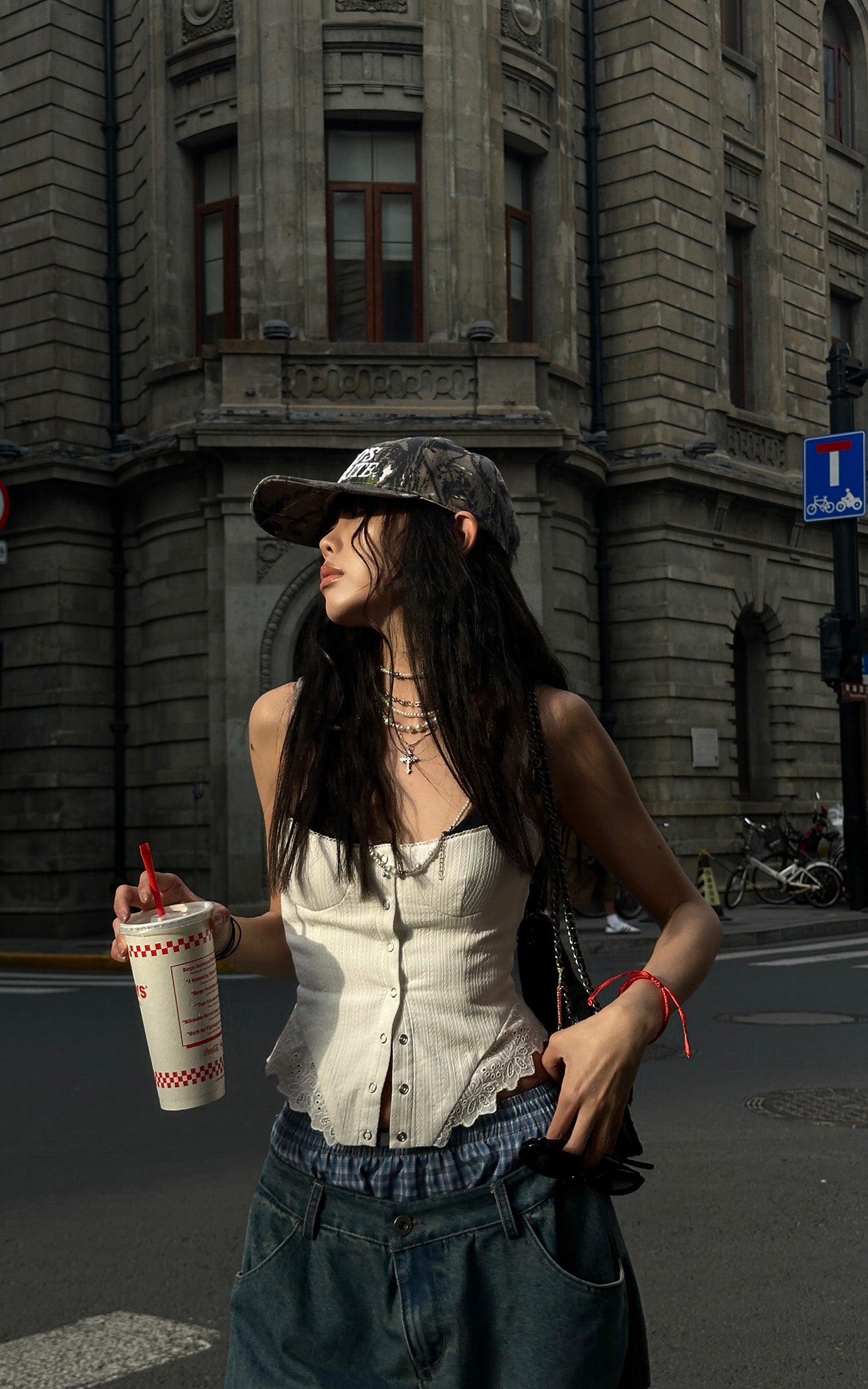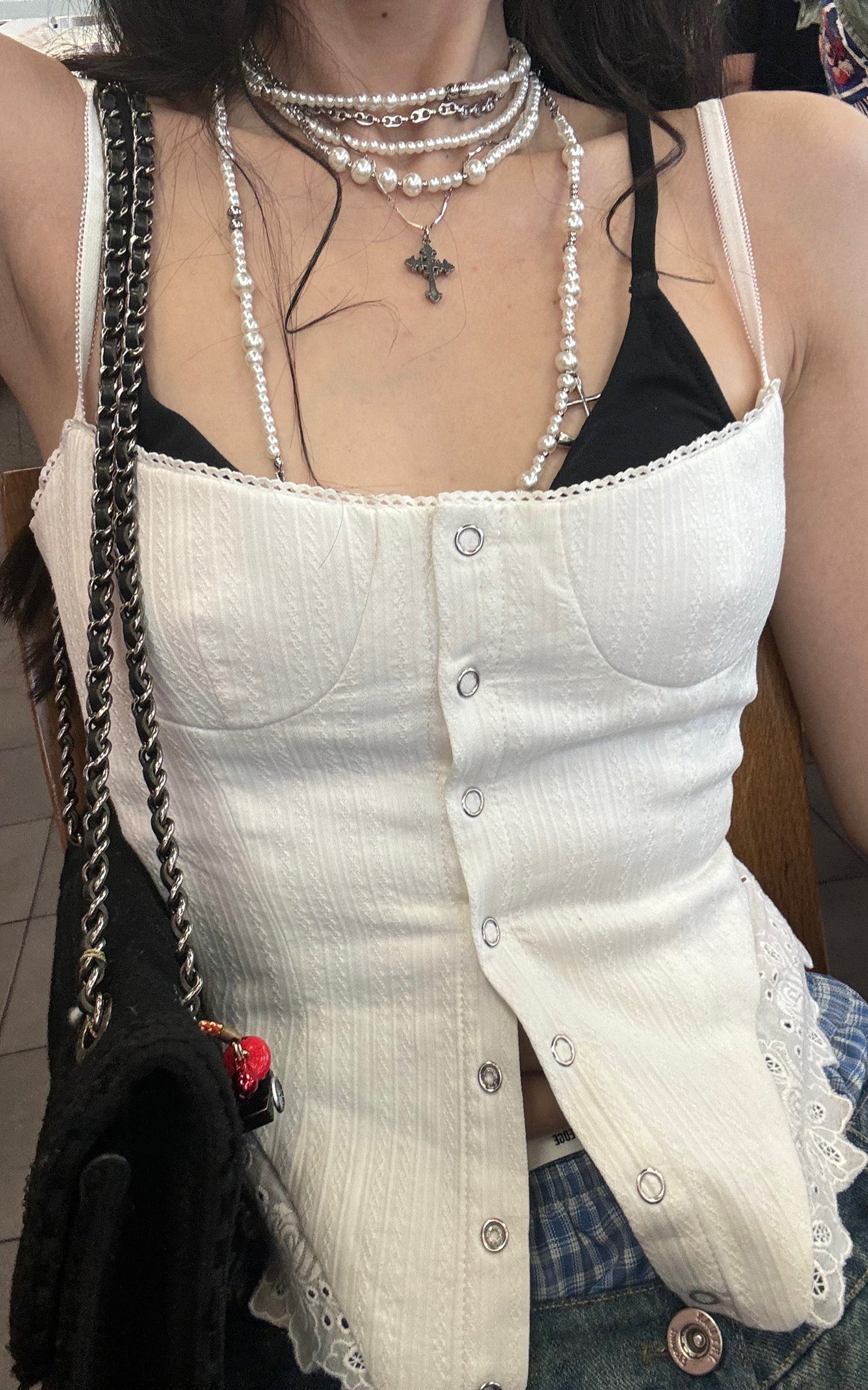 Questo top a corsetto strutturato combina un taglio sartoriale deciso con delicati dettagli in pizzo per un look streetwear elevato senza sforzo. Caratterizzato da una parte anteriore con bottoni e spalline regolabili, il suo design aderente scolpisce la silhouette mantenendo un tocco di audacia. L'orlo rifinito in pizzo aggiunge un tocco di femminilità, perfetto da abbinare a denim oversize o da stratificare sotto una giacca aperta per un ensemble che fa dichiarazione. Audace ma raffinato, è il pezzo definitivo per chi abbraccia lo stile street moderno con un accenno di sofisticazione.