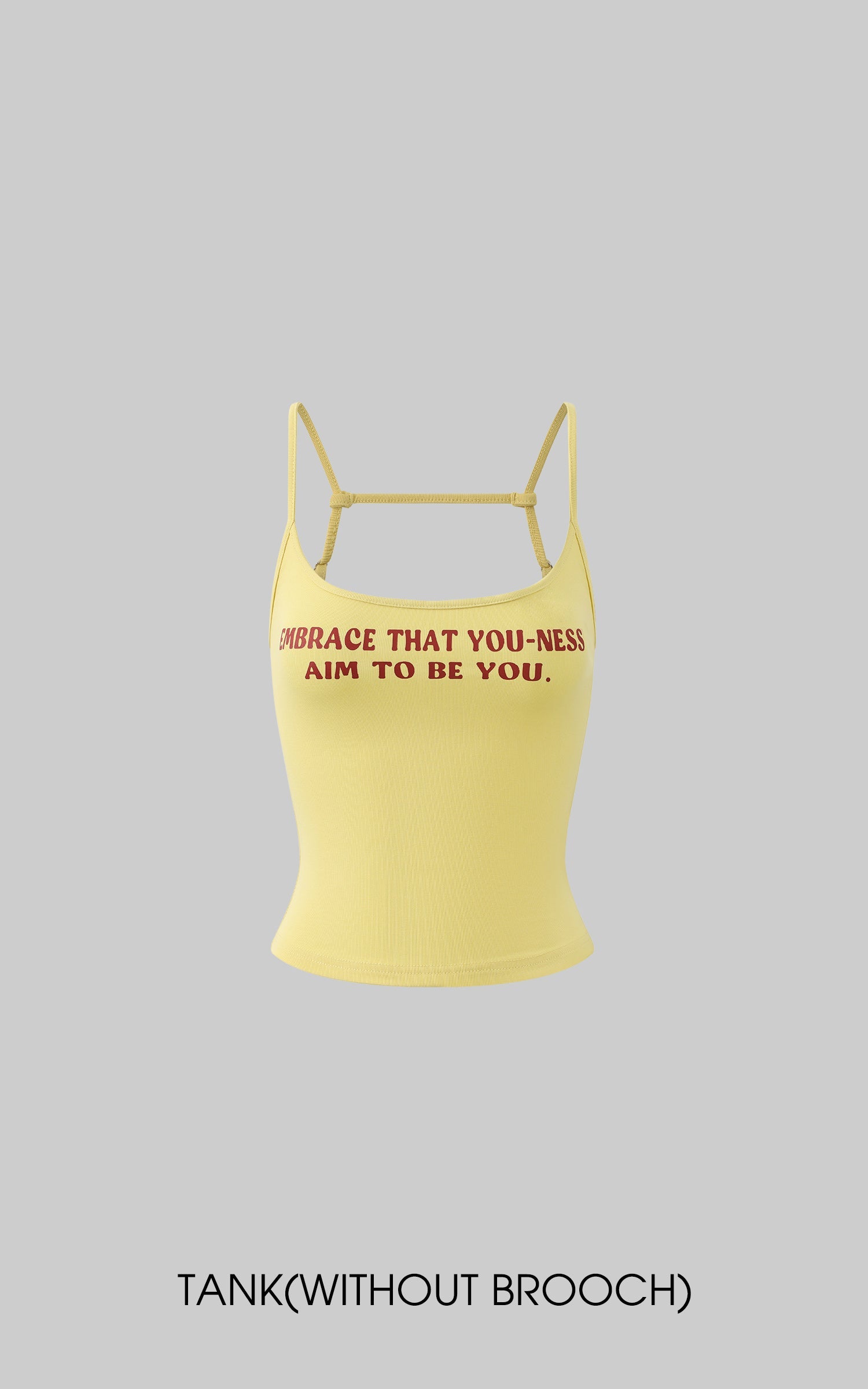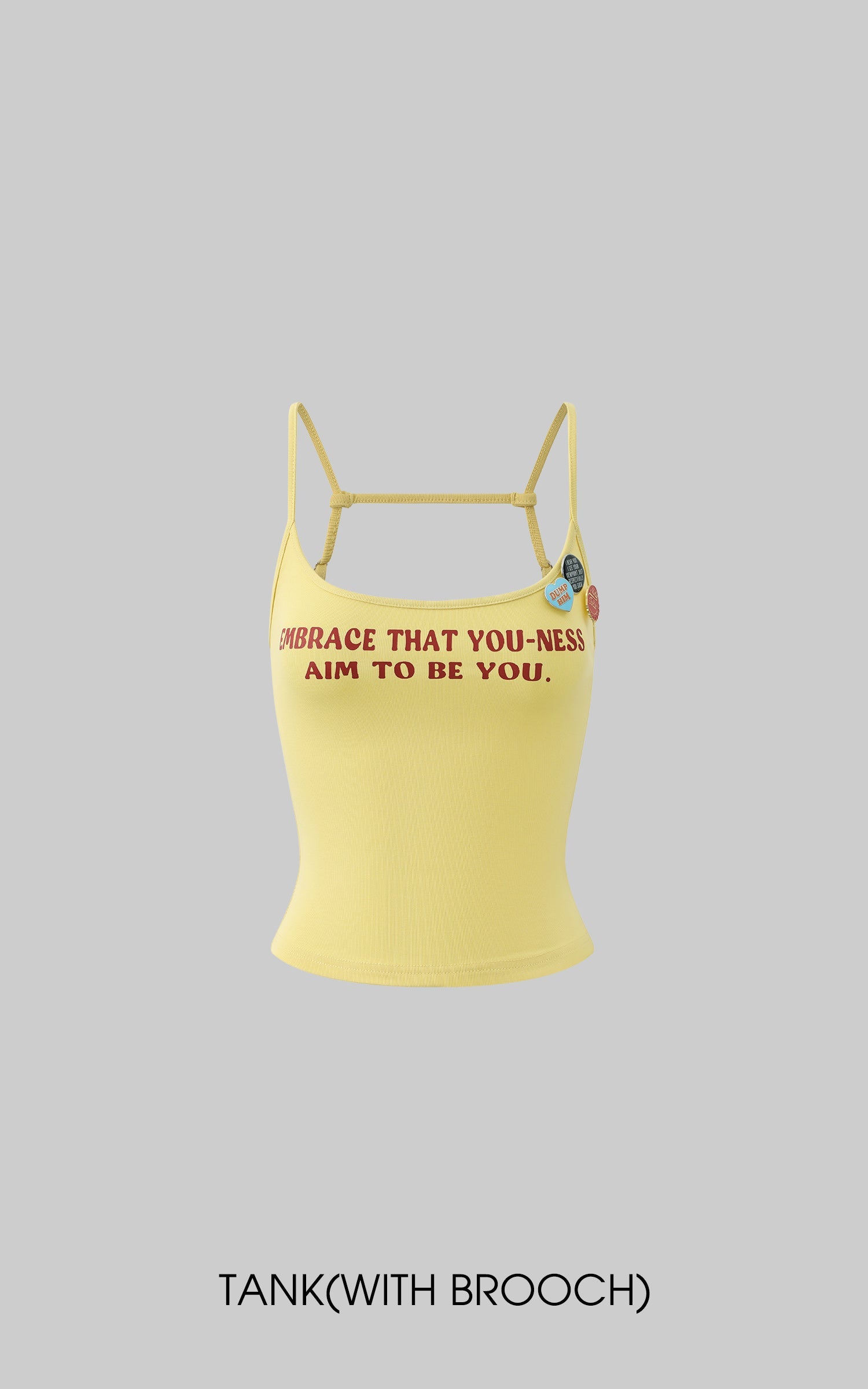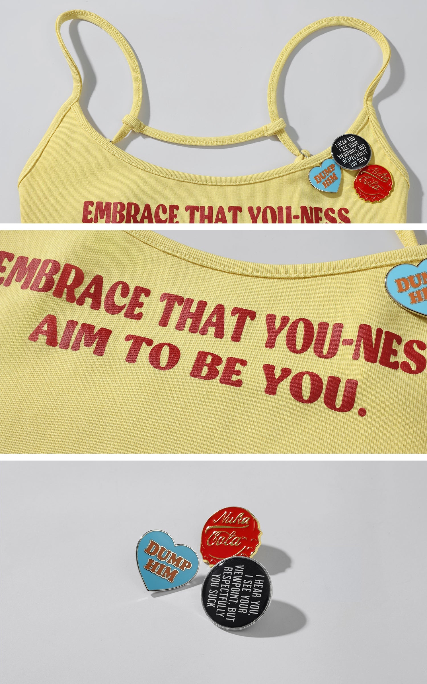 Una canotta corta che la rende personale. Realizzata in morbido cotone a coste elasticizzato, questo capo avvolge il corpo con una sensazione di seconda pelle. L'orlo curvo, il testo frontale d'impatto e le spille smaltate rimovibili offrono un equilibrio tra giocosità e precisione. Abbastanza audace da indossare da sola, abbastanza minimalista da essere stratificata — non è solo un top, è un messaggio.