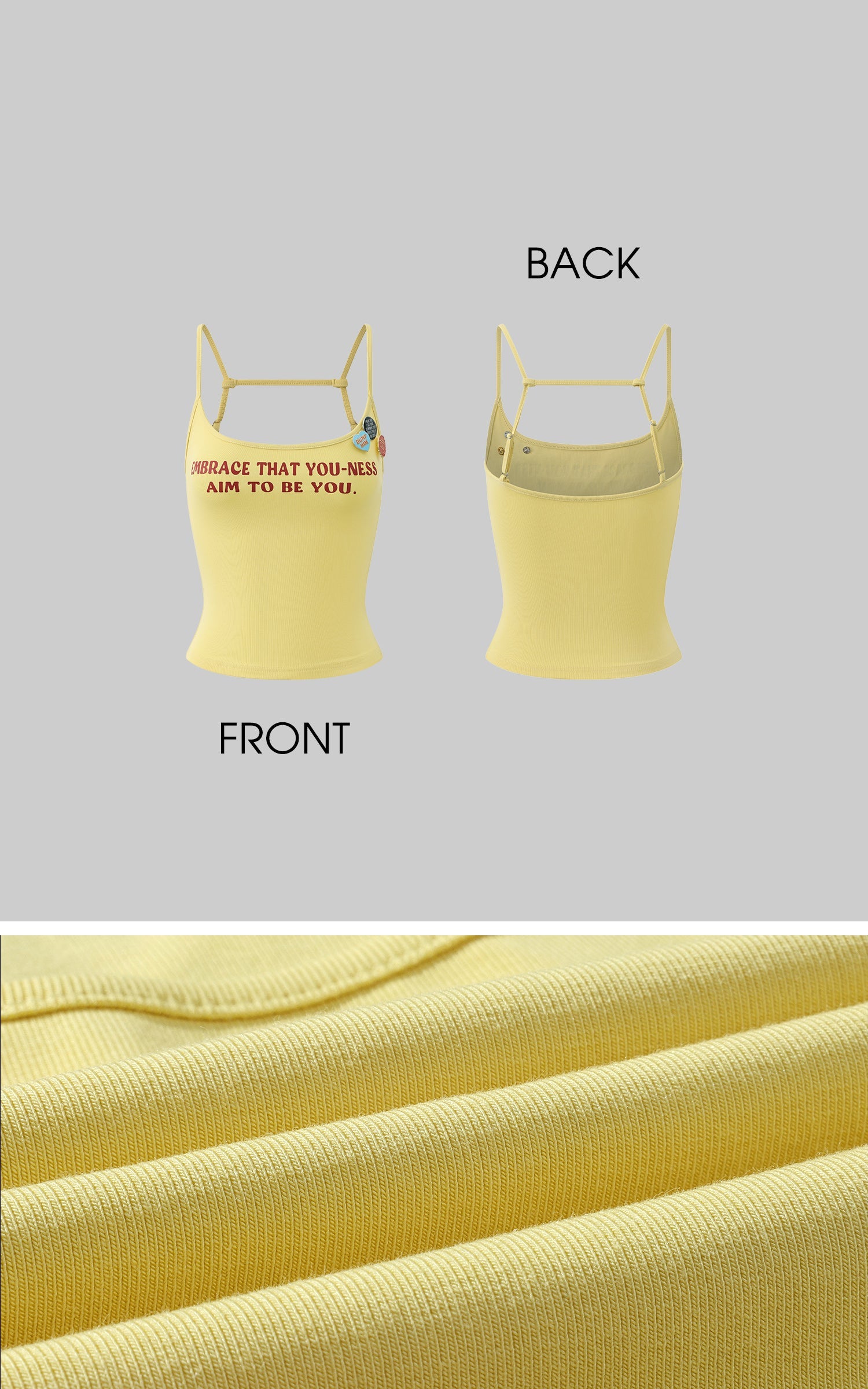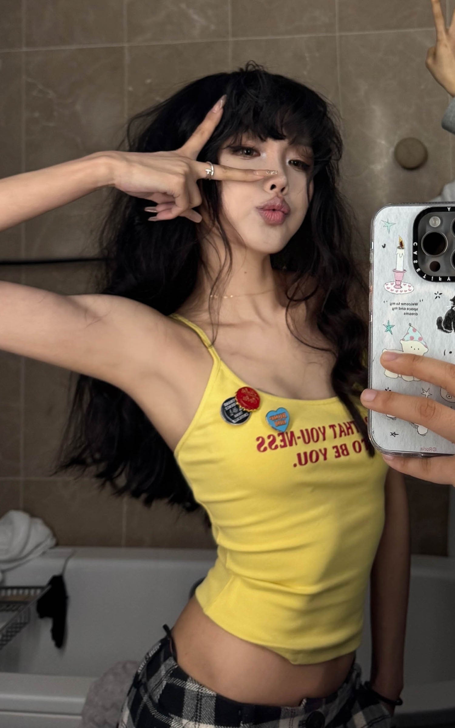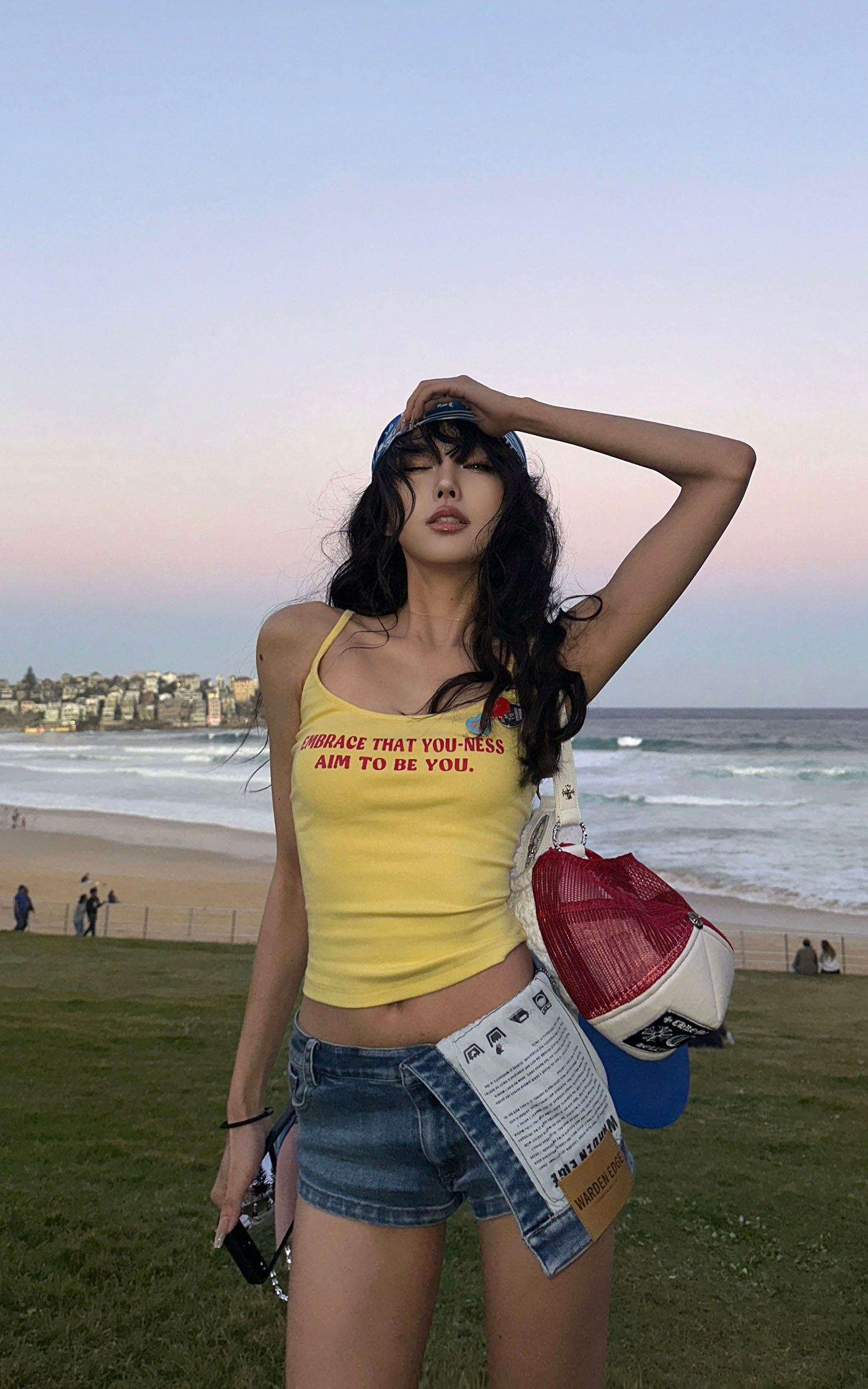 Una canotta corta che la rende personale. Realizzata in morbido cotone a coste elasticizzato, questo capo avvolge il corpo con una sensazione di seconda pelle. L'orlo curvo, il testo frontale d'impatto e le spille smaltate rimovibili offrono un equilibrio tra giocosità e precisione. Abbastanza audace da indossare da sola, abbastanza minimalista da essere stratificata — non è solo un top, è un messaggio.