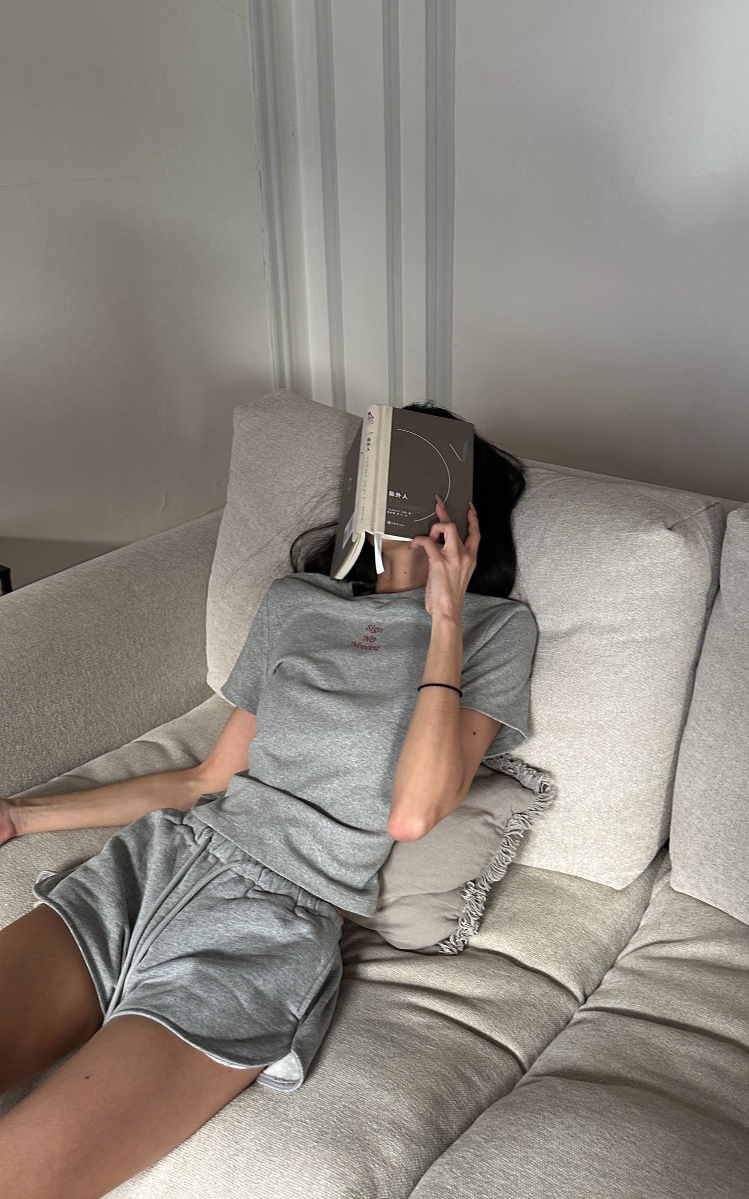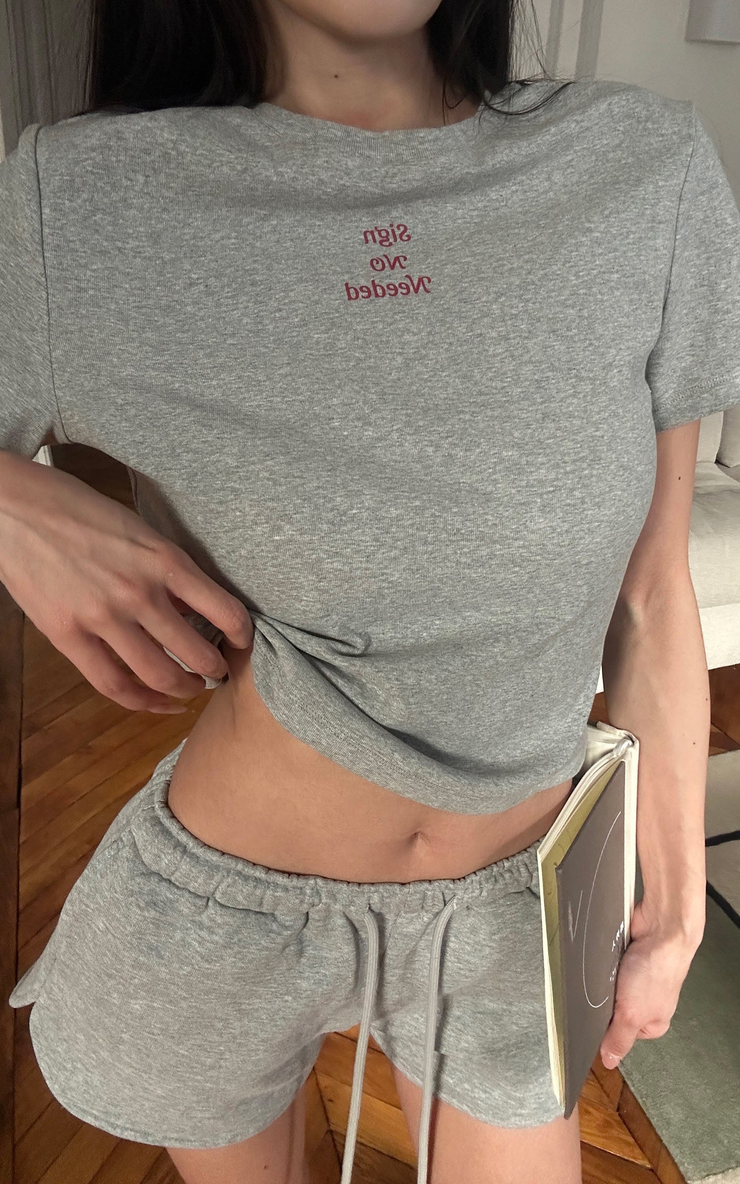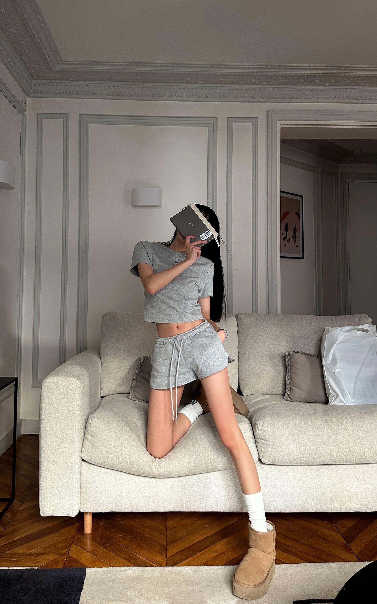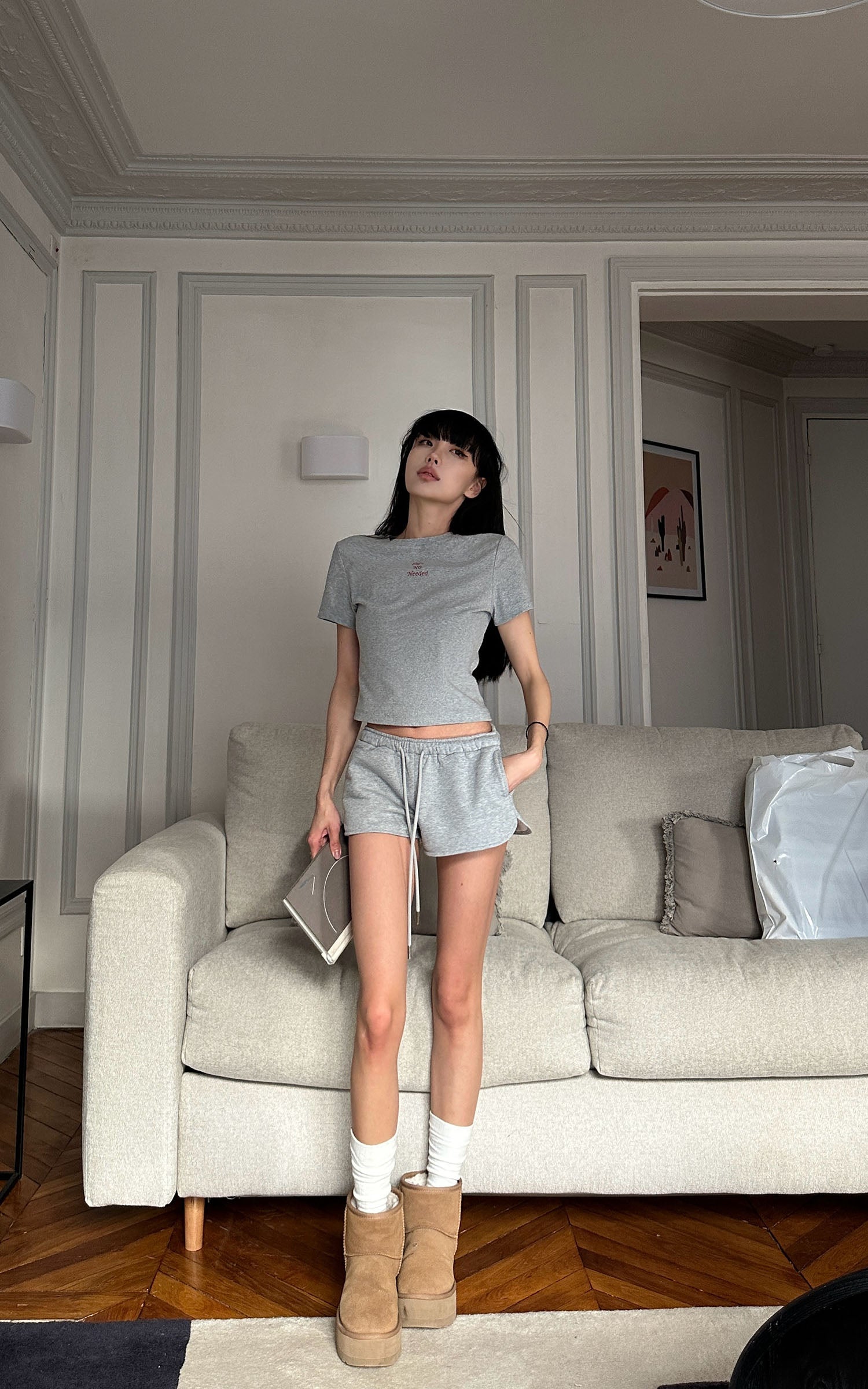 Simplicity, stripped bare. This minimalist lounge set pares down to pure form: a cropped short-sleeve tee and relaxed drawstring shorts, both crafted in a fine ribbed knit that molds softly to the skin.With no logos, no prints, no noise—just refined proportions and muted restraint. The cool grey hue carries an effortless mood, whether you're staying in or stepping out.