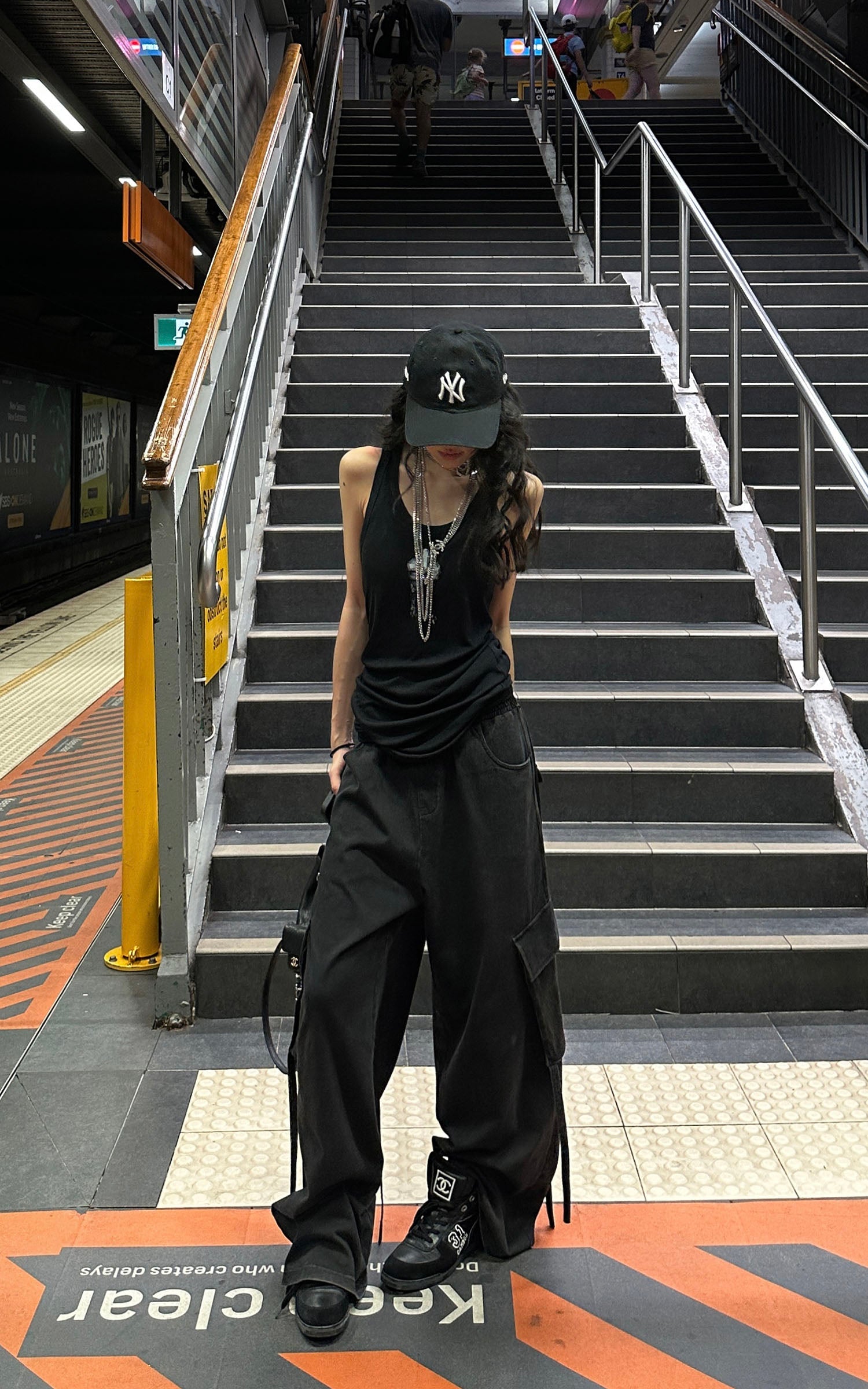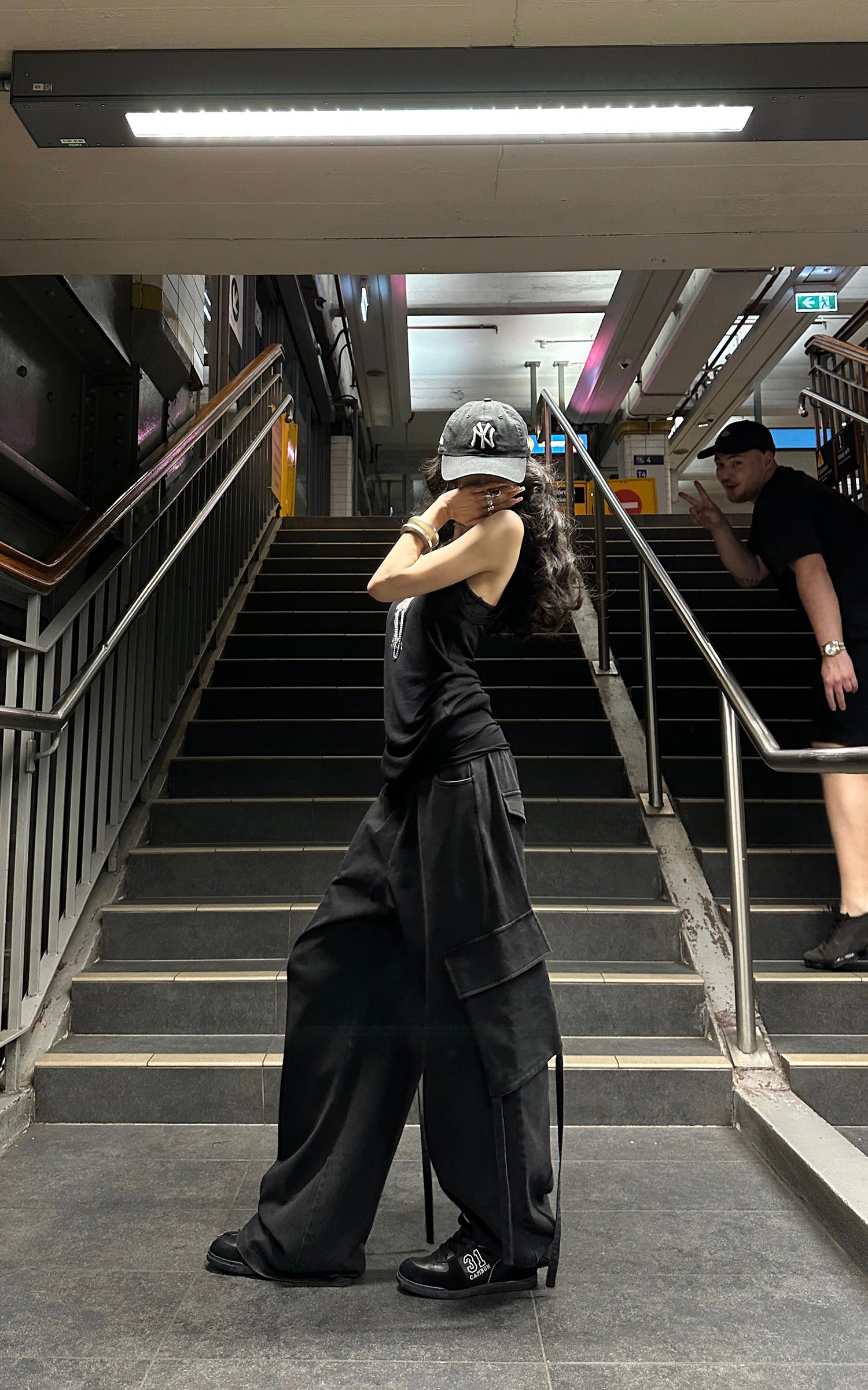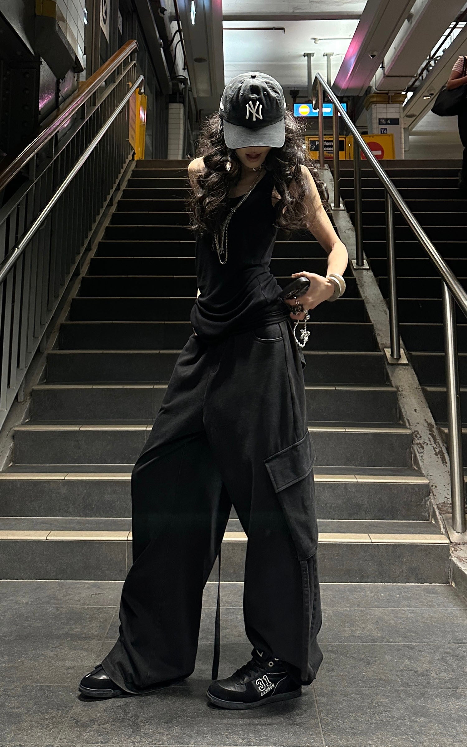 戦術的な定番アイテムを再構築したこれらのブラックカーゴパンツは、構造とゆるさを融合させています。重量感のあるコットンからカットされ、洗いざらしのマットな質感が特徴です。シルエットは、オーバーサイズのボリュームとシャープな構造のバランスを取っています。ストレッチジャージーのリブウエストバンドは期待を裏切り、粗く、洗練され、彫刻的です。サイドフラップポケットには延長されたストラップがあり、ユーティリティコードを反映しつつ動きを誇張しています。反逆のために作られましたが、今のスタイルに合わせています。