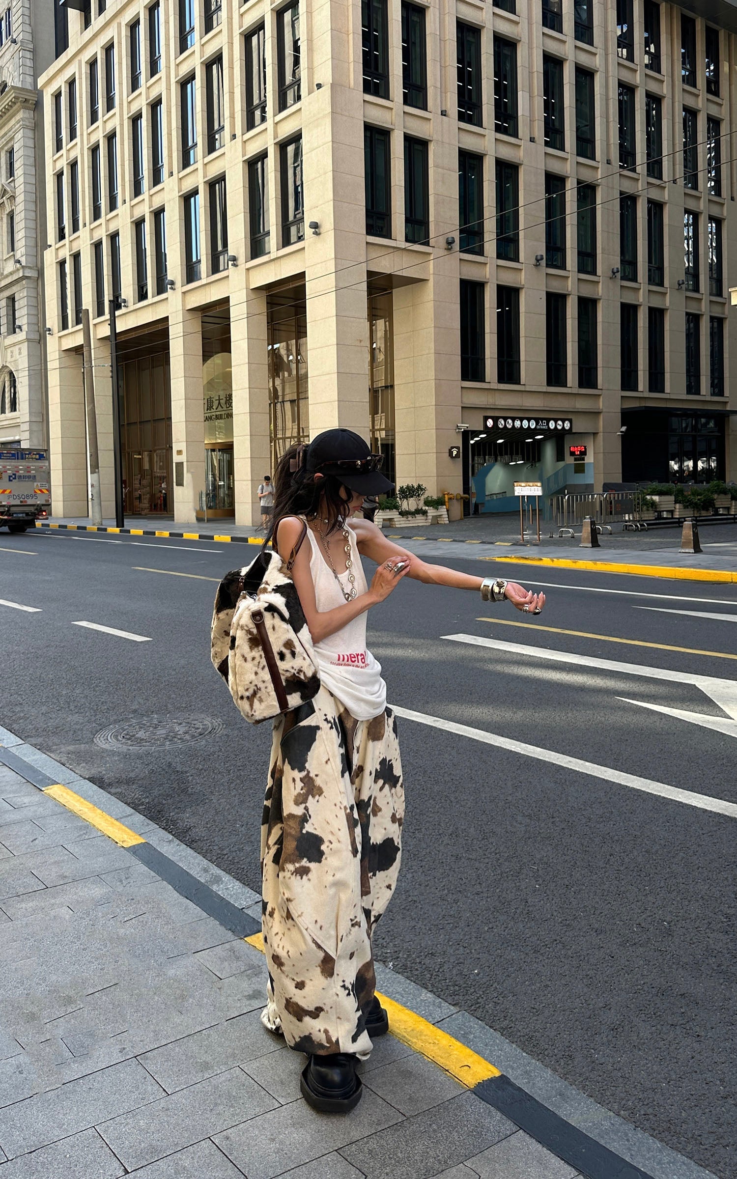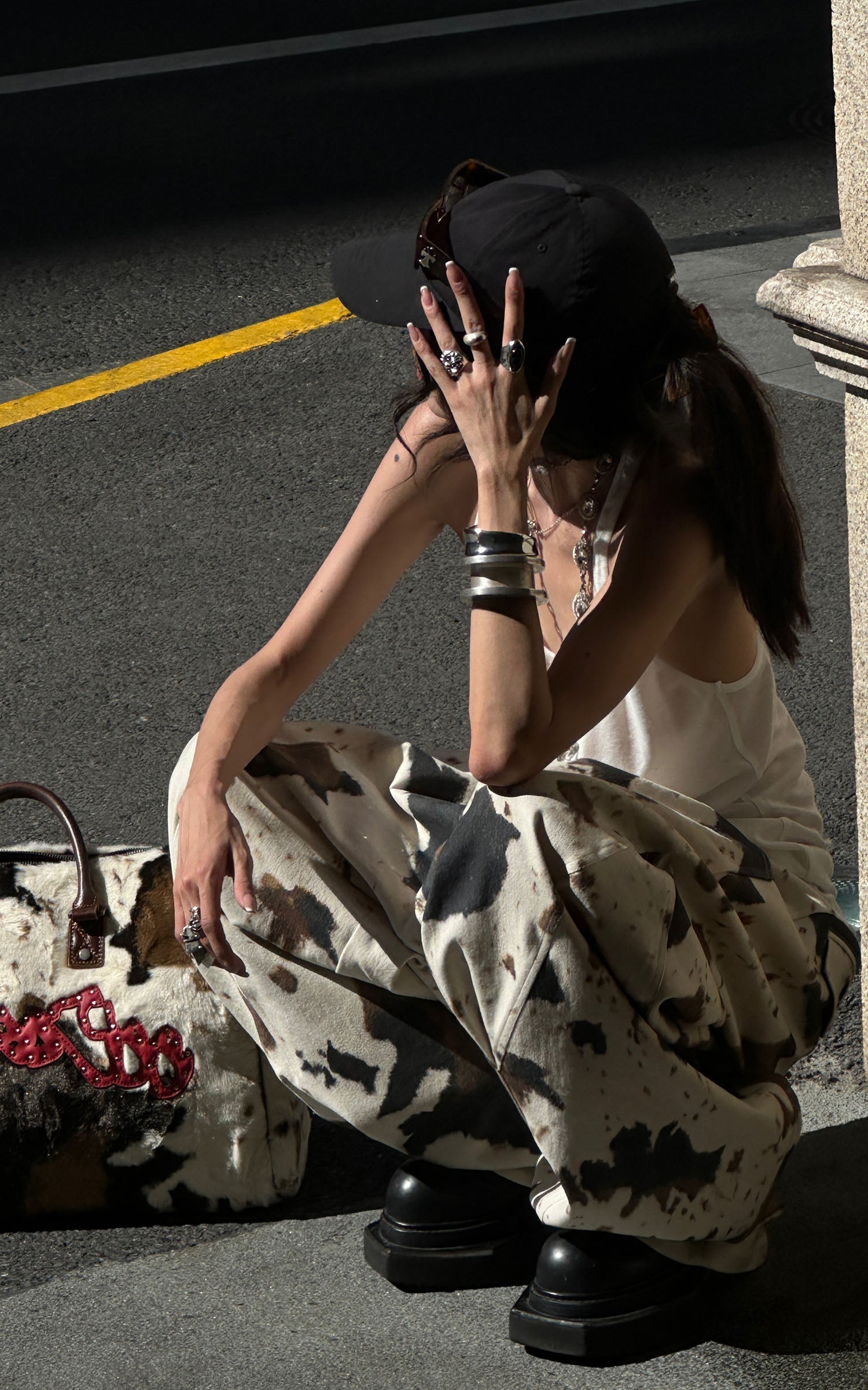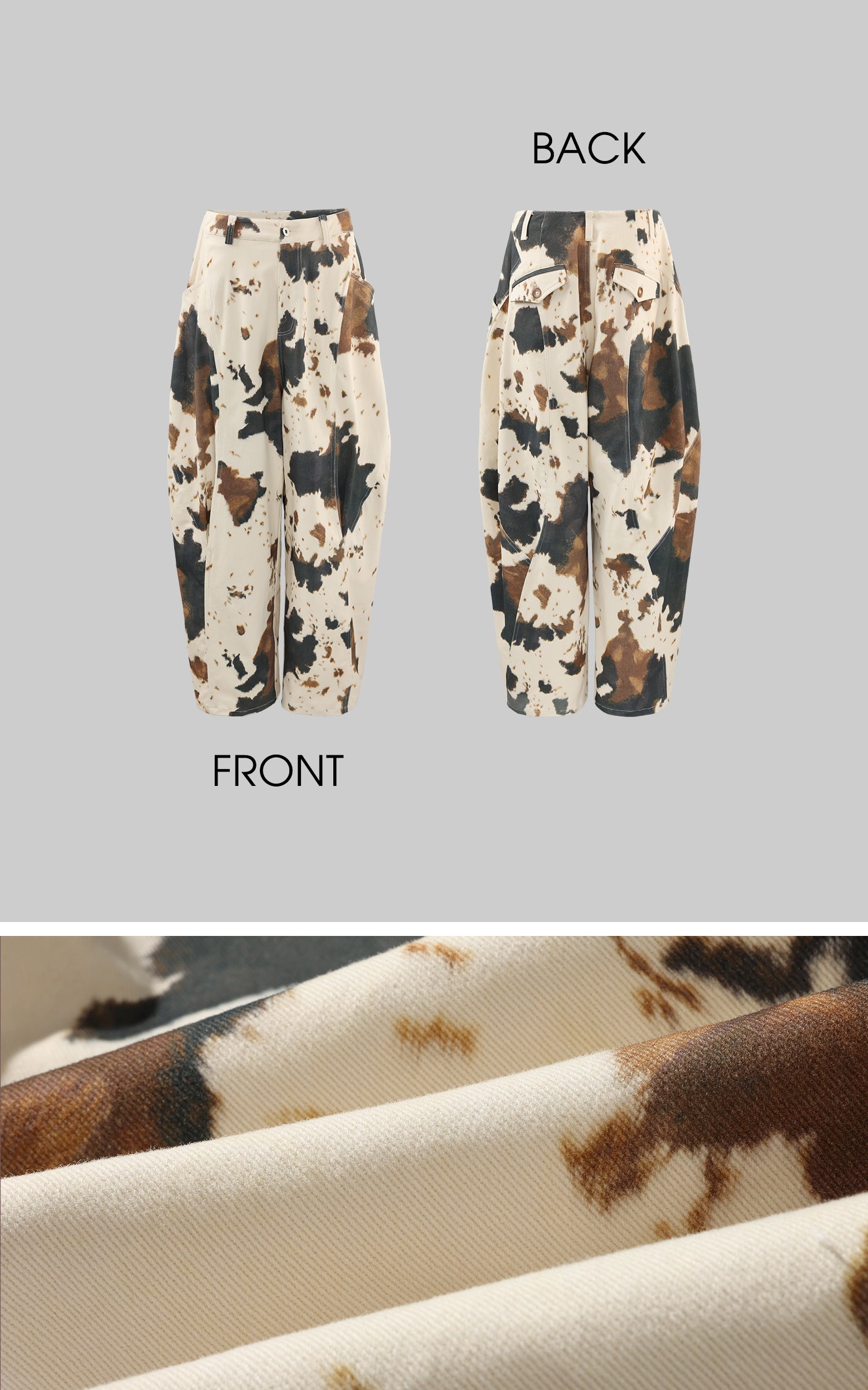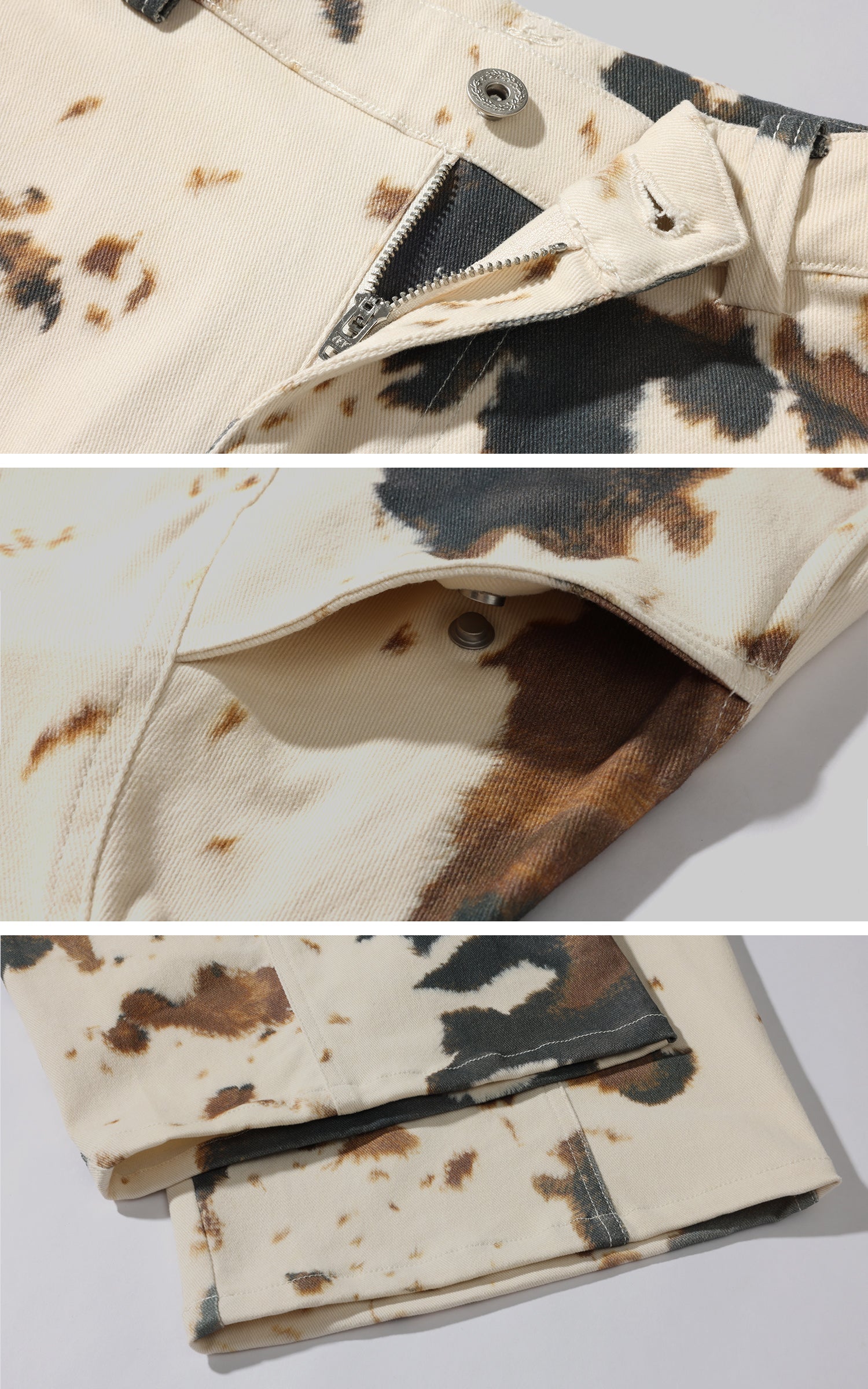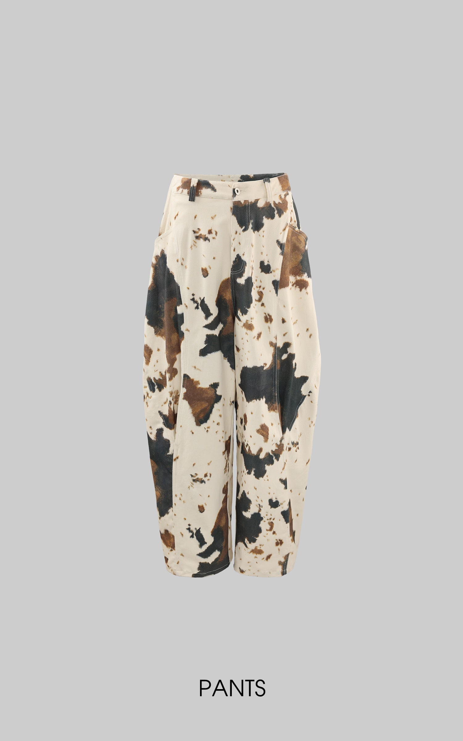 구조적인 면 데님으로 제작된 이 오버사이즈 팬츠는 표백 염색된 소가죽 패턴으로 거친 추상적인 효과를 만들어냅니다. 과장된 와이드 레그 실루엣은 비대칭 앞 주름으로 조각되었으며, 뒷면의 더블 플랩 포켓은 실용적인 매력을 더합니다. 산업용 금속 하드웨어와 보이지 않는 옆 솔기 지퍼로 세부 사항을 더해, 움직임과 존재감을 위해 설계된 제품입니다. 탱크톱이나 기술적인 레이어와 함께 착용하여 낮게 걸친 두려움 없는 프로필을 연출하세요.