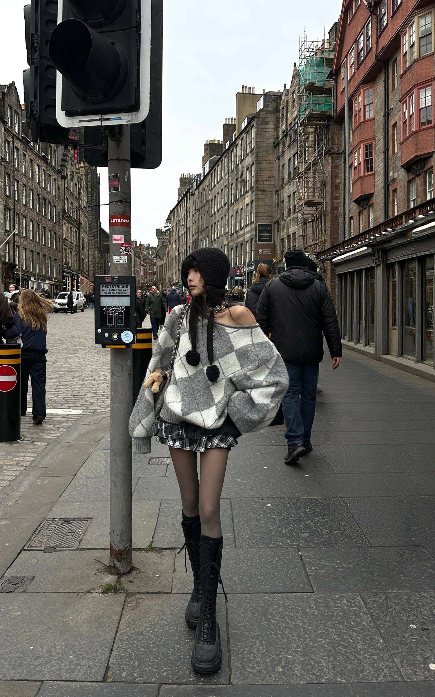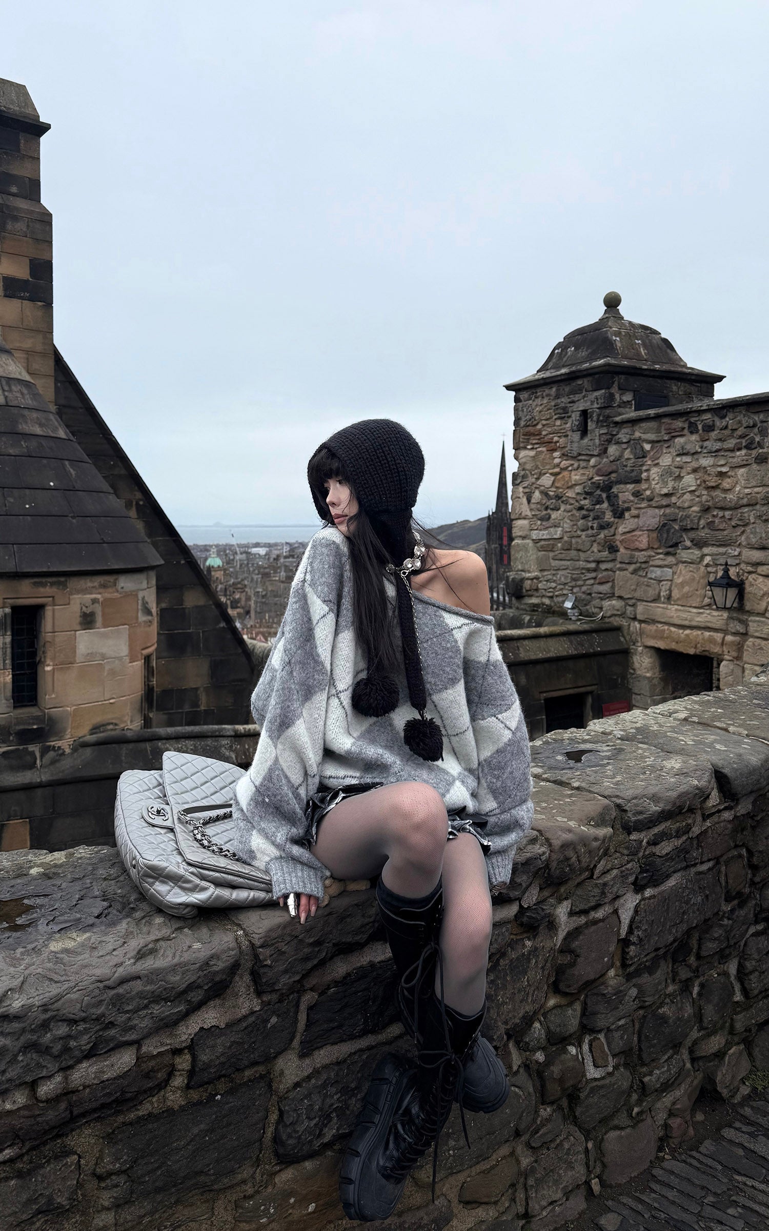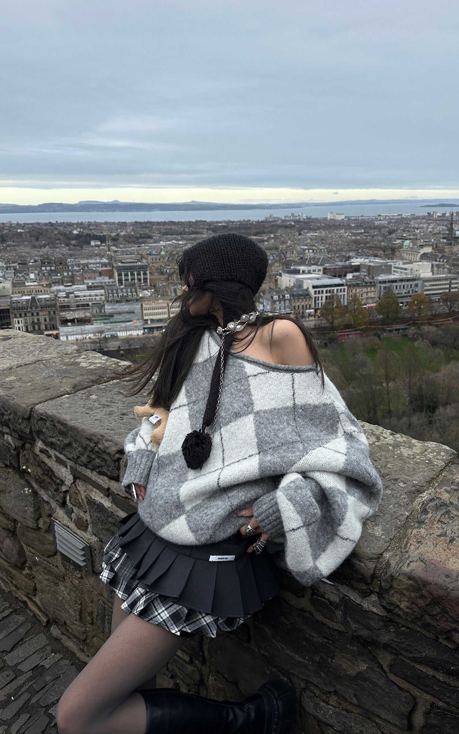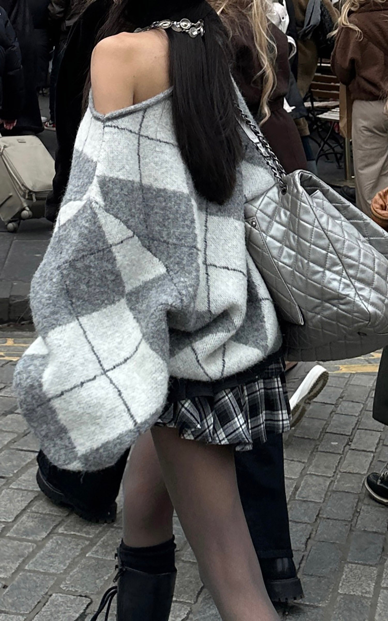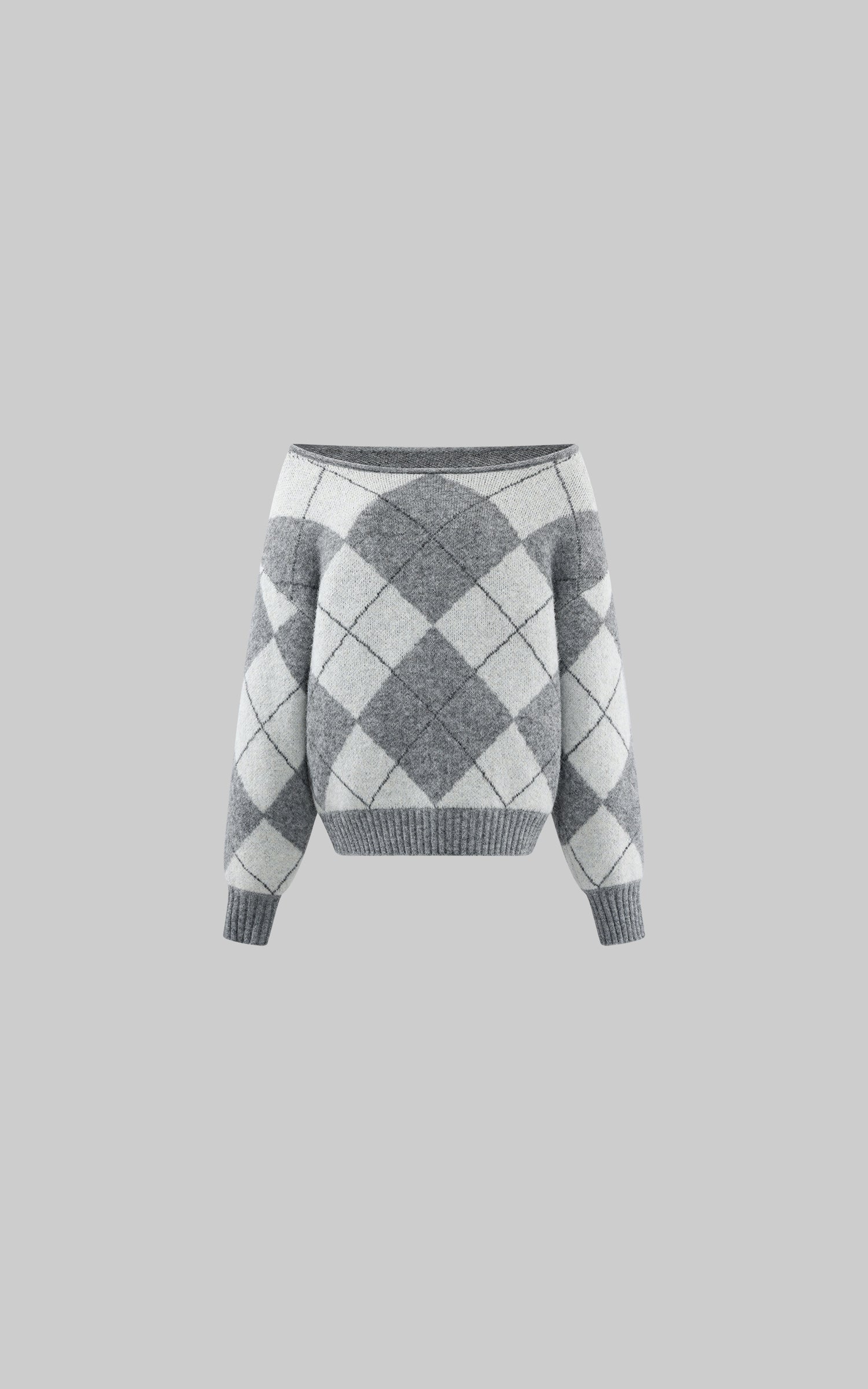 A muted argyle pattern defines the silhouette, paired with an oversized drop-shoulder cut for a relaxed, fluid drape. Soft knit texture delivers warmth without heaviness, while the wide neckline allows for an effortless off-shoulder styling. Designed to feel undone yet intentional, it balances volume and ease—ideal for layering or standing alone as a statement through colder seasons.