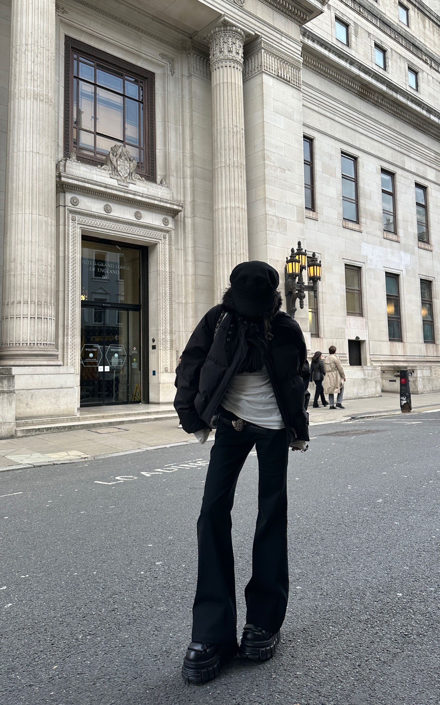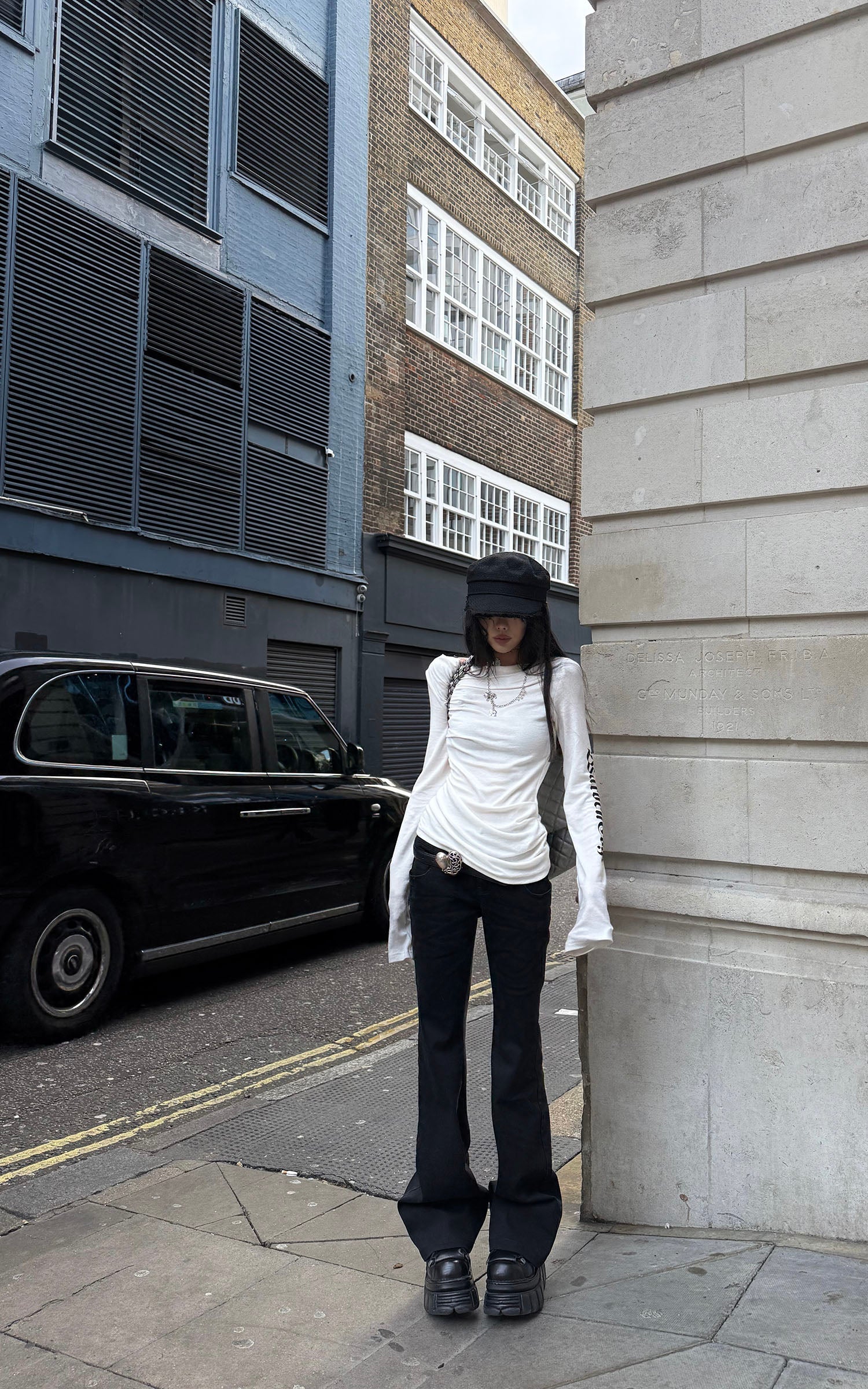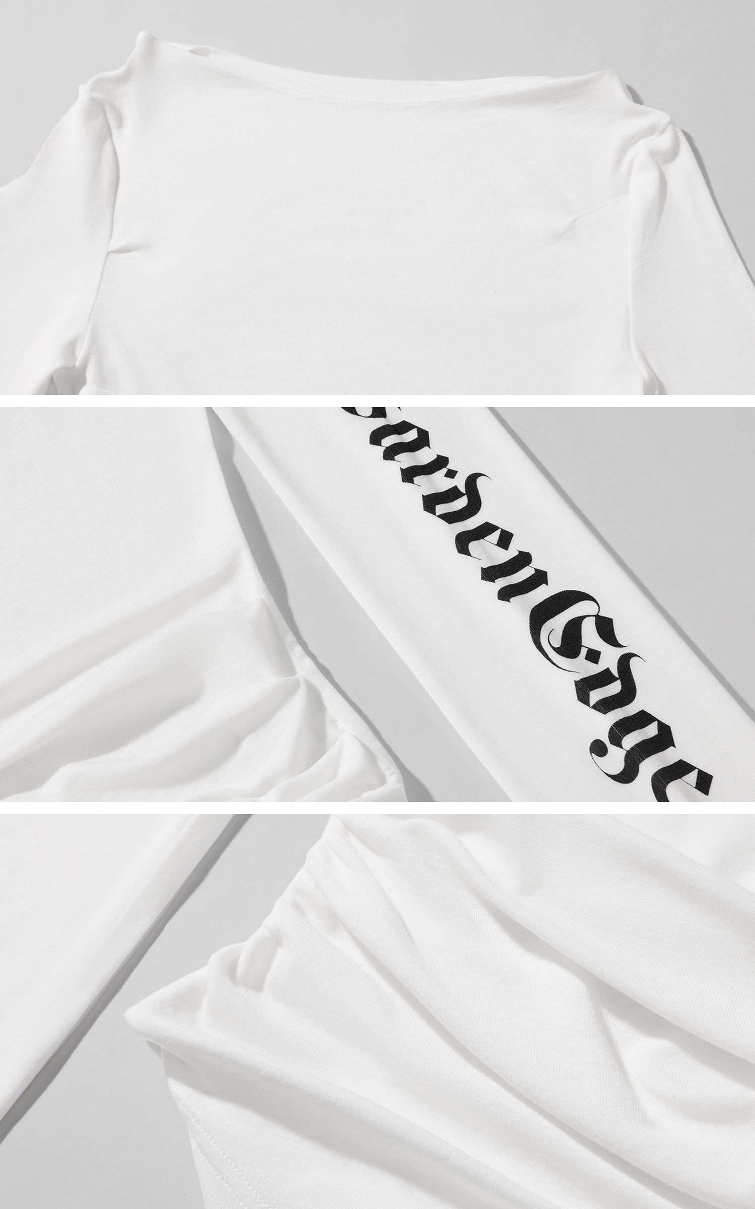Cut for a sleek, form-fitting silhouette, this asymmetric long sleeve top features subtle draping along the side for a sculpted effect. The boat neckline offers effortless balance—revealing just enough edge while maintaining refinement. Crafted from stretch fabric for smooth movement and structure, it’s finished with bold typographic detailing on the sleeve for a directional, street-luxe attitude.