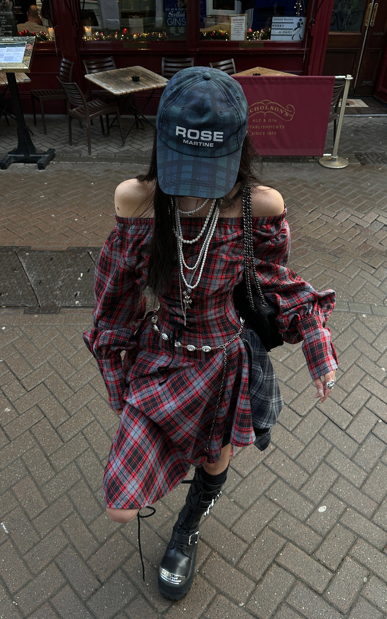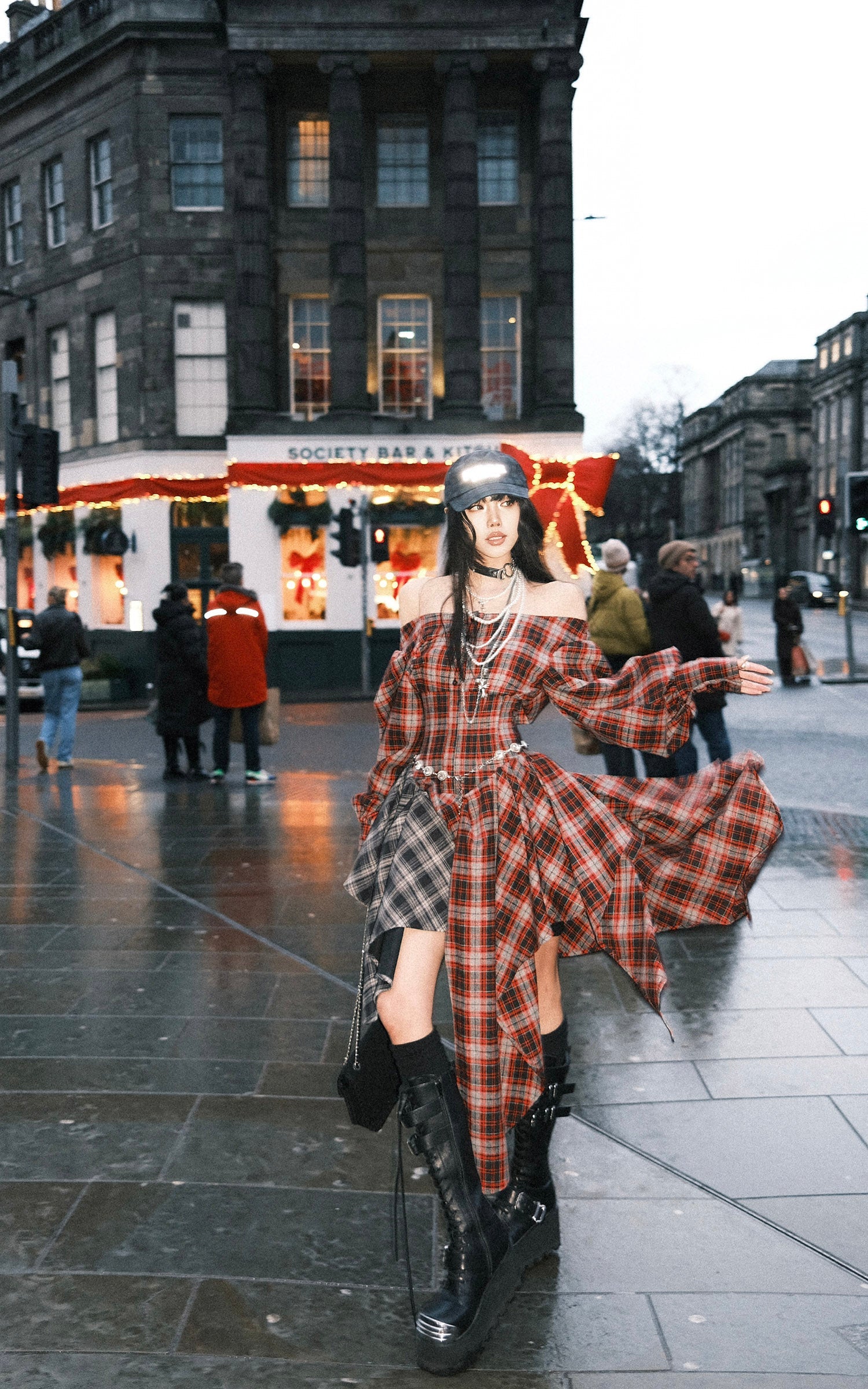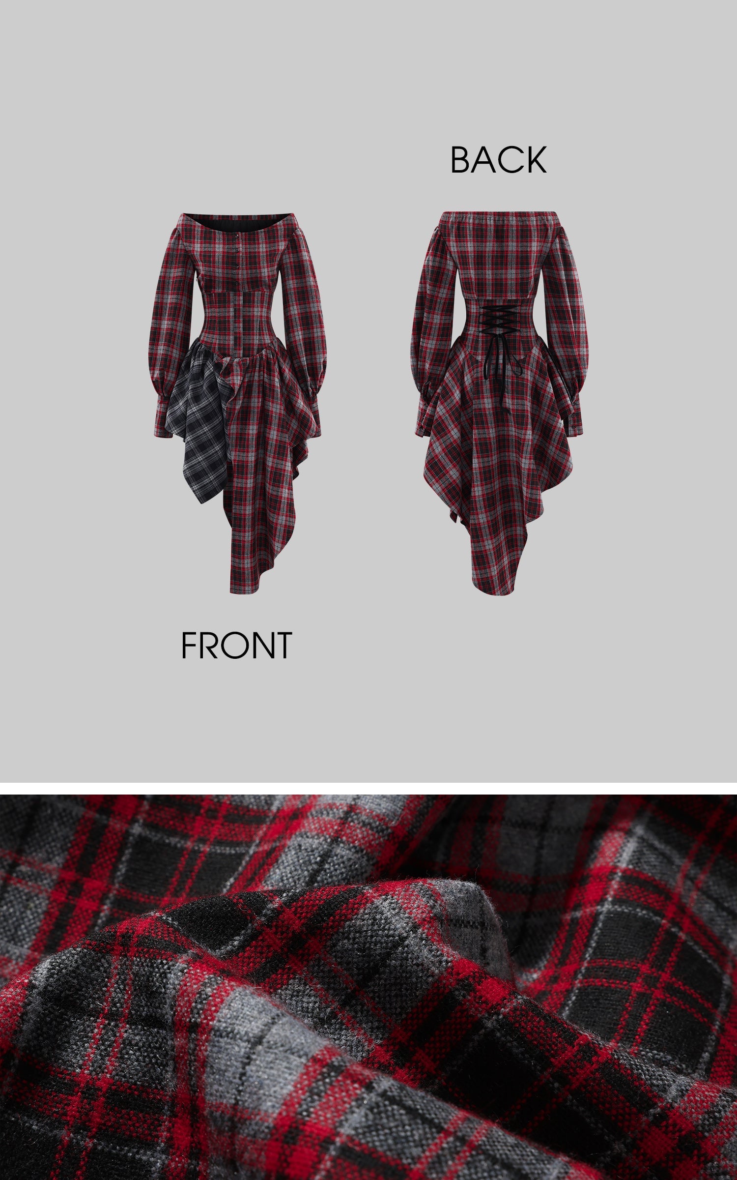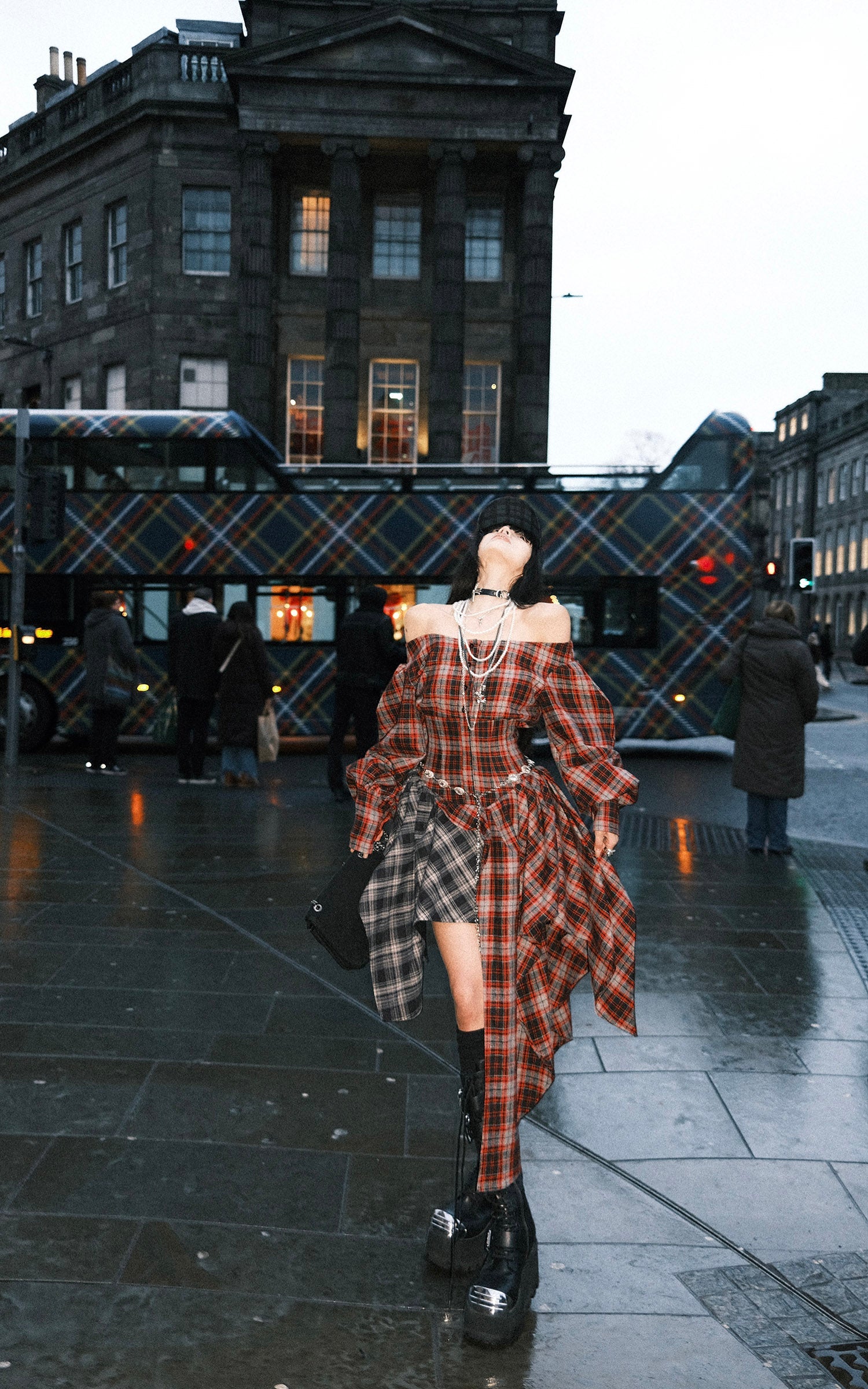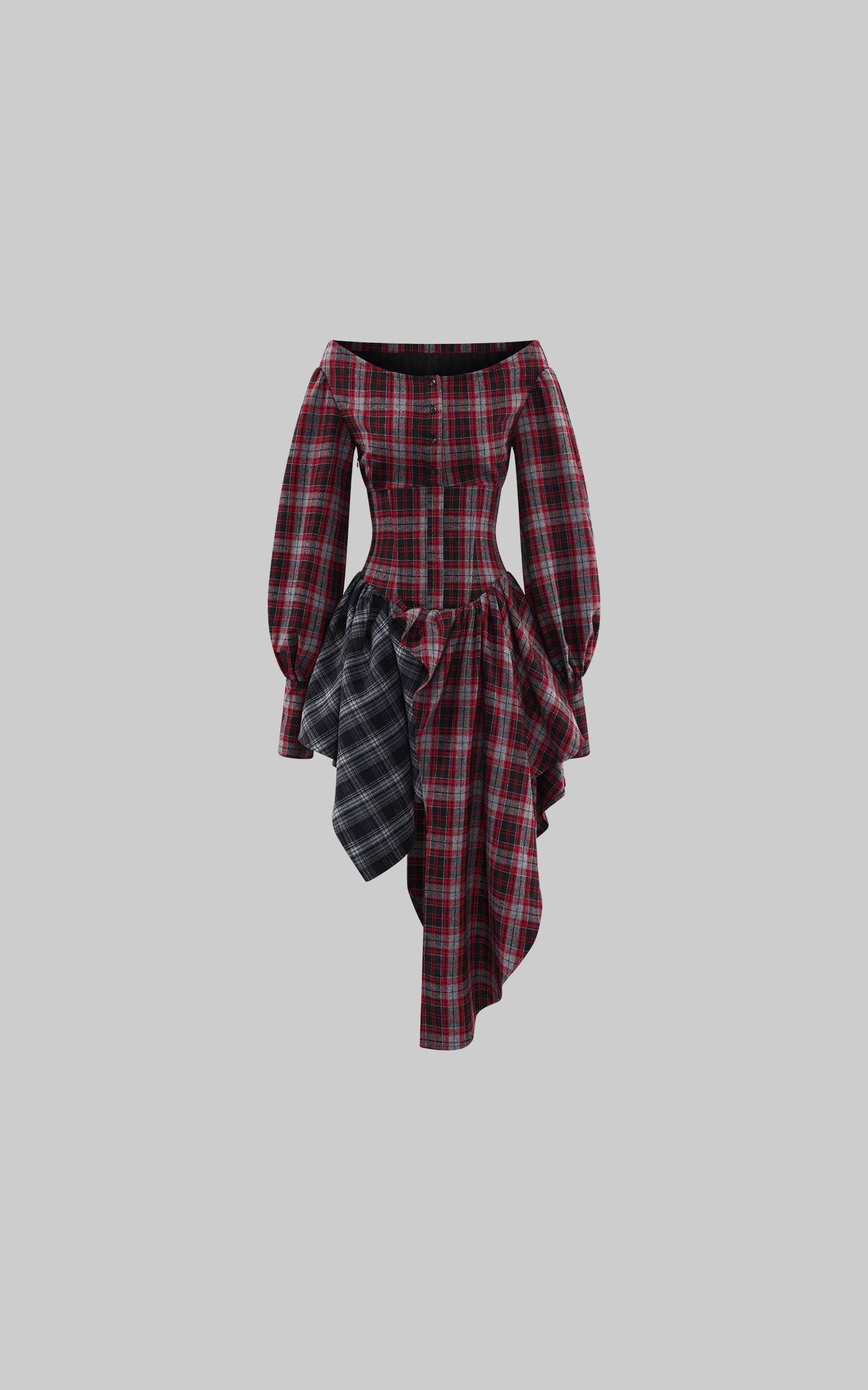 A deconstructed plaid dress built around tension and movement—cut with an off-shoulder neckline, a sculpted waist, and asymmetric draped panels in mixed tartan. The contrast layering sharpens its silhouette, while elongated sleeves and lace-up detailing at the back add an engineered, body-tracing structure. The uneven hem shifts with motion, creating a sharp yet fluid profile designed for urban nights and experimental layering.