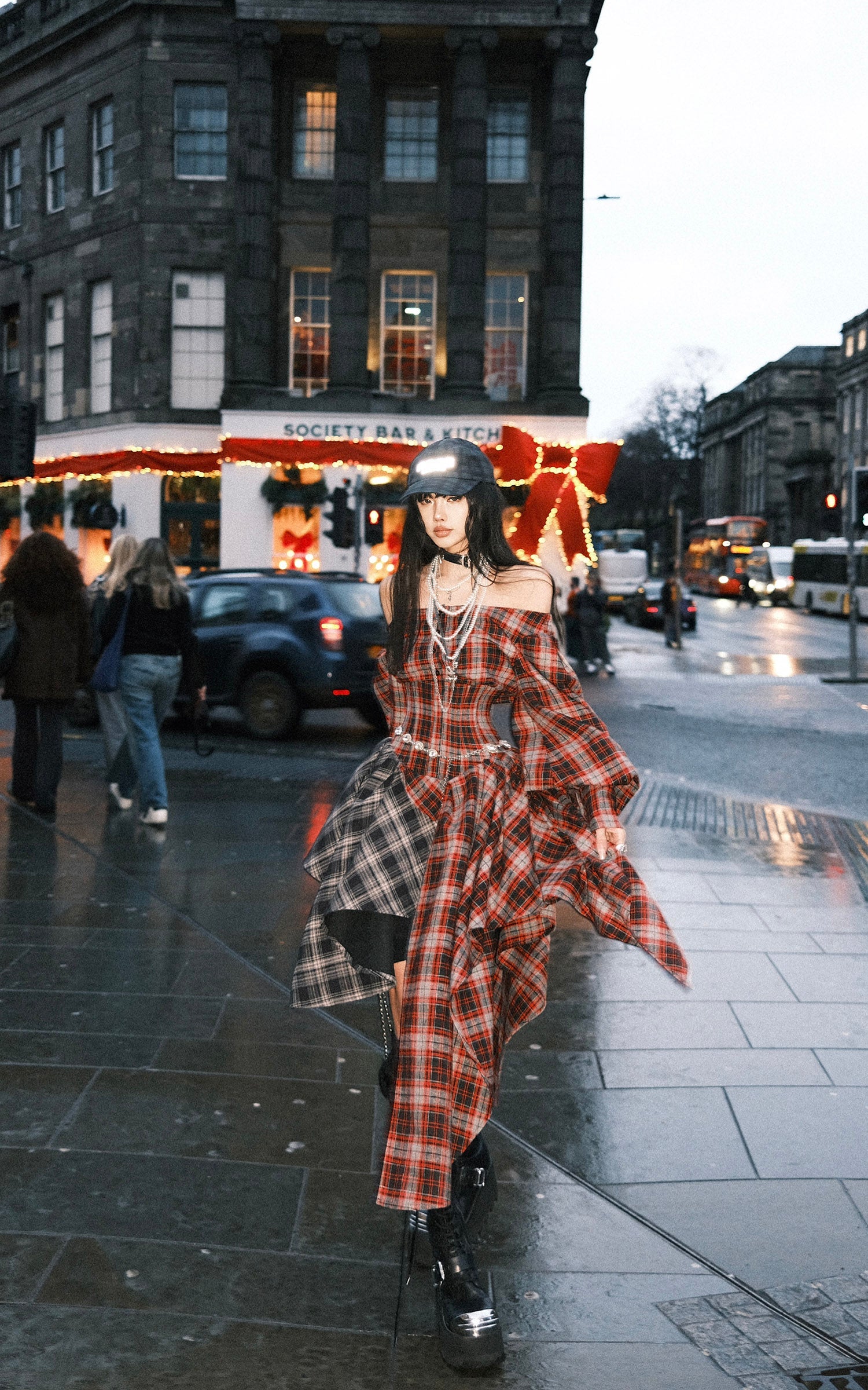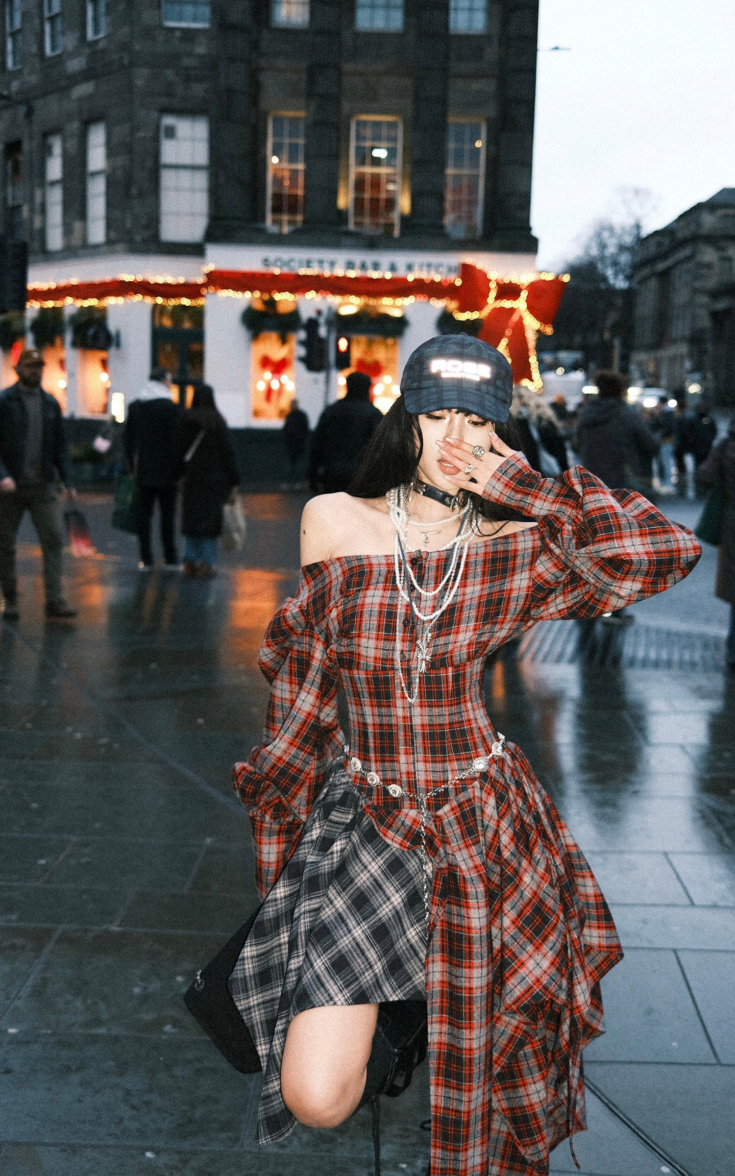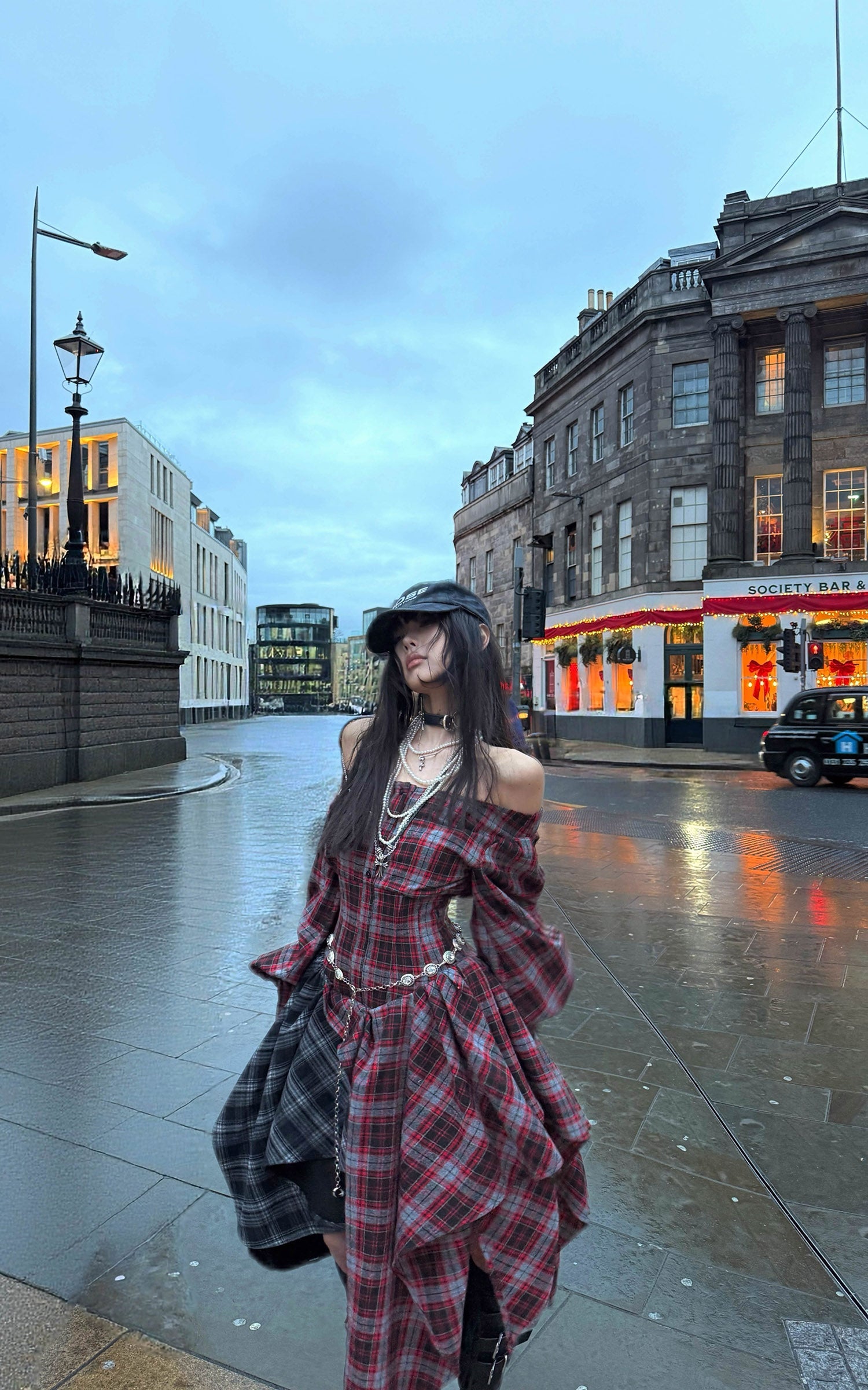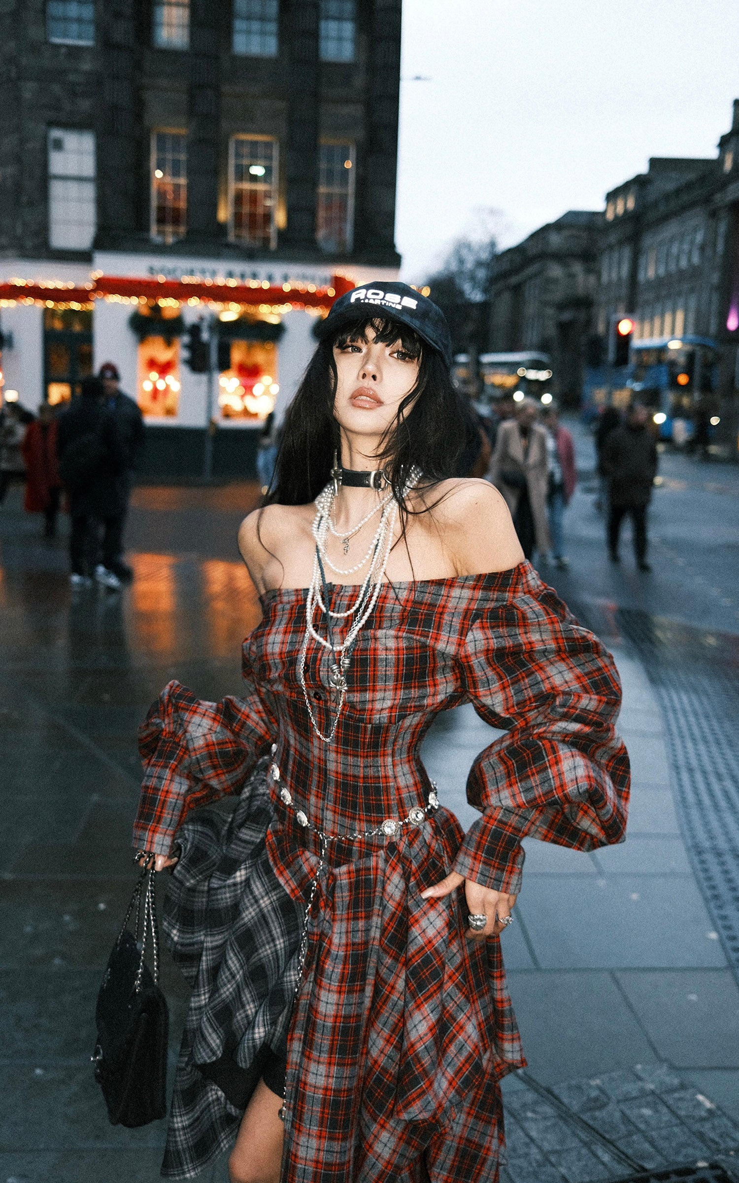 A deconstructed plaid dress built around tension and movement—cut with an off-shoulder neckline, a sculpted waist, and asymmetric draped panels in mixed tartan. The contrast layering sharpens its silhouette, while elongated sleeves and lace-up detailing at the back add an engineered, body-tracing structure. The uneven hem shifts with motion, creating a sharp yet fluid profile designed for urban nights and experimental layering.