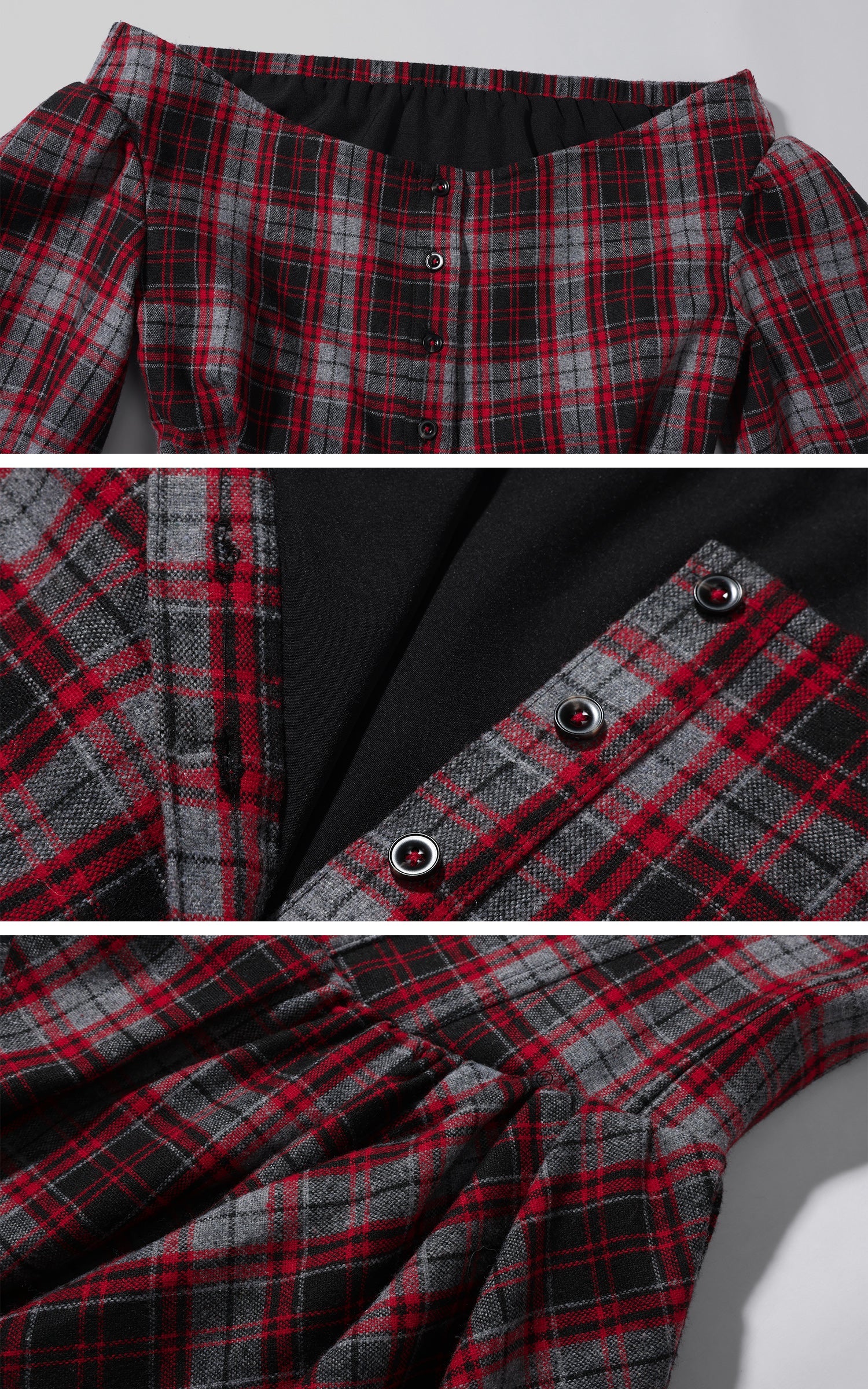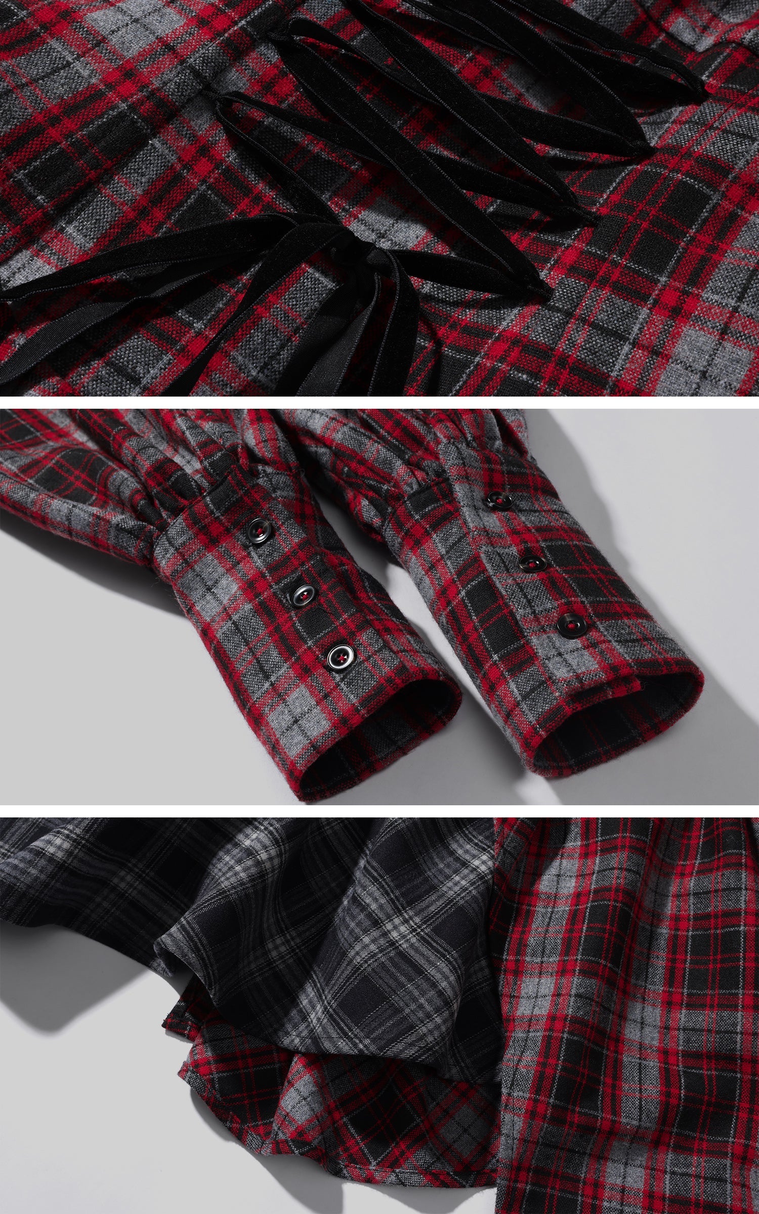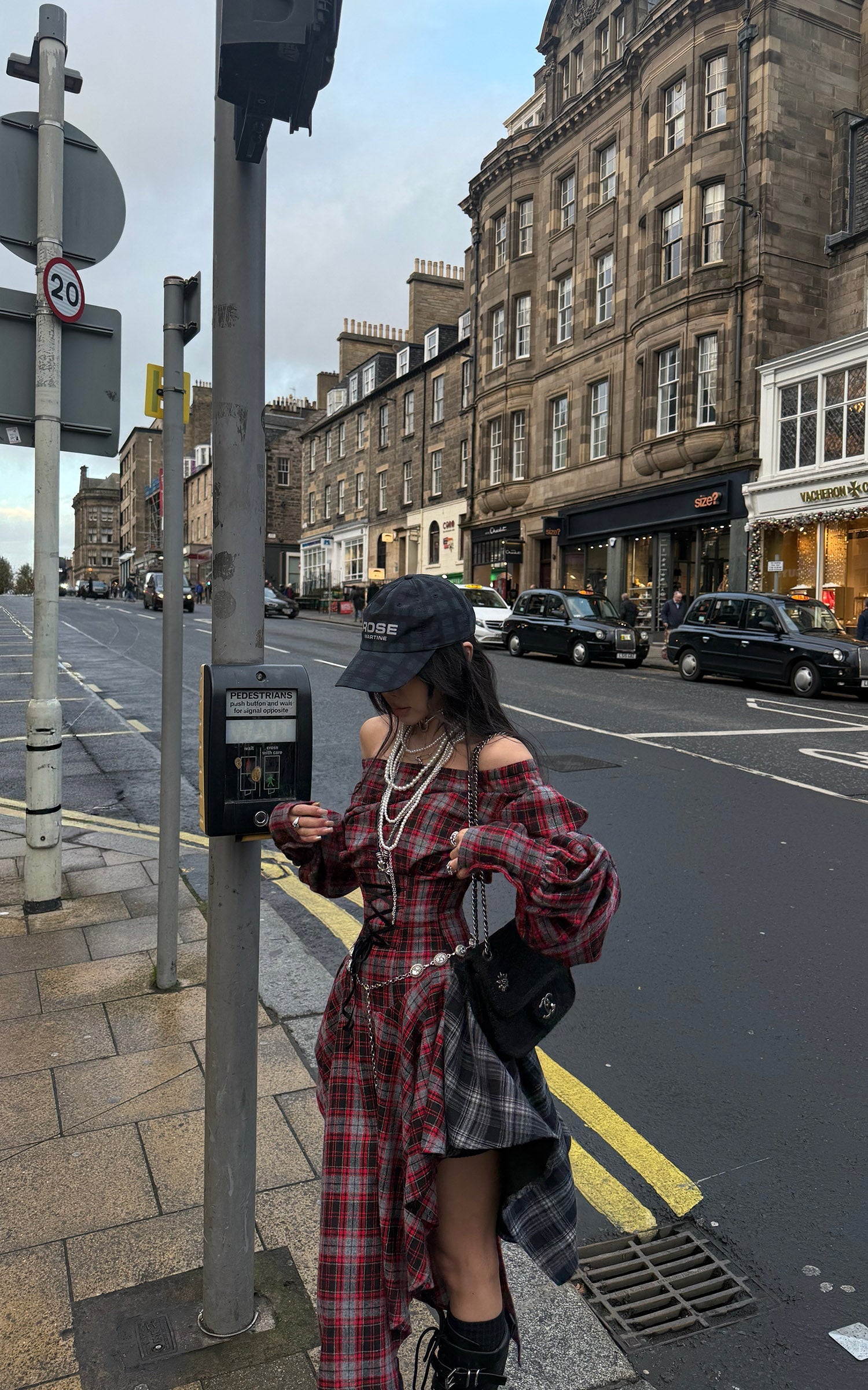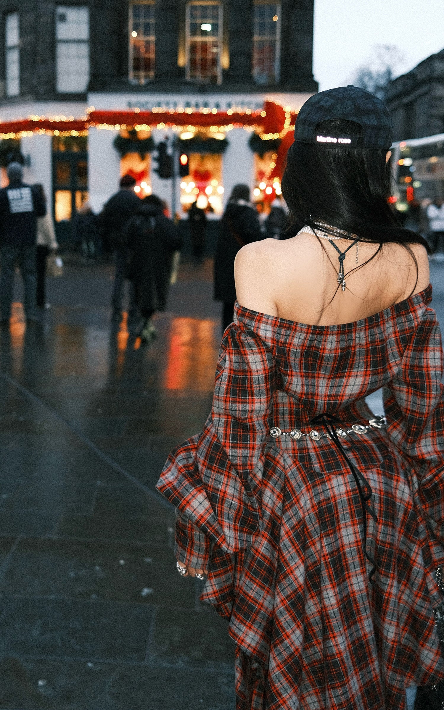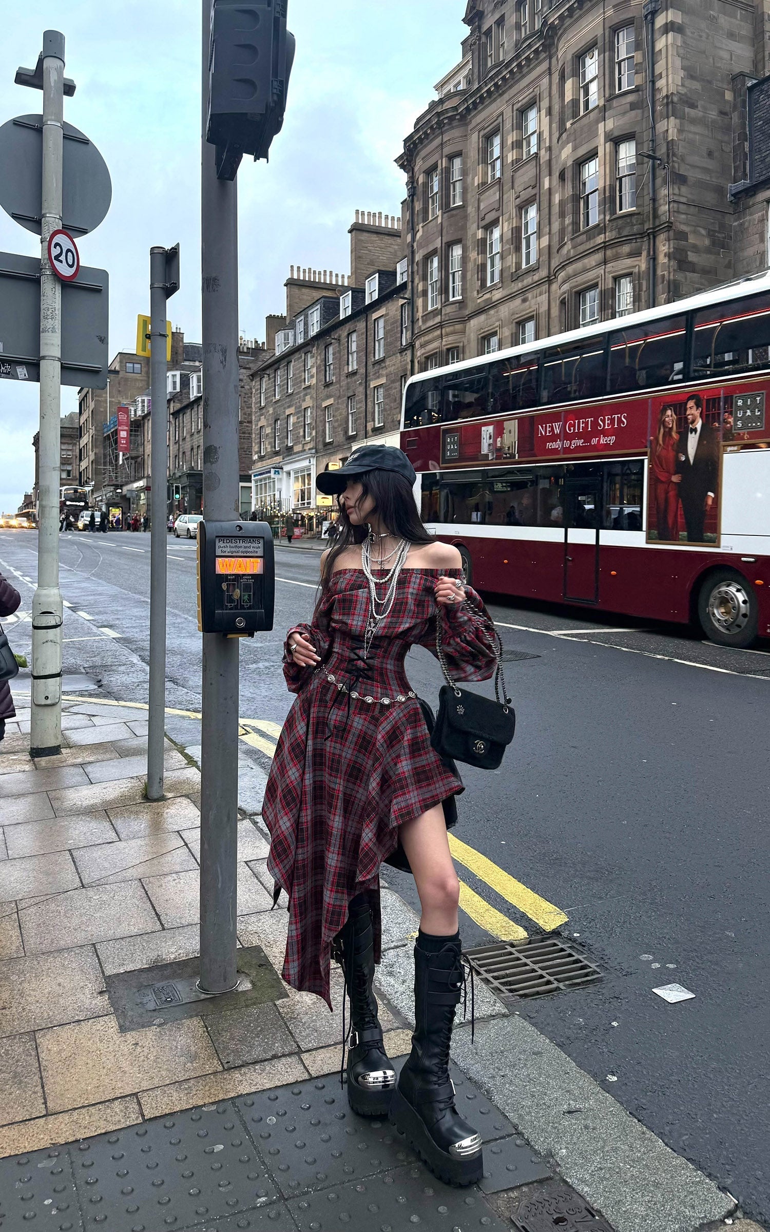 A deconstructed plaid dress built around tension and movement—cut with an off-shoulder neckline, a sculpted waist, and asymmetric draped panels in mixed tartan. The contrast layering sharpens its silhouette, while elongated sleeves and lace-up detailing at the back add an engineered, body-tracing structure. The uneven hem shifts with motion, creating a sharp yet fluid profile designed for urban nights and experimental layering.