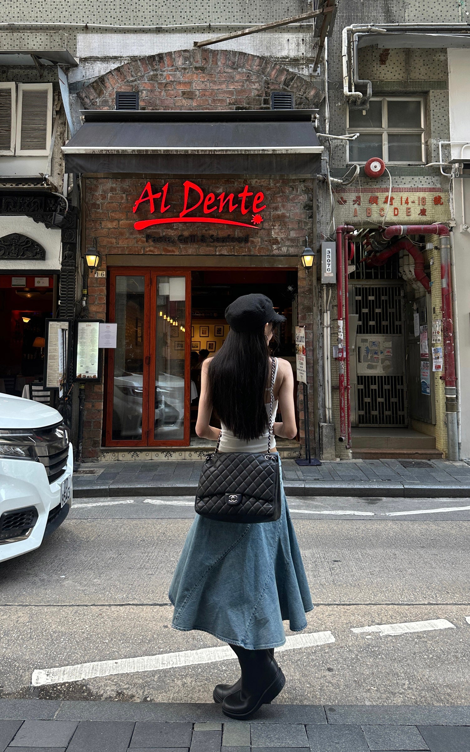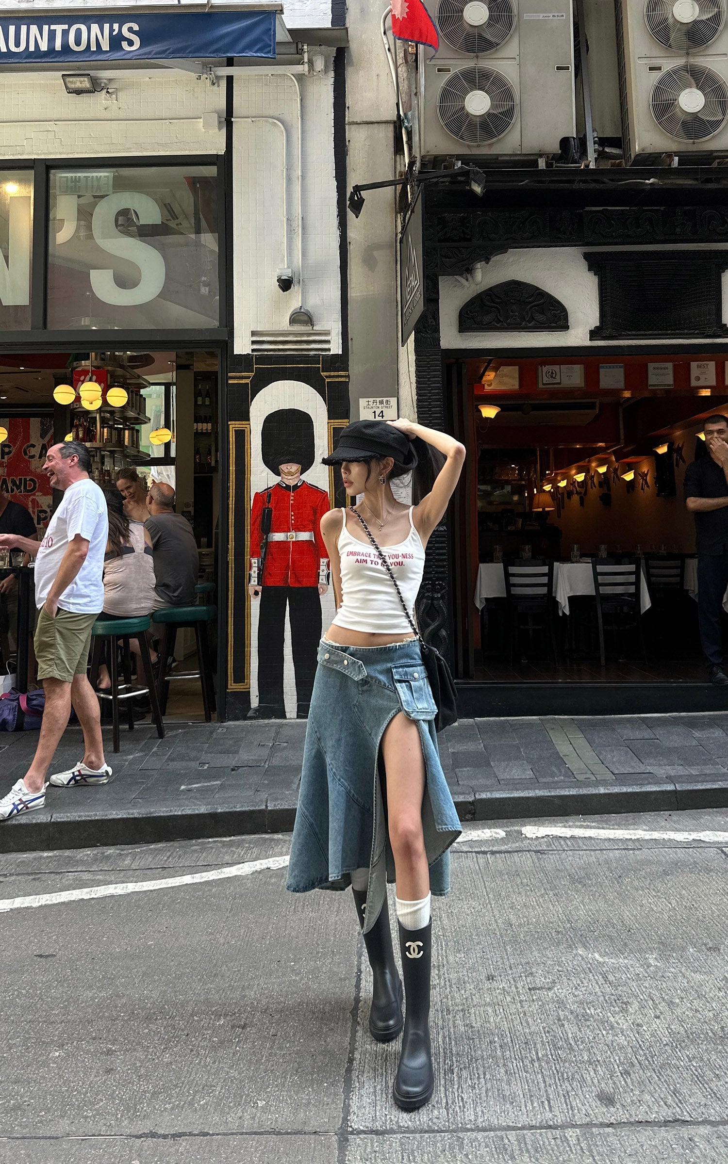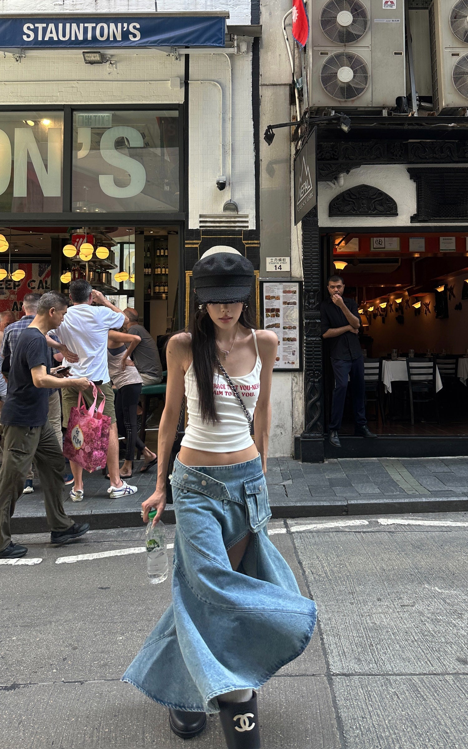 Raw-cut waistband meets architectural silhouette in this A-line denim skirt. A removable flap pocket and angled buttoned belt deliver a utilitarian edge, while the deep front slit breaks symmetry with bold motion. Crafted from washed cotton denim with paneled construction and exaggerated hem flare. Designed for uncompromising street statements.