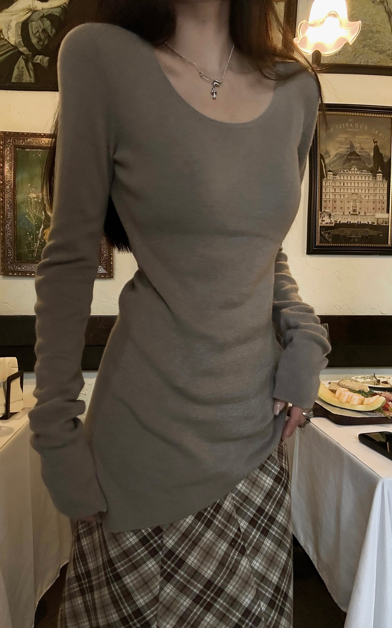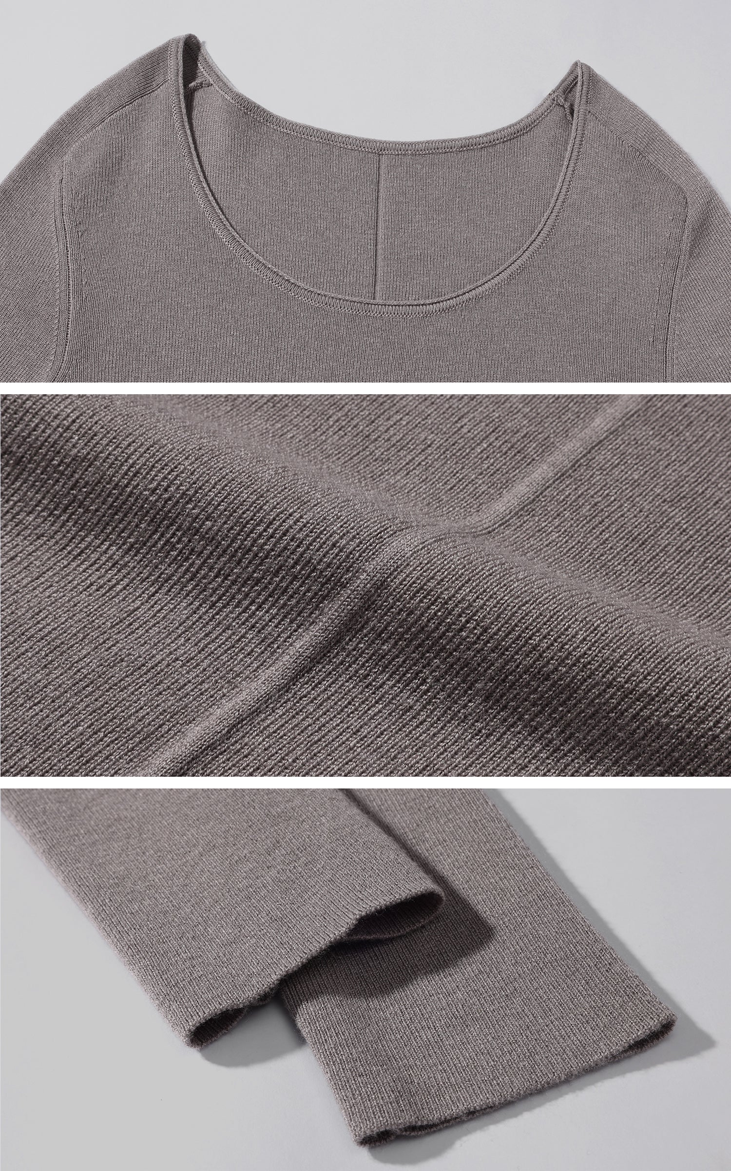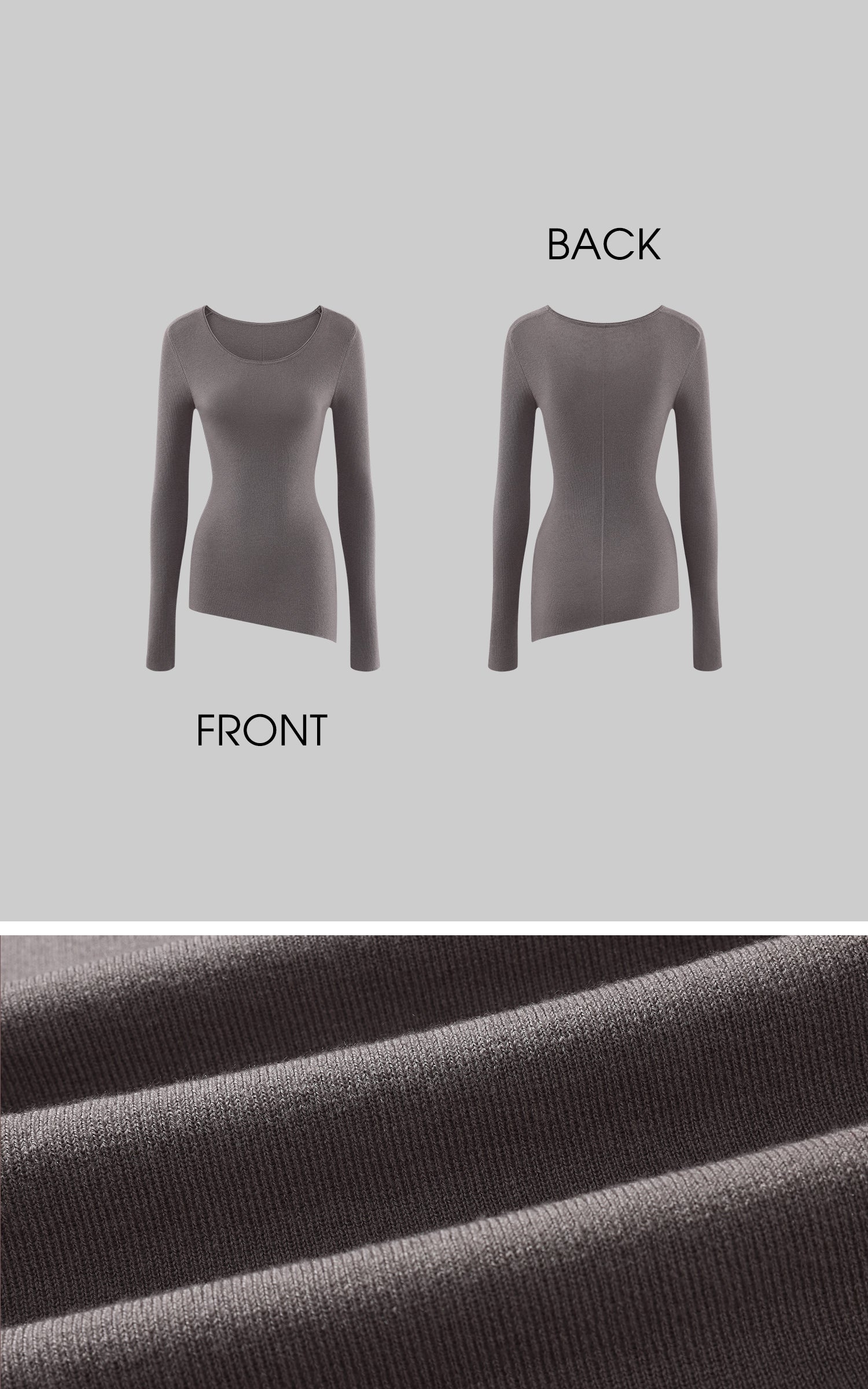 A fitted long-sleeve tee built with a cool, sculpted silhouette. The ribbed knit follows the body with a smooth, matte texture, while the asymmetric hem adds a quiet distortion to an otherwise minimal form. Soft stretch fabric creates a streamlined profile that layers easily under jackets or stands alone with understated confidence.