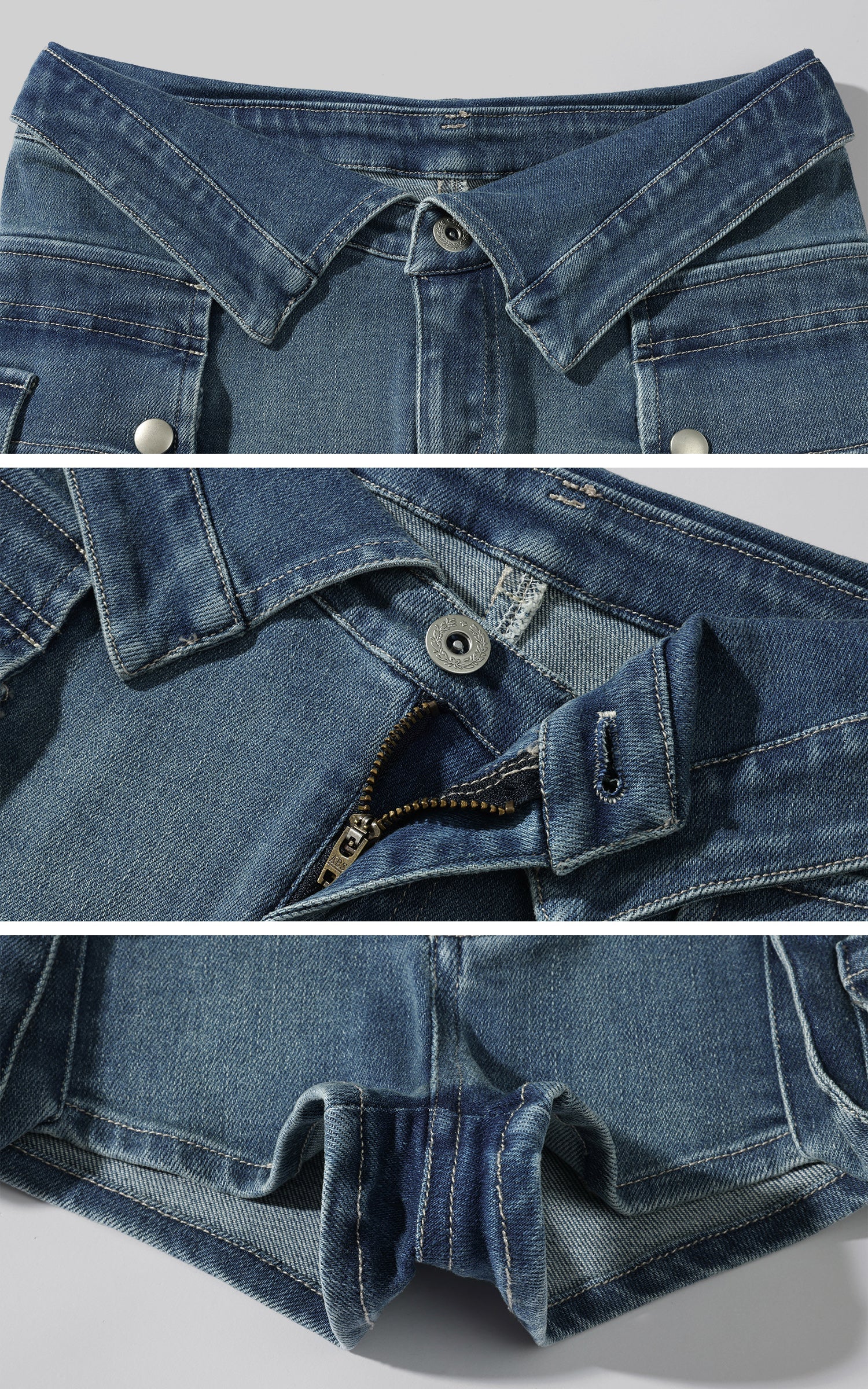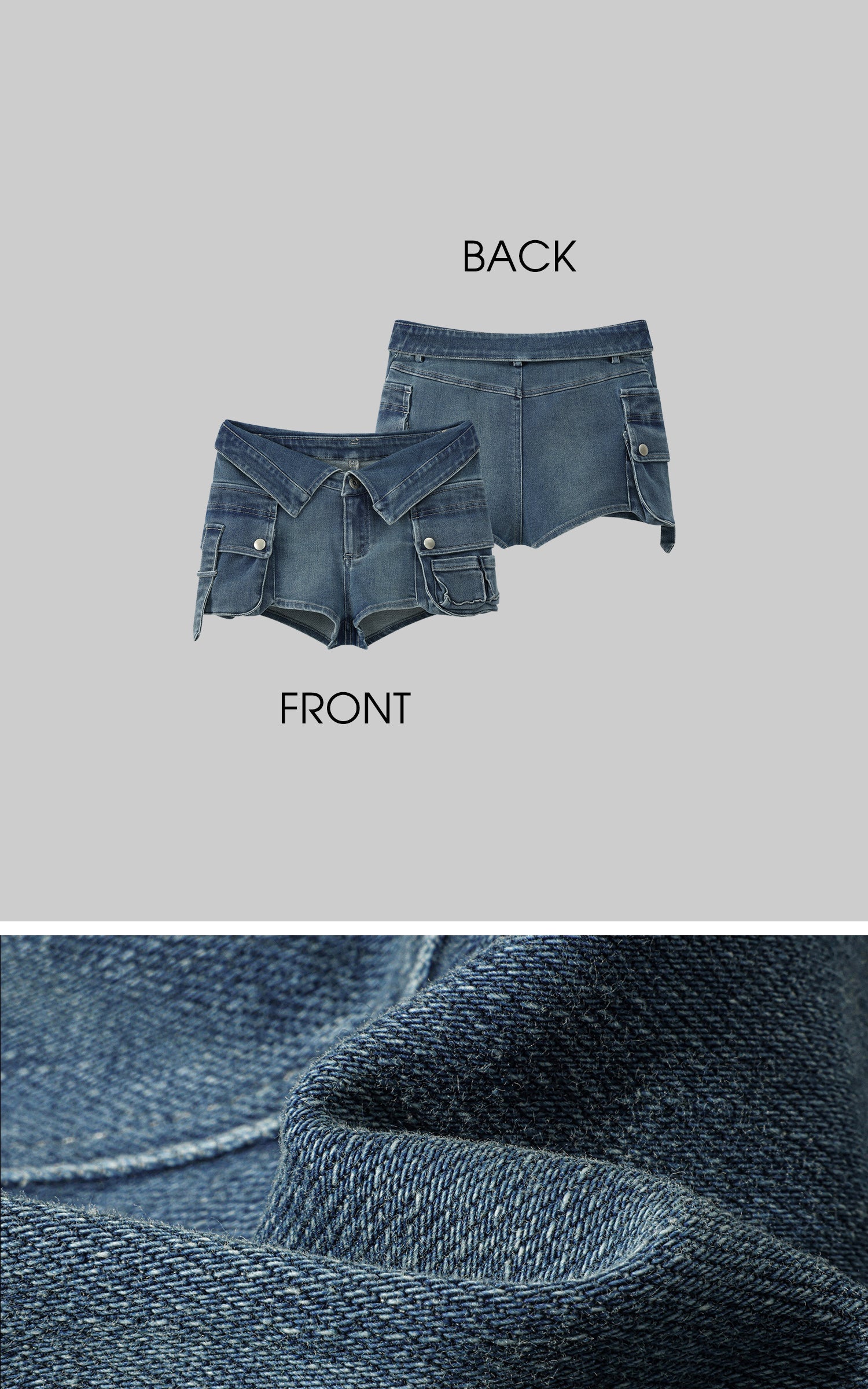 An experimental take on denim structure, these ultra-short shorts blur the boundary between pants and outer layers. The waistband mimics a shirt collar—a bold subversion that pulls from classic tailoring but shreds the rules. Functional oversized flap pockets reinforce a utilitarian edge, while the washed blue finish keeps it grounded in everyday rebellion. Engineered for those who don’t just wear clothes but reframe them.